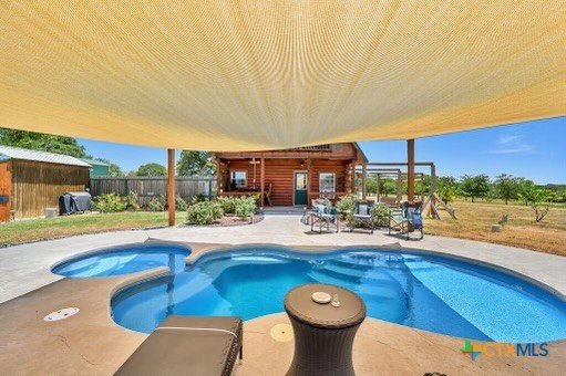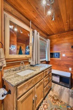 This charming two-story, fully furnished log cabin home offers a tranquil escape on nearly 26 acres of meticulously maintained land, secured behind a gated entrance for added privacy. The property boasts a spacious carport suitable for vehicle storage, alongside an additional carport ideal for RV or boat storage, complemented by a full RV hook-up for convenient hosting. The interior is cozy with an open floor plan and wood flooring throughout, featuring multiple ceiling fans and large windows that flood the living spaces with natural light. The living room, centered around a cast-iron woodburning stove, seamlessly connects to the bright dining and kitchen areas. The kitchen shines with modern touches, including track lighting, stainless steel appliances, granite countertops and ample cabinetry, with a spacious kitchen window overlooking picturesque surroundings. Upstairs, a large bedroom sanctuary features plush carpet flooring, multiple ceiling fans, a spacious walk-in closet and private access to both balconies. Two bathrooms provide additional convenience. Outside, unwind in the heated pool or hot tub surrounded by lush greenery and tranquil views. Enjoy outdoor dining on the covered patio or take in breathtaking scenery from the front and rear balconies. Located near several parks and the Iron Bridge Wildlife Management Area, this haven offers endless opportunities for outdoor exploration, perfect for nature lovers seeking serenity and comfort.