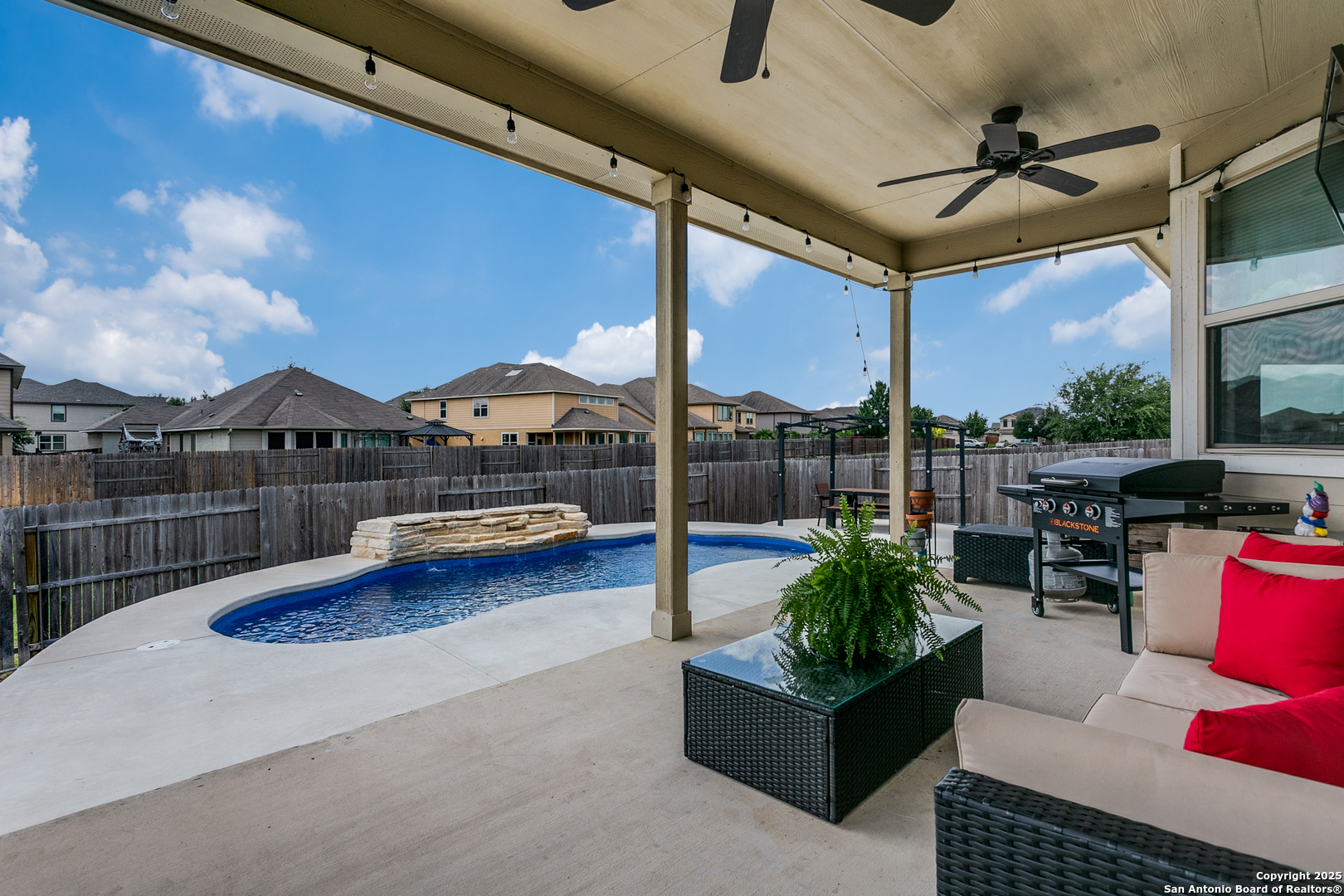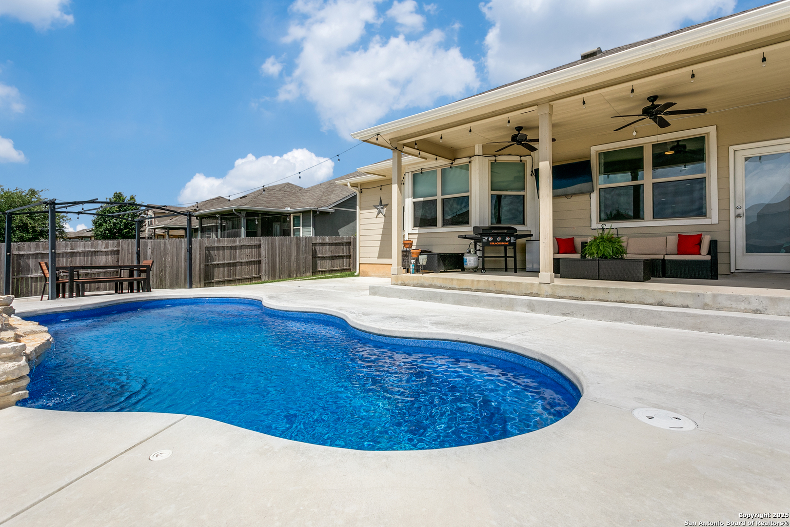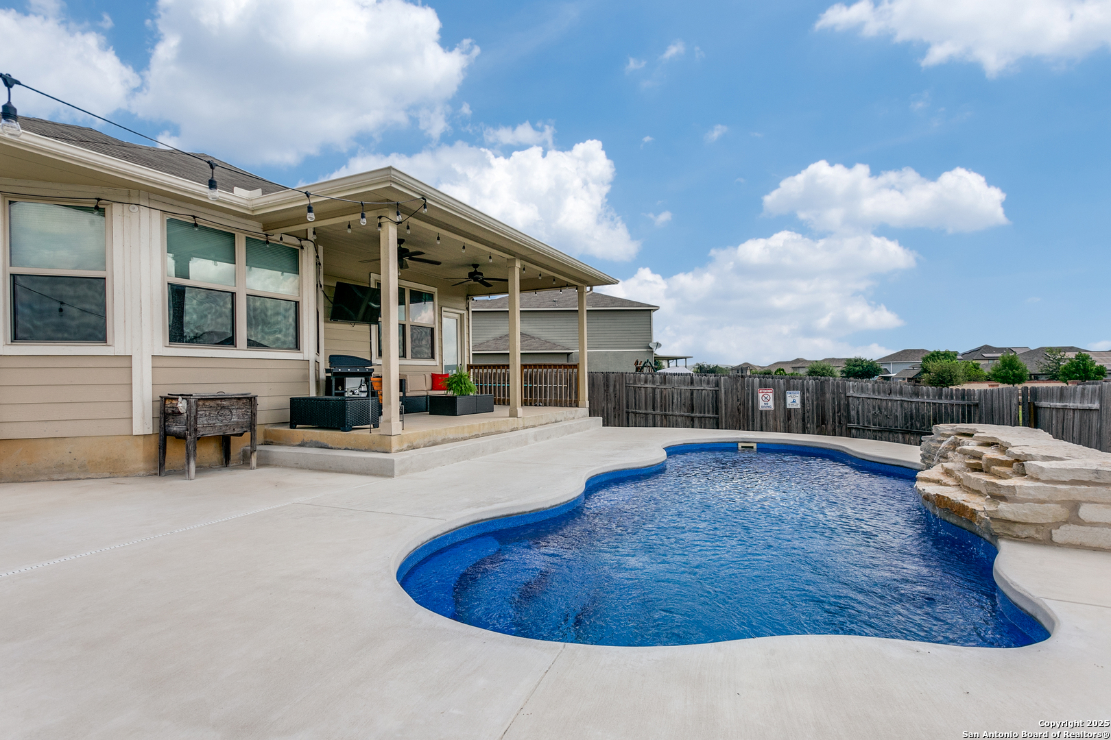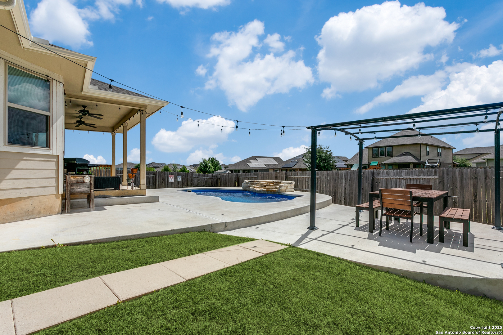 Welcome to a one-of-a-kind sanctuary in a prime San Antonio location near Culebra Rd and Galm. This stunning one-story home sits on a premium lot with no neighbors behind or to one side. From the moment you step inside, you'll be welcomed by an open floor plan with soaring ceilings, creating a bright and airy atmosphere ideal for everyday living and entertaining. Featuring 3 bedrooms, a dedicated office, and a spacious 3-car garage, this home offers the flexibility and space modern families need. The chef's kitchen boasts an electric cooktop with a gas connection, quartz countertops, and flows seamlessly into the living area, where a custom built-in media cabinet, fully wired for A/V, adds both style and function. The primary suite is a peaceful retreat, highlighted by a bay window, a spa-like bathroom with double vanities, soaking tub, walk-in shower, and a massive walk-in closet. Both bathrooms have been tastefully remodeled with elegant tile work. There's no carpet anywhere in the home. Step outside to your private oasis, a backyard that truly stuns with its resort-style feel, perfect for hosting unforgettable gatherings. A luxurious in-ground pool with an elegant water feature serves as the showpiece, surrounded by a professionally landscaped setting. The extended covered patio is wired for a TV, making it ideal for game nights or weekend lounging, while the pergola-covered seating area offers a cozy retreat for relaxing or entertaining. A side walkway allows guests to access the backyard directly, keeping the inside of the home dry and clean. Whether you're entertaining a crowd or enjoying a quiet evening under the stars, this outdoor space elevates everyday living. Energy-efficient upgrades such as paid-off solar panels, foam insulation, and pre-wired smart home features ensure long-term comfort and savings. Located in a top-rated NISD school zone and just minutes from Alamo Ranch shopping, dining, and entertainment, this extraordinary home offers the perfect balance of privacy, luxury, and convenience. Schedule your private tour today and experience everything 8218 Cactus Bend has to offer!