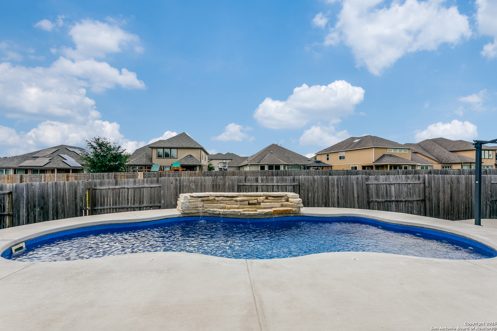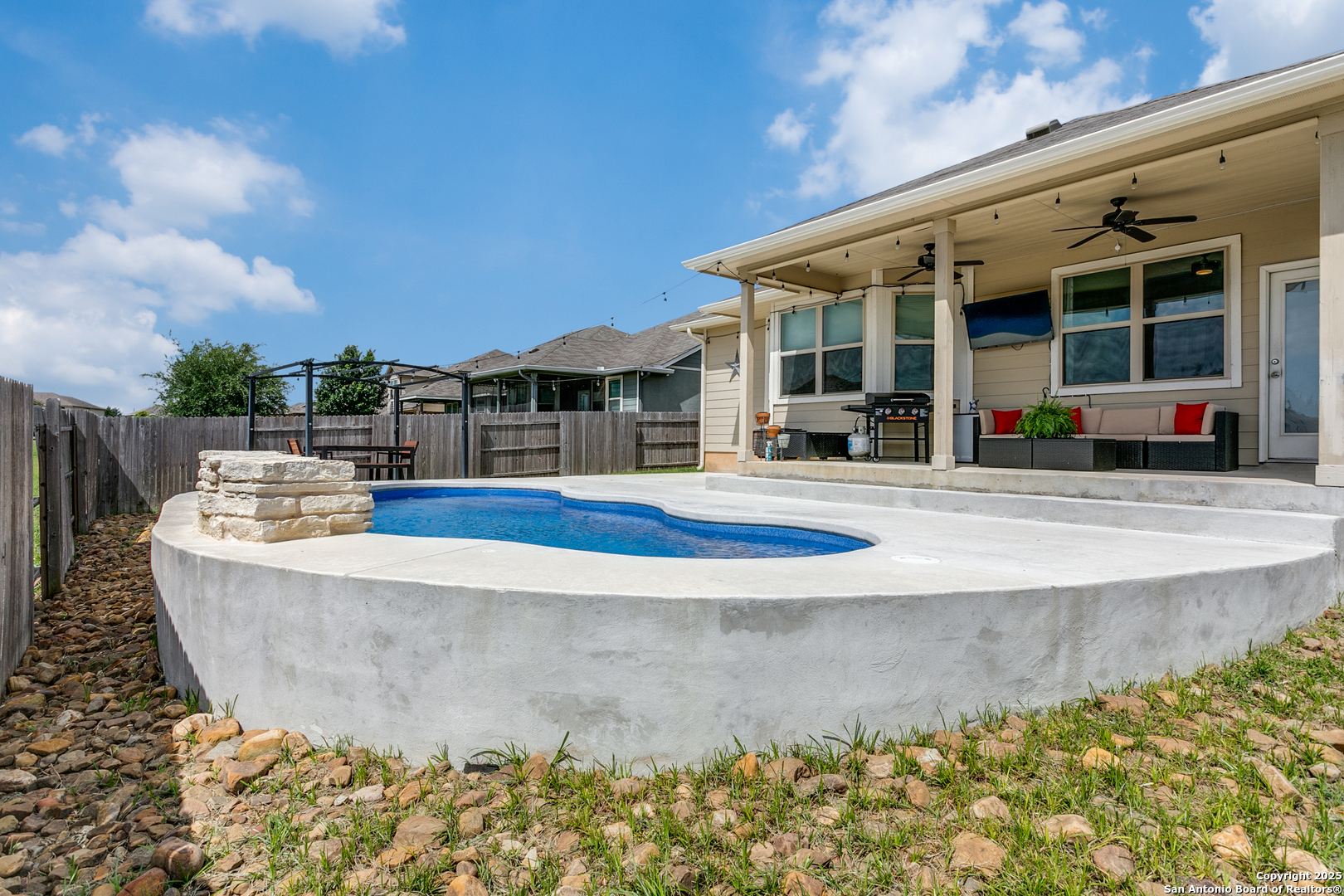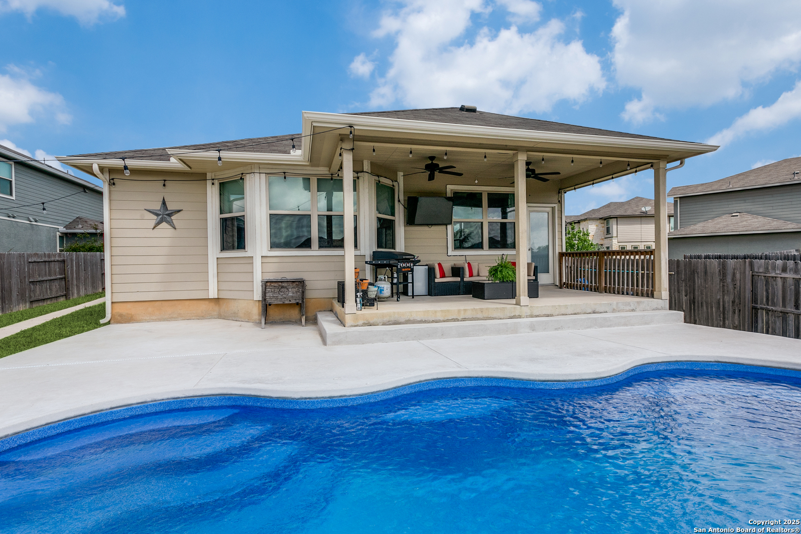 Welcome to a one-of-a-kind sanctuary in a prime San Antonio location near Culebra Rd and Galm. This stunning one-story home sits on a premium lot with no neighbors behind or to one side. From the moment you step inside, you'll be welcomed by an open floor plan with soaring ceilings, creating a bright and airy atmosphere ideal for everyday living and entertaining. Featuring 3 bedrooms, a dedicated office, and a spacious 3-car garage, this home offers the flexibility and space modern families need. The chef's kitchen boasts an electric cooktop with a gas connection, quartz countertops, and flows seamlessly into the living area, where a custom built-in media cabinet, fully wired for A/V, adds both style and function. The primary suite is a peaceful retreat, highlighted by a bay window, a spa-like bathroom with double vanities, soaking tub, walk-in shower, and a massive walk-in closet. Both bathrooms have been tastefully remodeled with elegant tile work. There's no carpet anywhere in the home. Step outside to your private oasis, a backyard that truly stuns with its resort-style feel, perfect for hosting unforgettable gatherings. A luxurious in-ground pool with an elegant water feature serves as the showpiece, surrounded by a professionally landscaped setting. The extended covered patio is wired for a TV, making it ideal for game nights or weekend lounging, while the pergola-covered seating area offers a cozy retreat for relaxing or entertaining. A side walkway allows guests to access the backyard directly, keeping the inside of the home dry and clean. Whether you're entertaining a crowd or enjoying a quiet evening under the stars, this outdoor space elevates everyday living. Energy-efficient upgrades such as paid-off solar panels, foam insulation, and pre-wired smart home features ensure long-term comfort and savings. Located in a top-rated NISD school zone and just minutes from Alamo Ranch shopping, dining, and entertainment, this extraordinary home offers the perfect balance of privacy, luxury, and convenience. Schedule your private tour today and experience everything 8218 Cactus Bend has to offer!