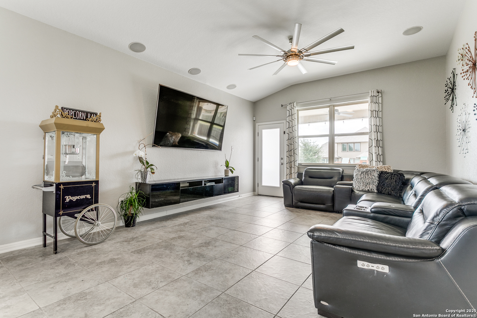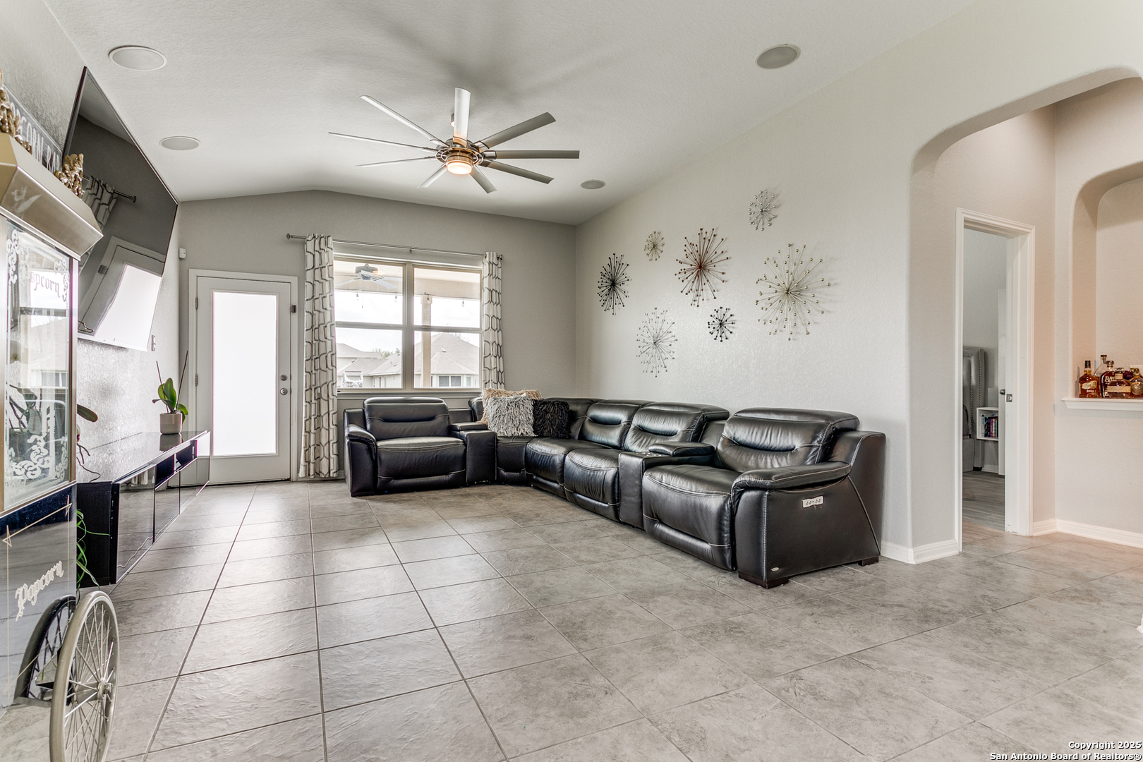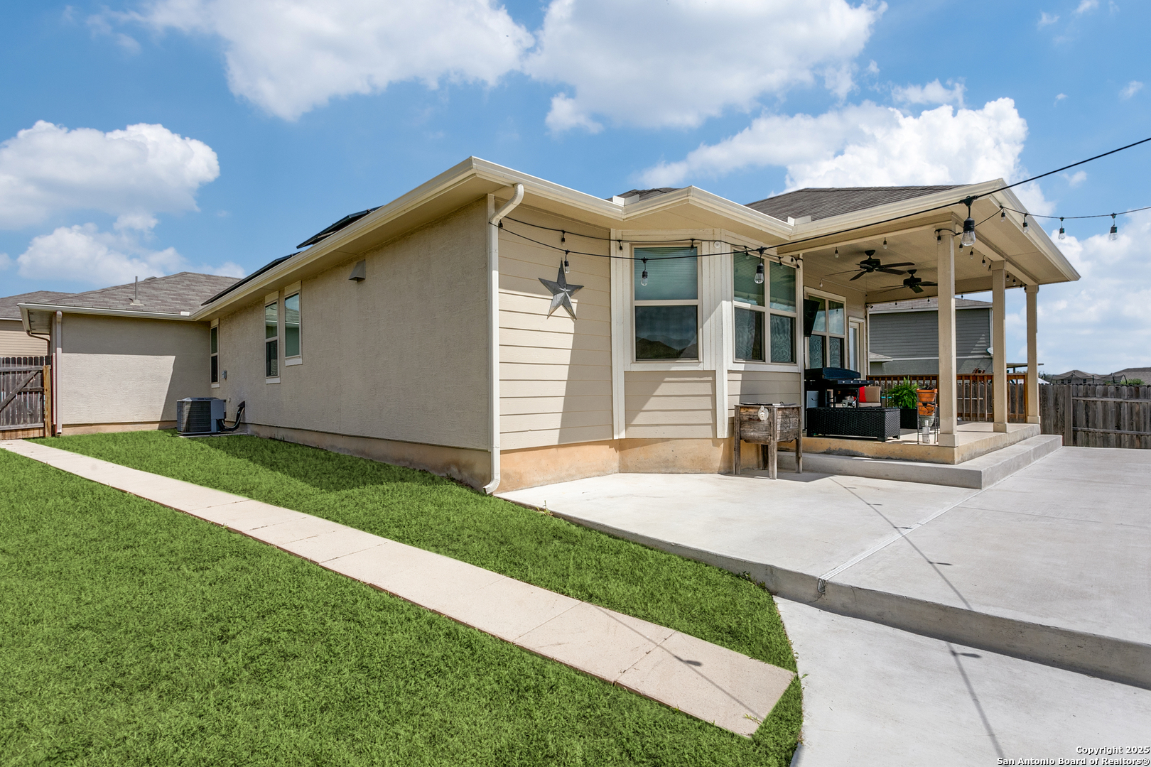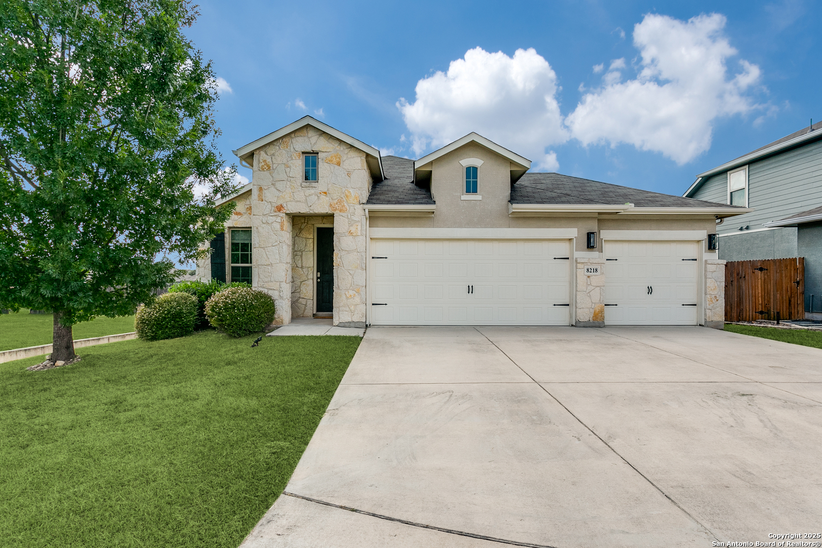 Welcome to a one-of-a-kind sanctuary in a prime San Antonio location near Culebra Rd and Galm. This stunning one-story home sits on a premium lot with no neighbors behind or to one side. From the moment you step inside, you'll be welcomed by an open floor plan with soaring ceilings, creating a bright and airy atmosphere ideal for everyday living and entertaining. Featuring 3 bedrooms, a dedicated office, and a spacious 3-car garage, this home offers the flexibility and space modern families need. The chef's kitchen boasts an electric cooktop with a gas connection, quartz countertops, and flows seamlessly into the living area, where a custom built-in media cabinet, fully wired for A/V, adds both style and function. The primary suite is a peaceful retreat, highlighted by a bay window, a spa-like bathroom with double vanities, soaking tub, walk-in shower, and a massive walk-in closet. Both bathrooms have been tastefully remodeled with elegant tile work. There's no carpet anywhere in the home. Step outside to your private oasis, a backyard that truly stuns with its resort-style feel, perfect for hosting unforgettable gatherings. A luxurious in-ground pool with an elegant water feature serves as the showpiece, surrounded by a professionally landscaped setting. The extended covered patio is wired for a TV, making it ideal for game nights or weekend lounging, while the pergola-covered seating area offers a cozy retreat for relaxing or entertaining. A side walkway allows guests to access the backyard directly, keeping the inside of the home dry and clean. Whether you're entertaining a crowd or enjoying a quiet evening under the stars, this outdoor space elevates everyday living. Energy-efficient upgrades such as paid-off solar panels, foam insulation, and pre-wired smart home features ensure long-term comfort and savings. Located in a top-rated NISD school zone and just minutes from Alamo Ranch shopping, dining, and entertainment, this extraordinary home offers the perfect balance of privacy, luxury, and convenience. Schedule your private tour today and experience everything 8218 Cactus Bend has to offer!