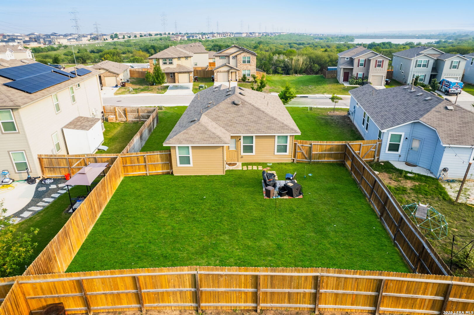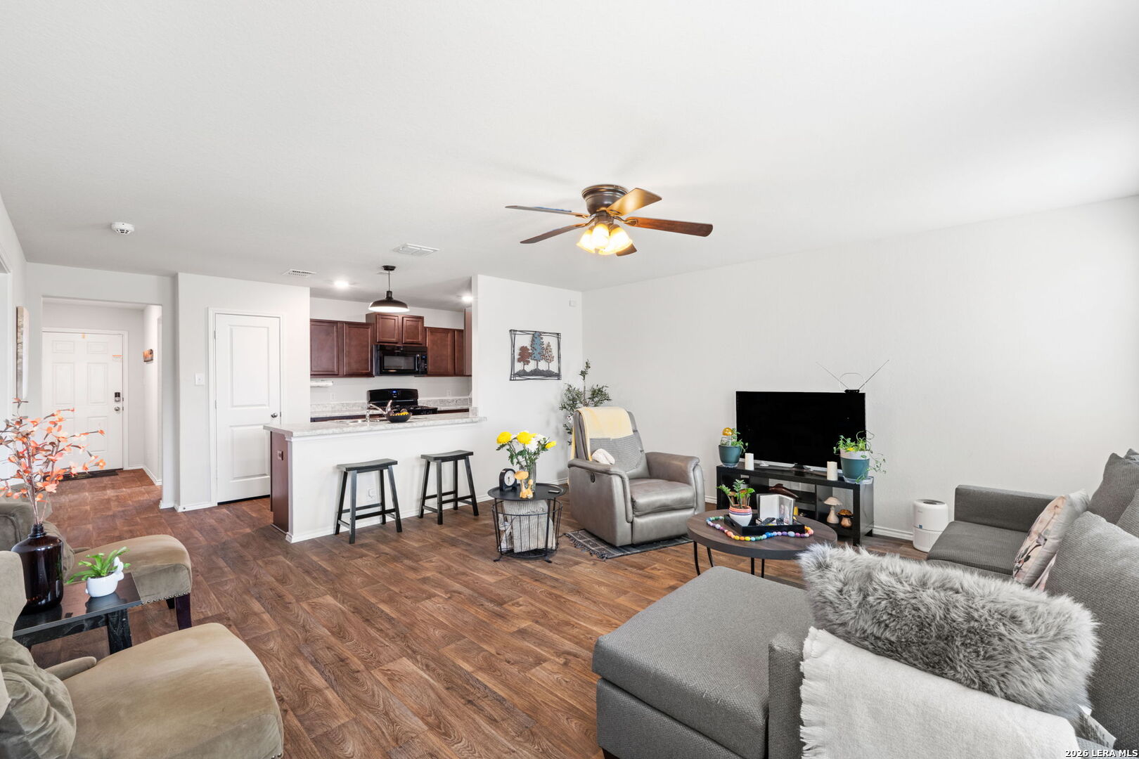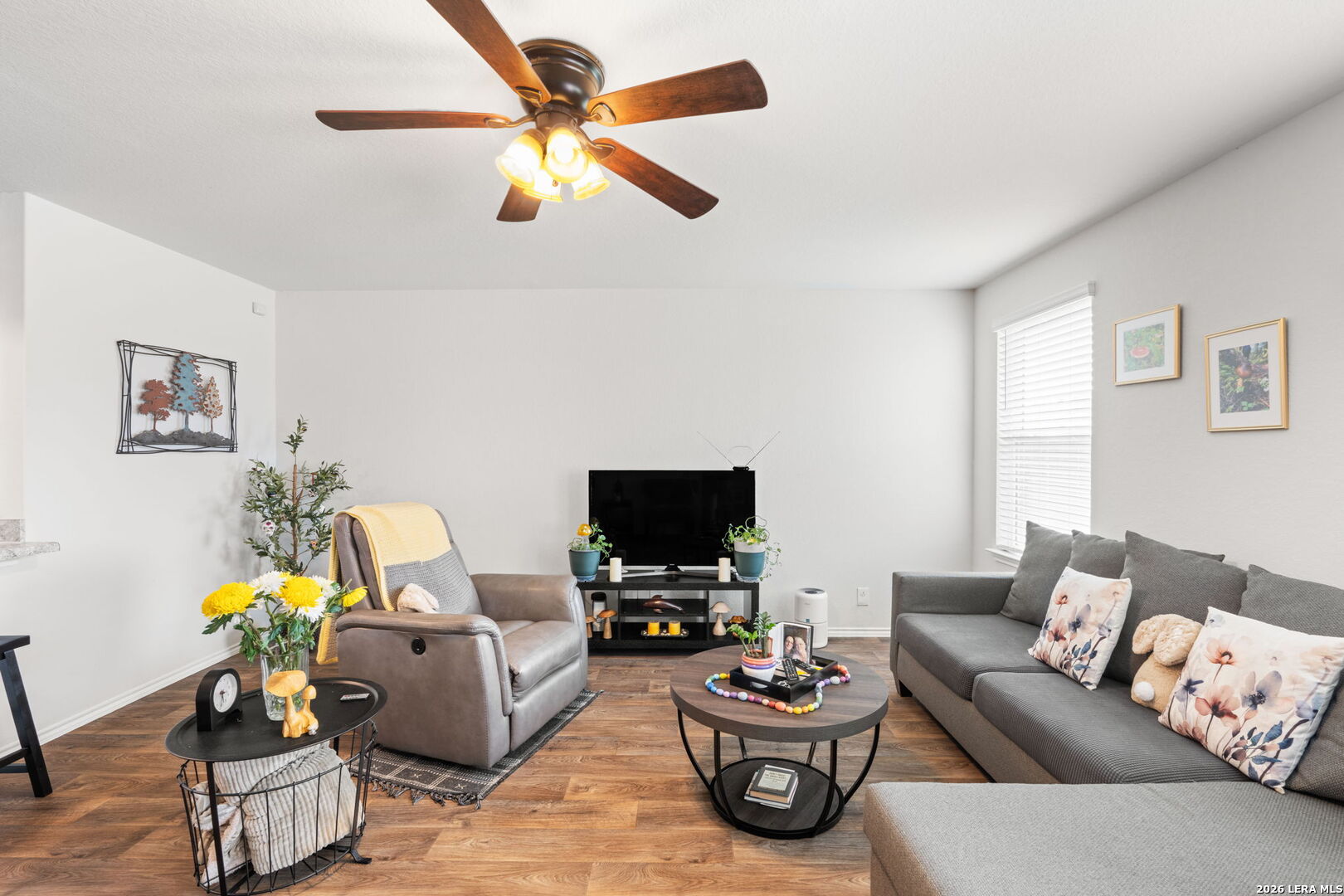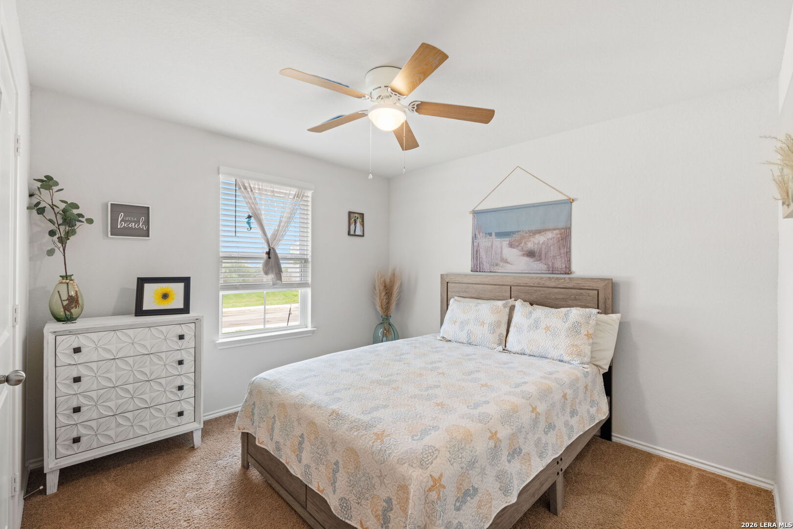 ** OPEN HOUSE on Saturday, 05/02/2026 from 11-1pm ** Single-story open floor plan home with a classic brick exterior designed for comfortable everyday living. The interior features laminate flooring in main areas and carpet in bedrooms, creating a balanced blend of style and comfort. The kitchen with stainless steel appliances includes a convenient breakfast bar and recessed lighting throughout, offering a bright and functional space for cooking and gathering. The primary suite includes a full bathroom, large mirror, single vanity, and a walk-in closet, providing practical storage and a well-laid-out private retreat. Step outside to a spacious backyard with privacy fence, offering open space with no trees, allowing for flexible outdoor use, added sunlight, and easy maintenance. Community features include access to a neighborhood park and pool, adding to the overall lifestyle appeal. Conveniently located with easy access to I10 and Loop 1604, providing a short commute to Randolph Air Force Base and Fort Sam Houston. Situated within Judson ISD, known for its strong reputation in the area.
