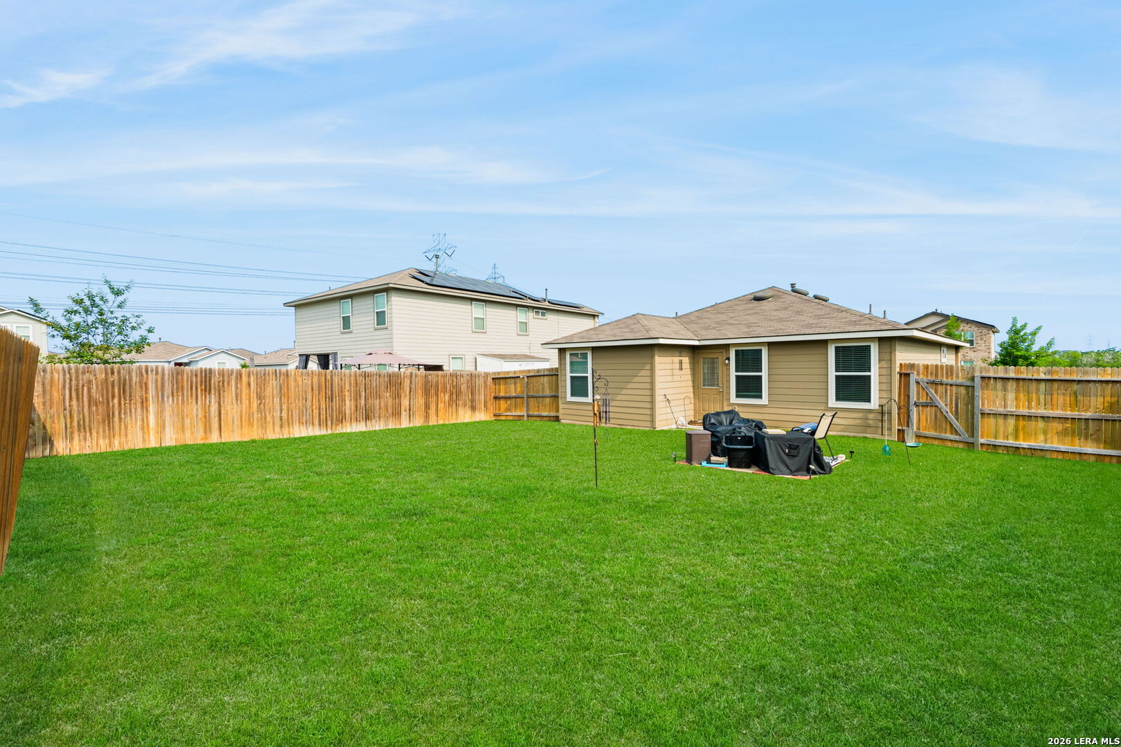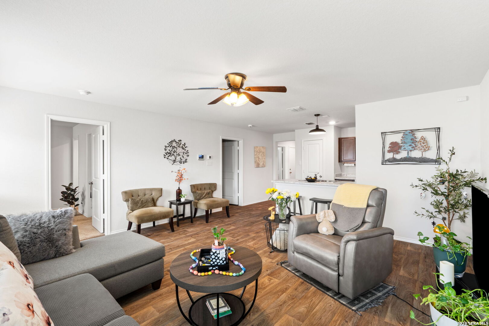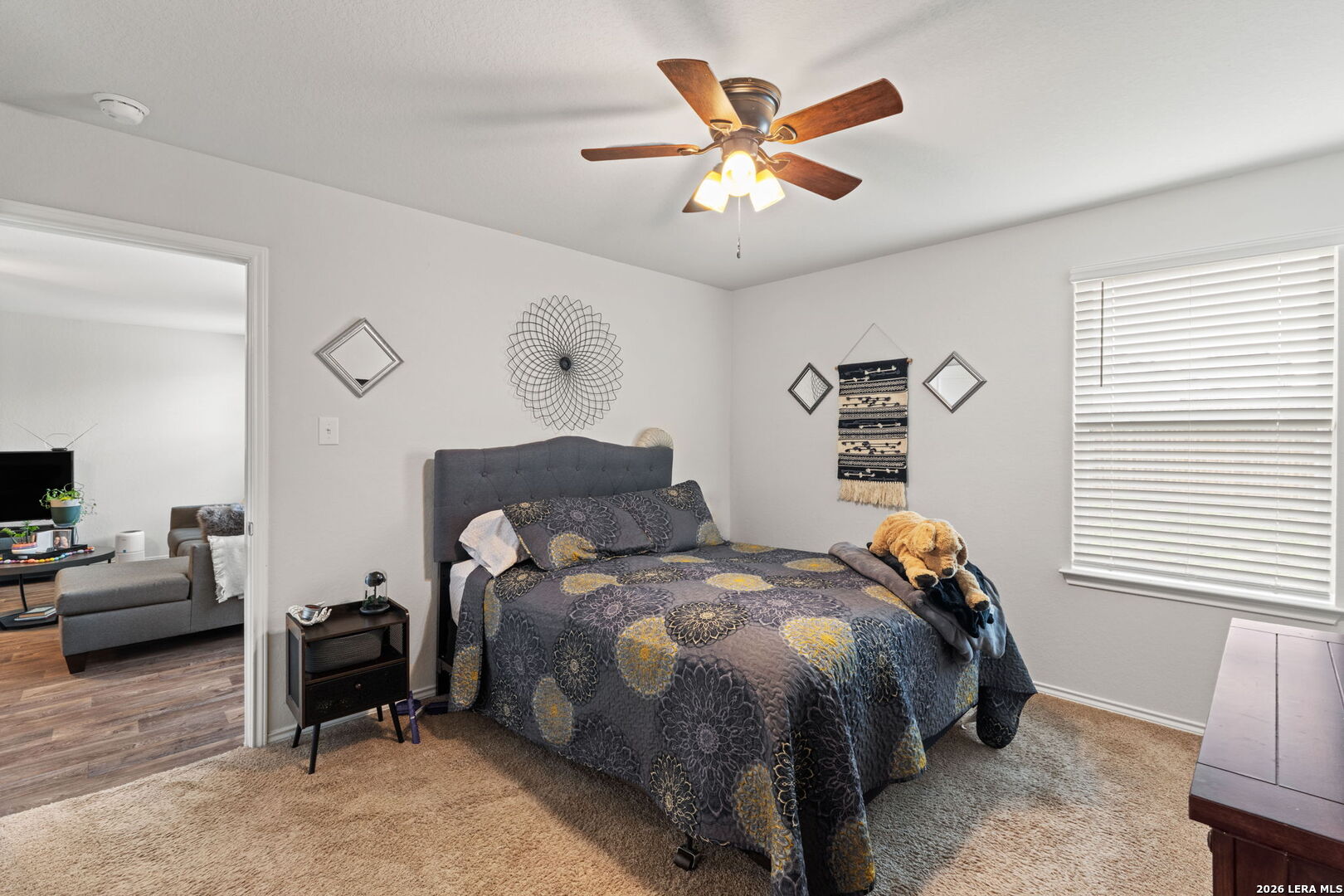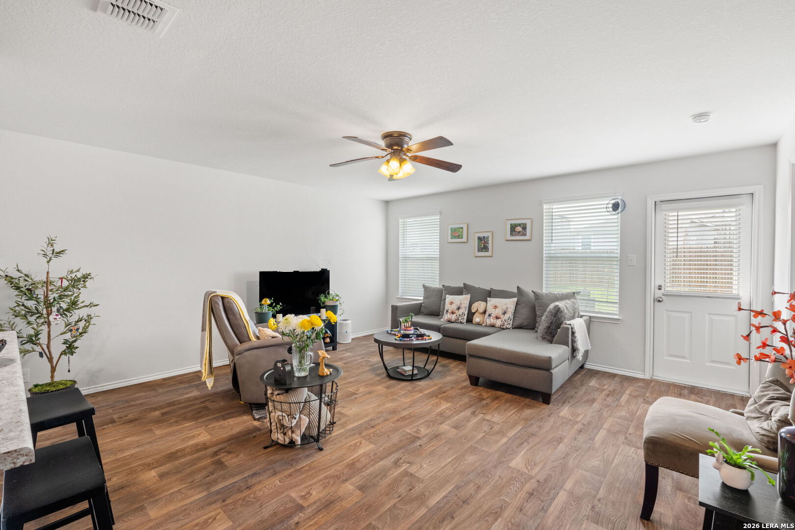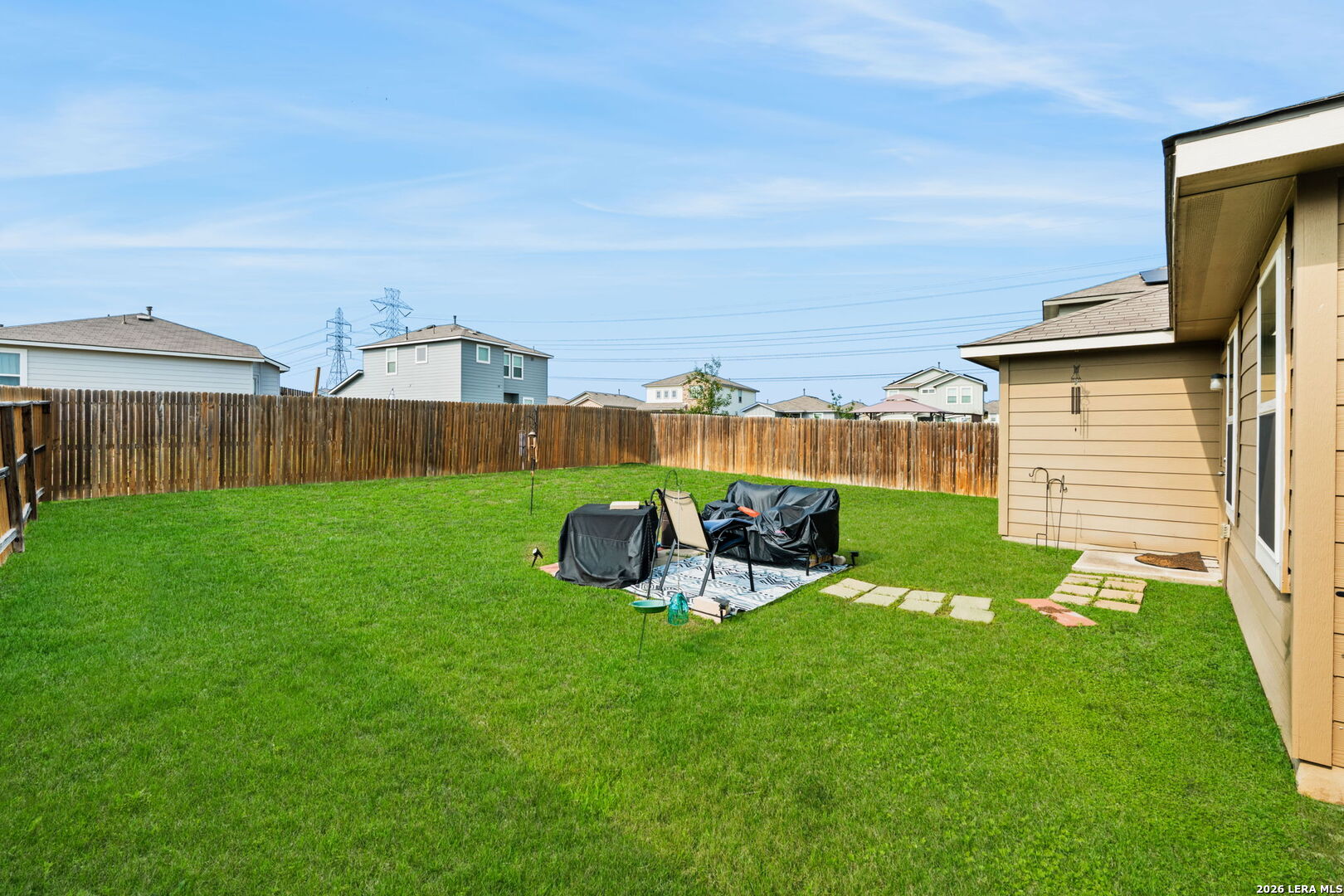 ** OPEN HOUSE on Saturday, 05/02/2026 from 11-1pm ** Single-story open floor plan home with a classic brick exterior designed for comfortable everyday living. The interior features laminate flooring in main areas and carpet in bedrooms, creating a balanced blend of style and comfort. The kitchen with stainless steel appliances includes a convenient breakfast bar and recessed lighting throughout, offering a bright and functional space for cooking and gathering. The primary suite includes a full bathroom, large mirror, single vanity, and a walk-in closet, providing practical storage and a well-laid-out private retreat. Step outside to a spacious backyard with privacy fence, offering open space with no trees, allowing for flexible outdoor use, added sunlight, and easy maintenance. Community features include access to a neighborhood park and pool, adding to the overall lifestyle appeal. Conveniently located with easy access to I10 and Loop 1604, providing a short commute to Randolph Air Force Base and Fort Sam Houston. Situated within Judson ISD, known for its strong reputation in the area.