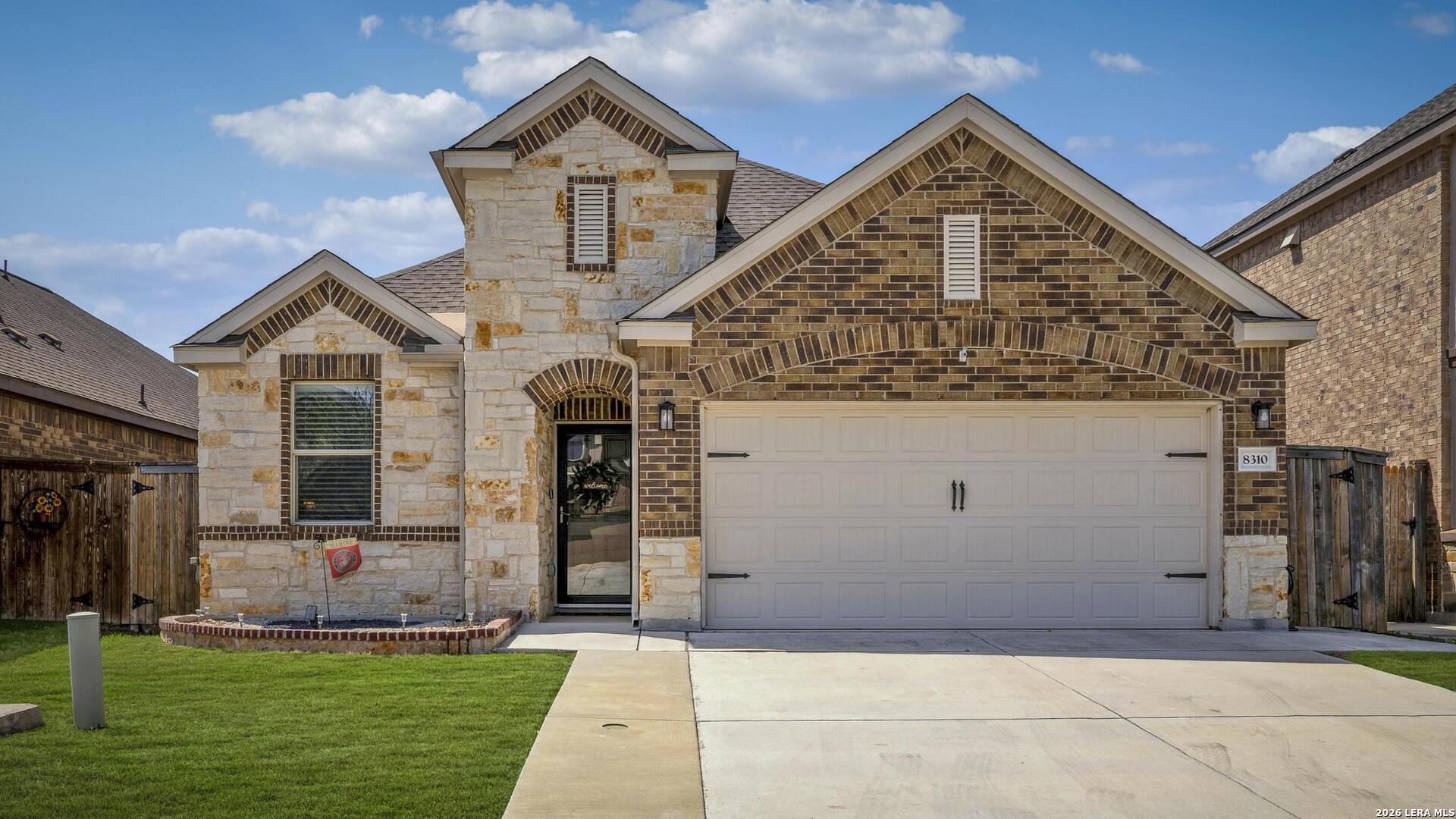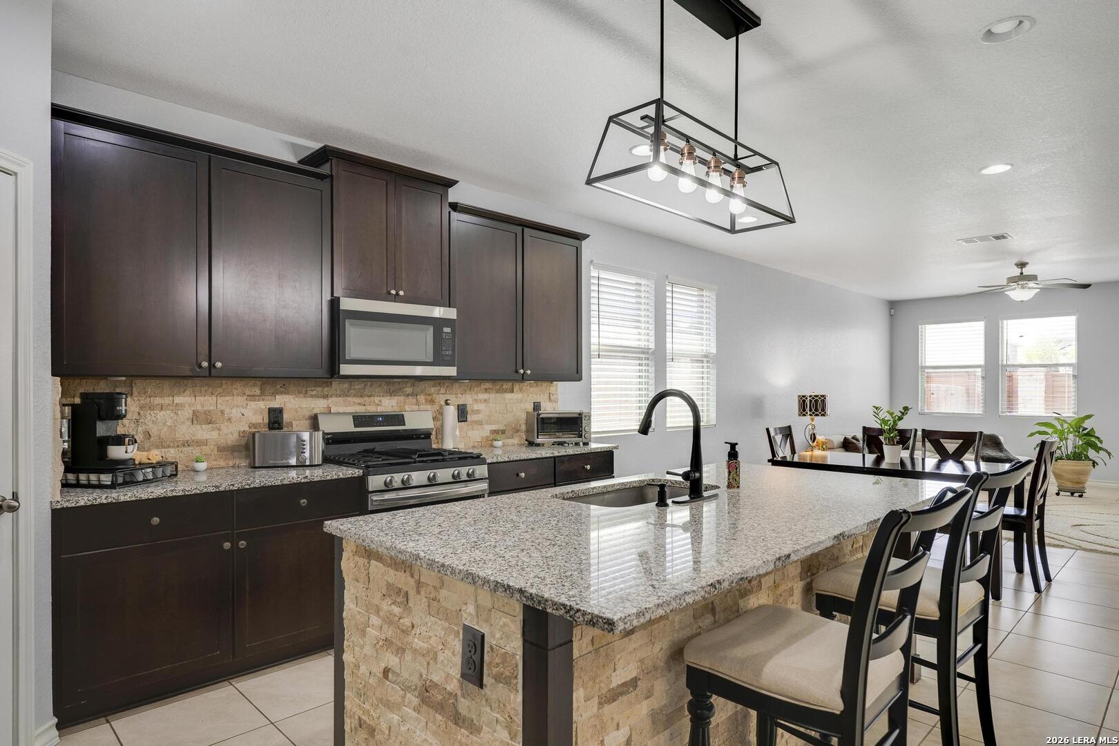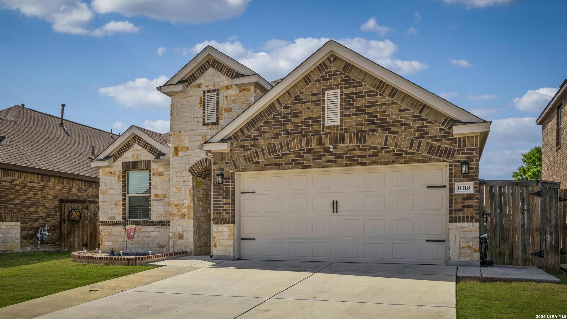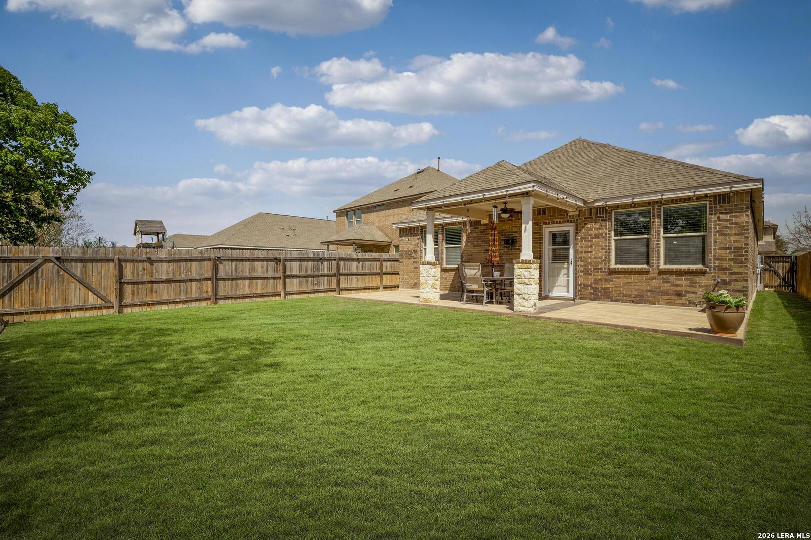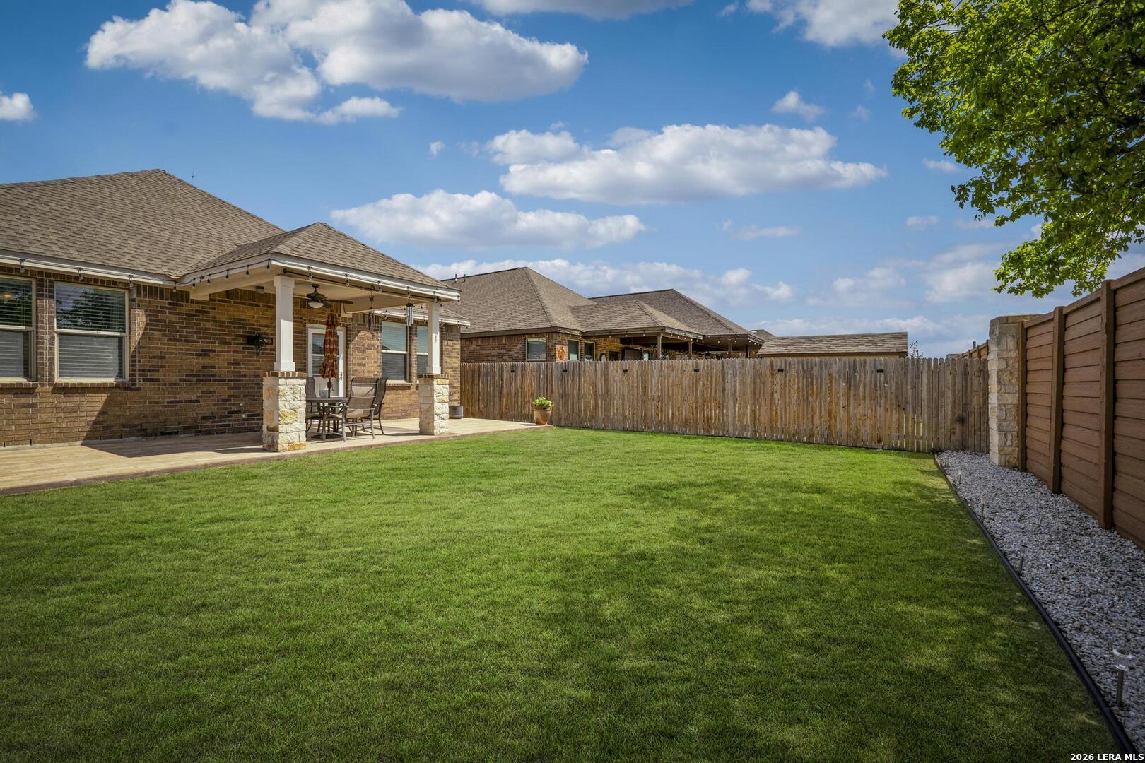 This lovely, impeccably maintained one-story, four-sided brick home is nestled in the highly desirable Stillwater Ranch community. Built in 2017, this thoughtfully designed residence offers 3 bedrooms, 2 bathrooms, and 1,648 square feet of comfortable living space with an open-concept layout perfect for both everyday living and entertaining. The heart of the home is the spacious gourmet kitchen, featuring a large island with seating, granite countertops, rich wood cabinetry, upgraded stainless steel appliances, and a gas stove-ideal for the home chef. The kitchen flows seamlessly into the breakfast area and family room, creating a warm and inviting space for gatherings. A versatile flex room at the front of the home provides endless possibilities-perfect as a home office, playroom, or additional living space. The private primary suite offers a relaxing retreat with a walk-in closet, double vanity, and a walk-in shower. Enjoy low-maintenance living with tile flooring in main areas and laminate flooring in the bedrooms and flex room. Step outside to a covered patio with added tile, a privacy fence, and rock landscaping-designed for easy upkeep and outdoor enjoyment. A sprinkler system services both the front and backyard. Ideally located just minutes from Loop 1604, Highway 151, Northwest Vista College, SeaWorld, and the popular Alamo Ranch shopping and dining destinations, this home truly offers the perfect combination of comfort, convenience, and lifestyle.