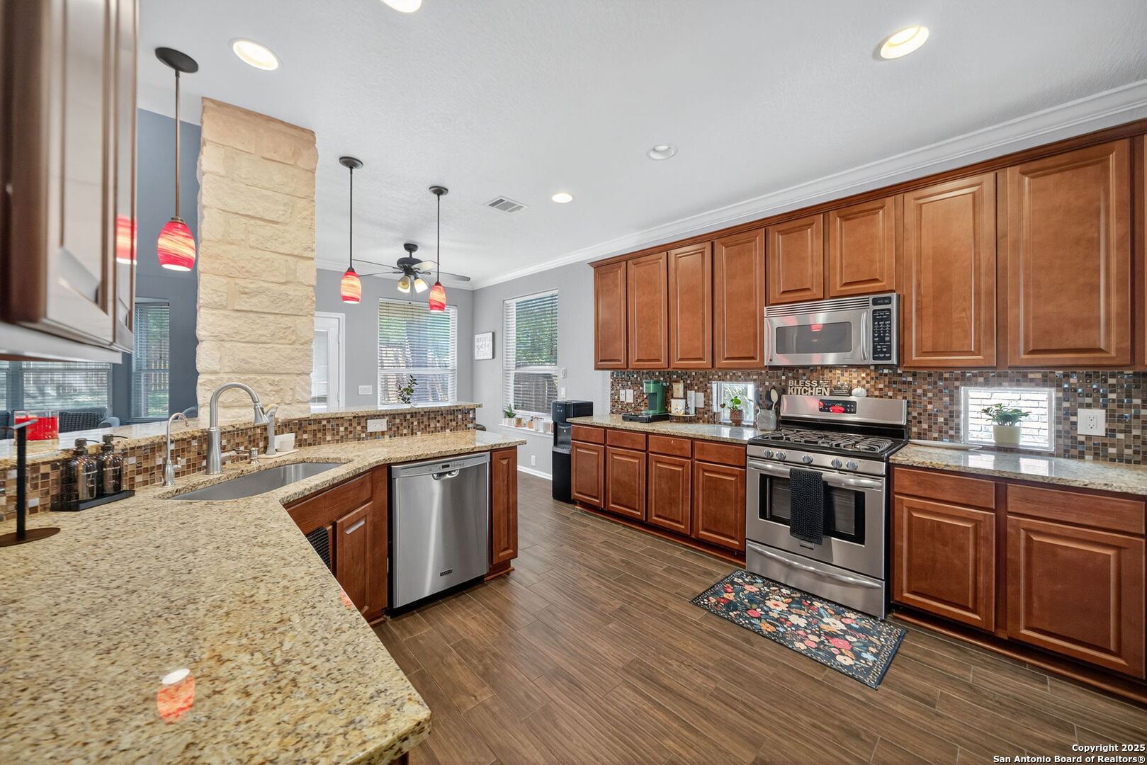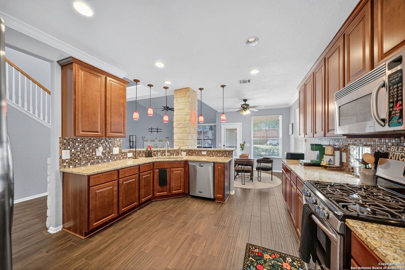 Well maintained stately home in a great central location. Near UTSA, The Rim, La Cantera Mall, Fiesta Texas, Medical Center and restaurants. This 4 bedroom 2 1/2 bath home is situated in a cul-de-sac. Has vaulted ceilings in the living room with a fireplace and lots of windows. The large kitchen features granite counter tops, a breakfast nook and pantry. The owners retreat has a large bedroom and bathroom with dual vanities, separate garden tub and shower and spacious walk in closet. Upstairs you will find the 3 other bedrooms, game/loft area and a private bathroom. Outside in the yard is a covered patio and mature trees.