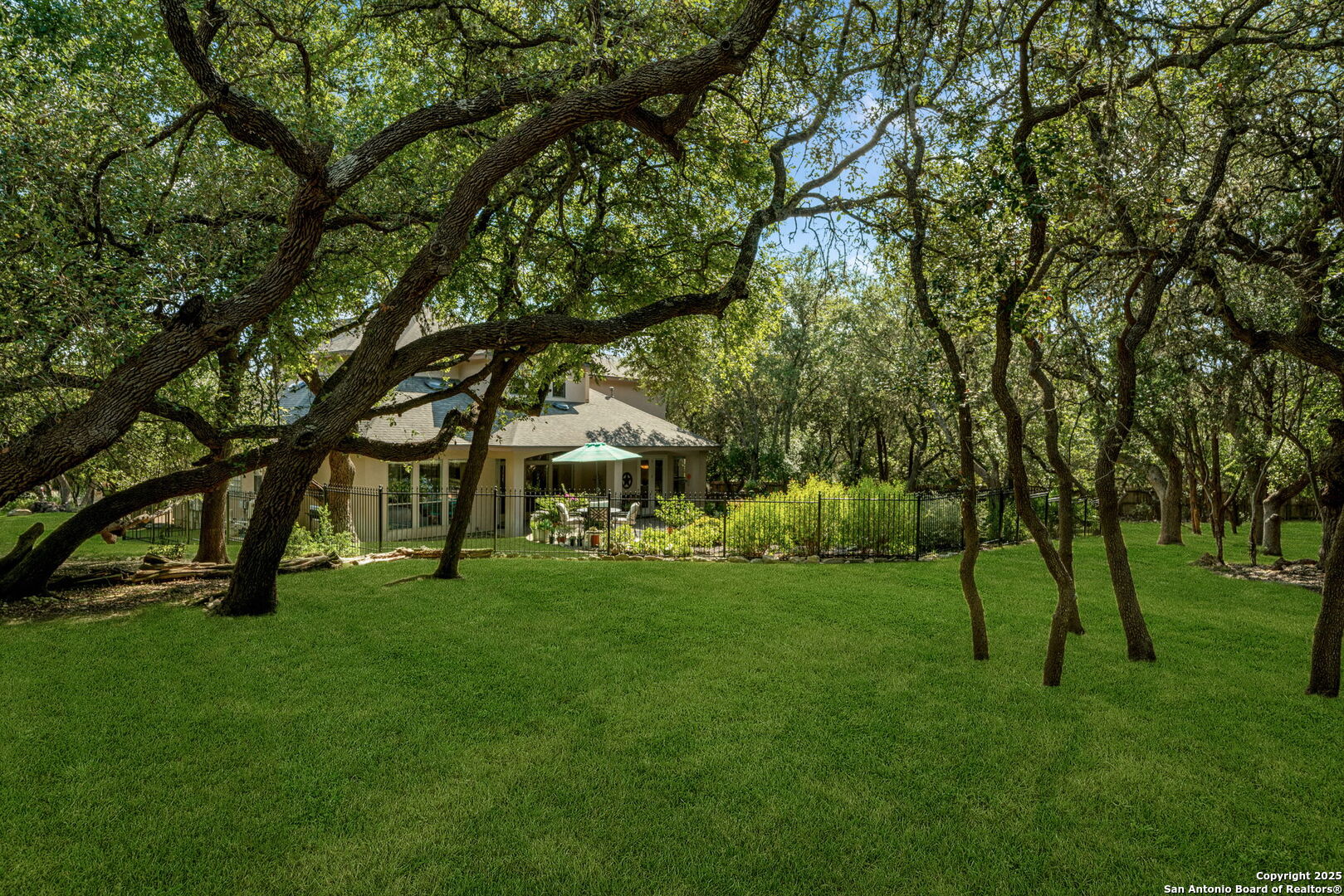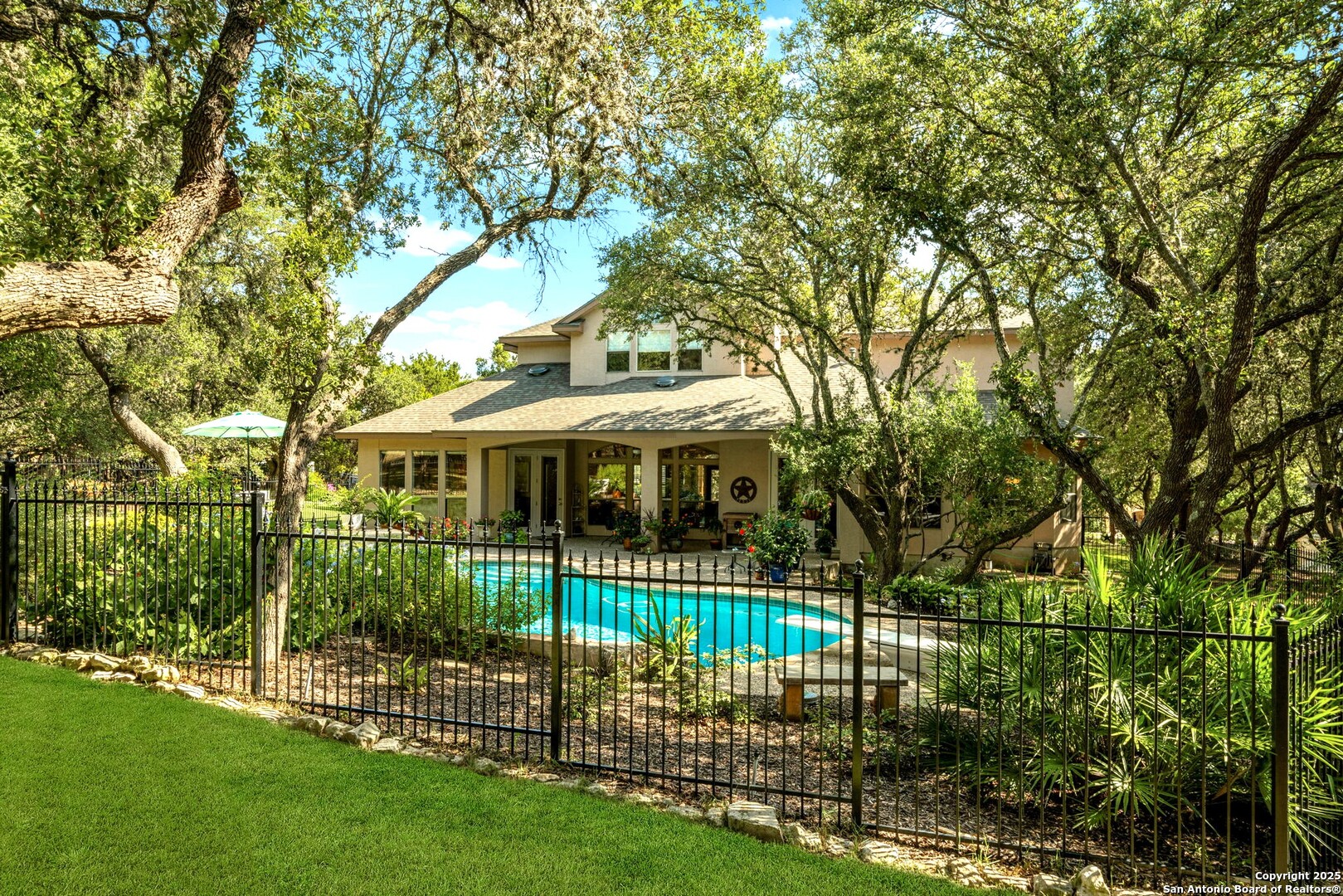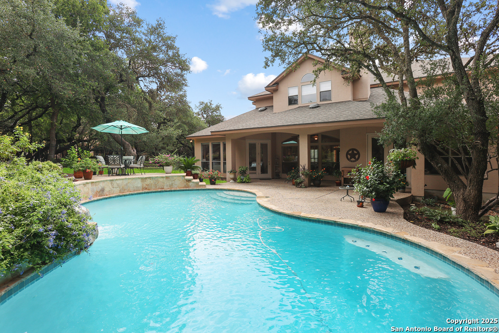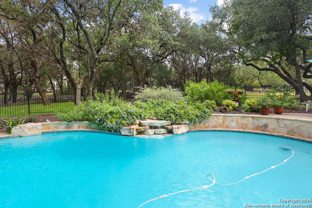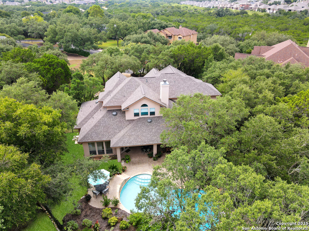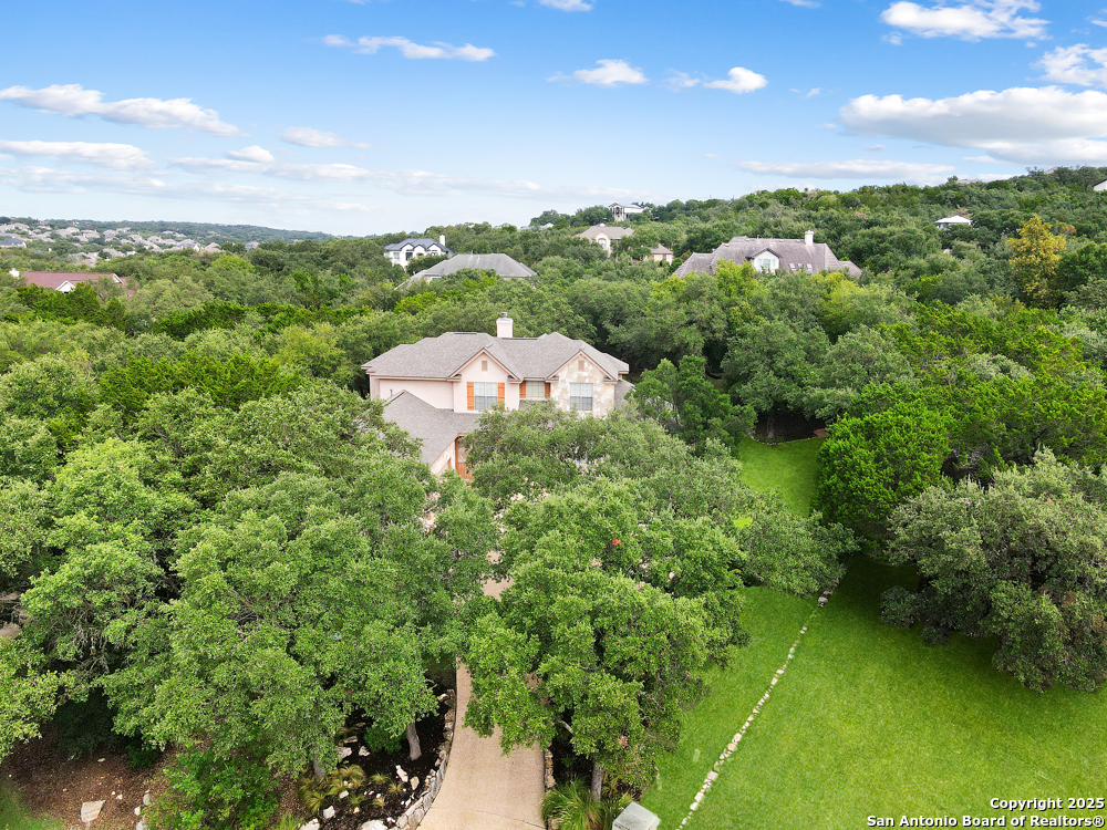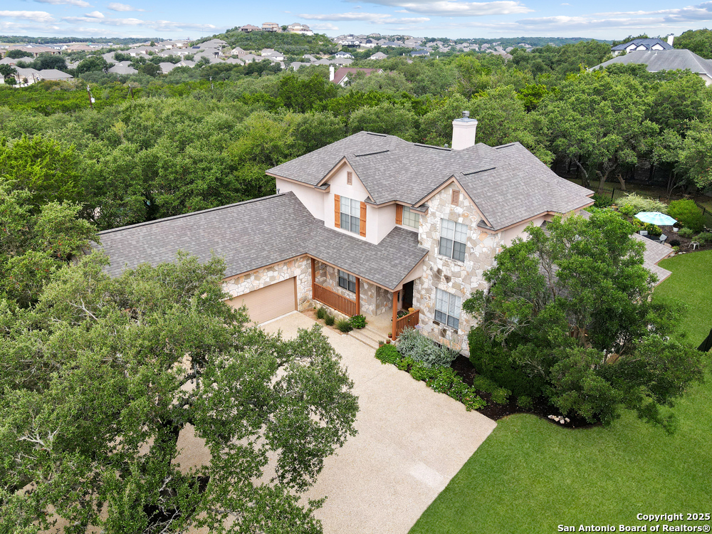 RARE OPPORTUNITY! Fantastic, custom family retreat on .76 acres of mature oak trees nestled at the end of a cul-de-sac in desirable, gated Village Green. Feel yourself relax as you pull into the gate of this peaceful community, conveniently located ONE MILE off IH-10 West, and wind down the entry road lined with the community hiking trail and flanked by plentiful trees. You are home. The cul-de-sac and long driveway welcomes to a side-entry 3-car garage and extra parking. Wander out back to relax on covered patio and survey the park-like, landscaped backyard featuring a large Keith Zars custom pool (recently resurfaced!), and enclosed with wrought iron fencing. But that's not all! Come sit beneath the gorgeous grove of oaks at the side of the house and explore the back part of the property - also fenced with wrought iron and the perfect place to kick a soccer ball, install a treehouse or run and play hide and & seek! The perfect feel of the Hill Country yet conveniently located near all the fun amenities (The Rim, La Cantera, The Rock, Leon Springs) AND with access to the highly-rated Boerne schools! Inside discover impeccable maintenance, large rooms, high ceilings with custom treatments and on-trend recent paint - a perfect palette. Upstairs are 3 very spacious secondary bedrooms and baths and a large game room. Look inside the closets for storage galore both conditioned air and Texas basement-style. Prepare for fun gatherings in the large, open kitchen with miles of Silestone counter tops, 54" cabinets, butler's pantry and a large pantry! Enjoy two spacious living areas both with views of the gorgeous backyard. The primary bedroom provides additional views to the backyard oasis and a large en-suite with big closet. 2025 warrantied new roof, newer water heater and HVAC, in-wall pest system, and water softener. The neighborhood amenities include a community pool and peaceful walking trail.