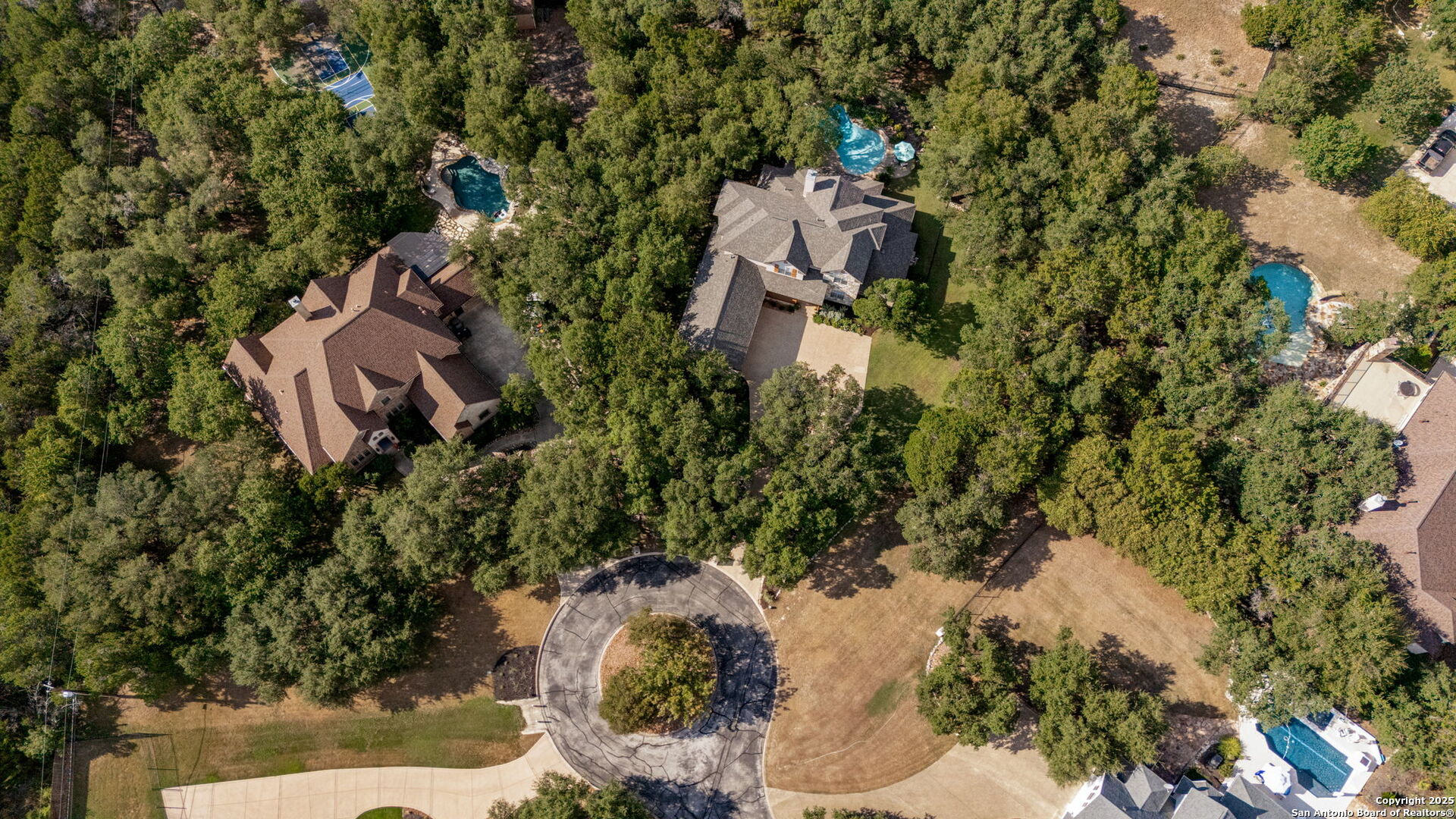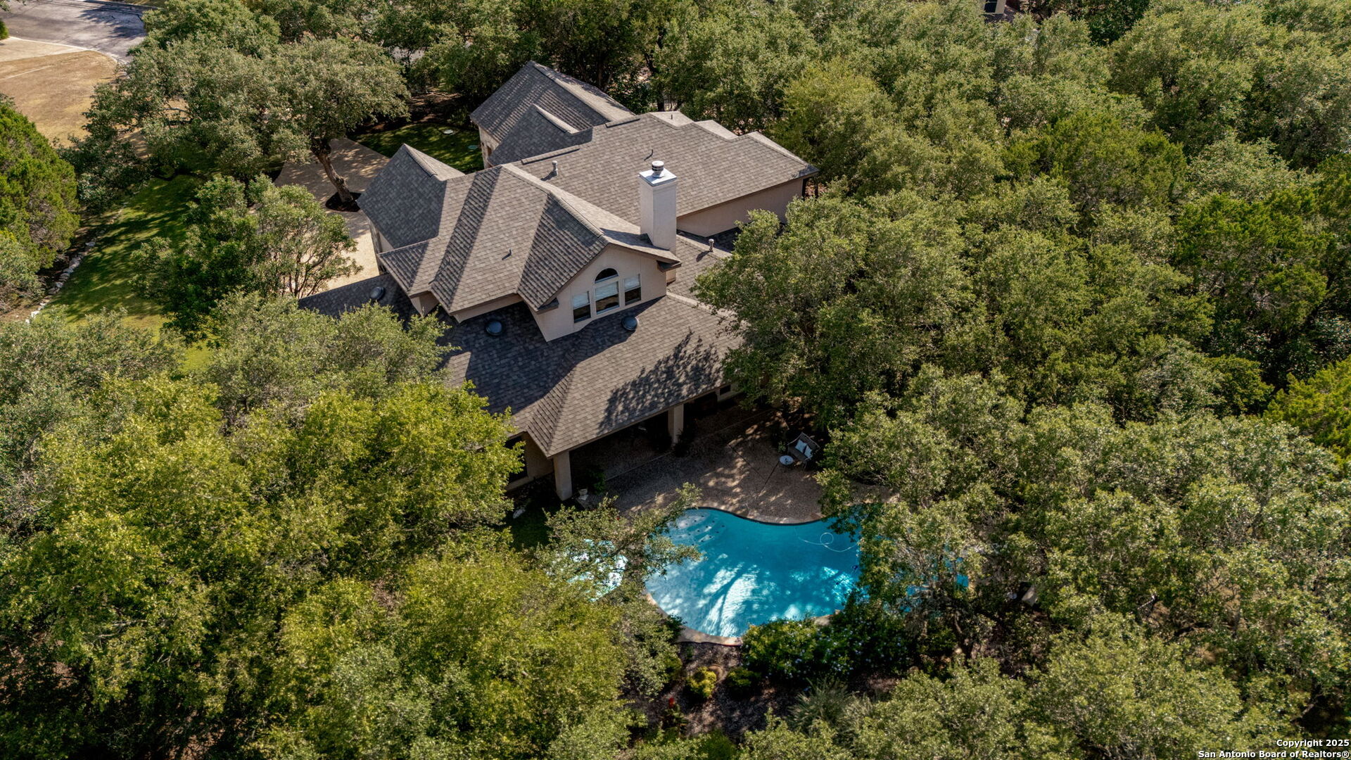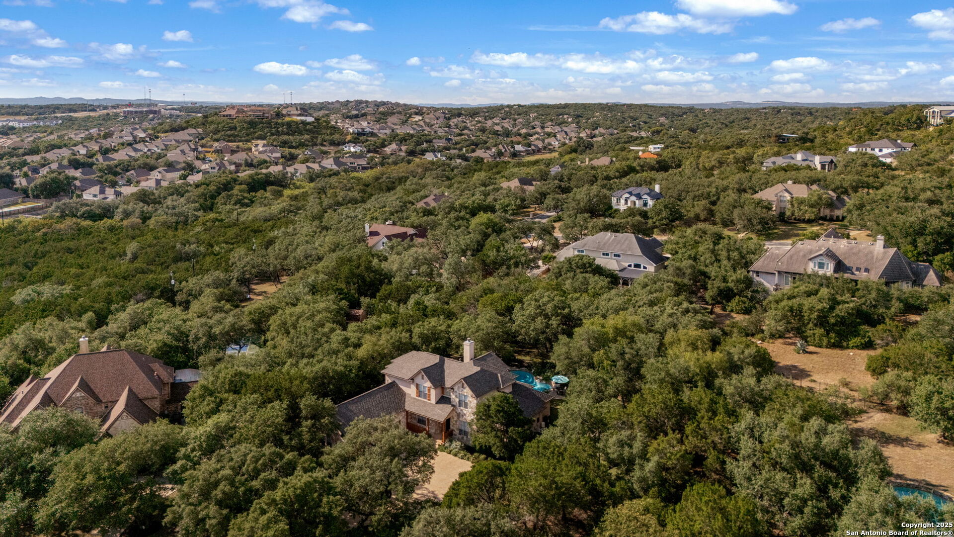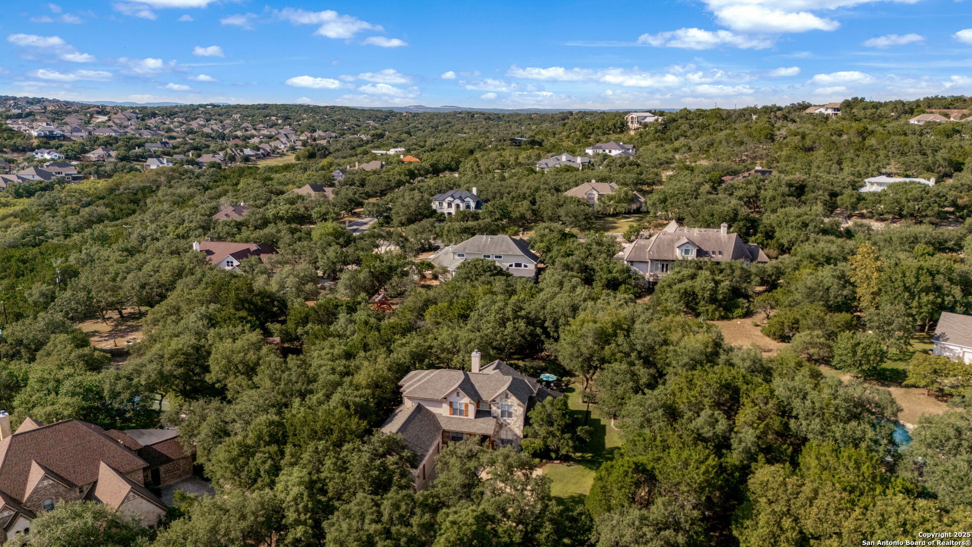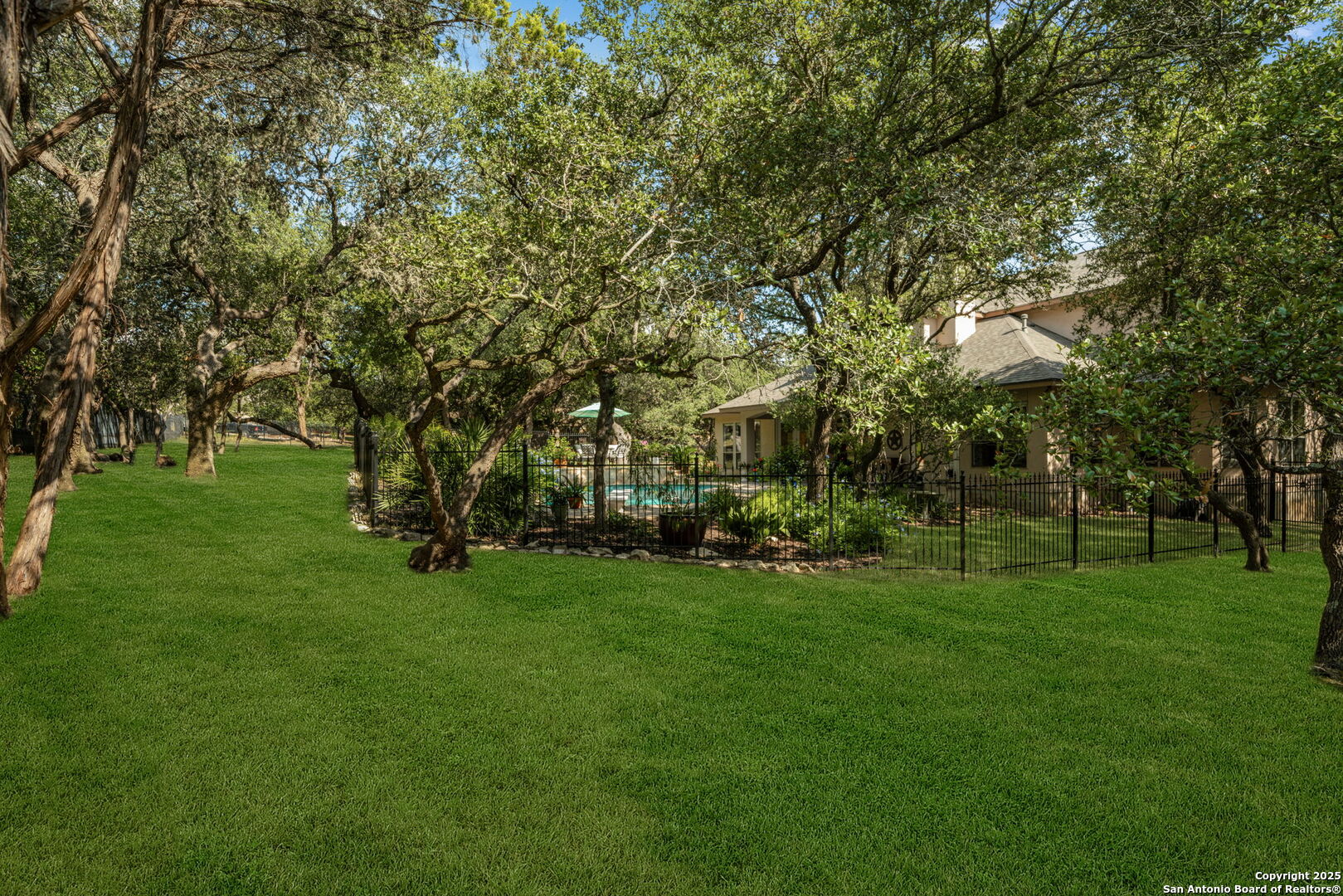 RARE OPPORTUNITY! Fantastic, custom family retreat on .76 acres of mature oak trees nestled at the end of a cul-de-sac in desirable, gated Village Green. Feel yourself relax as you pull into the gate of this peaceful community, conveniently located ONE MILE off IH-10 West, and wind down the entry road lined with the community hiking trail and flanked by plentiful trees. You are home. The cul-de-sac and long driveway welcomes to a side-entry 3-car garage and extra parking. Wander out back to relax on covered patio and survey the park-like, landscaped backyard featuring a large Keith Zars custom pool (recently resurfaced!), and enclosed with wrought iron fencing. But that's not all! Come sit beneath the gorgeous grove of oaks at the side of the house and explore the back part of the property - also fenced with wrought iron and the perfect place to kick a soccer ball, install a treehouse or run and play hide and & seek! The perfect feel of the Hill Country yet conveniently located near all the fun amenities (The Rim, La Cantera, The Rock, Leon Springs) AND with access to the highly-rated Boerne schools! Inside discover impeccable maintenance, large rooms, high ceilings with custom treatments and on-trend recent paint - a perfect palette. Upstairs are 3 very spacious secondary bedrooms and baths and a large game room. Look inside the closets for storage galore both conditioned air and Texas basement-style. Prepare for fun gatherings in the large, open kitchen with miles of Silestone counter tops, 54" cabinets, butler's pantry and a large pantry! Enjoy two spacious living areas both with views of the gorgeous backyard. The primary bedroom provides additional views to the backyard oasis and a large en-suite with big closet. 2025 warrantied new roof, newer water heater and HVAC, in-wall pest system, and water softener. The neighborhood amenities include a community pool and peaceful walking trail.