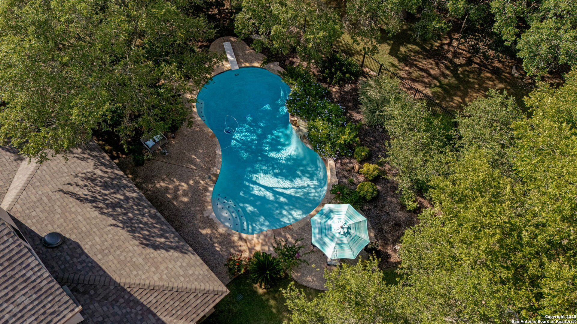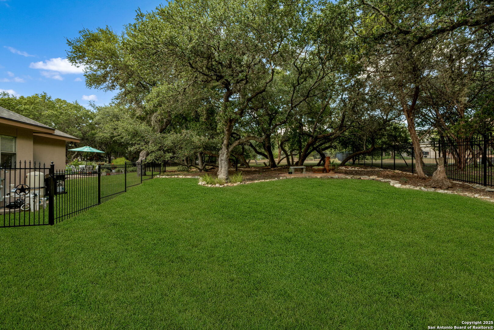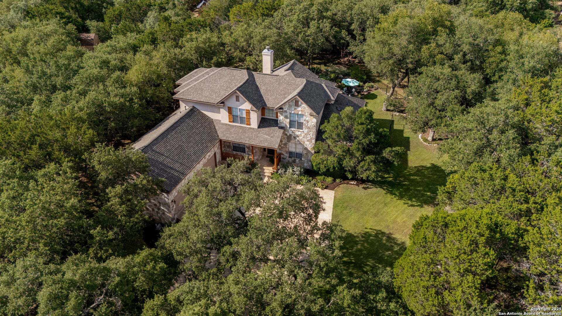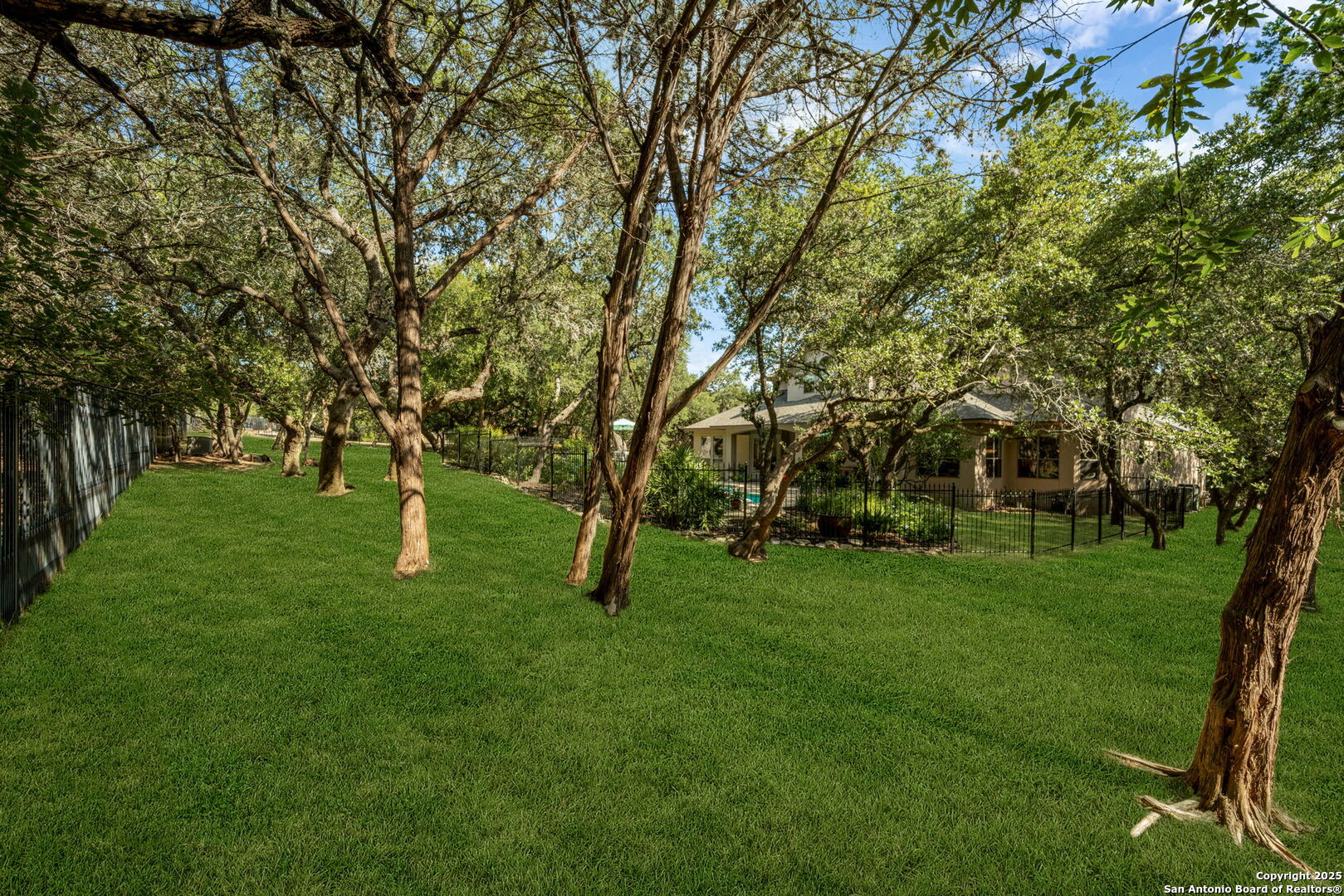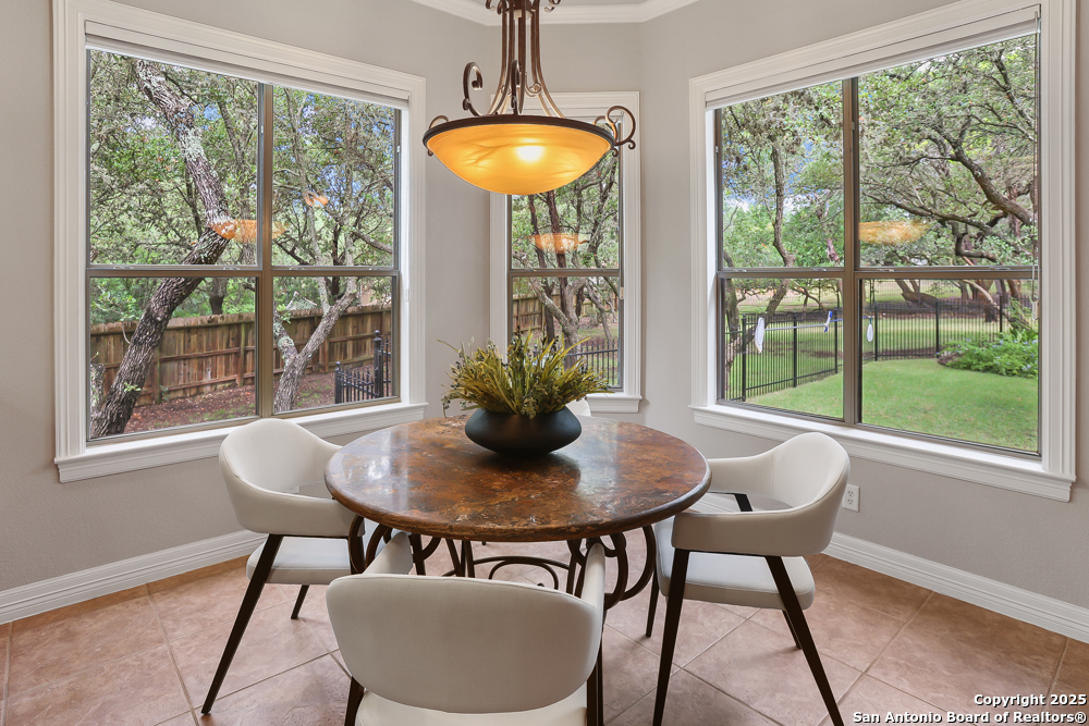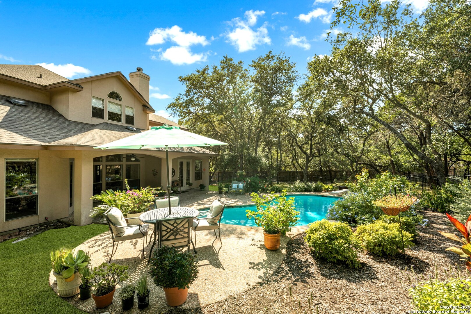 RARE OPPORTUNITY! Fantastic, custom family retreat on .76 acres of mature oak trees nestled at the end of a cul-de-sac in desirable, gated Village Green. Feel yourself relax as you pull into the gate of this peaceful community, conveniently located ONE MILE off IH-10 West, and wind down the entry road lined with the community hiking trail and flanked by plentiful trees. You are home. The cul-de-sac and long driveway welcomes to a side-entry 3-car garage and extra parking. Wander out back to relax on covered patio and survey the park-like, landscaped backyard featuring a large Keith Zars custom pool (recently resurfaced!), and enclosed with wrought iron fencing. But that's not all! Come sit beneath the gorgeous grove of oaks at the side of the house and explore the back part of the property - also fenced with wrought iron and the perfect place to kick a soccer ball, install a treehouse or run and play hide and & seek! The perfect feel of the Hill Country yet conveniently located near all the fun amenities (The Rim, La Cantera, The Rock, Leon Springs) AND with access to the highly-rated Boerne schools! Inside discover impeccable maintenance, large rooms, high ceilings with custom treatments and on-trend recent paint - a perfect palette. Upstairs are 3 very spacious secondary bedrooms and baths and a large game room. Look inside the closets for storage galore both conditioned air and Texas basement-style. Prepare for fun gatherings in the large, open kitchen with miles of Silestone counter tops, 54" cabinets, butler's pantry and a large pantry! Enjoy two spacious living areas both with views of the gorgeous backyard. The primary bedroom provides additional views to the backyard oasis and a large en-suite with big closet. 2025 warrantied new roof, newer water heater and HVAC, in-wall pest system, and water softener. The neighborhood amenities include a community pool and peaceful walking trail.
