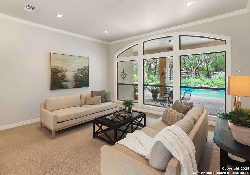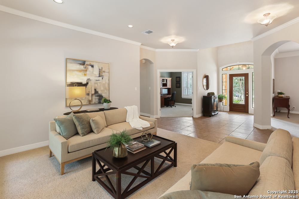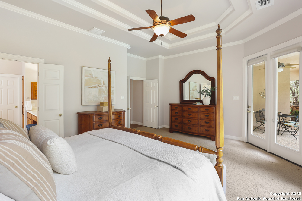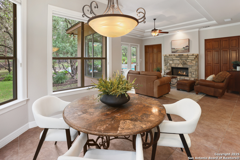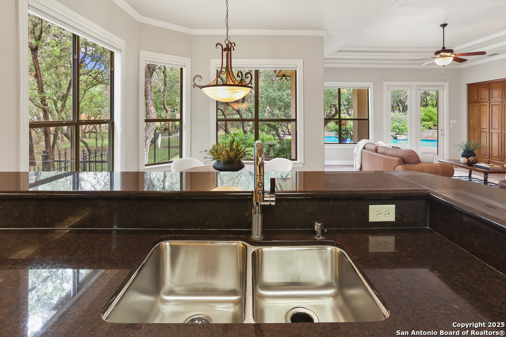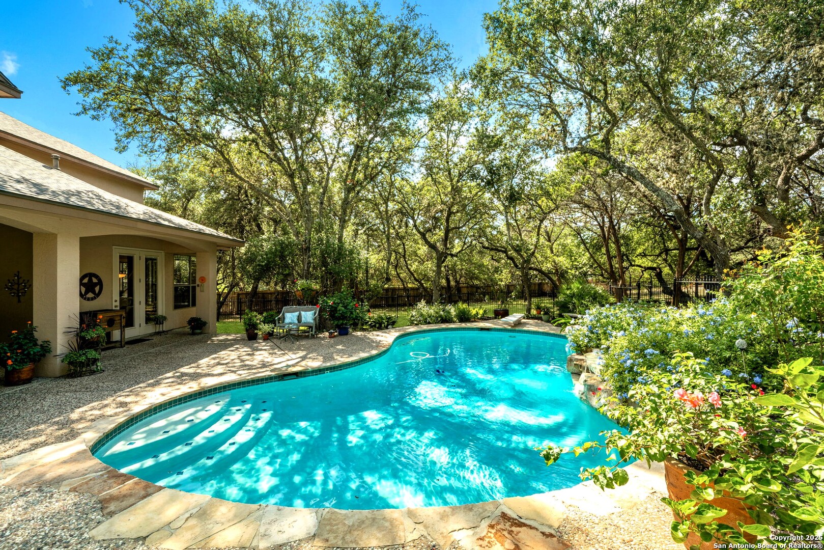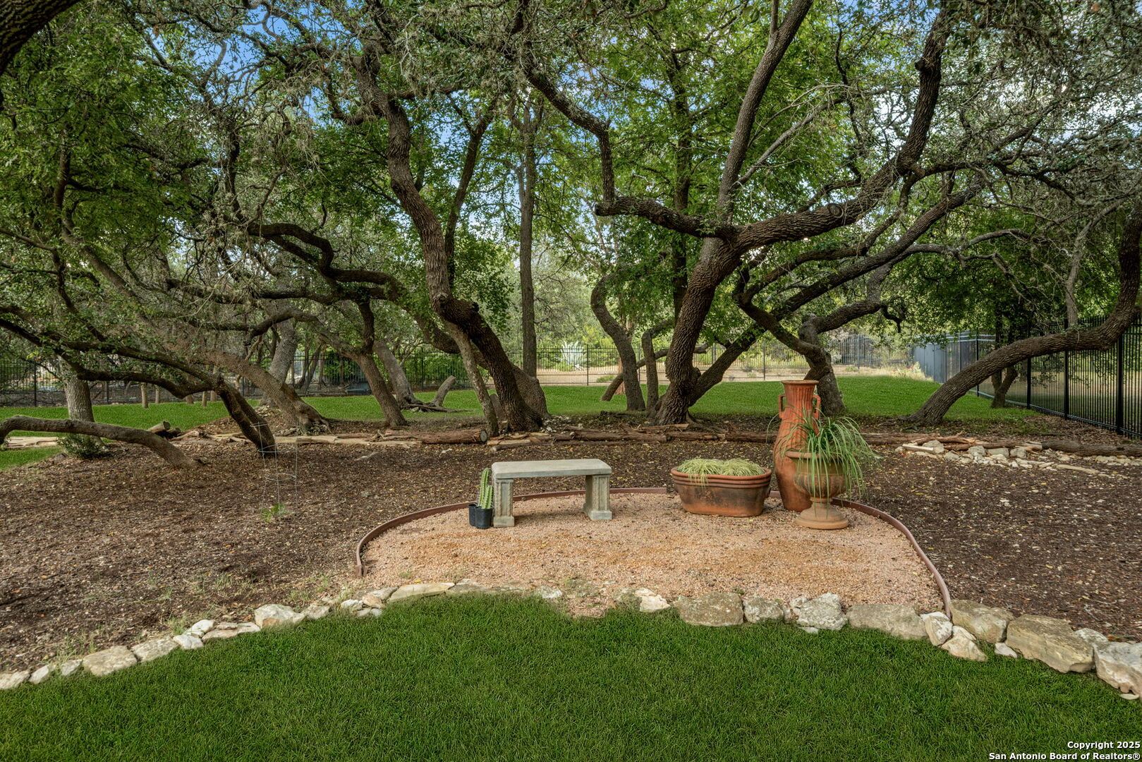 RARE OPPORTUNITY! Fantastic, custom family retreat on .76 acres of mature oak trees nestled at the end of a cul-de-sac in desirable, gated Village Green. Feel yourself relax as you pull into the gate of this peaceful community, conveniently located ONE MILE off IH-10 West, and wind down the entry road lined with the community hiking trail and flanked by plentiful trees. You are home. The cul-de-sac and long driveway welcomes to a side-entry 3-car garage and extra parking. Wander out back to relax on covered patio and survey the park-like, landscaped backyard featuring a large Keith Zars custom pool (recently resurfaced!), and enclosed with wrought iron fencing. But that's not all! Come sit beneath the gorgeous grove of oaks at the side of the house and explore the back part of the property - also fenced with wrought iron and the perfect place to kick a soccer ball, install a treehouse or run and play hide and & seek! The perfect feel of the Hill Country yet conveniently located near all the fun amenities (The Rim, La Cantera, The Rock, Leon Springs) AND with access to the highly-rated Boerne schools! Inside discover impeccable maintenance, large rooms, high ceilings with custom treatments and on-trend recent paint - a perfect palette. Upstairs are 3 very spacious secondary bedrooms and baths and a large game room. Look inside the closets for storage galore both conditioned air and Texas basement-style. Prepare for fun gatherings in the large, open kitchen with miles of Silestone counter tops, 54" cabinets, butler's pantry and a large pantry! Enjoy two spacious living areas both with views of the gorgeous backyard. The primary bedroom provides additional views to the backyard oasis and a large en-suite with big closet. 2025 warrantied new roof, newer water heater and HVAC, in-wall pest system, and water softener. The neighborhood amenities include a community pool and peaceful walking trail.