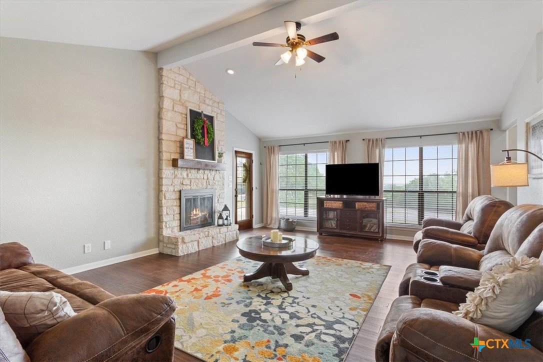 Perched atop a private hilltop with breathtaking panoramic views, this stunning 3-bedroom, 2.5-bath home offers a rare combination of seclusion, elegance, and modern comfort. From the moment you arrive, the elevated setting and serene surroundings signal that this is something truly special. Step inside, and the home welcomes you with vaulted ceilings that instantly create a sense of grandeur. The stone fireplace anchors the room with warmth and character. The kitchen is a standout for those who love to cook and entertain. A large center island offers ample workspace and effortless gathering — whether it's morning coffee or cocktail hour, everyone gravitates here. Recent updates bring true peace of mind — including a new HVAC system, water heater, blinds, carpet, and double oven — so you can simply move in and enjoy. Step outside to the covered pergola and let Central Texas sunsets do the talking. Whether you're hosting guests or unwinding after a long week, this outdoor living space delivers the kind of golden-hour moments you'll never tire of. With nearly an acre to call your own and no through-traffic on the private road, this property offers the privacy and breathing room that's nearly impossible to find at this price point. If you've been searching for a home that feels like a reward — this is it.