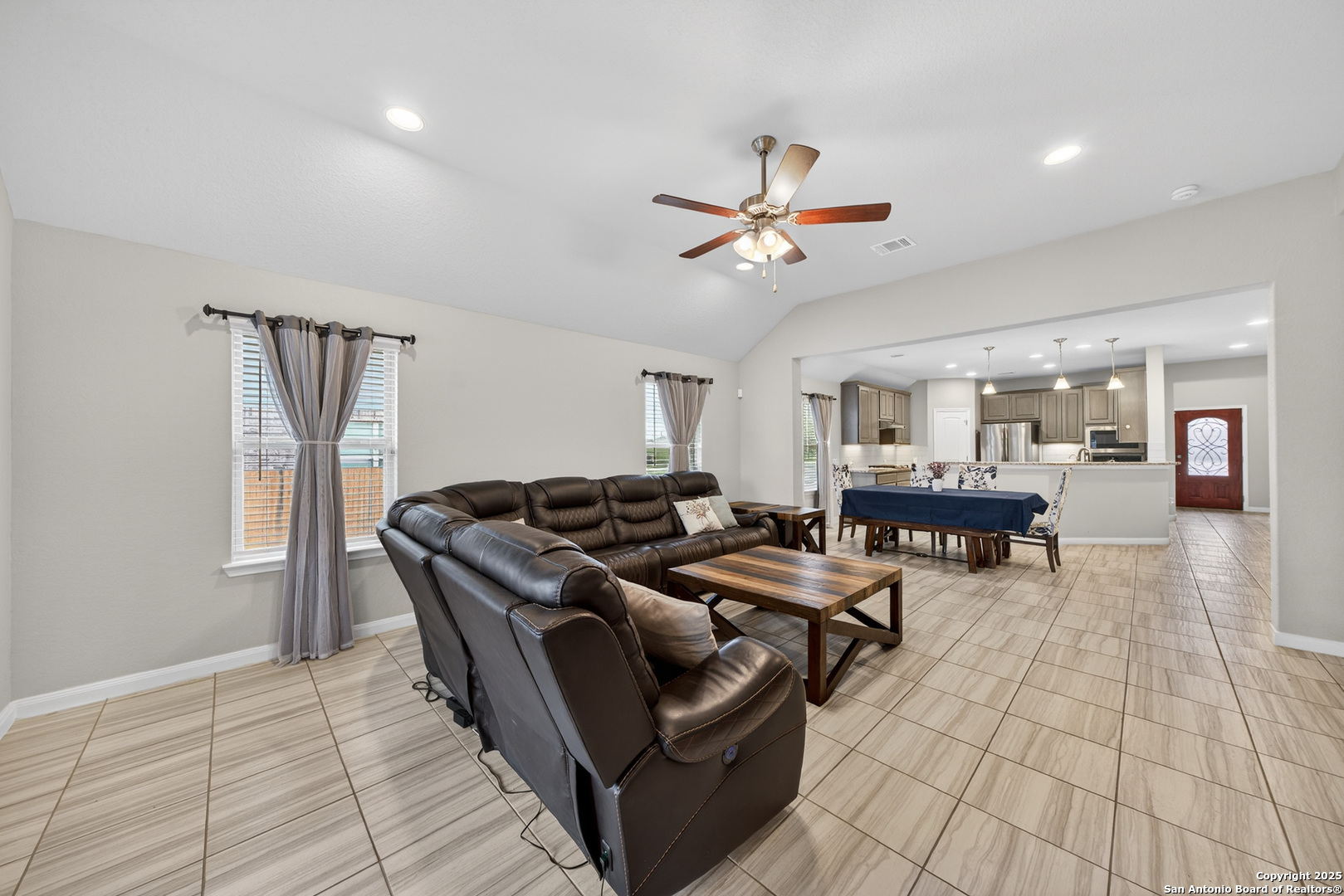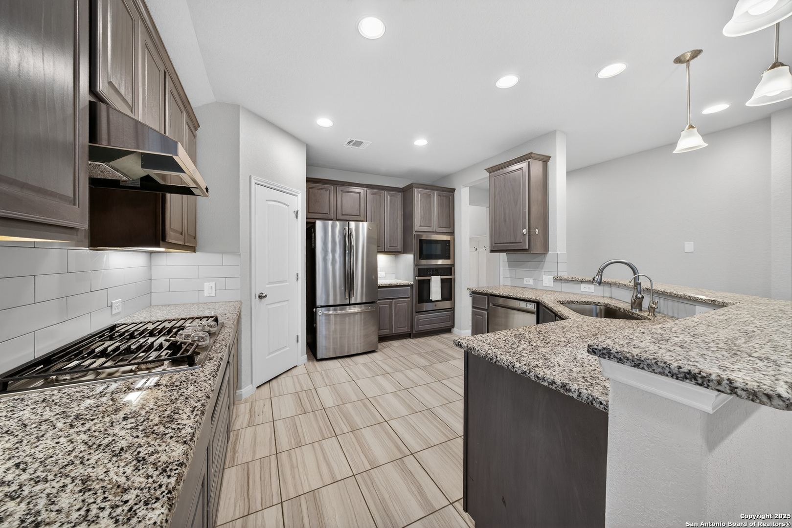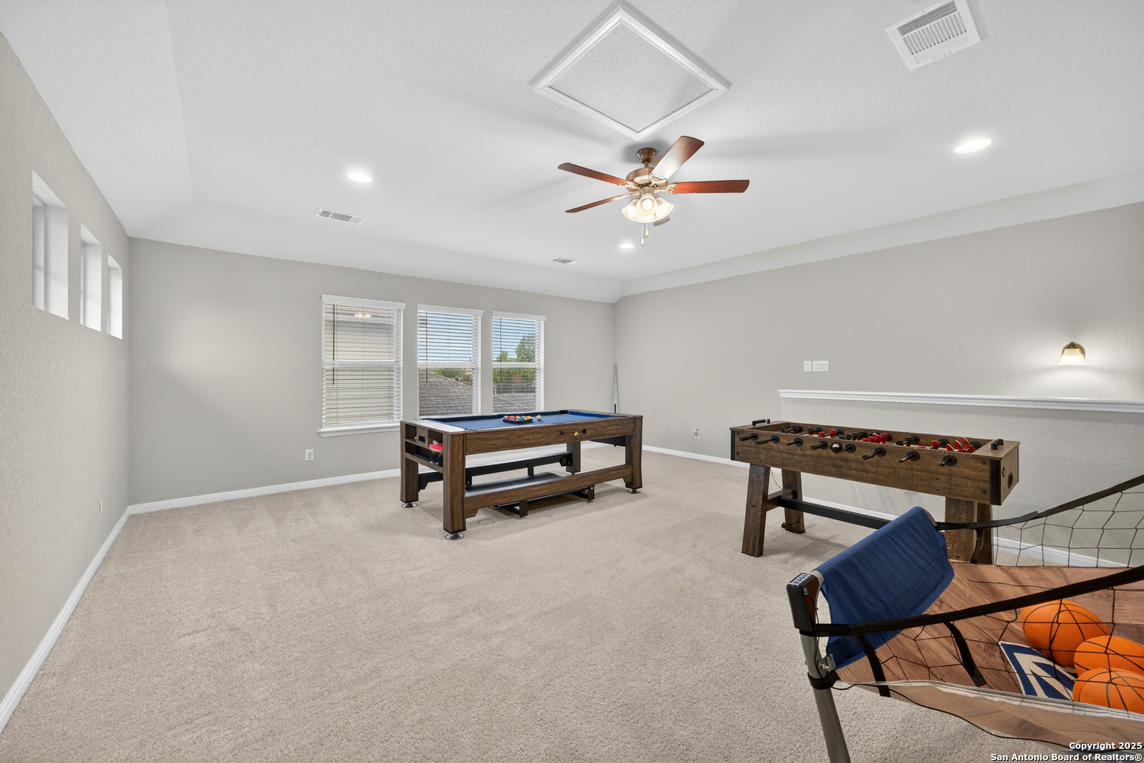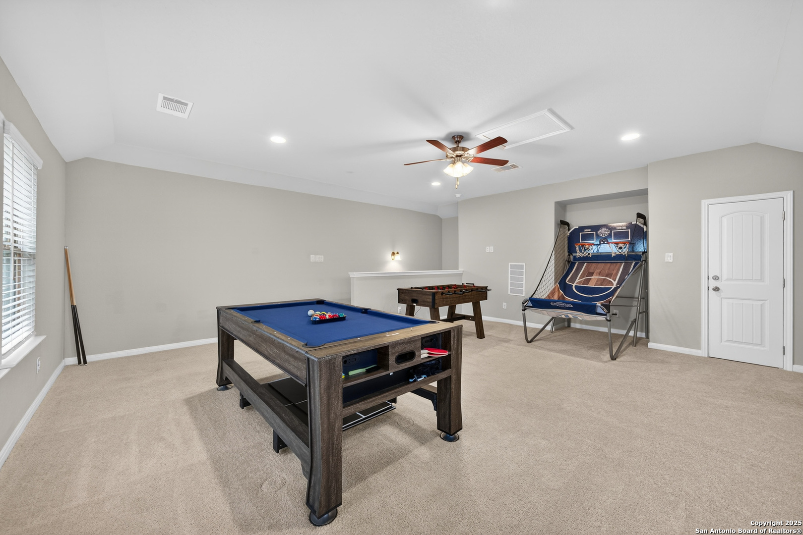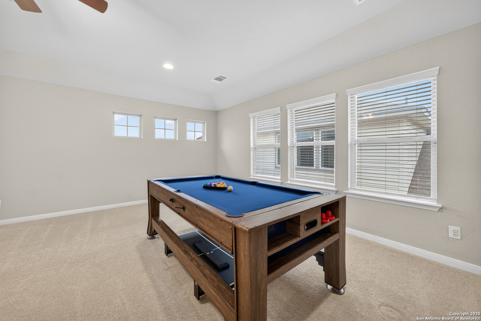 Welcome to this beautifully maintained 1.5-story home offering over 2,566 sq. ft. of thoughtfully designed living space. The main level features tile flooring throughout, brand-new carpet in all bedrooms, 3 spacious bedrooms, and 2 full baths, along with a private study and an additional flex room ideal for work, hobbies, or play. The enhanced kitchen includes granite countertops, built-in stainless steel GE appliances, gas cooking, and opens seamlessly to a bright, inviting living area. Upstairs, you'll find a generous game room with its own powder bath-perfect for entertainment or relaxation. Additional upgrades include a sprinkler system, soft water system, and a security system for added convenience and peace of mind. Step outside to a covered patio overlooking a peaceful greenbelt, all tucked within a quiet cul-de-sac. Move-in ready and immaculately maintained, this home blends comfort, functionality, and style. A true must-see!