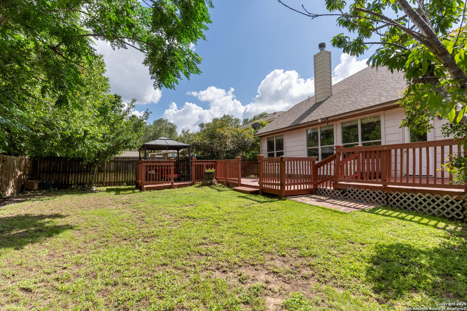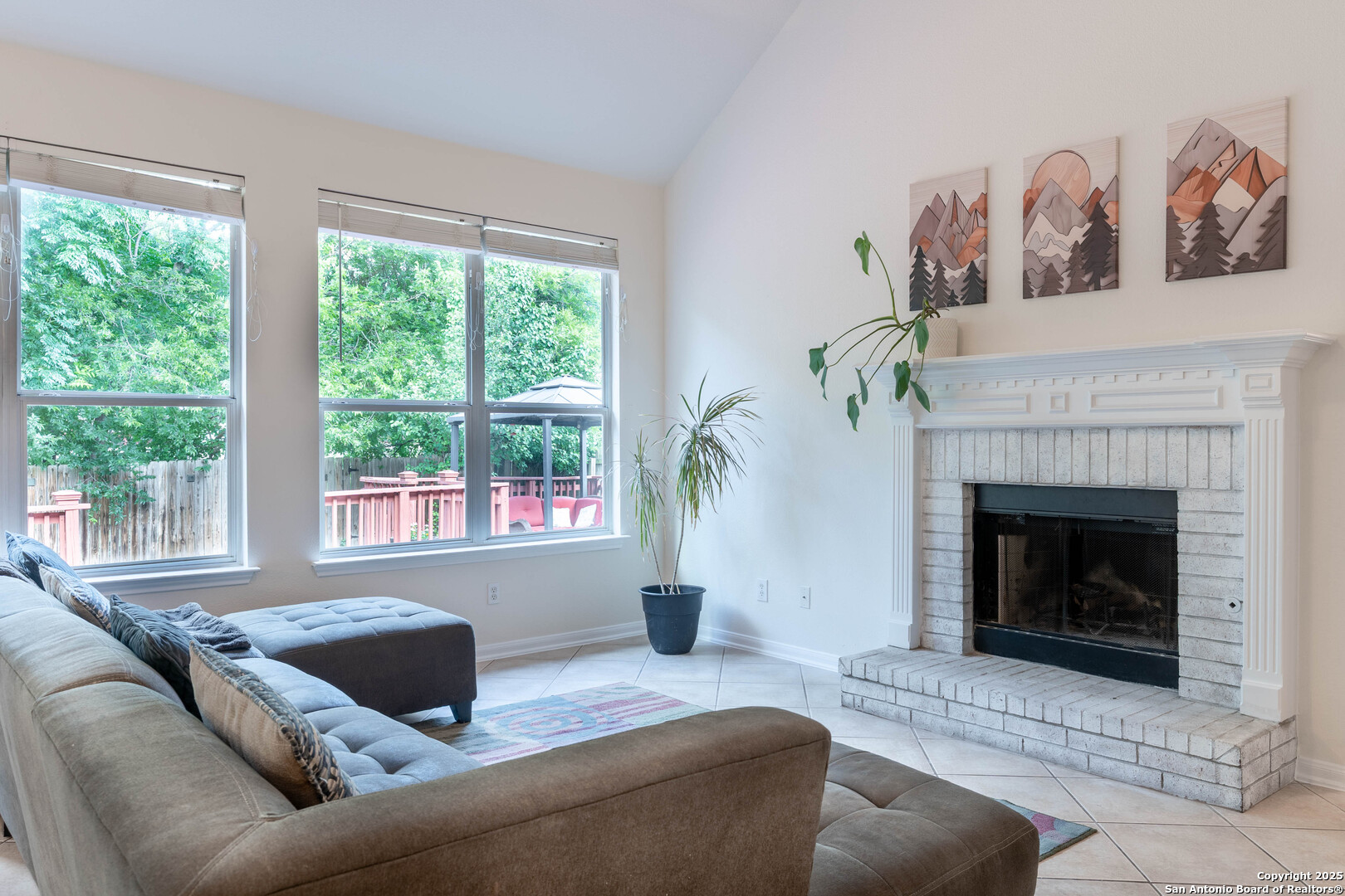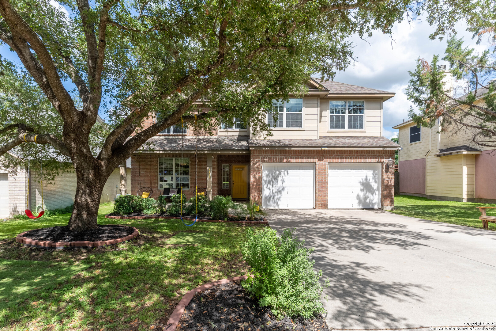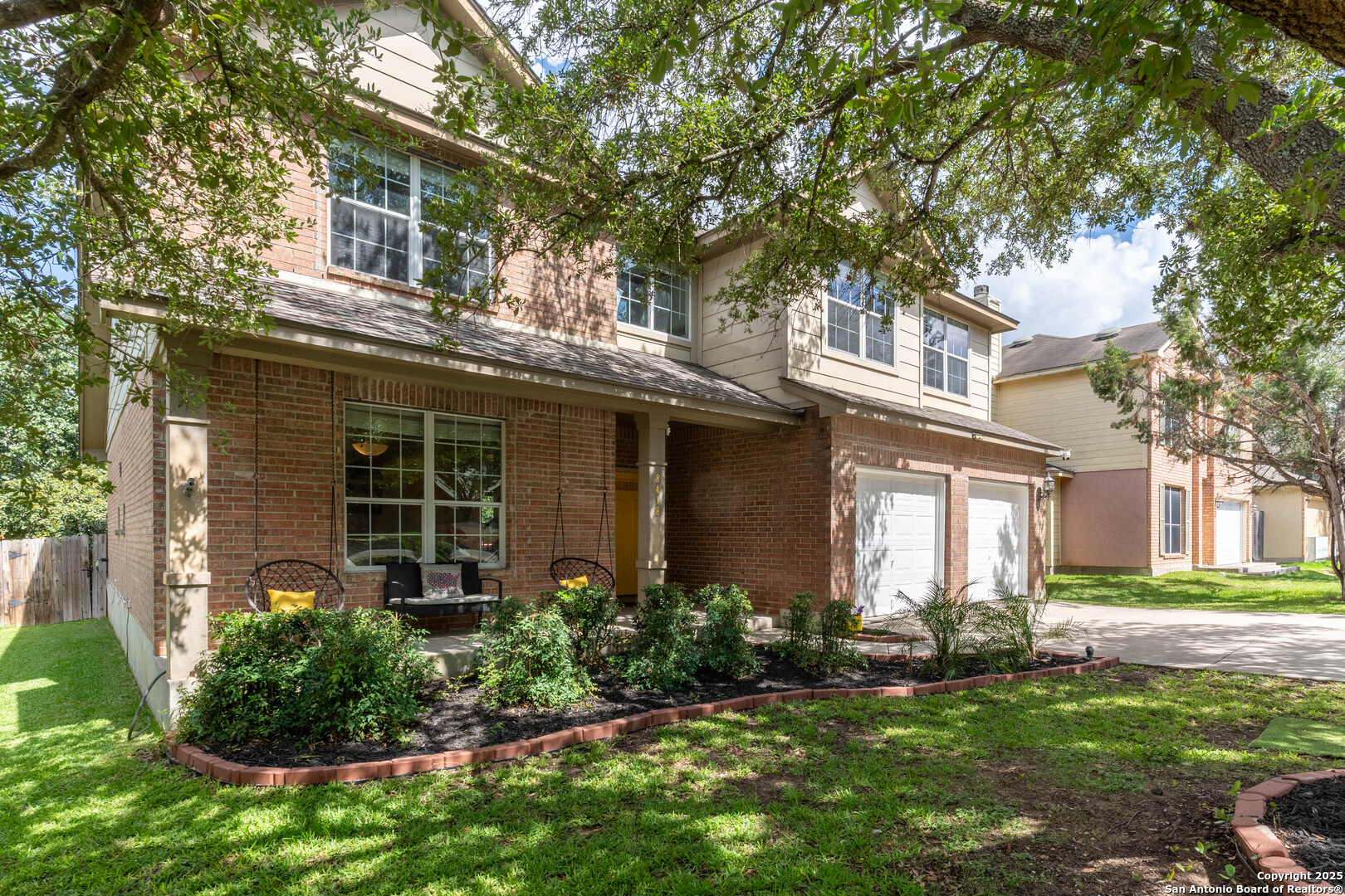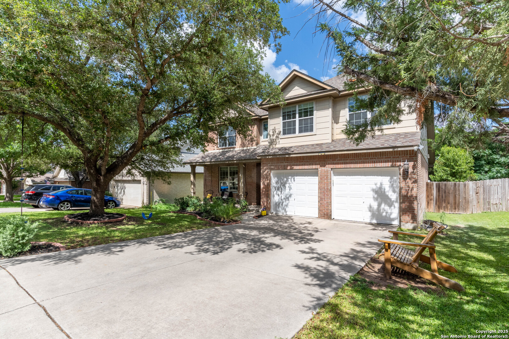 ON GREENBELT!! Step inside this beautiful two-story home in the sought-after Heritage Hills neighborhood and be greeted by abundant natural light, soaring ceilings, and a freshly painted interior that enhances its bright, welcoming feel. The open floor plan offers multiple living spaces, including a formal dining room with elegant molding-accented walls and a cozy wood-burning fireplace with custom surround in the main living area. The chef's kitchen is a true highlight, featuring granite countertops, extensive cabinetry, a designer tile backsplash, pendant lighting, and a spacious breakfast bar-perfect for both daily living and entertaining. With four bedrooms, including a secondary bedroom on the main level, and 2.5 baths, this home provides flexible living options. The owner's suite upstairs features vaulted ceilings, a large walk-in closet, a garden tub for soaking, and a separate shower. An oversized deck with a covered pergola offers the ideal space for outdoor gatherings surrounded by mature trees. Beyond the fence is an expansive greenbelt with gated access for exploration. Located near I-35, Randolph AFB, Fort Sam, and top shopping, dining, and parks. See this one TODAY!!