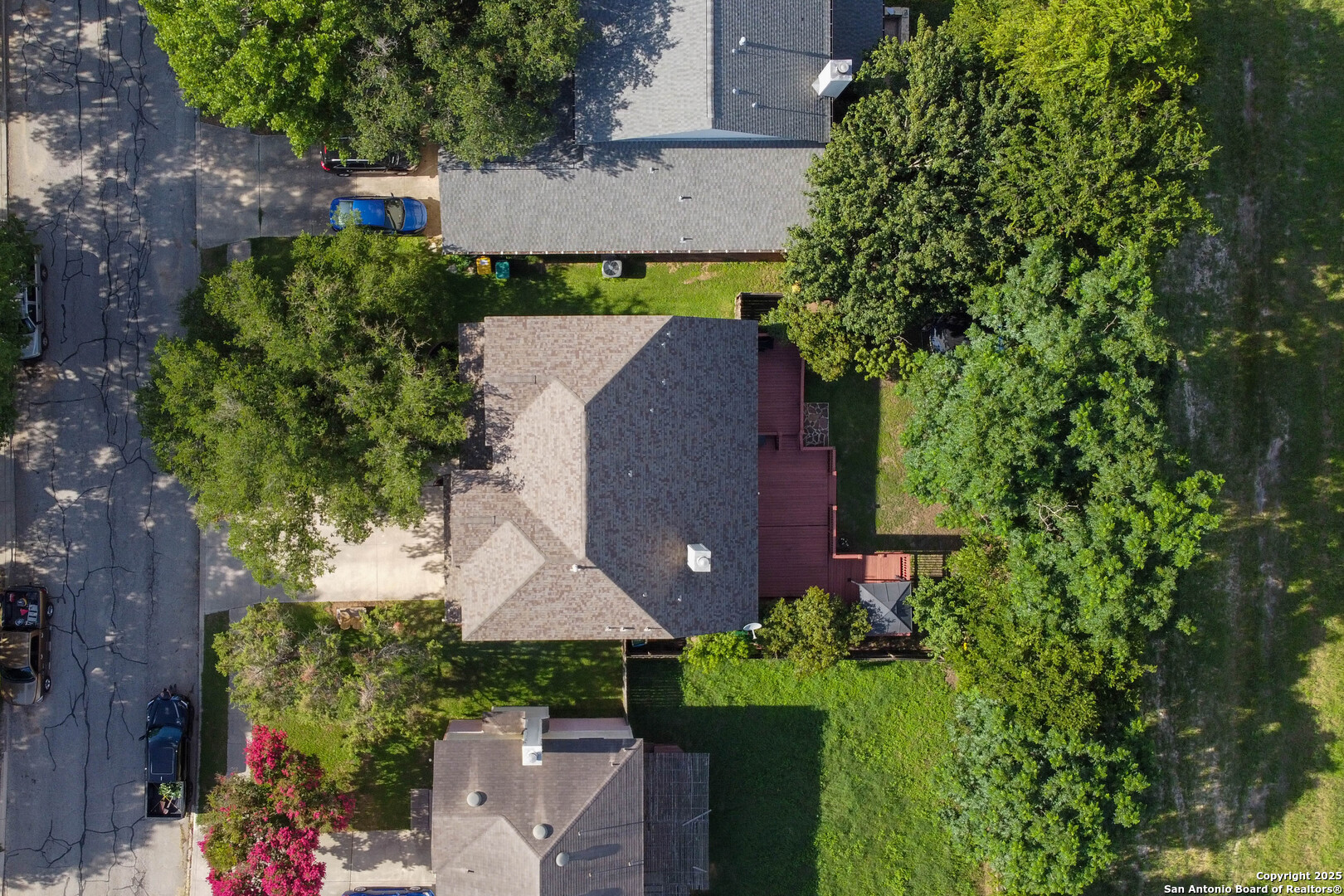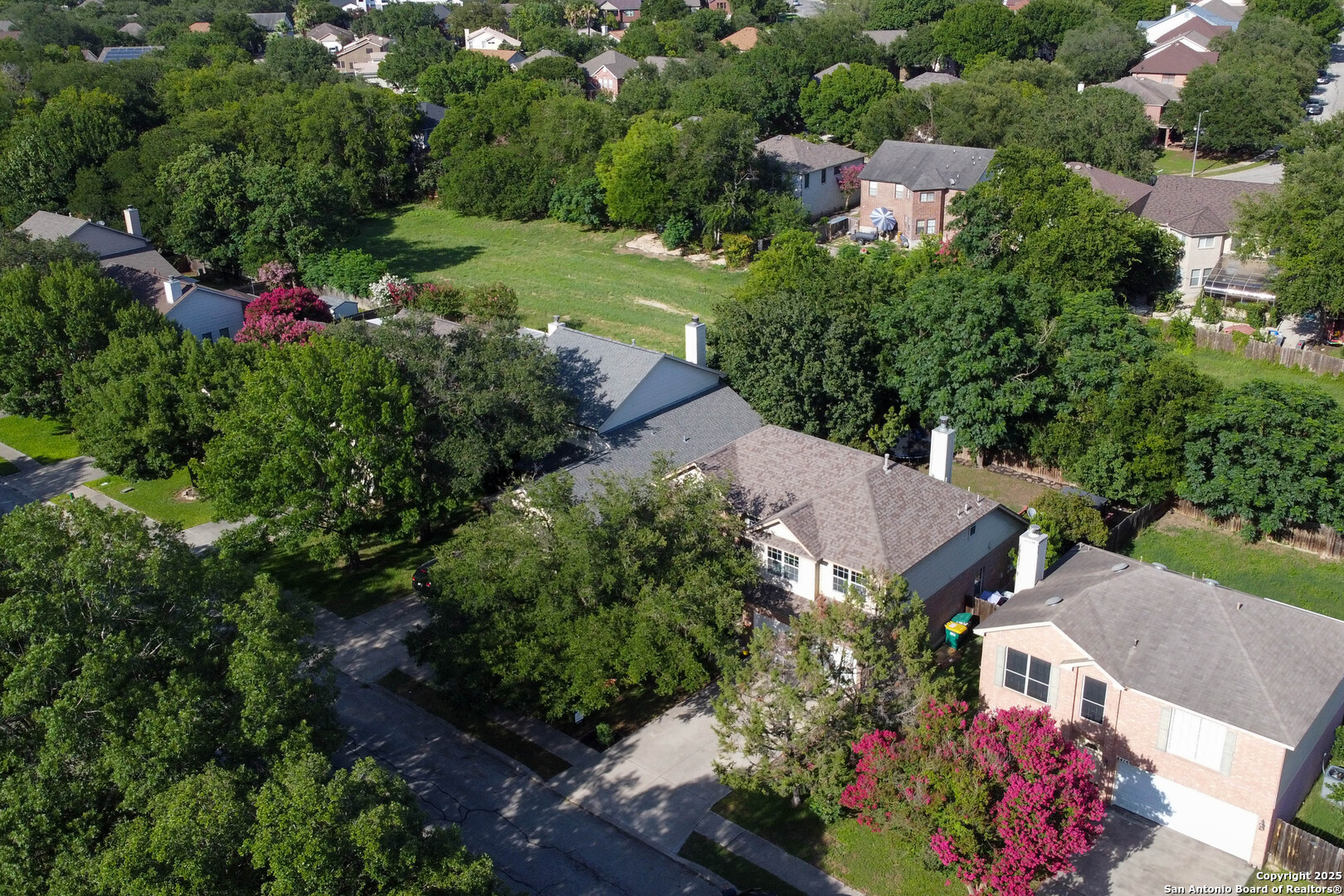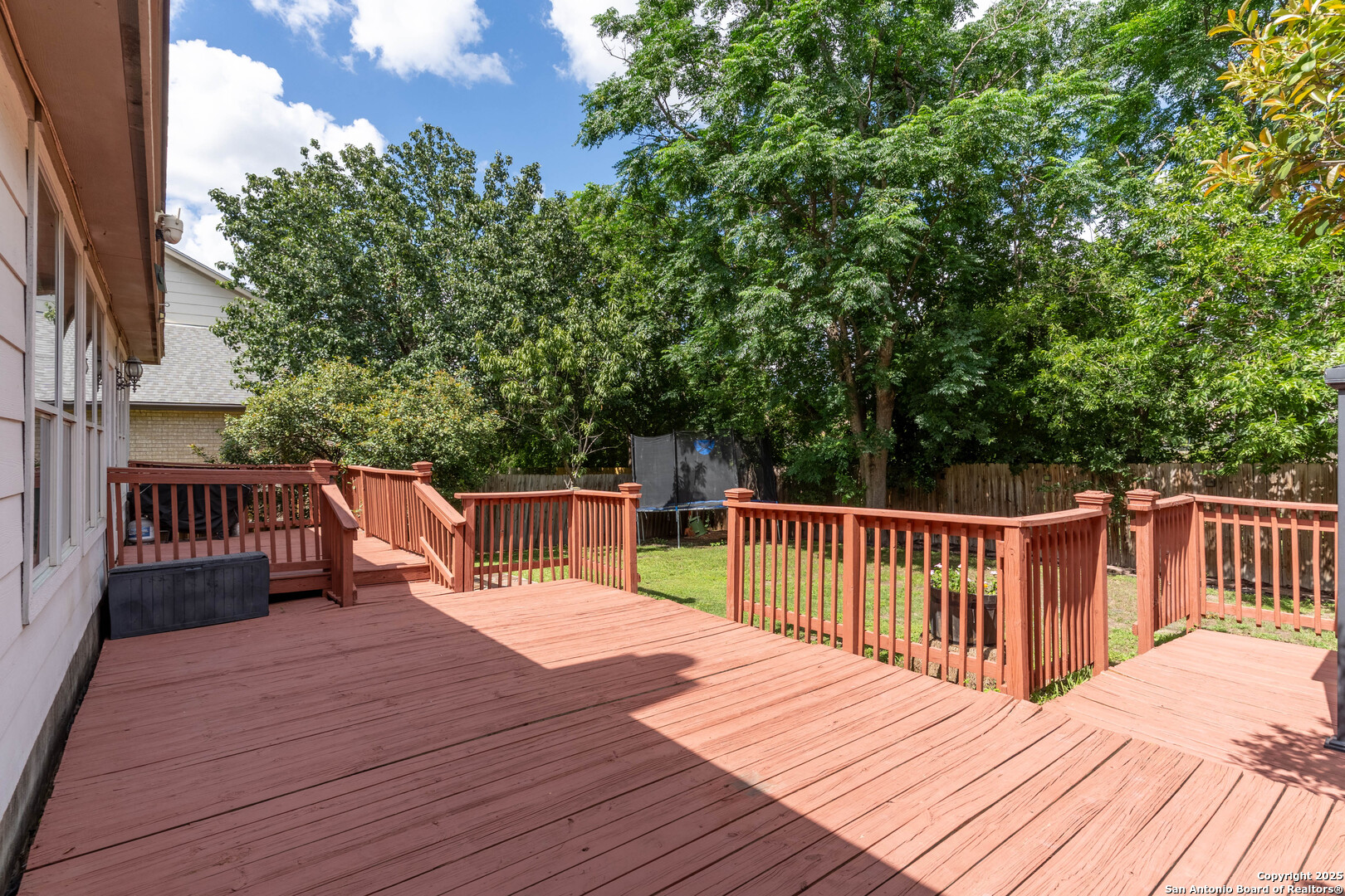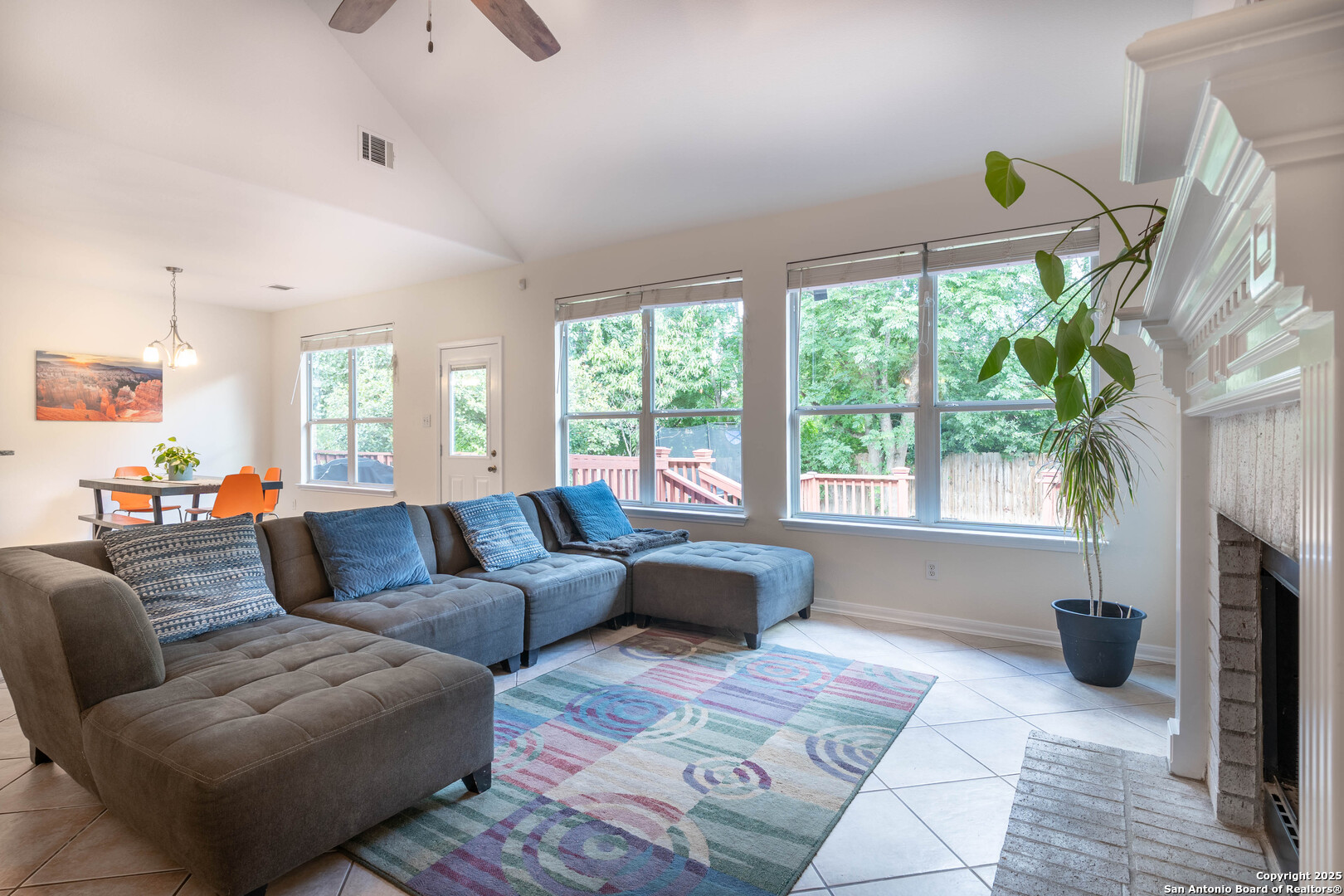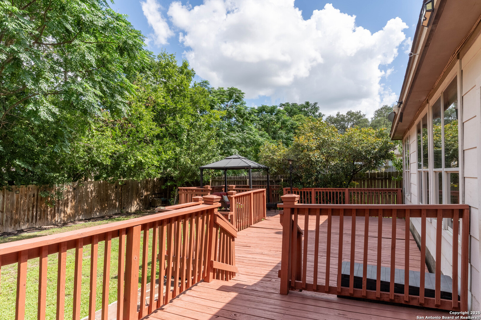 ON GREENBELT!! Step inside this beautiful two-story home in the sought-after Heritage Hills neighborhood and be greeted by abundant natural light, soaring ceilings, and a freshly painted interior that enhances its bright, welcoming feel. The open floor plan offers multiple living spaces, including a formal dining room with elegant molding-accented walls and a cozy wood-burning fireplace with custom surround in the main living area. The chef's kitchen is a true highlight, featuring granite countertops, extensive cabinetry, a designer tile backsplash, pendant lighting, and a spacious breakfast bar-perfect for both daily living and entertaining. With four bedrooms, including a secondary bedroom on the main level, and 2.5 baths, this home provides flexible living options. The owner's suite upstairs features vaulted ceilings, a large walk-in closet, a garden tub for soaking, and a separate shower. An oversized deck with a covered pergola offers the ideal space for outdoor gatherings surrounded by mature trees. Beyond the fence is an expansive greenbelt with gated access for exploration. Located near I-35, Randolph AFB, Fort Sam, and top shopping, dining, and parks. See this one TODAY!!