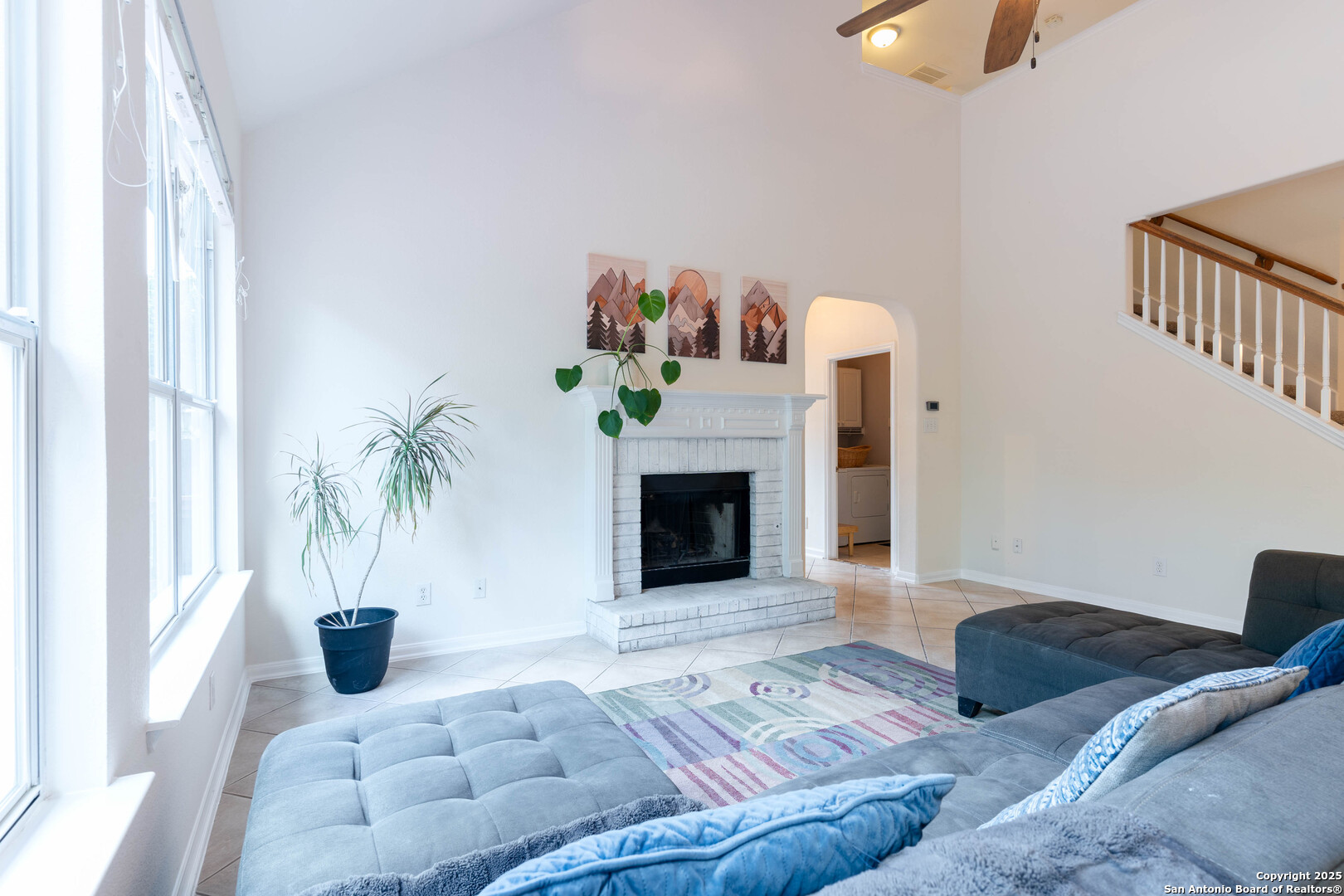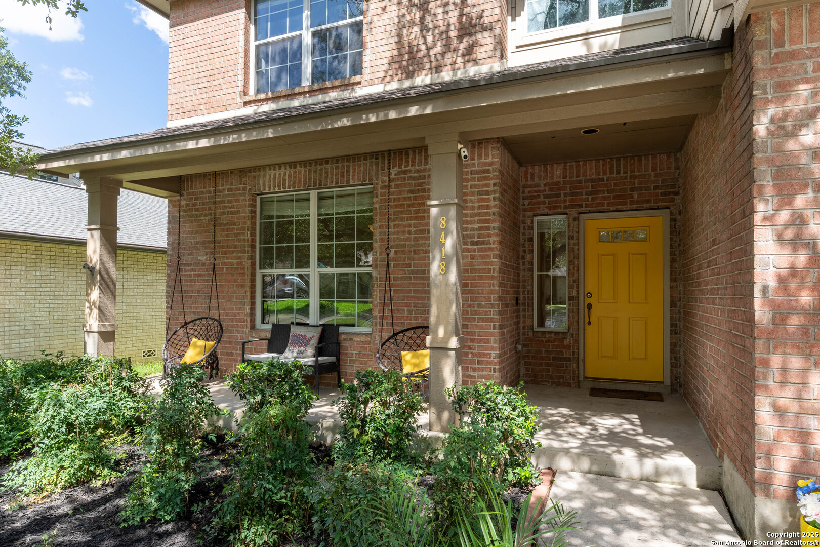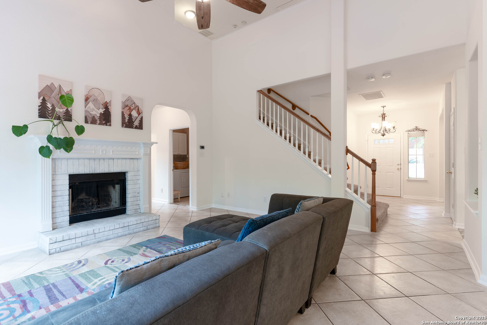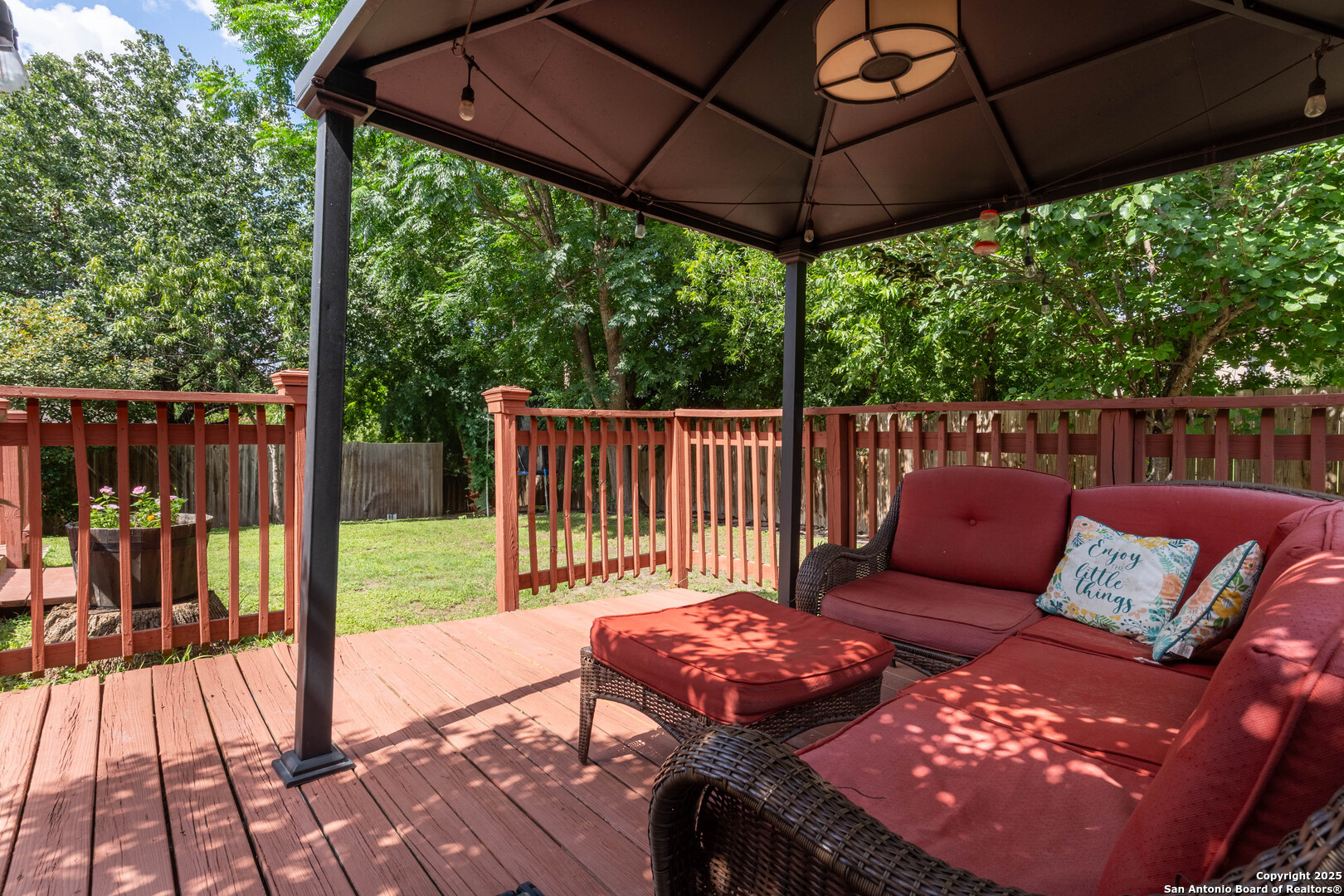 ON GREENBELT!! Step inside this beautiful two-story home in the sought-after Heritage Hills neighborhood and be greeted by abundant natural light, soaring ceilings, and a freshly painted interior that enhances its bright, welcoming feel. The open floor plan offers multiple living spaces, including a formal dining room with elegant molding-accented walls and a cozy wood-burning fireplace with custom surround in the main living area. The chef's kitchen is a true highlight, featuring granite countertops, extensive cabinetry, a designer tile backsplash, pendant lighting, and a spacious breakfast bar-perfect for both daily living and entertaining. With four bedrooms, including a secondary bedroom on the main level, and 2.5 baths, this home provides flexible living options. The owner's suite upstairs features vaulted ceilings, a large walk-in closet, a garden tub for soaking, and a separate shower. An oversized deck with a covered pergola offers the ideal space for outdoor gatherings surrounded by mature trees. Beyond the fence is an expansive greenbelt with gated access for exploration. Located near I-35, Randolph AFB, Fort Sam, and top shopping, dining, and parks. See this one TODAY!!