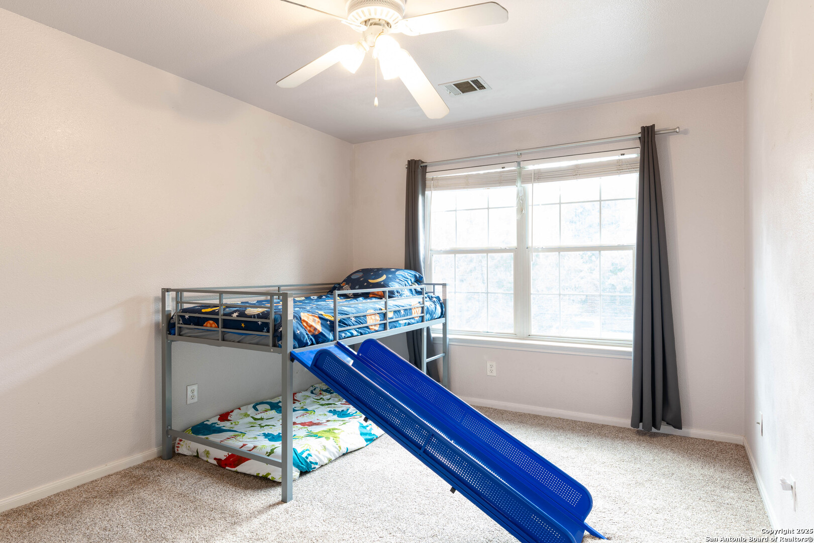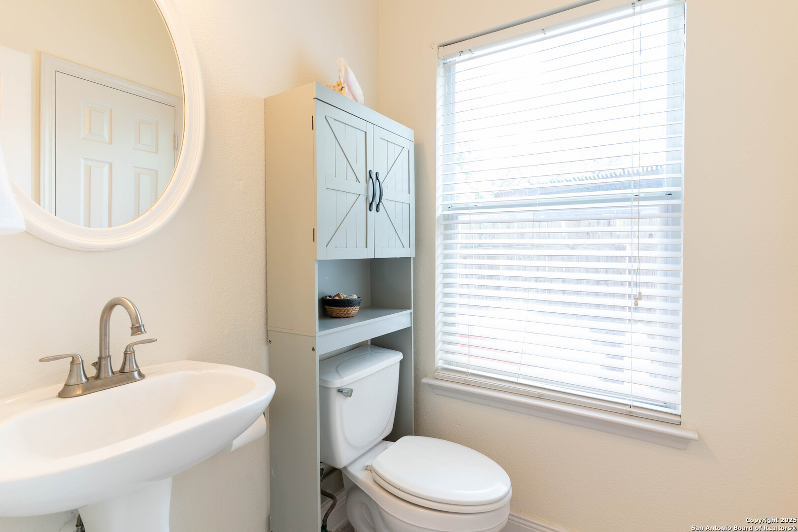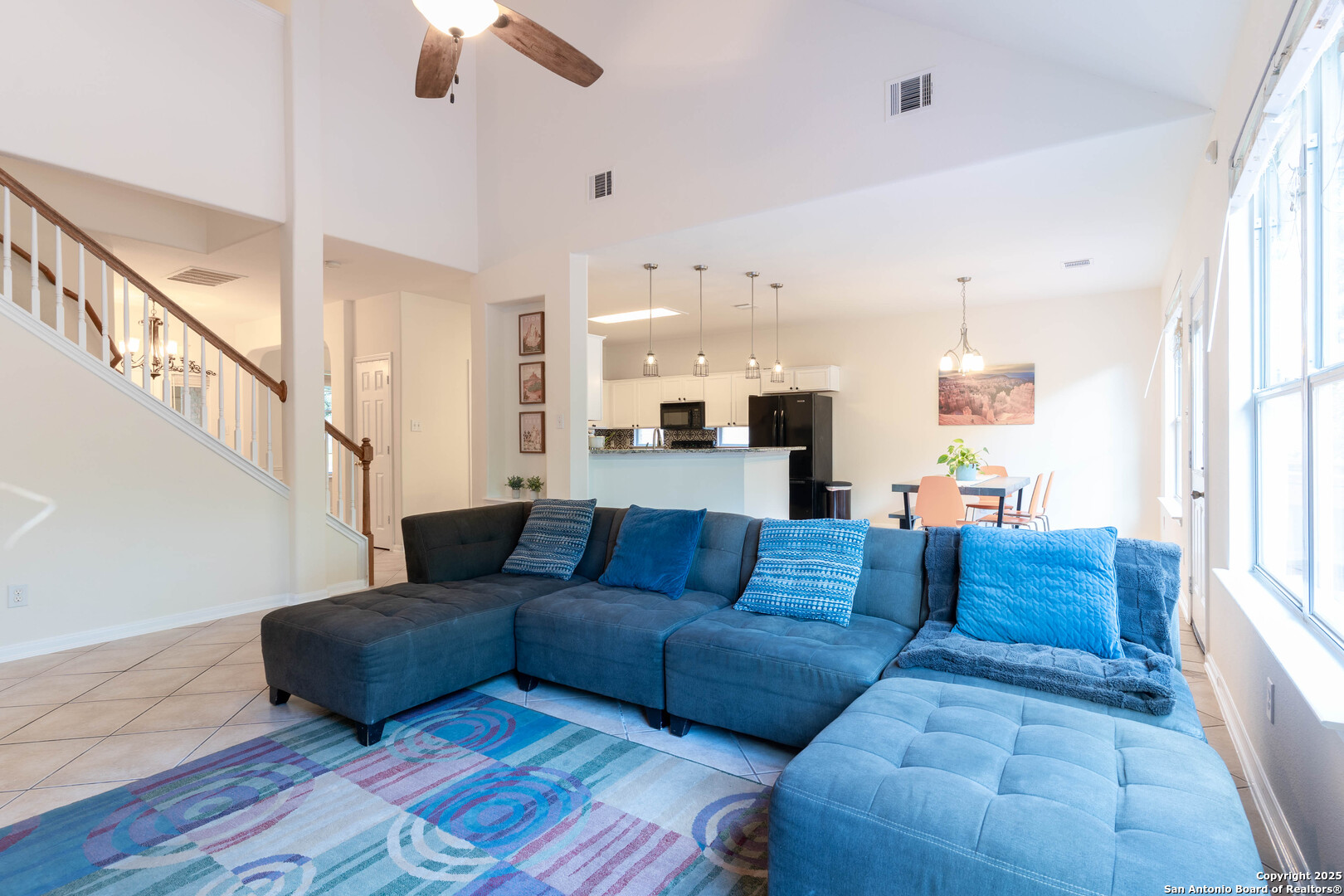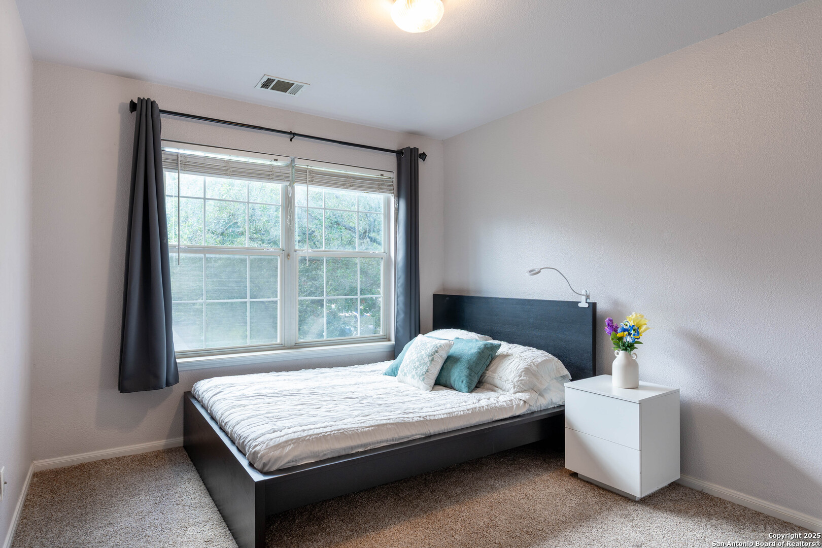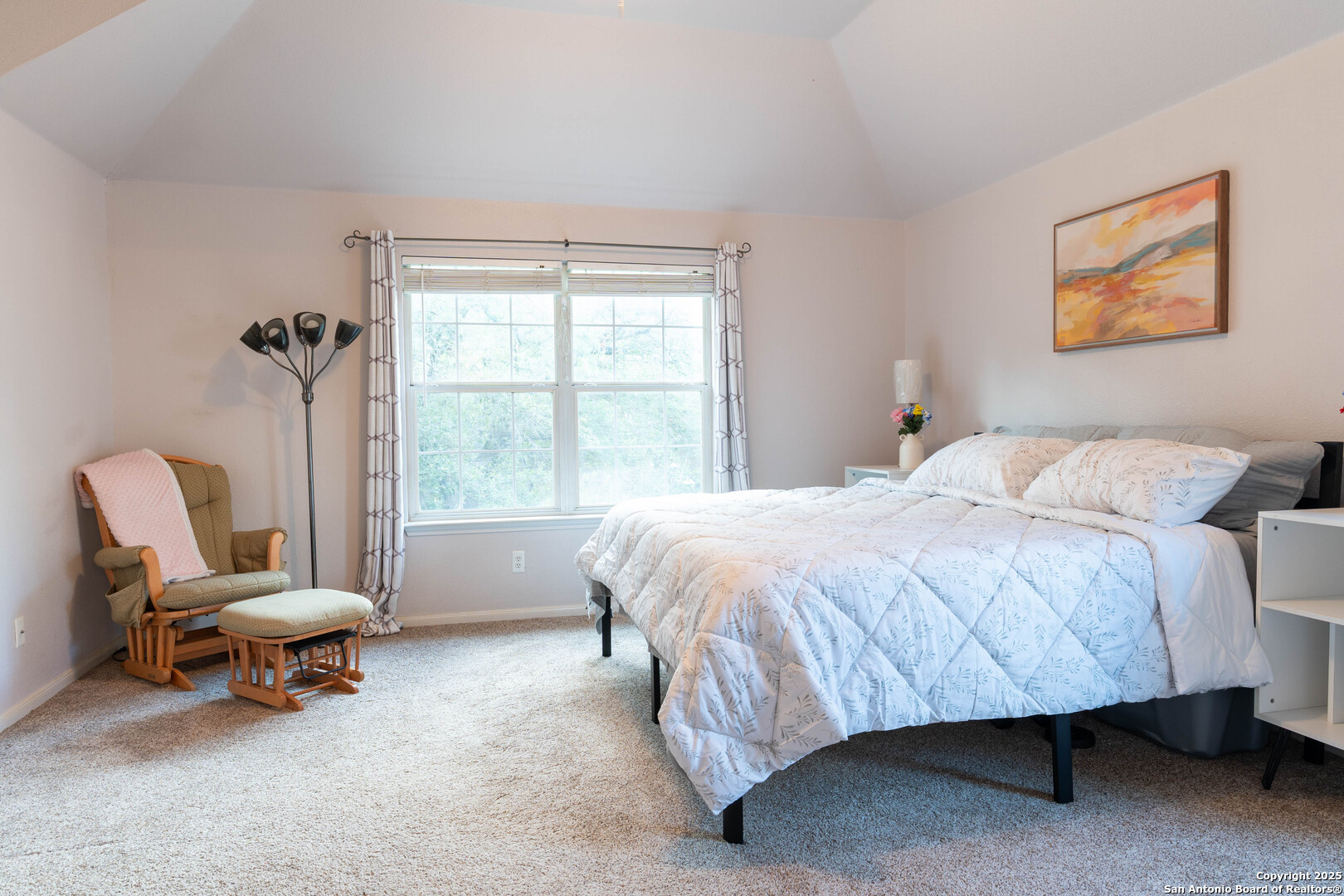 ON GREENBELT!! Step inside this beautiful two-story home in the sought-after Heritage Hills neighborhood and be greeted by abundant natural light, soaring ceilings, and a freshly painted interior that enhances its bright, welcoming feel. The open floor plan offers multiple living spaces, including a formal dining room with elegant molding-accented walls and a cozy wood-burning fireplace with custom surround in the main living area. The chef's kitchen is a true highlight, featuring granite countertops, extensive cabinetry, a designer tile backsplash, pendant lighting, and a spacious breakfast bar-perfect for both daily living and entertaining. With four bedrooms, including a secondary bedroom on the main level, and 2.5 baths, this home provides flexible living options. The owner's suite upstairs features vaulted ceilings, a large walk-in closet, a garden tub for soaking, and a separate shower. An oversized deck with a covered pergola offers the ideal space for outdoor gatherings surrounded by mature trees. Beyond the fence is an expansive greenbelt with gated access for exploration. Located near I-35, Randolph AFB, Fort Sam, and top shopping, dining, and parks. See this one TODAY!!