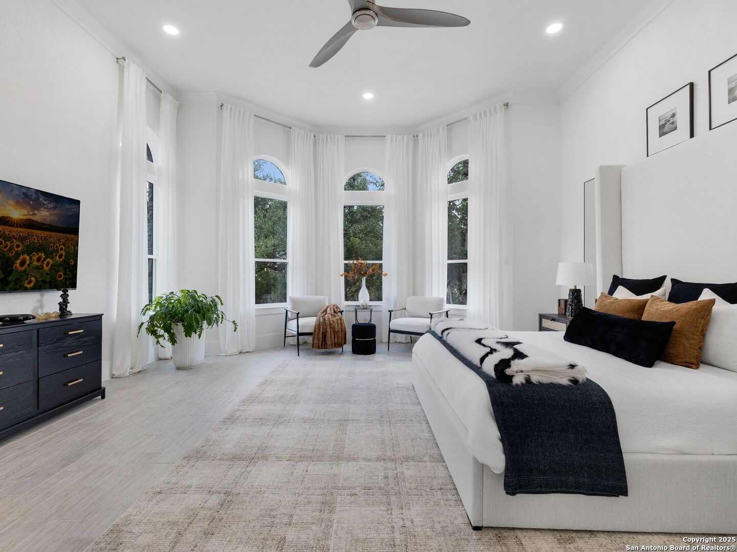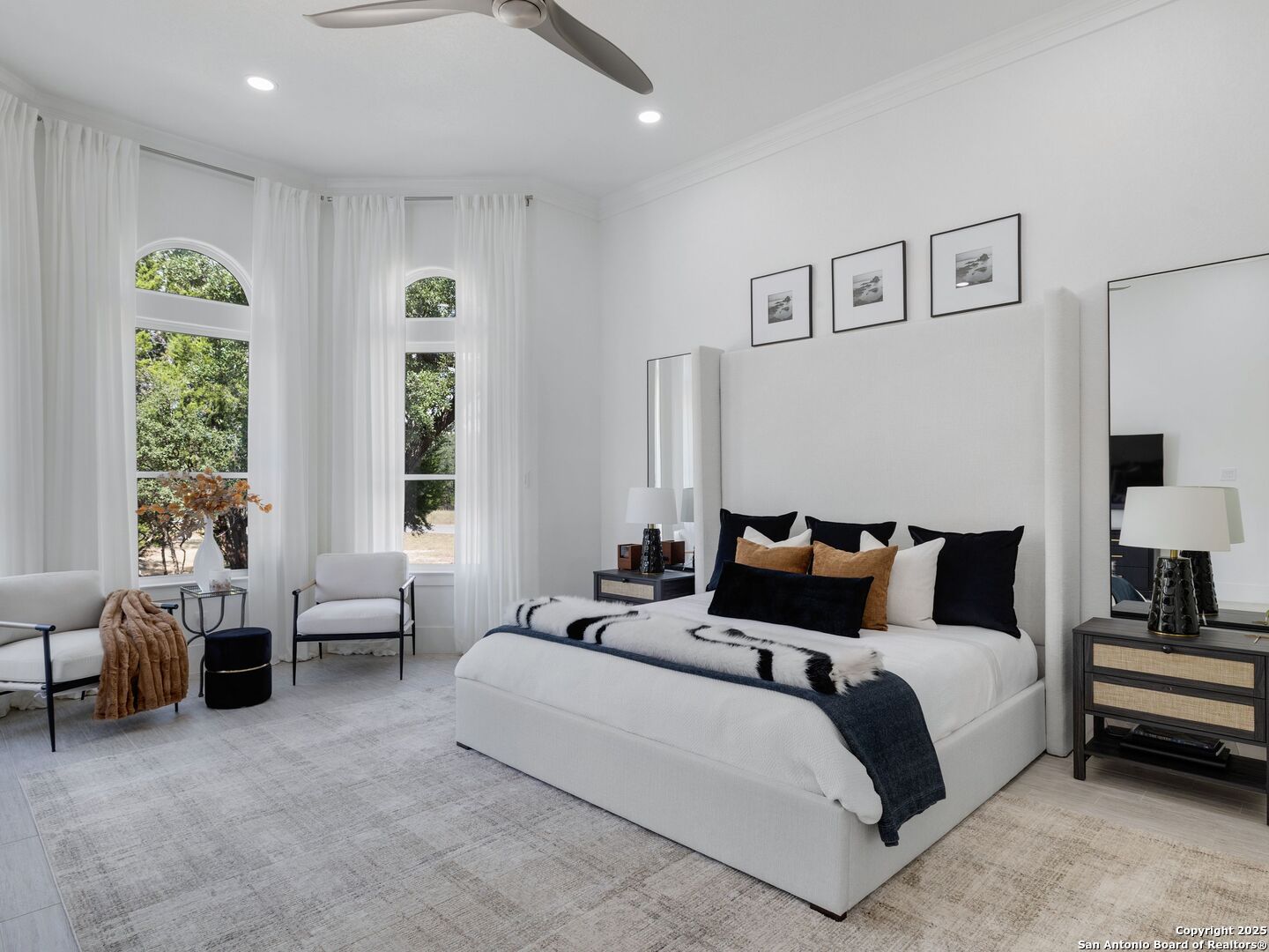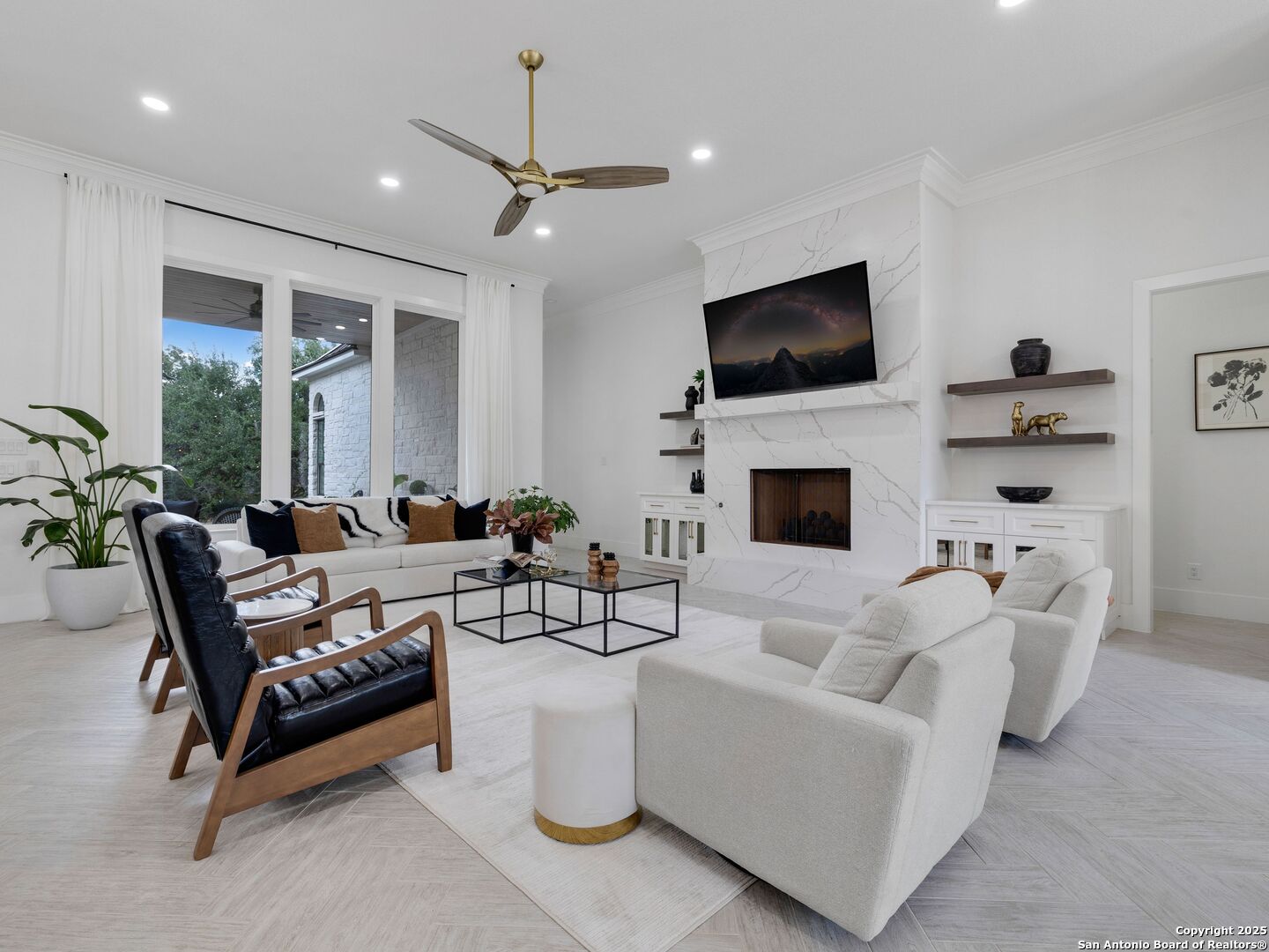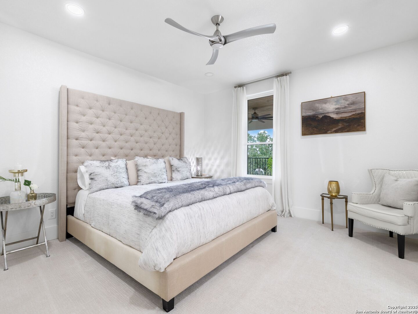Discover a home where craftsmanship, luxury, and thoughtful design come together in the prestigious Belle Oaks Ranch community. Sitting on over an acre of prime corner-lot land, this custom-built residence stands apart-not just in size, but in the details that make it truly exceptional. With approximately 4,022 square feet of living space, five spacious bedrooms, and four full and two half bathrooms, this one-and-a-half-story home blends elegance with everyday comfort. Step through the grand double-door entrance, and you're welcomed by soaring 12-foot ceilings, an open floor plan, and oversized windows that flood the space with natural light. Every inch of this home was designed to feel bright, airy, and effortlessly refined. At the center, the kitchen is a standout-outfitted with top-of-the-line Dacor appliances, sleek white marble countertops, and custom Michael Edward cabinetry. Whether you're an avid home chef or simply love a well-designed space, this kitchen delivers on both form and function. The primary suite is a retreat of its own, offering a luxurious escape with a soaking tub, an oversized walk-in shower framed by privacy glass, and a custom walk-in closet designed for both style and efficiency. Expansive windows frame views of the surrounding oak trees, enhancing the peaceful, private feel of the home. Upstairs, a game room with a private terrace overlooks the backyard, providing a perfect spot to unwind. Two additional bedrooms on this level offer flexibility for guests or family members. What truly sets this home apart is the exceptional attention to construction quality and materials. While many homes in Belle Oaks Ranch incorporate a minimal amount of stone, this residence was designed with a striking stone exterior, creating a timeless and durable facade. The foundation was another key focus, built with an emphasis on long-term stability and structural integrity beyond standard practices. Energy efficiency was also a top priority, with over a foot of spray foam insulation installed throughout the home and attic to enhance comfort and reduce energy costs. Built with reinforced framing, the home benefits from enhanced structural integrity, adding to its longevity and overall value. These thoughtful upgrades not only contribute to the home's longevity but also set it apart as a truly superior build. Every decision in this home, from the materials used to the design choices, was made with purpose. The result is a home that doesn't just look luxurious-it feels solid, enduring, and built to last. Here, you'll find more than just a place to live-you'll experience a level of quality and attention to detail that's rare to come by.