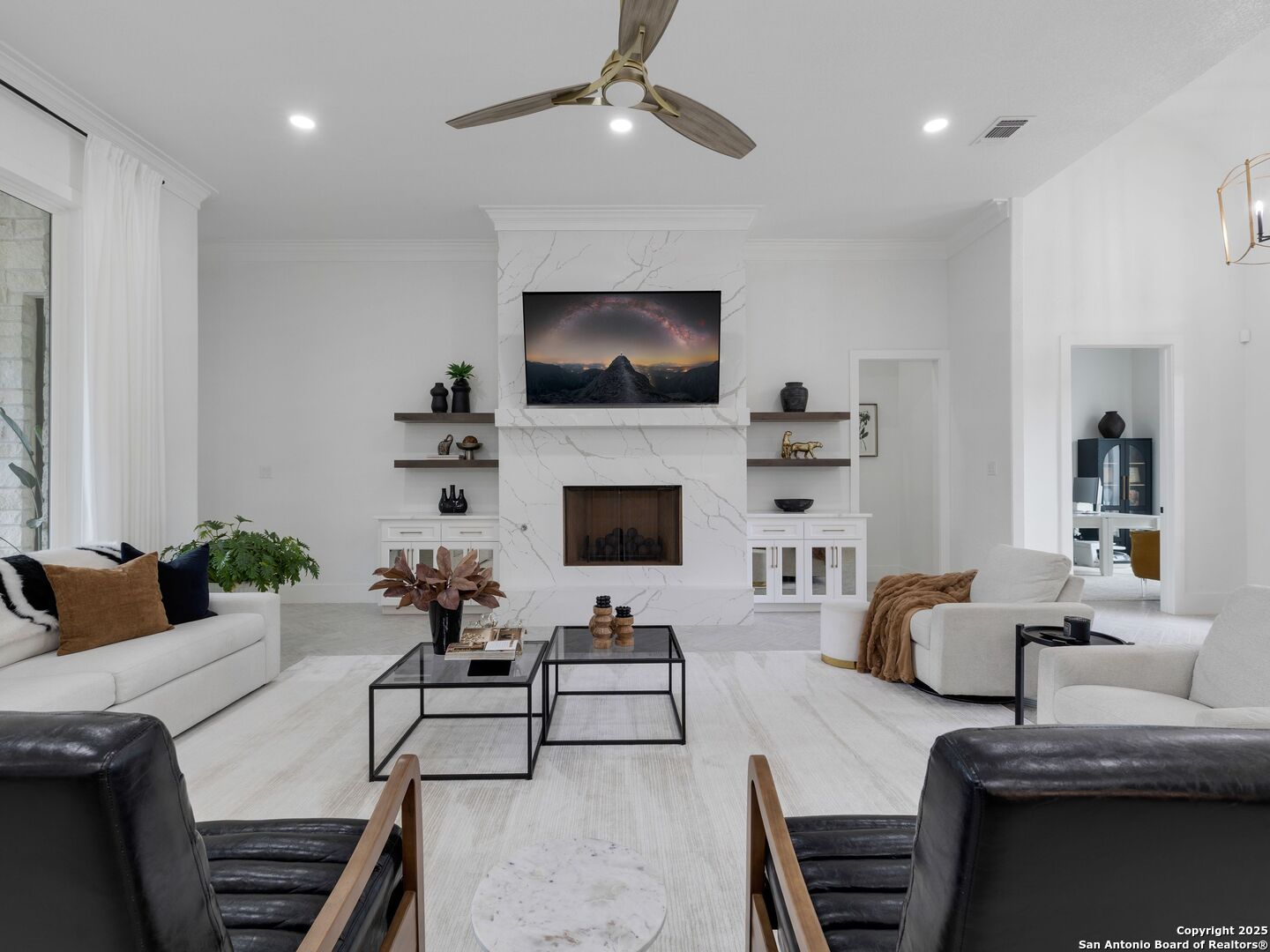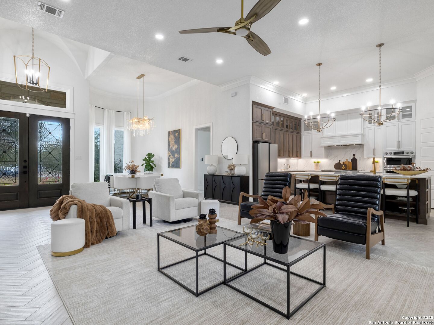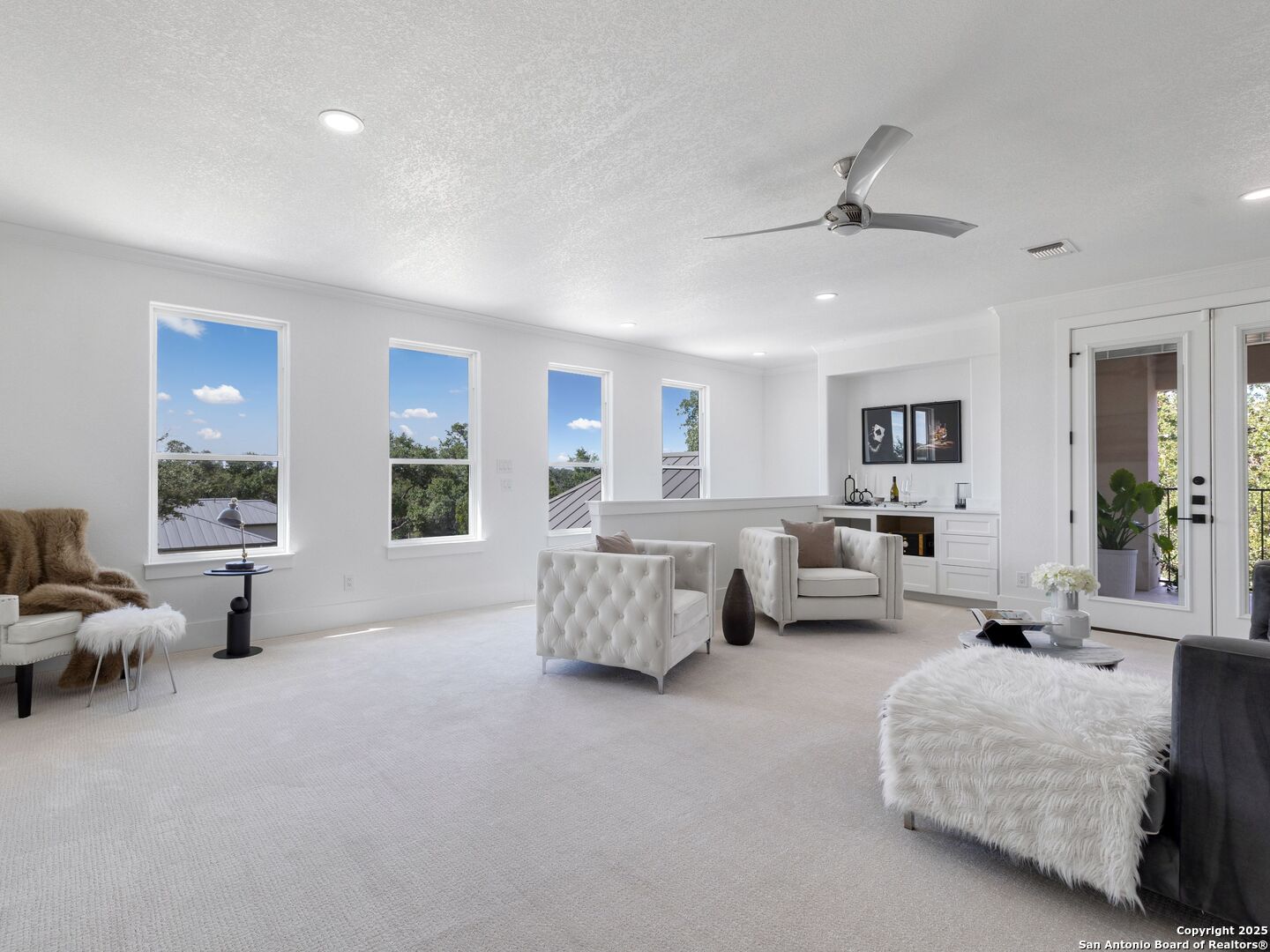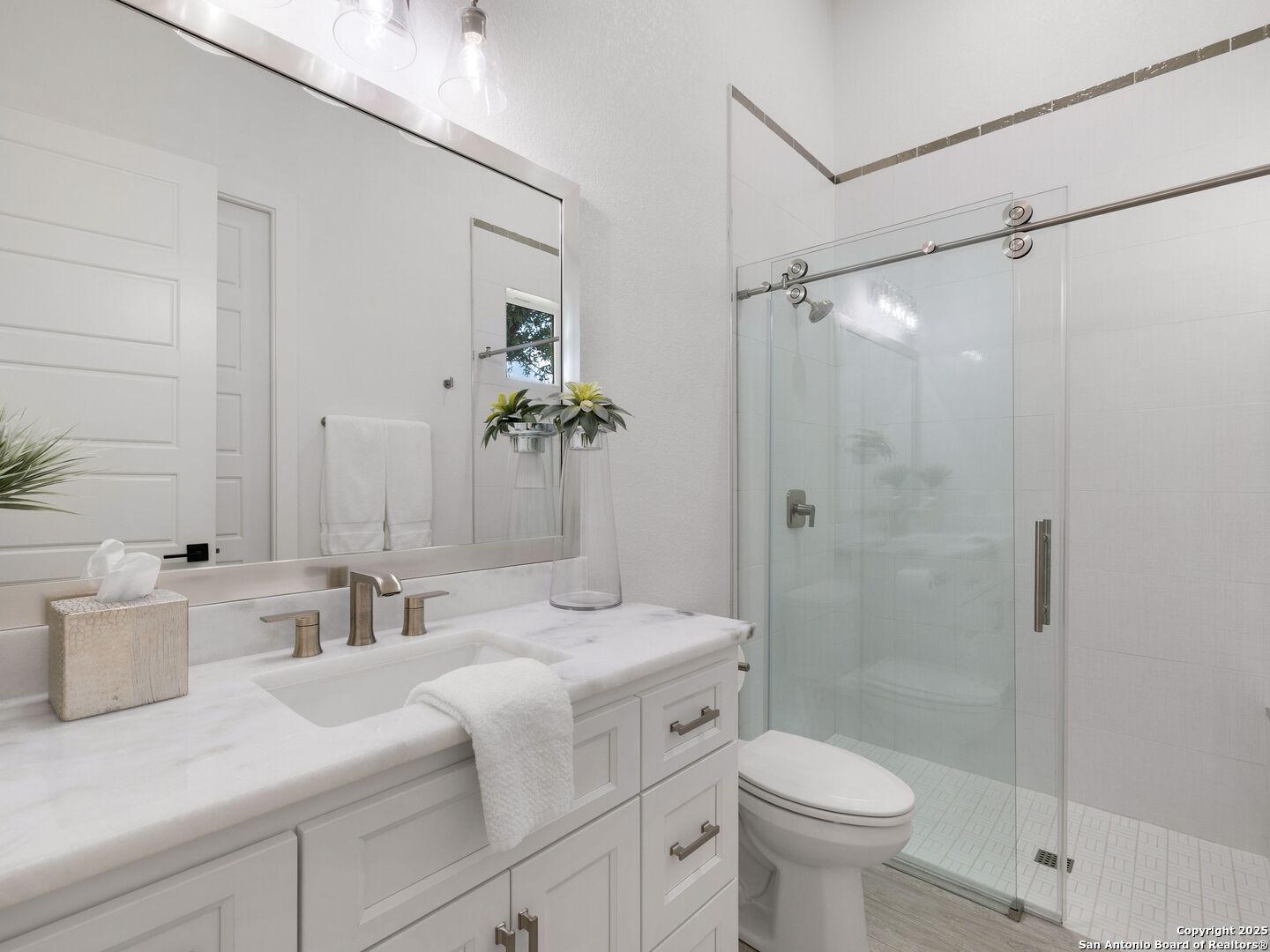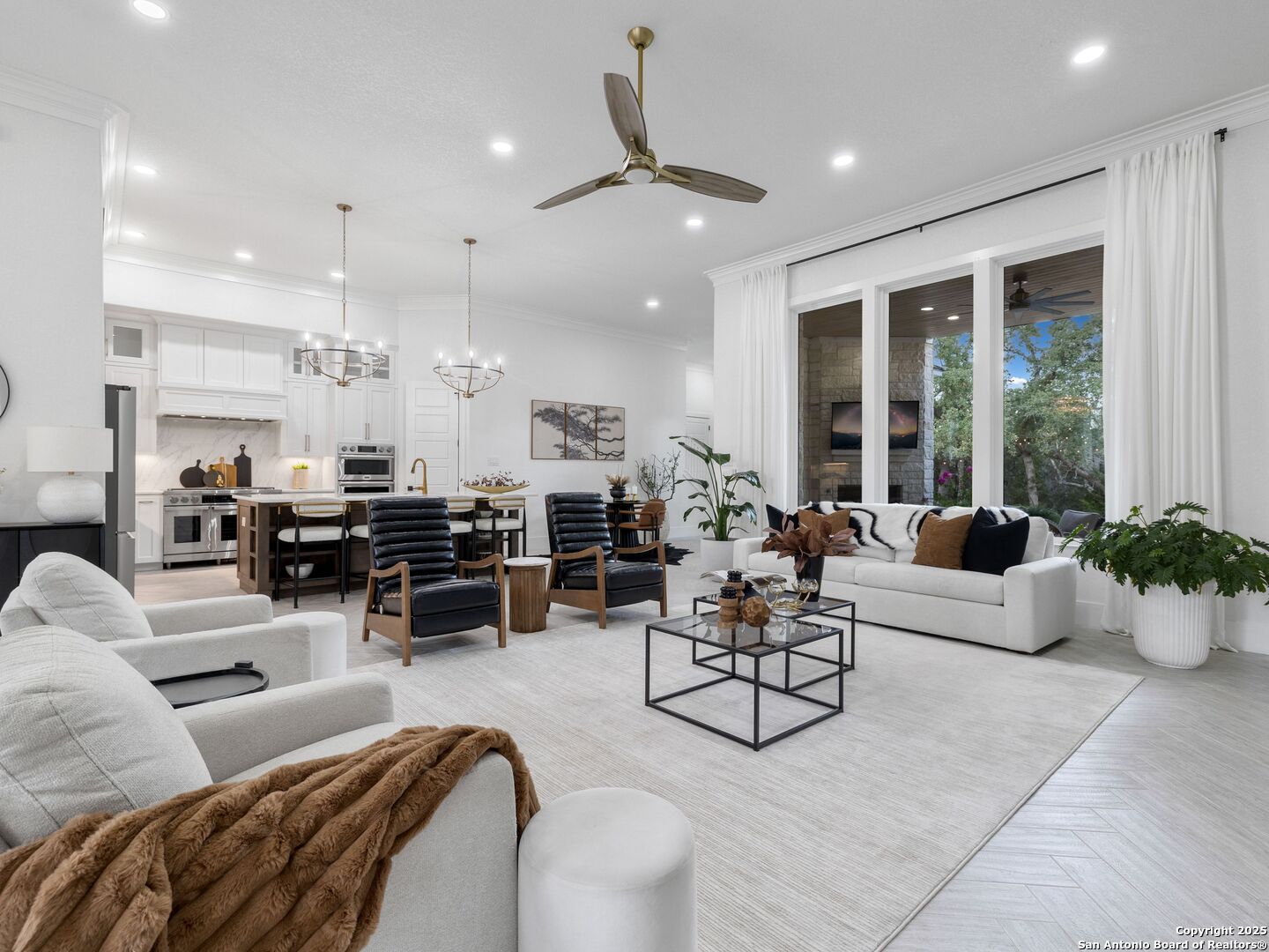 Discover a home where craftsmanship, luxury, and thoughtful design come together in the prestigious Belle Oaks Ranch community. Sitting on over an acre of prime corner-lot land, this custom-built residence stands apart-not just in size, but in the details that make it truly exceptional. With approximately 4,022 square feet of living space, five spacious bedrooms, and four full and two half bathrooms, this one-and-a-half-story home blends elegance with everyday comfort. Step through the grand double-door entrance, and you're welcomed by soaring 12-foot ceilings, an open floor plan, and oversized windows that flood the space with natural light. Every inch of this home was designed to feel bright, airy, and effortlessly refined. At the center, the kitchen is a standout-outfitted with top-of-the-line Dacor appliances, sleek white marble countertops, and custom Michael Edward cabinetry. Whether you're an avid home chef or simply love a well-designed space, this kitchen delivers on both form and function. The primary suite is a retreat of its own, offering a luxurious escape with a soaking tub, an oversized walk-in shower framed by privacy glass, and a custom walk-in closet designed for both style and efficiency. Expansive windows frame views of the surrounding oak trees, enhancing the peaceful, private feel of the home. Upstairs, a game room with a private terrace overlooks the backyard, providing a perfect spot to unwind. Two additional bedrooms on this level offer flexibility for guests or family members. What truly sets this home apart is the exceptional attention to construction quality and materials. While many homes in Belle Oaks Ranch incorporate a minimal amount of stone, this residence was designed with a striking stone exterior, creating a timeless and durable facade. The foundation was another key focus, built with an emphasis on long-term stability and structural integrity beyond standard practices. Energy efficiency was also a top priority, with over a foot of spray foam insulation installed throughout the home and attic to enhance comfort and reduce energy costs. Built with reinforced framing, the home benefits from enhanced structural integrity, adding to its longevity and overall value. These thoughtful upgrades not only contribute to the home's longevity but also set it apart as a truly superior build. Every decision in this home, from the materials used to the design choices, was made with purpose. The result is a home that doesn't just look luxurious-it feels solid, enduring, and built to last. Here, you'll find more than just a place to live-you'll experience a level of quality and attention to detail that's rare to come by.