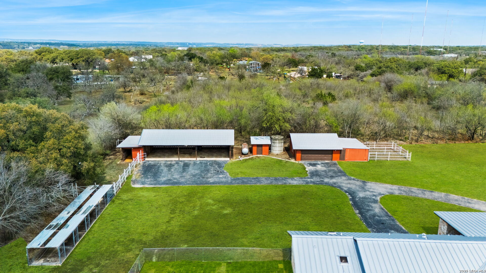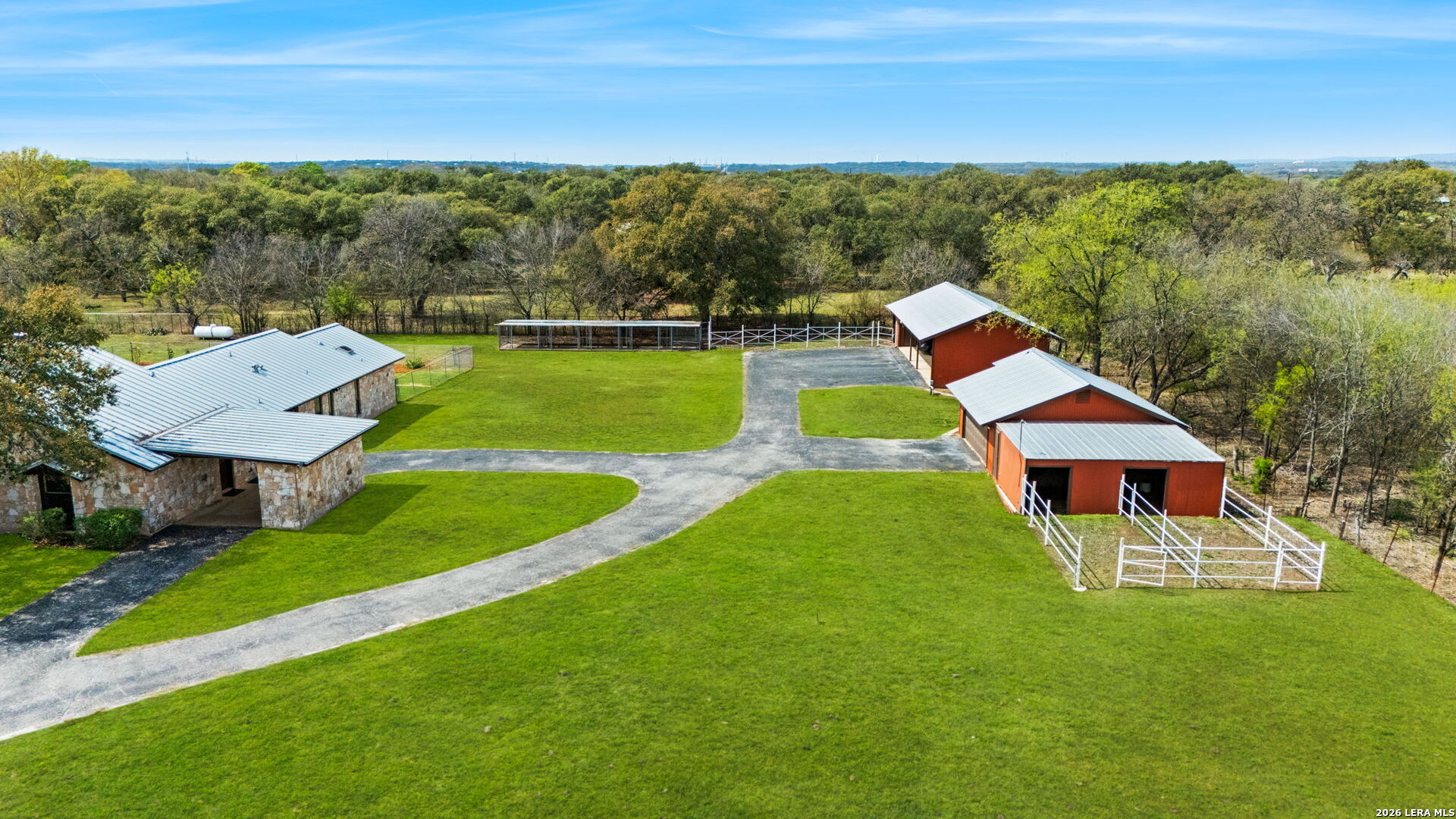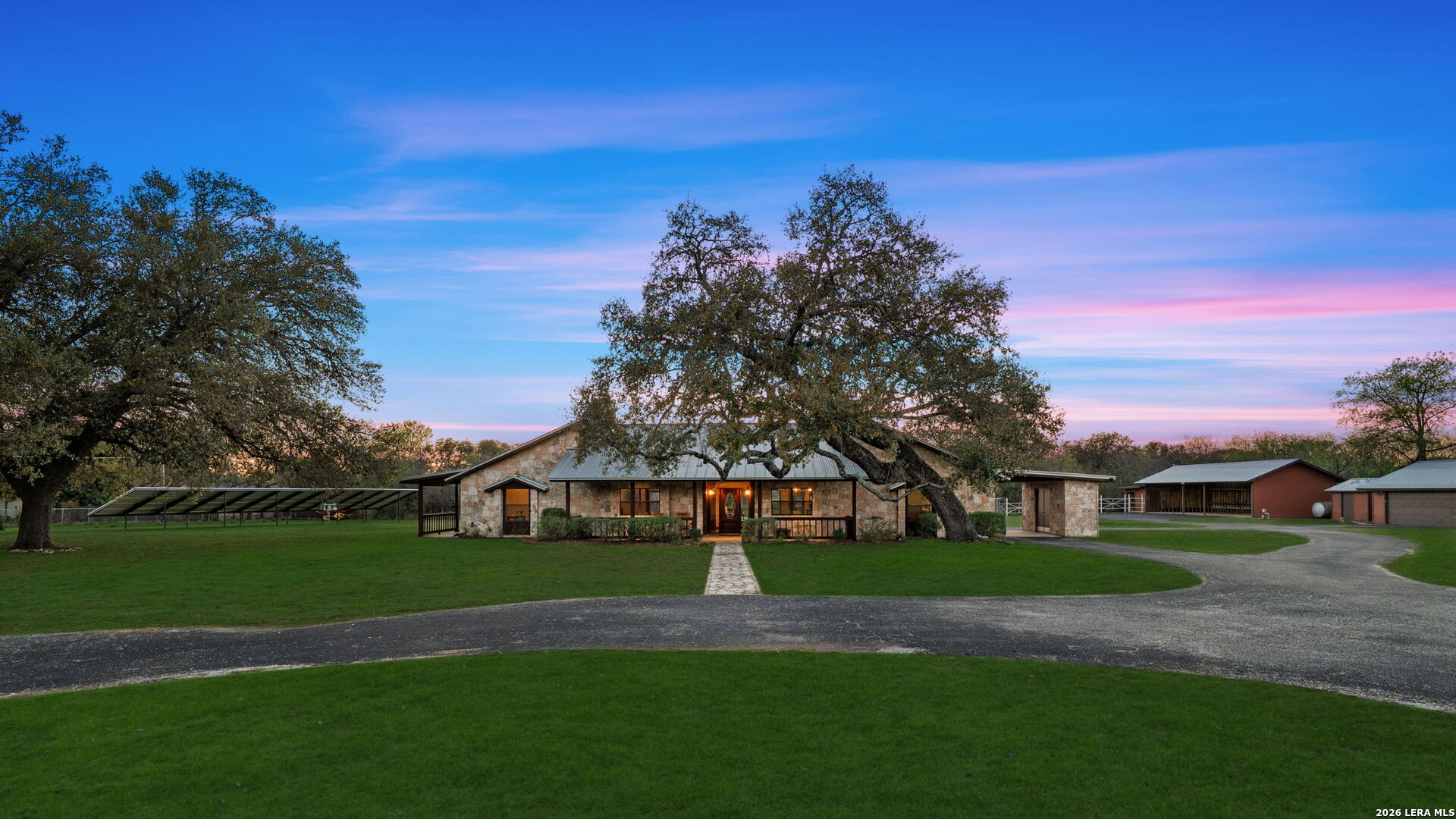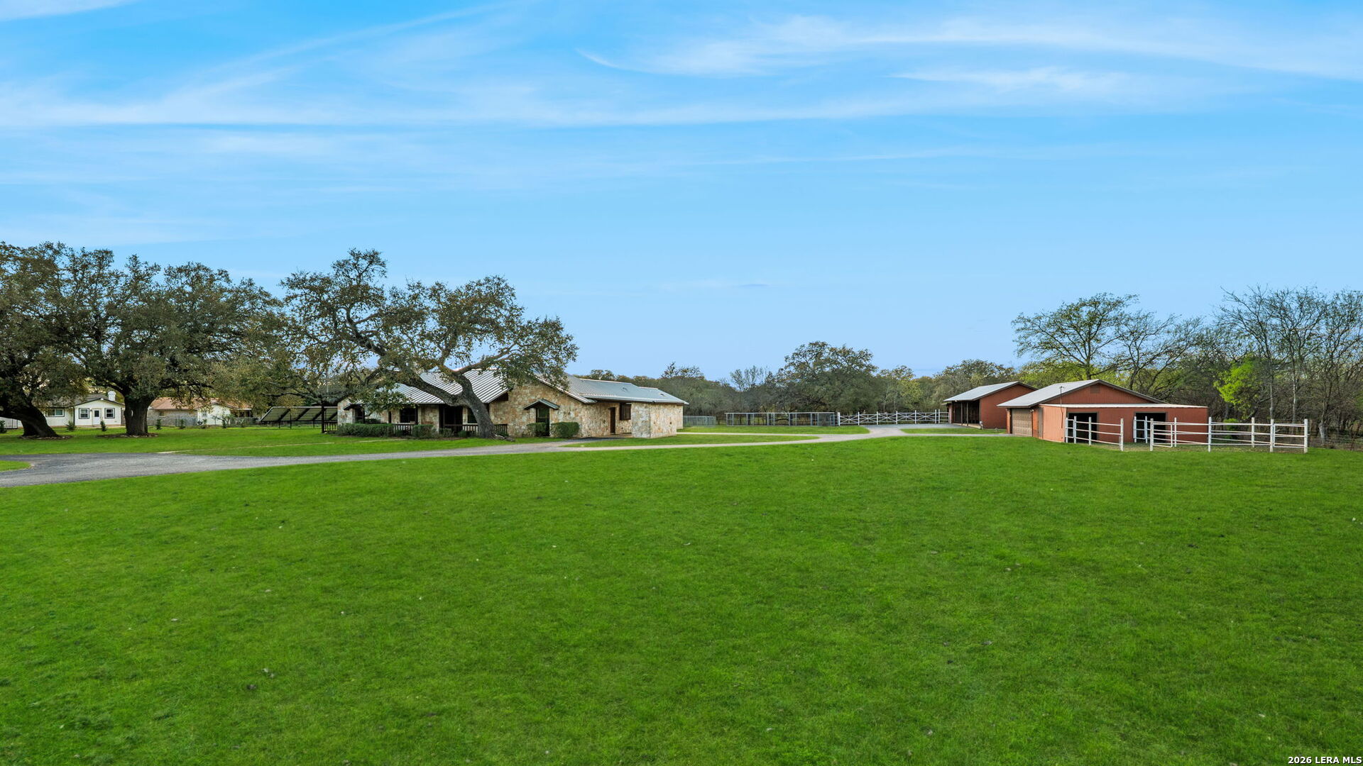 8463 Barron Drive, is the ultimate high-utility estate, perfectly blending self-sufficient "off-grid" capabilities with the luxury of space. Located in the Alamo Farmsteads this five-acre sanctuary inside loop 1604 just ten minutes from the Medical Center is designed for the buyer who values both their independence and their hobbies. Through the private gated entry discover a rare five-acre level lot fully equipped to handle anything Texas weather throws its way. It features a high-capacity 25KW solar power system, a propane powered whole-house backup generator, and a private water well. Enjoy minimal utility dependence in the heart of San Antonio. The property offers an incredible 7 covered parking spots including a 5-Car carport and a 2-Car garage perfect for housing a vintage car collection or a fleet of off-road toys. Embrace the "Farmsteads" lifestyle with a dedicated 2-stall horse barn and ample room for grazing. The five-acre spread provides the space required for livestock while maintaining a manageable footprint for the hobbyist rider. Direct proximity from the neighborhood to the Leon Creek Greenway offers access to miles of multi-use trails right outside your neighborhood. The main residence features a generous 4-bedroom, 3.5-bath layout spanning over 3,500 square feet. The home was custom built with high quality wood trim and cabinetry and was recently updated with new countertops and plumbing fixtures throughout, new light fixtures in the bathrooms, and new carpet in the bedrooms. Designed for hosting and comfort, the home includes a true cooks kitchen, massive in scale and perfectly positioned as the heart of the home. The kitchen features a center island, peninsula with bar seating, double ovens, butler's pantry with ice maker and an informal dining area all overlooking the pool deck. On either side of the kitchen are a formal dining from and two living areas. Both have vaulted, wood lined ceilings and floor to ceiling stone fireplaces. The split floor plan layout is masterfully zoned to allow a large or multi-generational family to live together without compromise. At the heart of the home, the common areas act as a natural buffer, providing total seclusion for the primary suite and a dedicated wing for everyone else. The massive primary retreat is designed for the head of household and features separate vanities, each in their own space with direct access to individual walk-in closets. The bedroom has enough square footage to serve as a true private escape from the day's activities. On the opposite side of the home, the secondary bedroom wing is perfectly organized for children or guests. It features two oversized bedrooms connected by a Jack-and-Jill bath, ensuring ease for a shared morning routine. A third large secondary bedroom is serviced by an additional full hallway bath which also features access to the pool deck, serving as a convenient changing area for swimmers. This estate was engineered for a seamless transition between a sophisticated interior and a resort-style backyard. Whether you are hosting a formal fundraiser or a relaxed weekend poolside, the home's layout encourages a natural guest flow that centers around the heart of the property. A dedicated wet bar serves as the ultimate staging area for cocktail hours and social gatherings, strategically positioned to service the living areas and the pool deck which has plenty of covered seating. When you enter the private gate you feel miles away, but 8463 Barron Drive offers unparalleled proximity to the city's primary economic engines. The home is minutes from the South Texas Medical Center, USAA HQ, UTSA Main Campus, and in easy reach of Lackland Air Force Base, Randolph Air Force Base, and Fort Sam Houston. There is no other property like this available in the San Antonio Market. Truly Unique. Unbelievably versatile. Built for the modern rugged individualist who needs space and convenience. Book a tour while you have the opportunity.