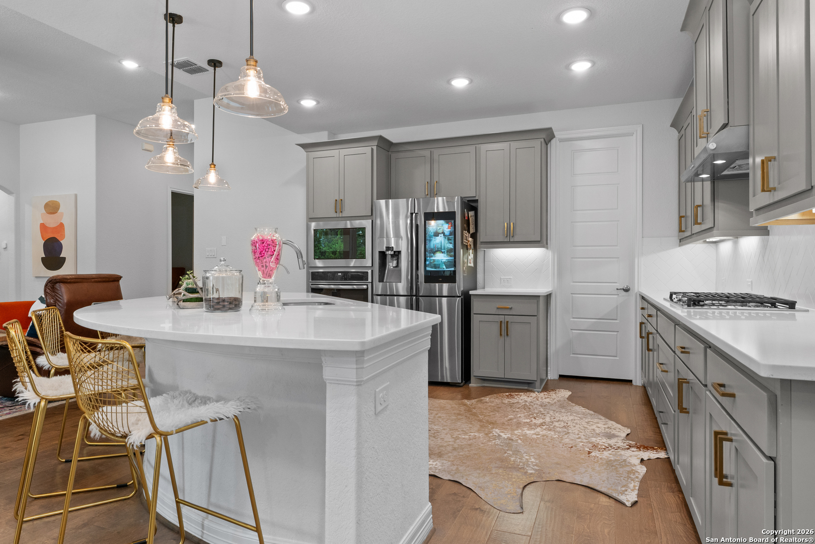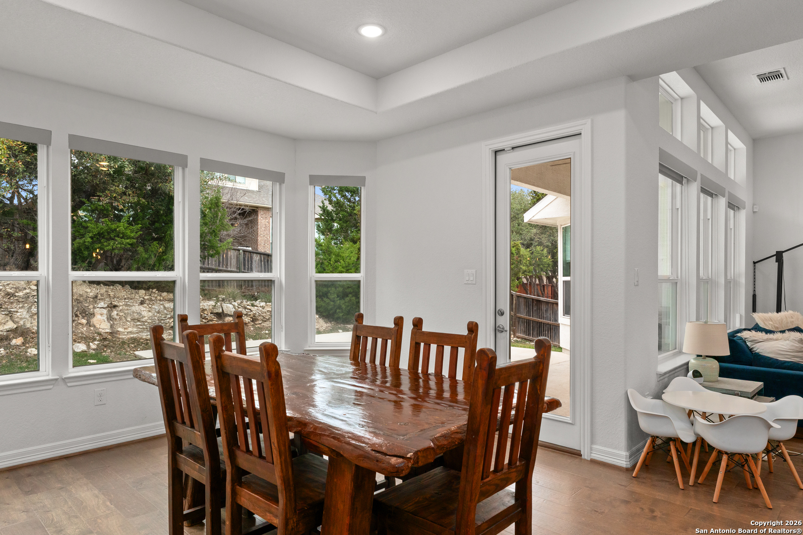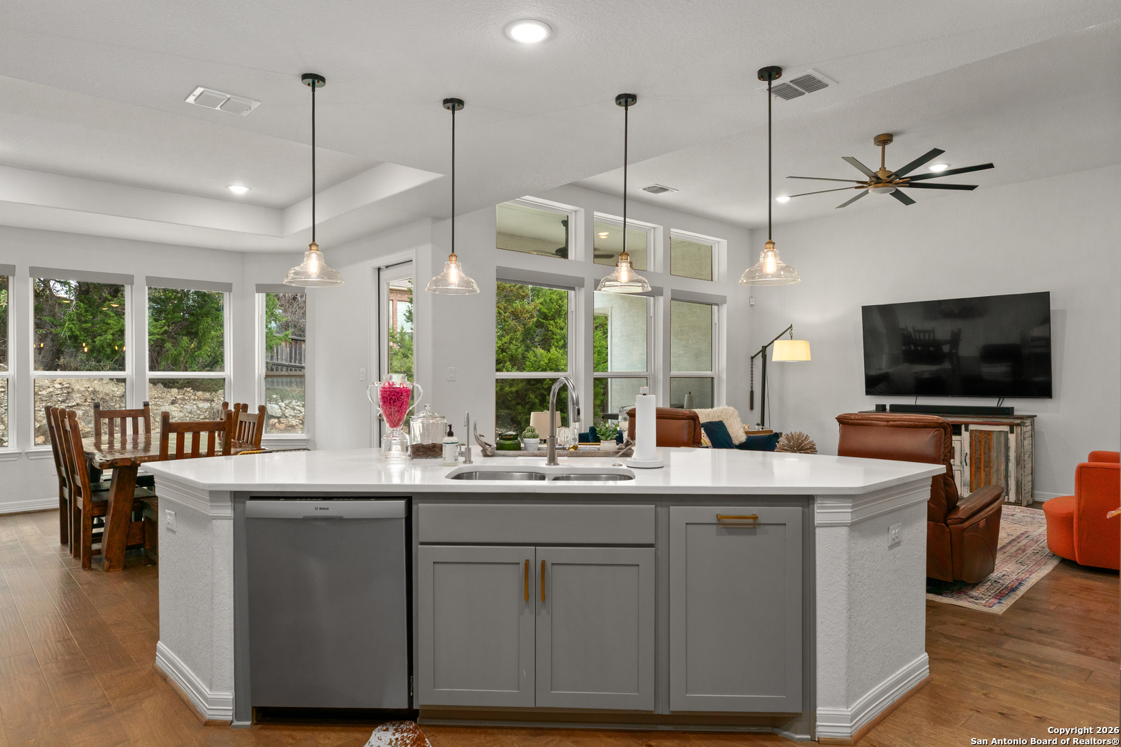 Welcome to this beautifully designed 3 bedroom, 2.5 bathroom home located in the gated community of Ridge Creek. Enjoy an exceptional open concept layout with modern style! This home offers a bright, open floor plan with high ceilings, modern fixtures, and an oversized ceiling fan anchoring the spacious great room. A full back wall of windows fill the home with natural light. Just off the entry, French doors open to a flexible space perfect for a home office, game room, or bonus room. The kitchen is the heart of the home, featuring an oversized island and quartz countertops throughout, modern fixtures and stylish backsplash, ideal for entertaining and casual living. The primary suite offers a relaxing retreat with an en-suite bath, separate vanities, soaking tub, walk-in shower, and duel walk-in closets. Two secondary bedrooms share a Jack-and-Jill bath with their own private vanities. Step outside to your private backyard, where an extended patio and mature trees create a peaceful escape perfect for morning coffee, relaxation or casual get togethers. You're just a short drive to world class restaurants and shopping at The Rim and La Cantera and all that North San Antonio and the Hill Country have to offer. Located within the highly rated Boerne ISD. Stylish, functional and tucked inside a gated neighborhood, this home is ready to be enjoyed!
