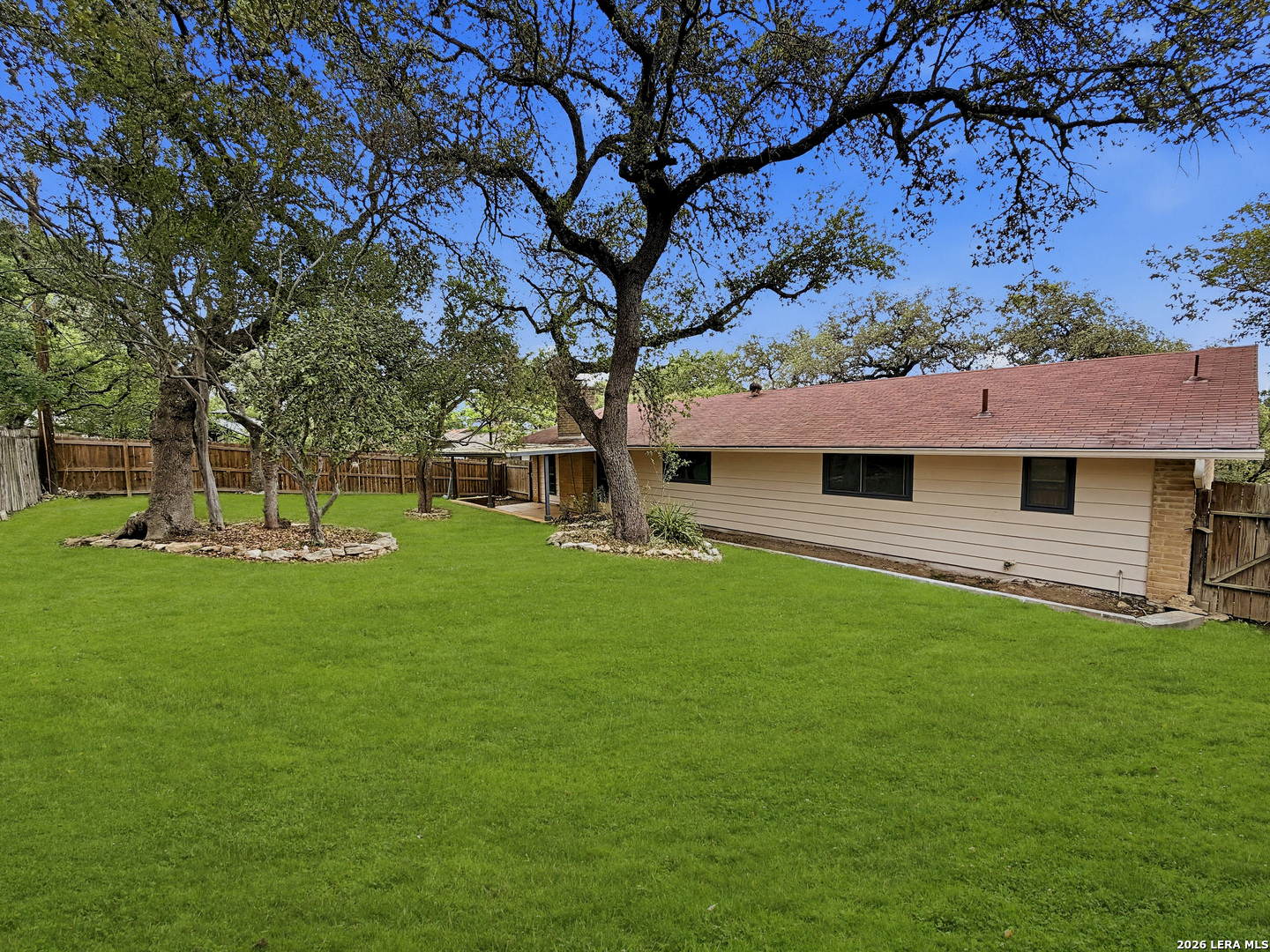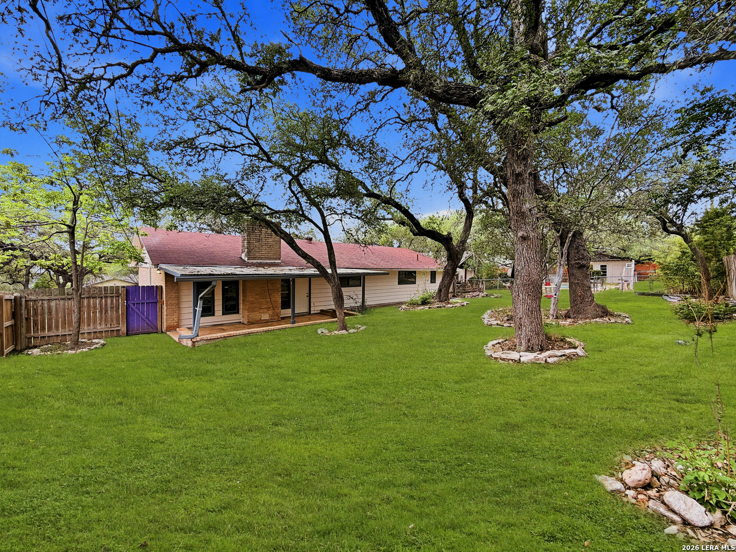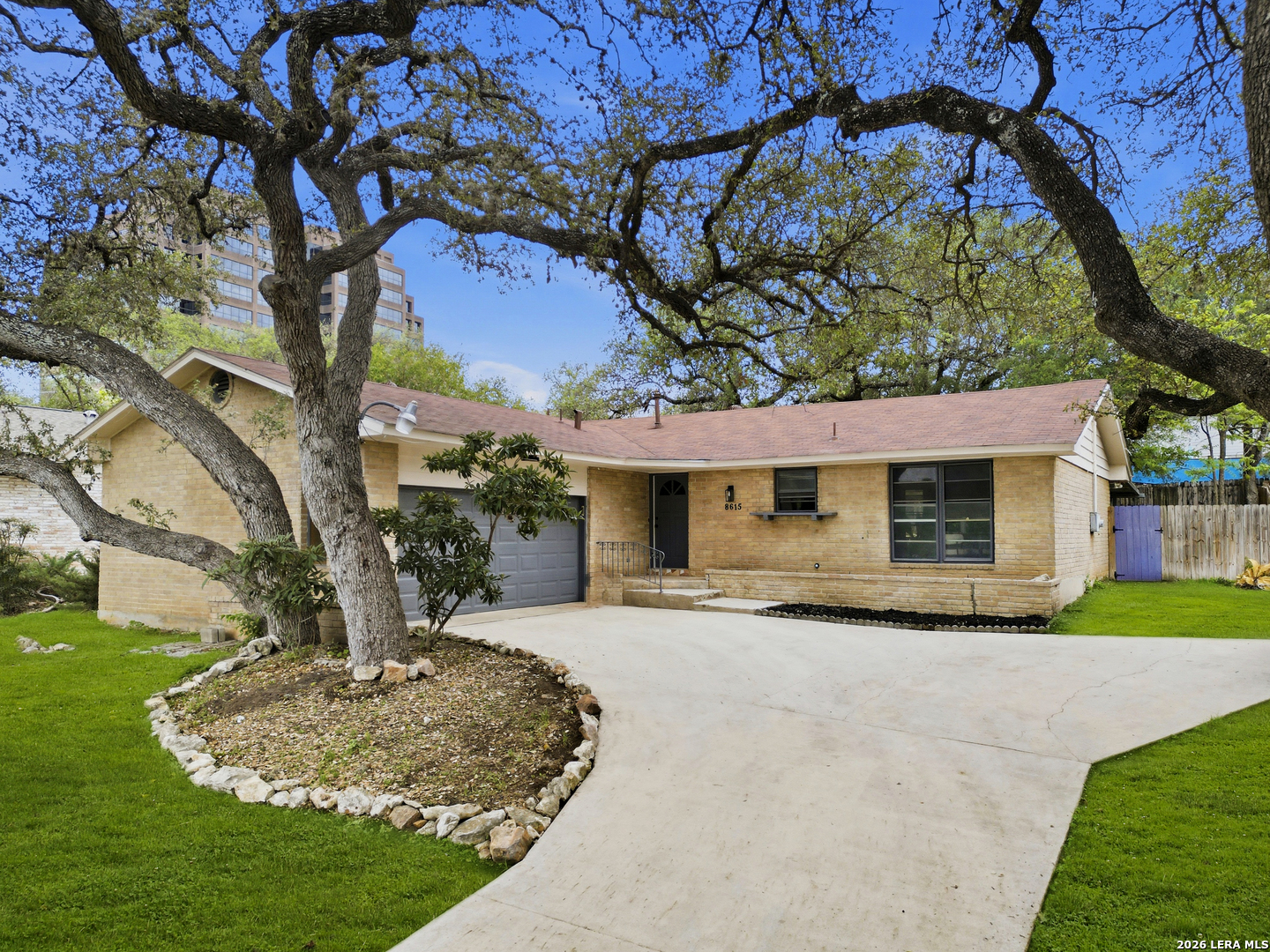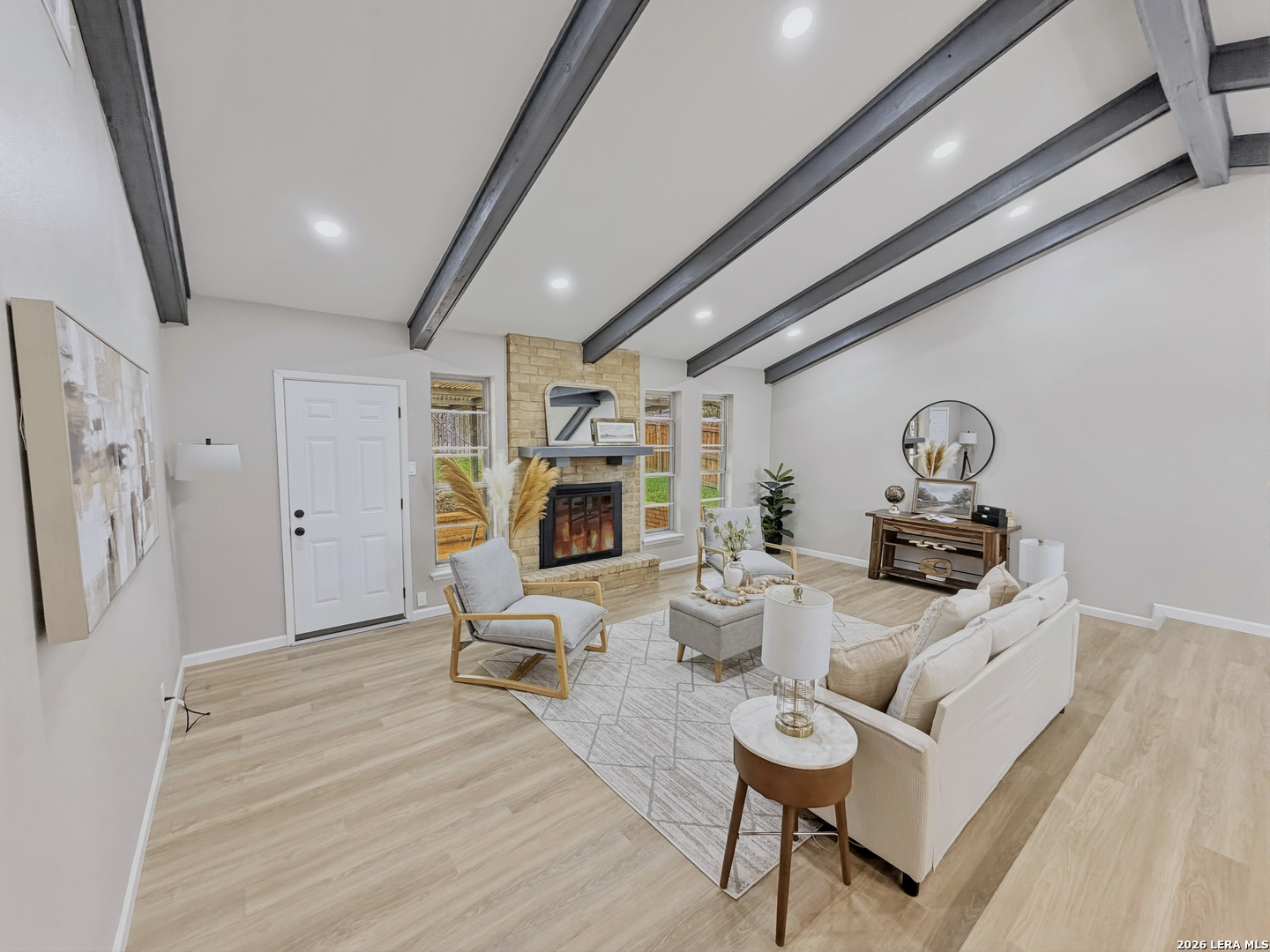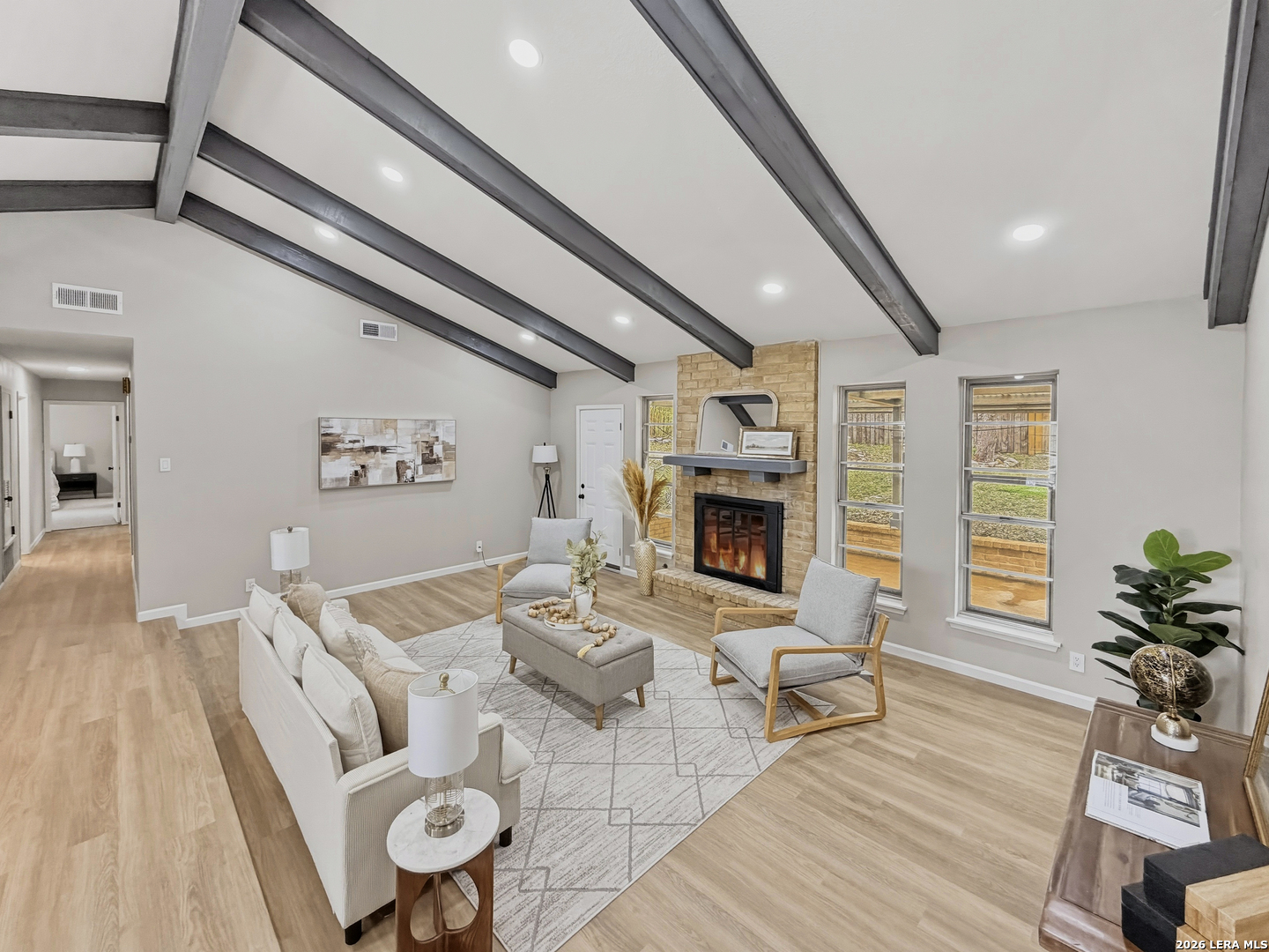 This is the one buyers have been waiting for in Forest Oaks, fully updated, move in ready, and packed with style and value. Three beds, two baths, two car garage on .269 acres sitting on a spacious lot with mature trees, a long driveway, and three sides brick, delivering strong curb appeal from the moment you arrive. Inside, the home opens up with high ceilings, exposed wooden beams, and a warm living area centered around a fireplace, all tied together with new luxury vinyl plank flooring and fresh carpet in the bedrooms. The kitchen is a standout with new custom cabinetry, stainless steel appliances, quartz countertops, a tiled backsplash, and sleek fixtures with gold accents, all overlooking the dining and living spaces for easy everyday living and entertaining. The primary suite feels like a private retreat with double quartz vanities, gold finishes, and an oversized walk in shower, plus direct access to a quiet outdoor lounging area. A covered patio, full privacy fence, and generous backyard set the stage for weekend gatherings and Texas BBQs. Located just minutes from Fort Sam Houston, Randolph Air Force Base, and McAllister Park, with quick access to Interstate 35 and Loop 410, and close proximity to shopping and dining at North Star Mall and The Forum at Olympia Parkway. Homes with this level of finish and location do not last, schedule your showing today and bring your offer.