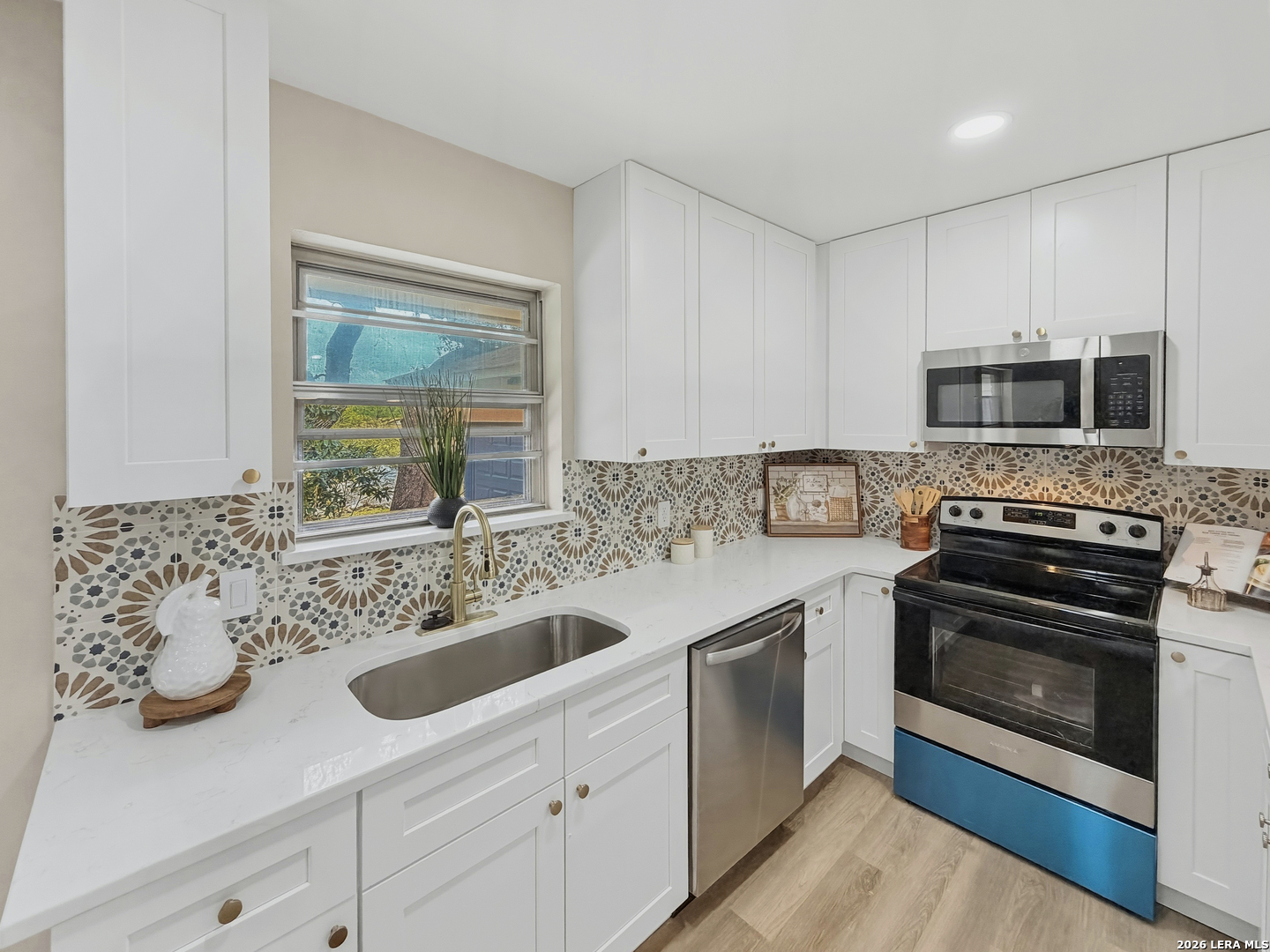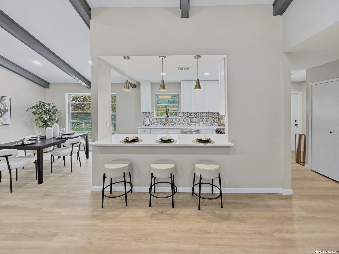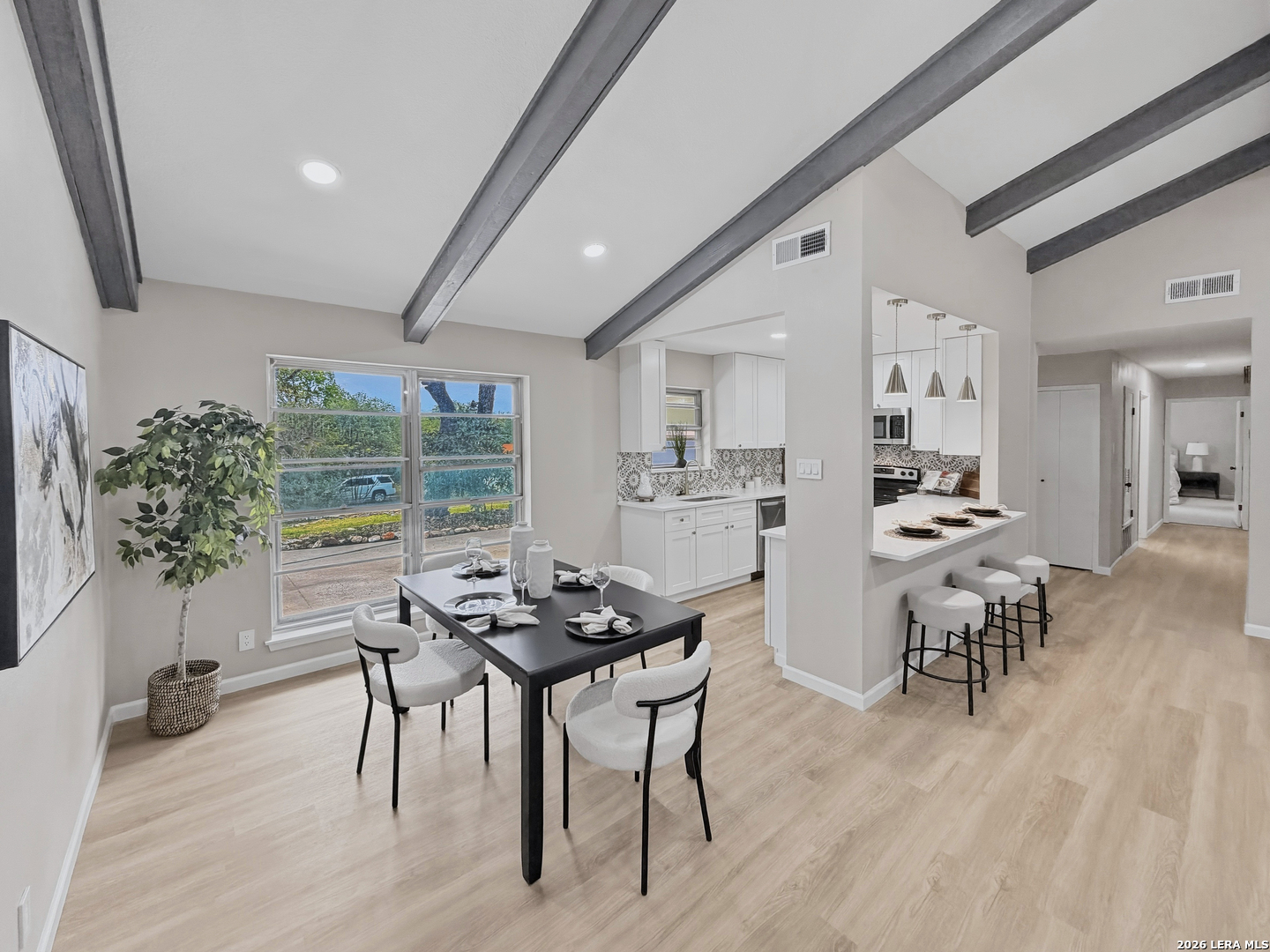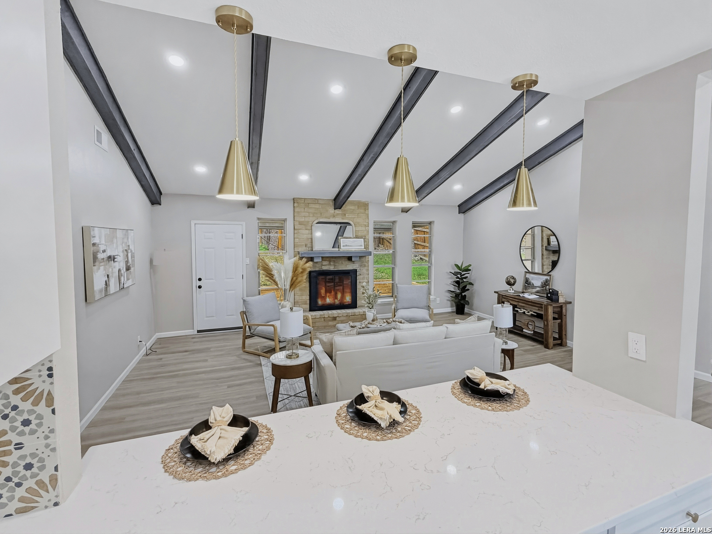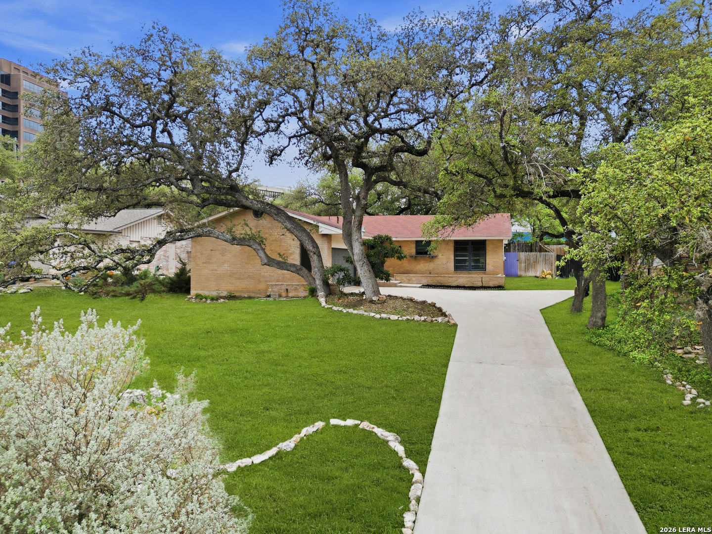 This is the one buyers have been waiting for in Forest Oaks, fully updated, move in ready, and packed with style and value. Three beds, two baths, two car garage on .269 acres sitting on a spacious lot with mature trees, a long driveway, and three sides brick, delivering strong curb appeal from the moment you arrive. Inside, the home opens up with high ceilings, exposed wooden beams, and a warm living area centered around a fireplace, all tied together with new luxury vinyl plank flooring and fresh carpet in the bedrooms. The kitchen is a standout with new custom cabinetry, stainless steel appliances, quartz countertops, a tiled backsplash, and sleek fixtures with gold accents, all overlooking the dining and living spaces for easy everyday living and entertaining. The primary suite feels like a private retreat with double quartz vanities, gold finishes, and an oversized walk in shower, plus direct access to a quiet outdoor lounging area. A covered patio, full privacy fence, and generous backyard set the stage for weekend gatherings and Texas BBQs. Located just minutes from Fort Sam Houston, Randolph Air Force Base, and McAllister Park, with quick access to Interstate 35 and Loop 410, and close proximity to shopping and dining at North Star Mall and The Forum at Olympia Parkway. Homes with this level of finish and location do not last, schedule your showing today and bring your offer.