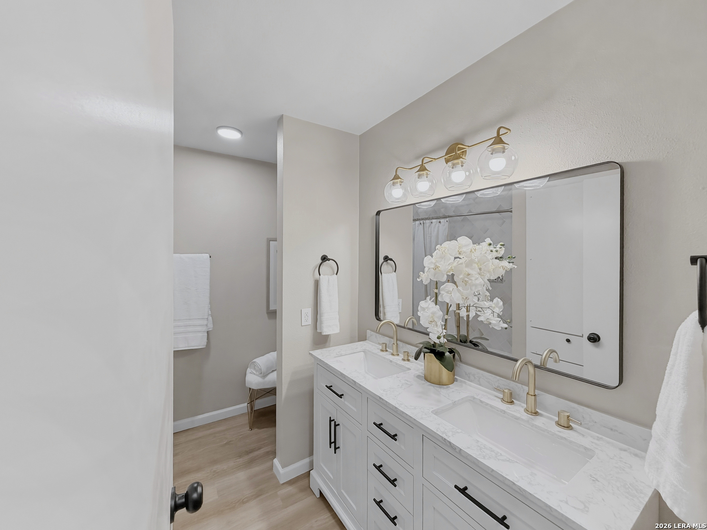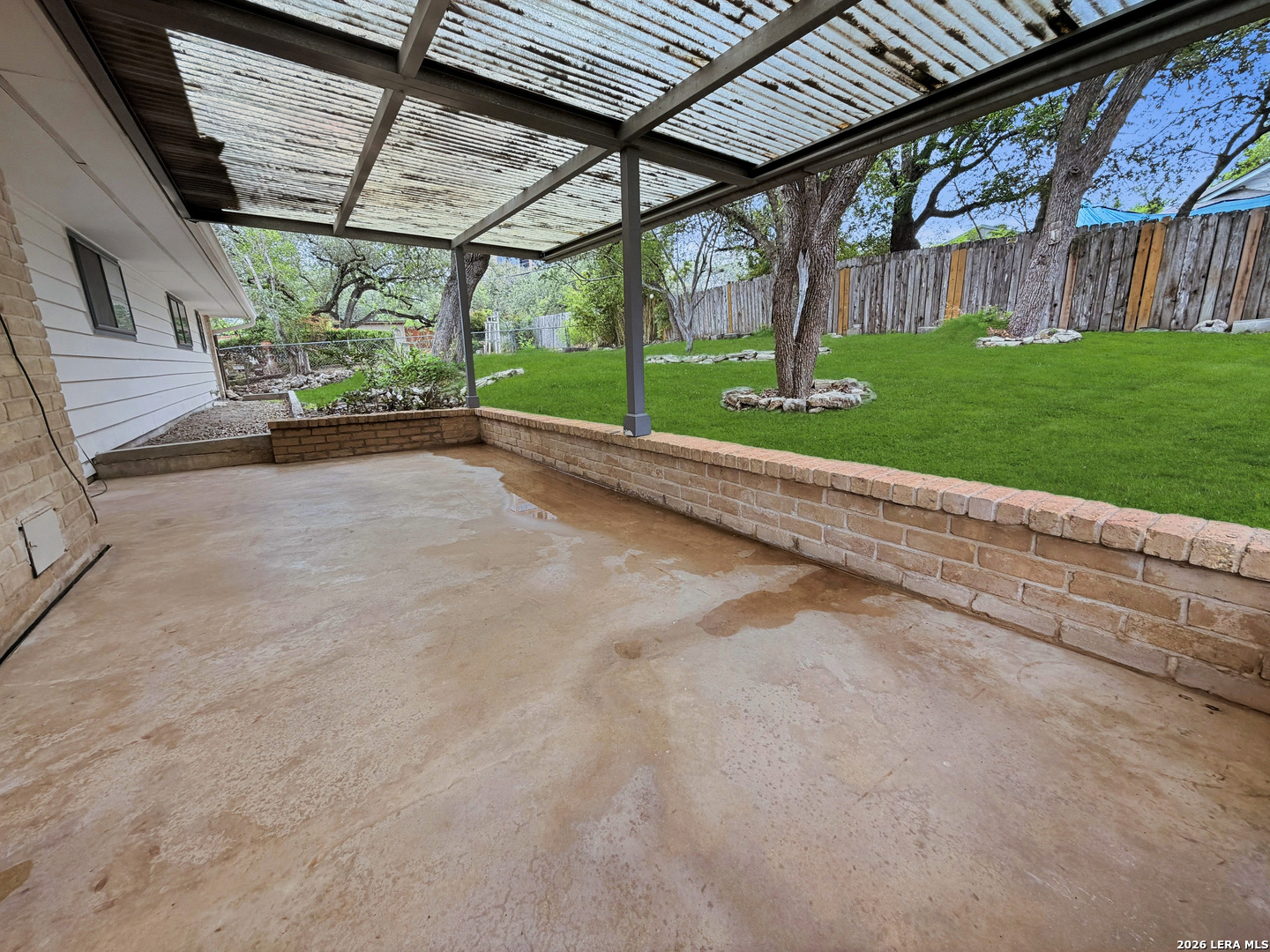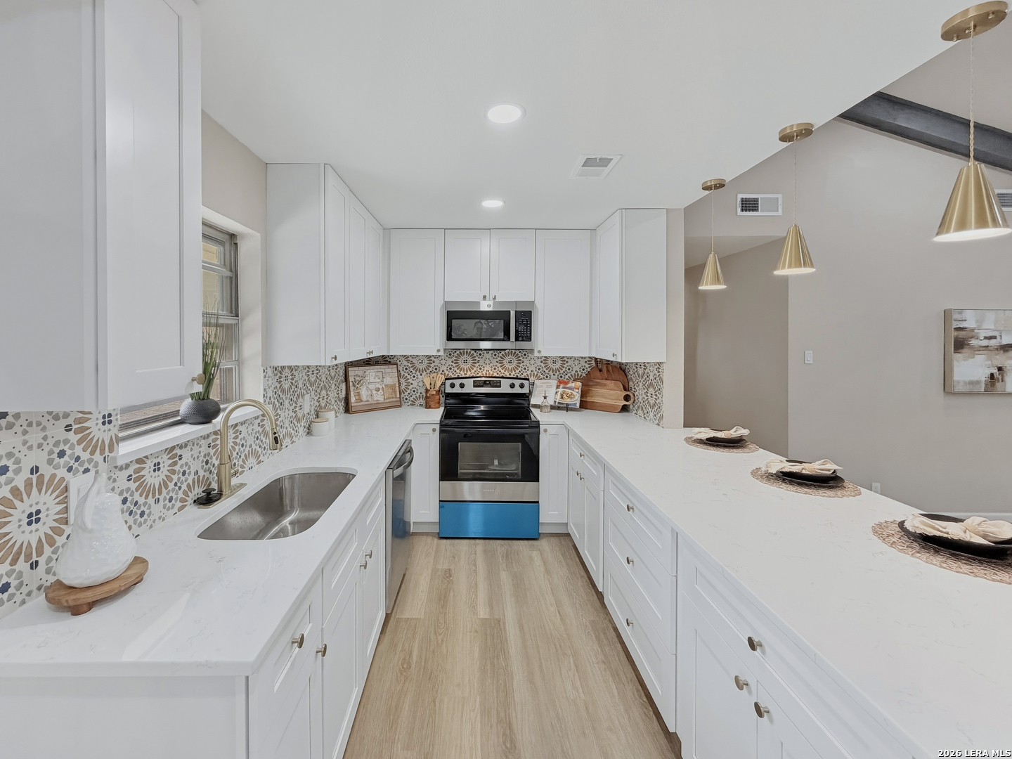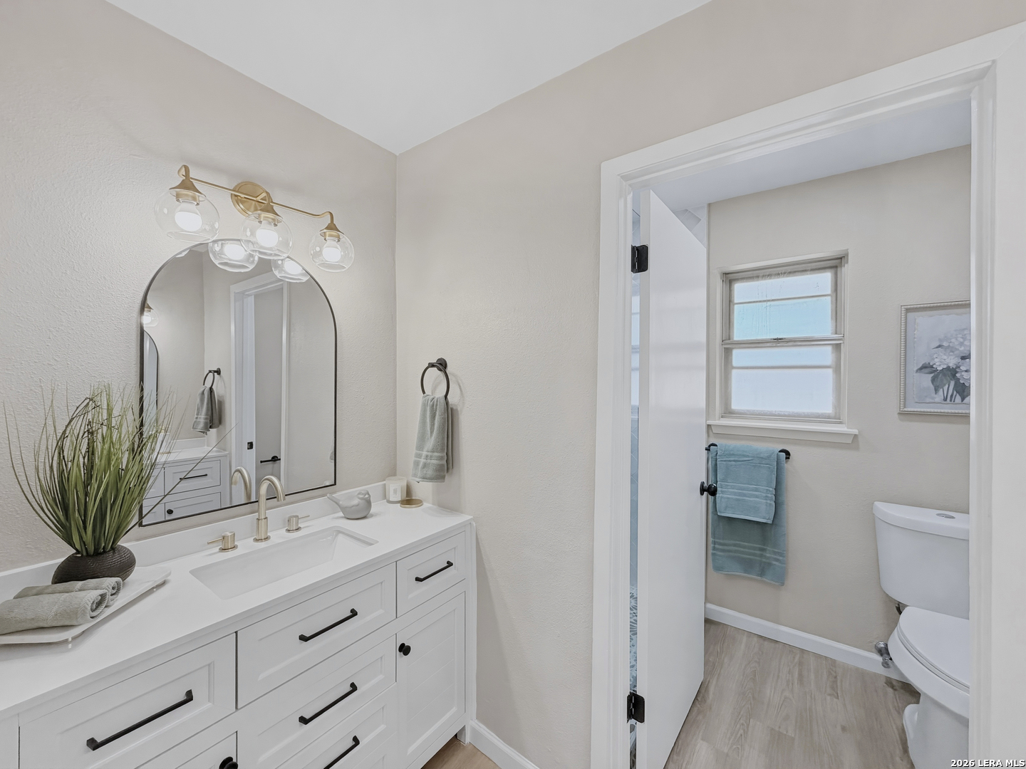 This is the one buyers have been waiting for in Forest Oaks, fully updated, move in ready, and packed with style and value. Three beds, two baths, two car garage on .269 acres sitting on a spacious lot with mature trees, a long driveway, and three sides brick, delivering strong curb appeal from the moment you arrive. Inside, the home opens up with high ceilings, exposed wooden beams, and a warm living area centered around a fireplace, all tied together with new luxury vinyl plank flooring and fresh carpet in the bedrooms. The kitchen is a standout with new custom cabinetry, stainless steel appliances, quartz countertops, a tiled backsplash, and sleek fixtures with gold accents, all overlooking the dining and living spaces for easy everyday living and entertaining. The primary suite feels like a private retreat with double quartz vanities, gold finishes, and an oversized walk in shower, plus direct access to a quiet outdoor lounging area. A covered patio, full privacy fence, and generous backyard set the stage for weekend gatherings and Texas BBQs. Located just minutes from Fort Sam Houston, Randolph Air Force Base, and McAllister Park, with quick access to Interstate 35 and Loop 410, and close proximity to shopping and dining at North Star Mall and The Forum at Olympia Parkway. Homes with this level of finish and location do not last, schedule your showing today and bring your offer.