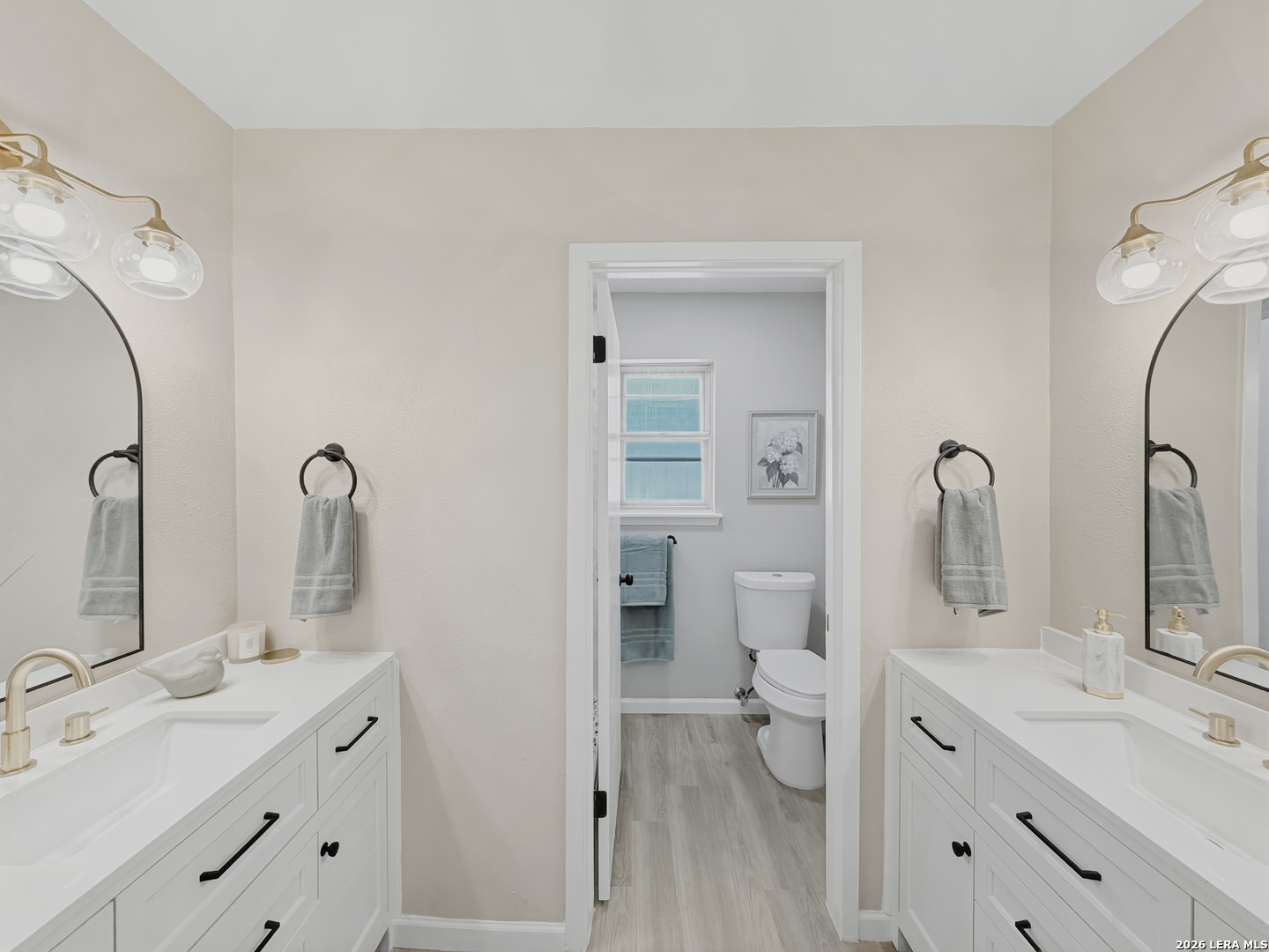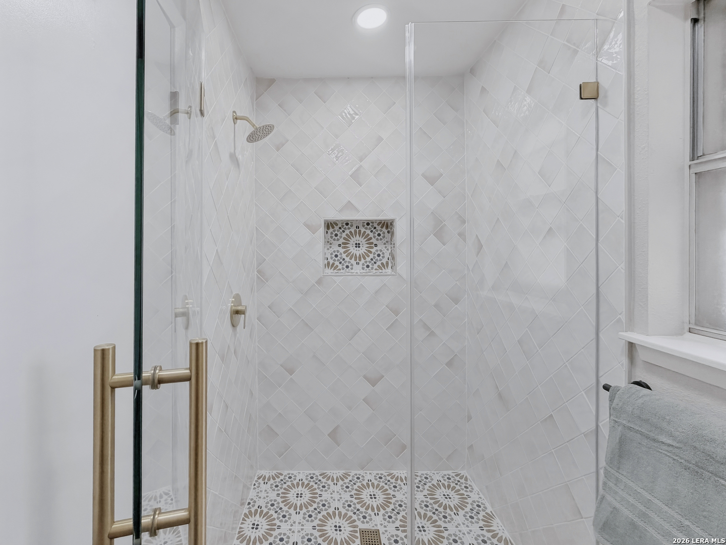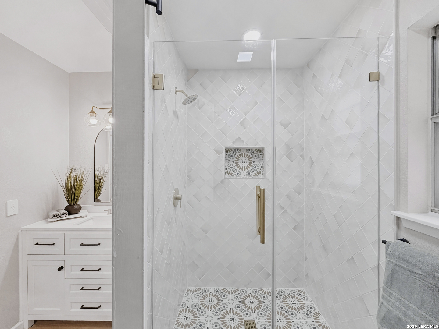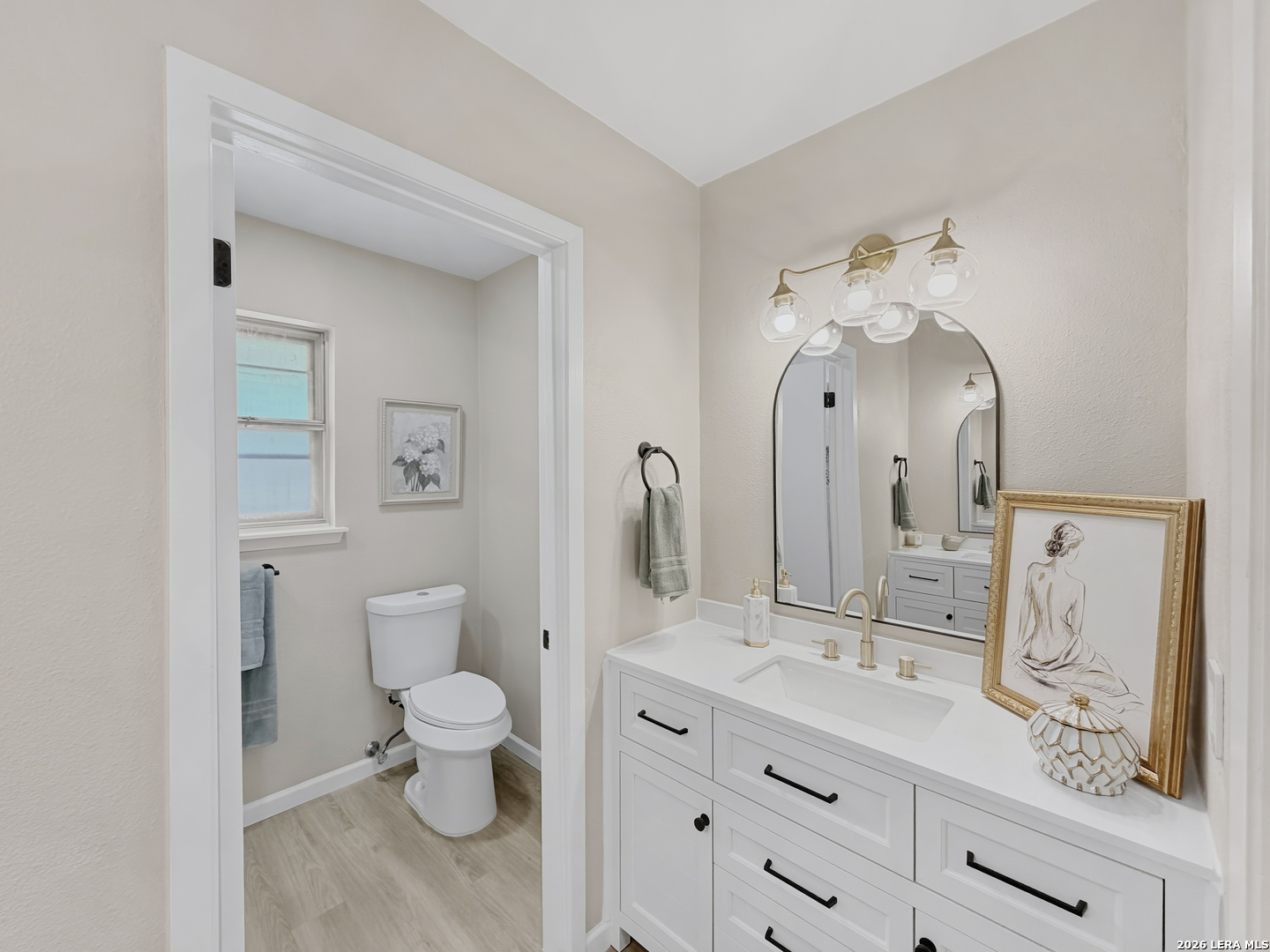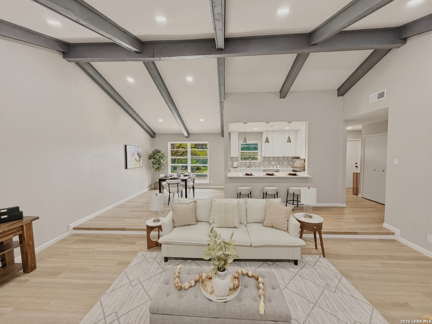 This is the one buyers have been waiting for in Forest Oaks, fully updated, move in ready, and packed with style and value. Three beds, two baths, two car garage on .269 acres sitting on a spacious lot with mature trees, a long driveway, and three sides brick, delivering strong curb appeal from the moment you arrive. Inside, the home opens up with high ceilings, exposed wooden beams, and a warm living area centered around a fireplace, all tied together with new luxury vinyl plank flooring and fresh carpet in the bedrooms. The kitchen is a standout with new custom cabinetry, stainless steel appliances, quartz countertops, a tiled backsplash, and sleek fixtures with gold accents, all overlooking the dining and living spaces for easy everyday living and entertaining. The primary suite feels like a private retreat with double quartz vanities, gold finishes, and an oversized walk in shower, plus direct access to a quiet outdoor lounging area. A covered patio, full privacy fence, and generous backyard set the stage for weekend gatherings and Texas BBQs. Located just minutes from Fort Sam Houston, Randolph Air Force Base, and McAllister Park, with quick access to Interstate 35 and Loop 410, and close proximity to shopping and dining at North Star Mall and The Forum at Olympia Parkway. Homes with this level of finish and location do not last, schedule your showing today and bring your offer.