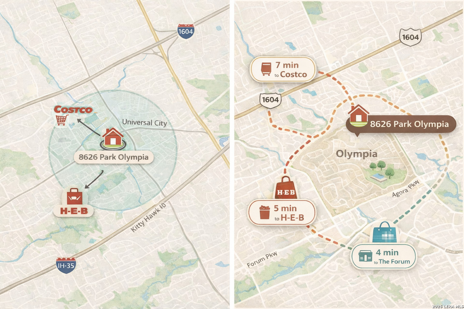 Living at 8626 Park Olympia means enjoying the best of suburban life with everyday conveniences right within reach. Welcome home to this charming one-story residence nestled in the desirable Olympia neighborhood, where comfort, convenience, and everyday functionality come together: H-E-B is only 5 minutes away and COSTCO is just 7 minutes down the road and the best part is ...you do not have to get on the highway to access any of the major shopping and grocery centers. This inviting home offers a thoughtful layout with a separate dining area and a spacious living room that creates a warm, welcoming atmosphere for both relaxing and entertaining. The galley kitchen features a cozy breakfast area overlooking a tranquil greenbelt, providing a peaceful backdrop for morning coffee or casual meals. The generously sized primary suite serves as a private retreat, complete with a walk-in closet and a full ensuite bath featuring a double vanity and a tub/shower combination designed for comfort and ease. Secondary bedrooms are nicely sized and versatile, perfect for family, guests, or a home office. Step outside to enjoy the covered patio and privacy-fenced backyard, an ideal space for outdoor gatherings or unwinding at the end of the day. A two-car attached garage adds everyday convenience. Ideally located just minutes from shopping and dining at The Forum, this home is also close to Randolph Air Force Base and Fort Sam Houston, with easy access to major commuting routes, making it a wonderful opportunity for comfortable living in a prime location.