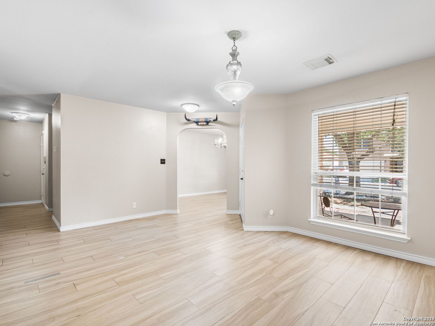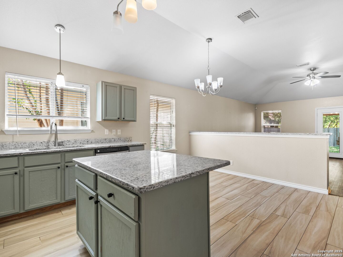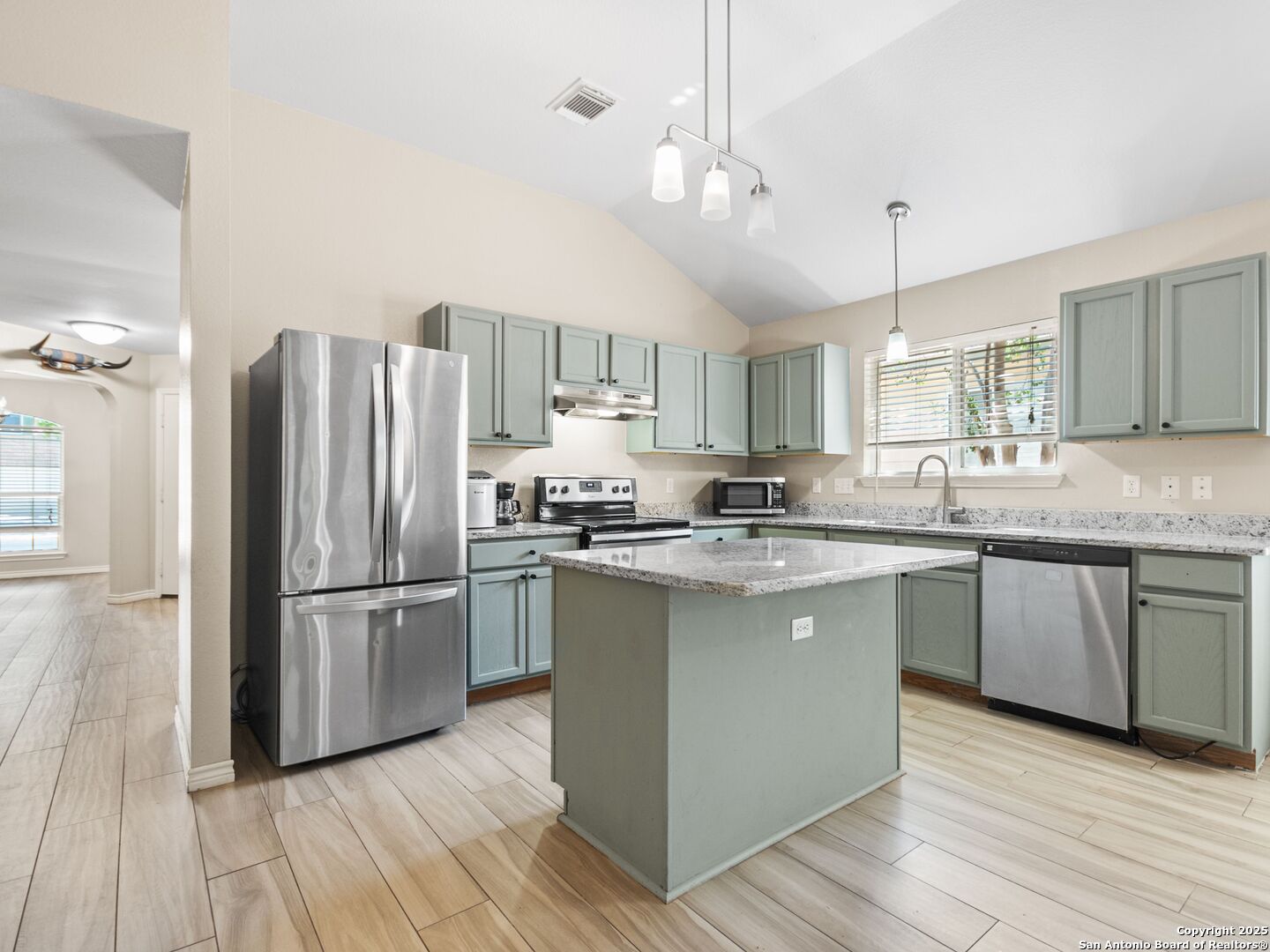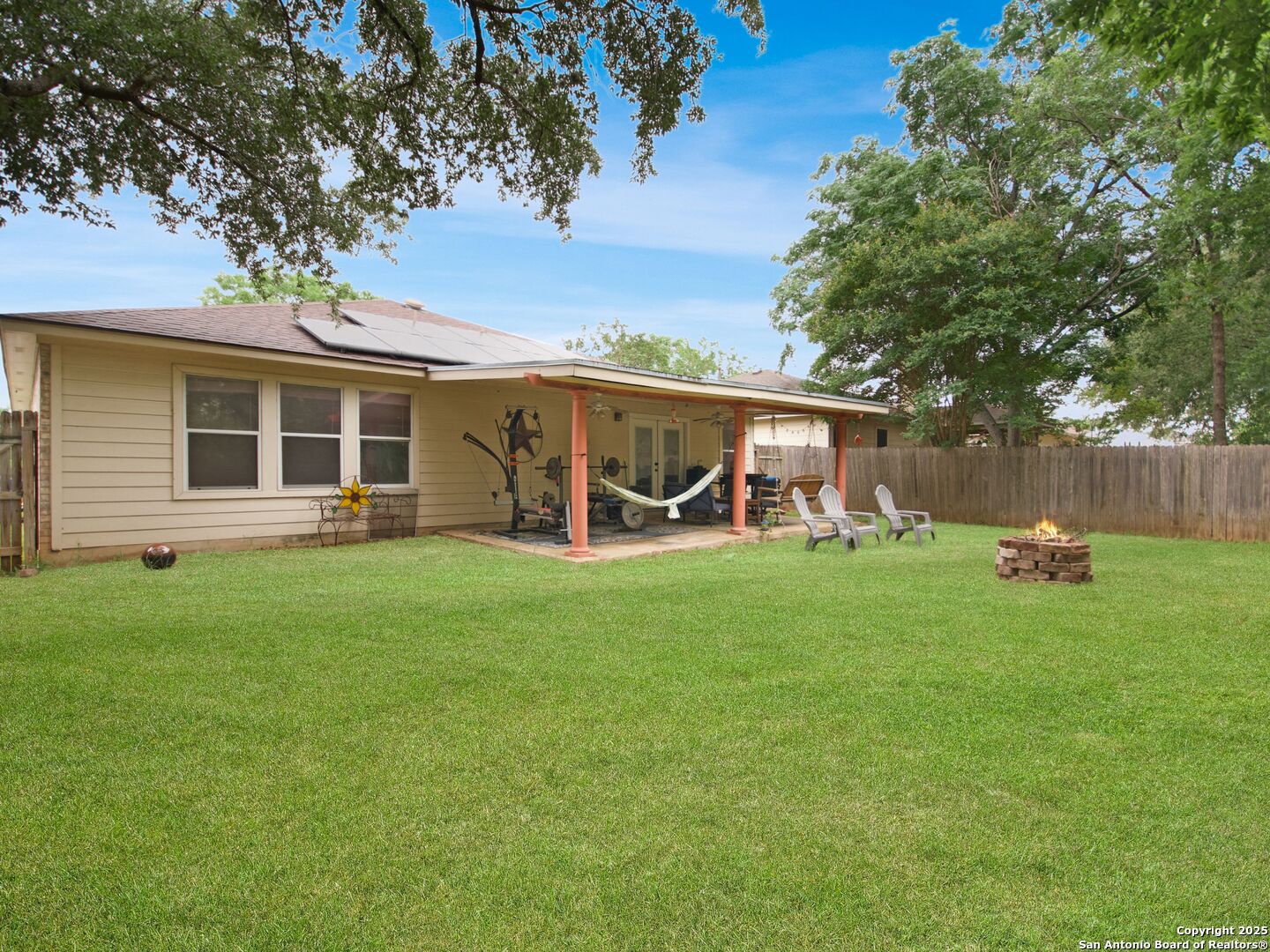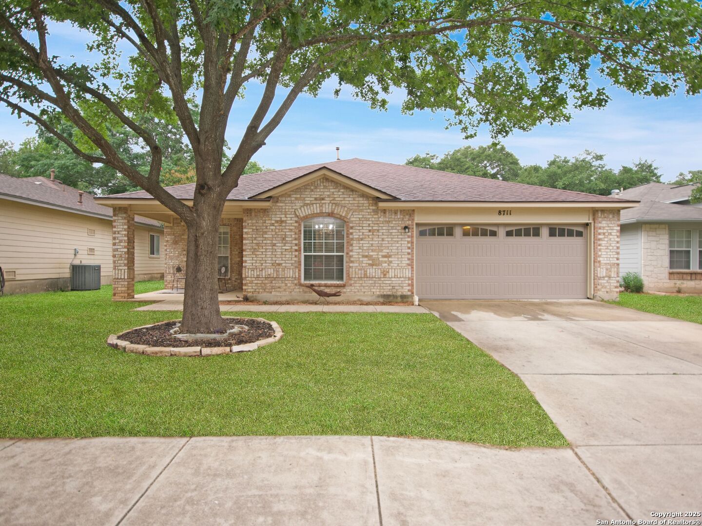 Discover this beautifully updated 3-bedroom, 2-bath, single-story home at 8711 Dumaine in San Antonio, featuring an open floor plan with high ceilings, two living areas, a versatile dining/office space, and a modern kitchen with granite countertops, island, walk-in pantry, and newer appliances. The spacious master suite offers a walk-in closet and a luxurious bath with a garden tub and a separate shower. Enjoy tile and laminate flooring throughout main areas, a covered front porch, oversized covered back patio, fenced backyard backing to a greenbelt, double-car garage, newer roof, and energy-efficient solar panels - all in a great location near shopping, dining, and top-rated schools!