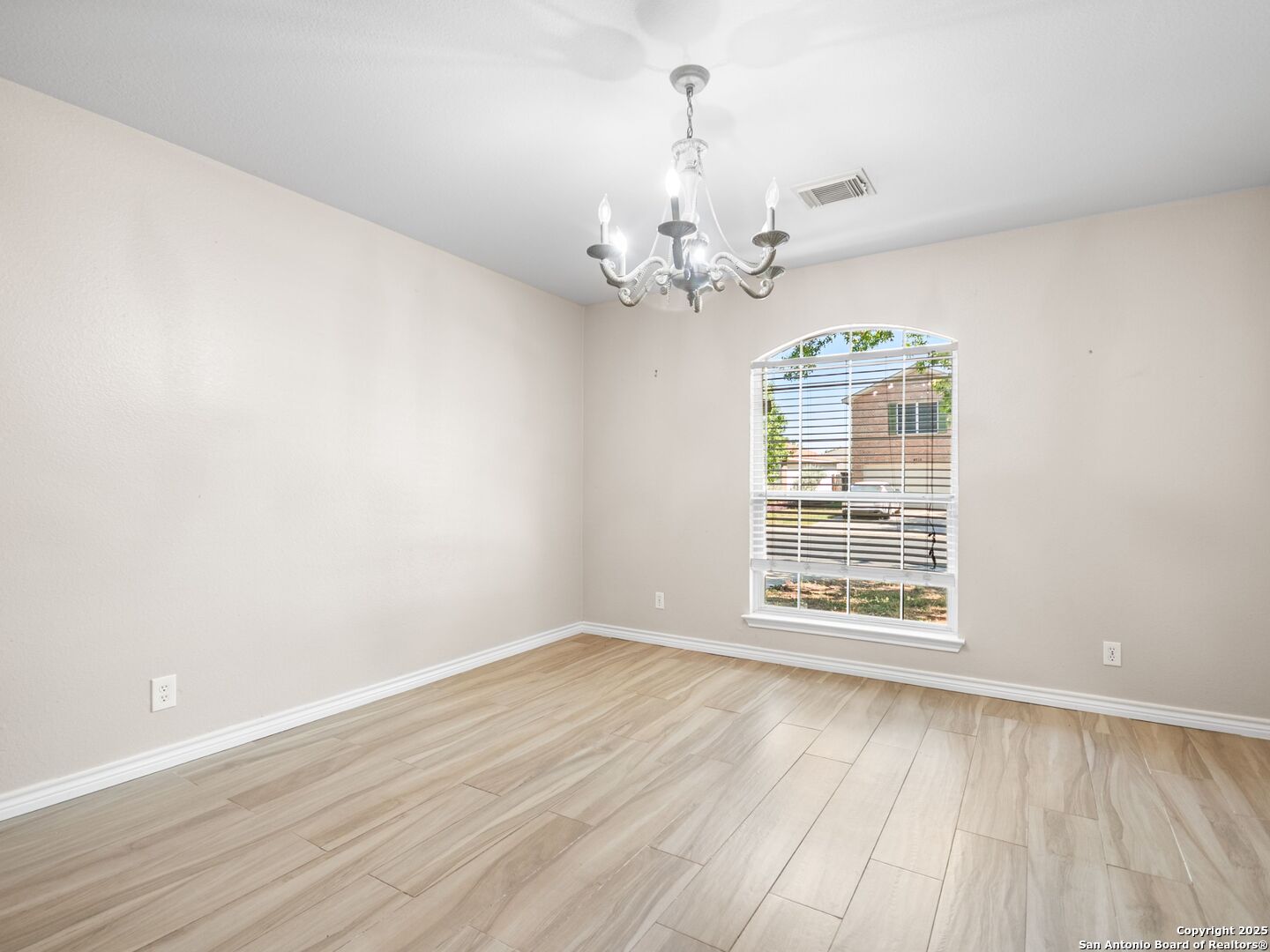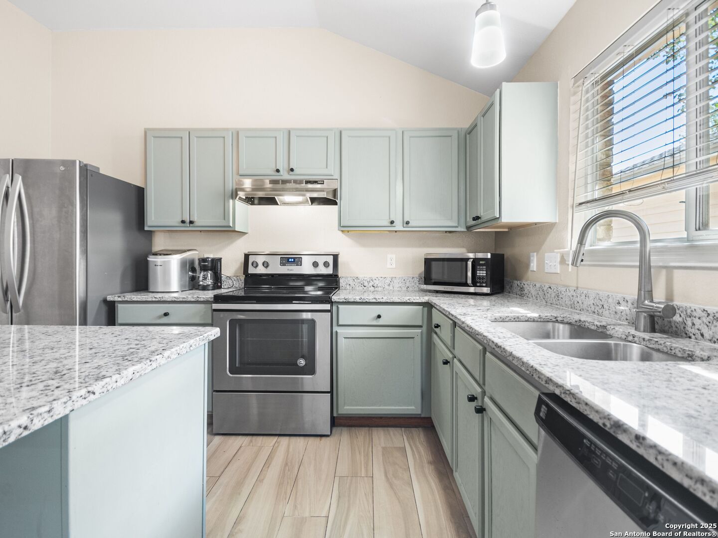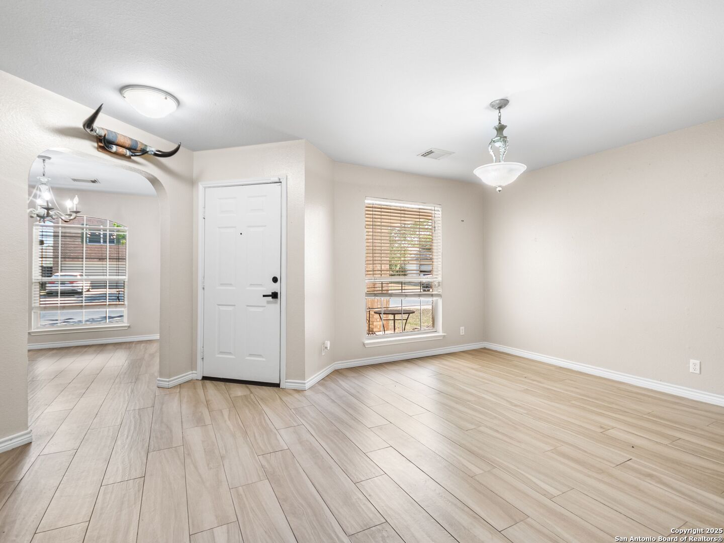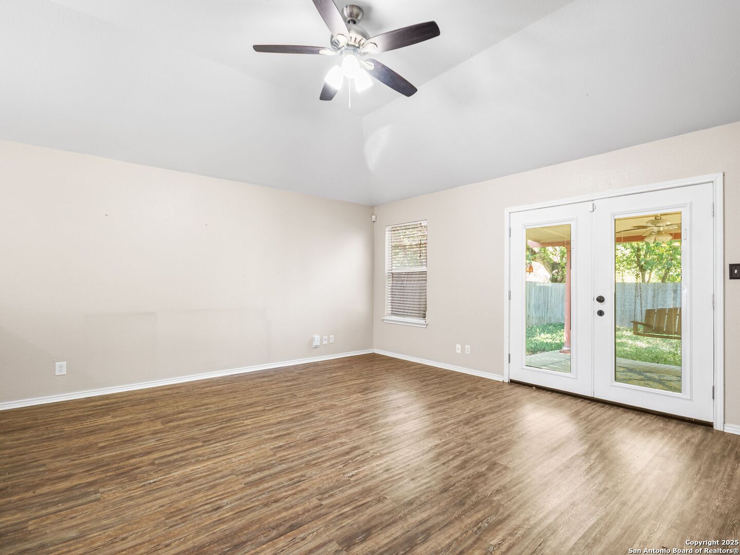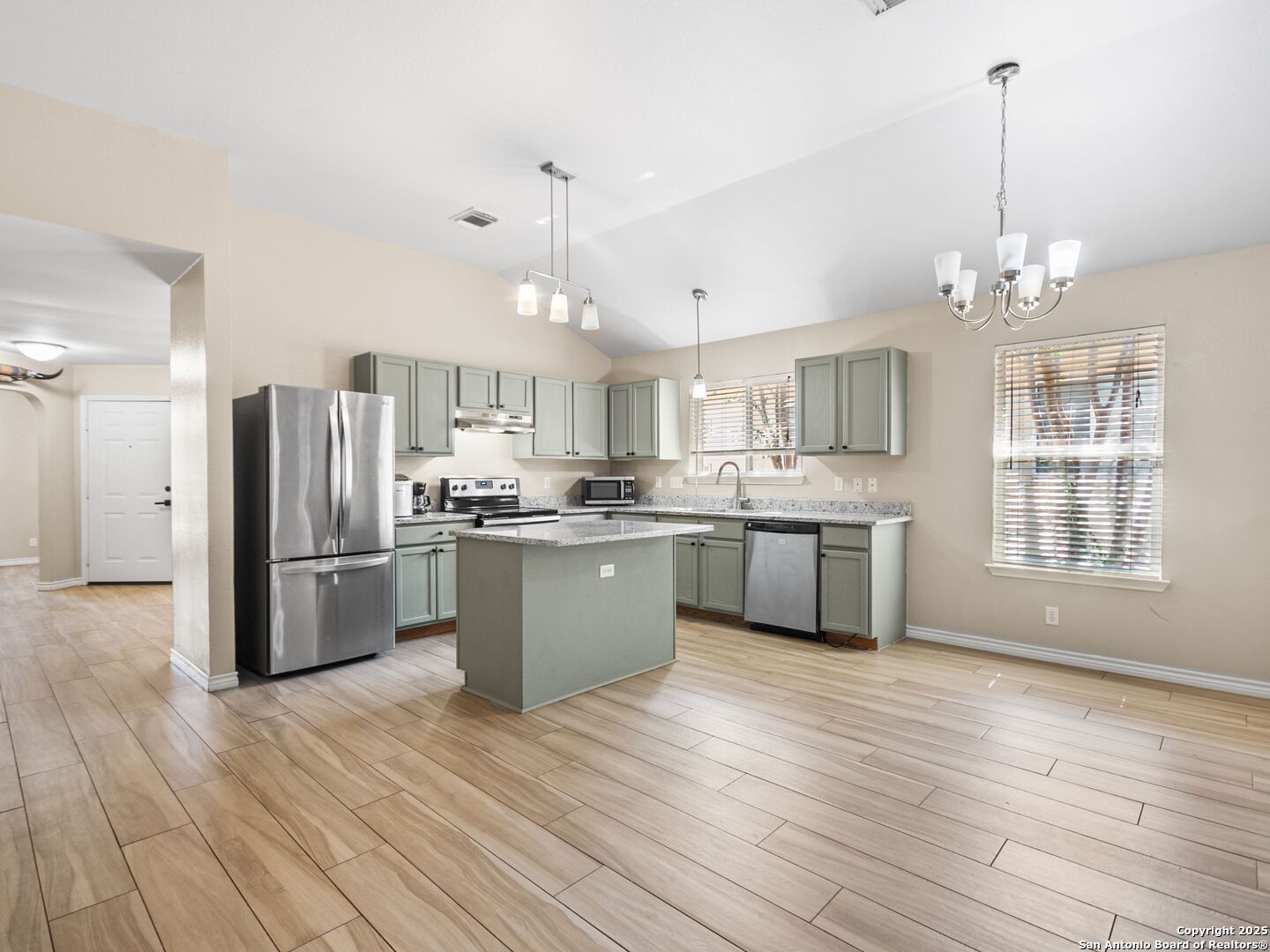 Discover this beautifully updated 3-bedroom, 2-bath, single-story home at 8711 Dumaine in San Antonio, featuring an open floor plan with high ceilings, two living areas, a versatile dining/office space, and a modern kitchen with granite countertops, island, walk-in pantry, and newer appliances. The spacious master suite offers a walk-in closet and a luxurious bath with a garden tub and a separate shower. Enjoy tile and laminate flooring throughout main areas, a covered front porch, oversized covered back patio, fenced backyard backing to a greenbelt, double-car garage, newer roof, and energy-efficient solar panels - all in a great location near shopping, dining, and top-rated schools!