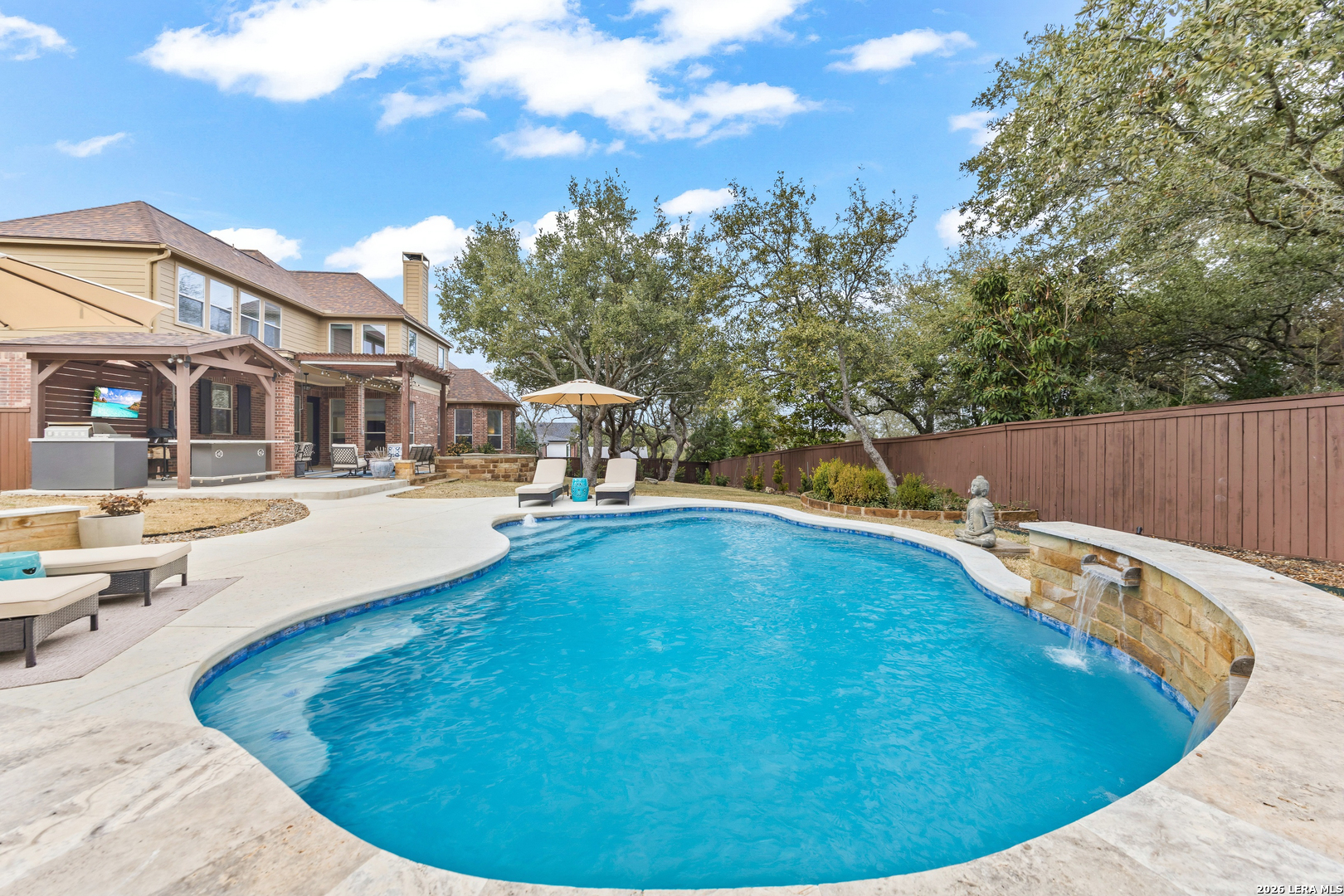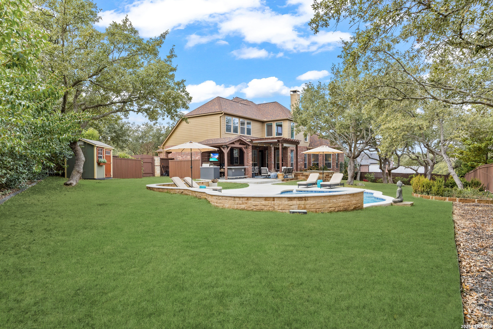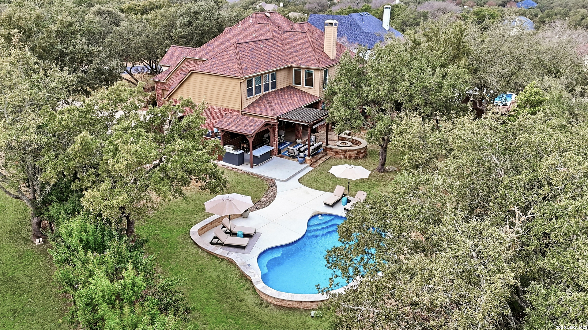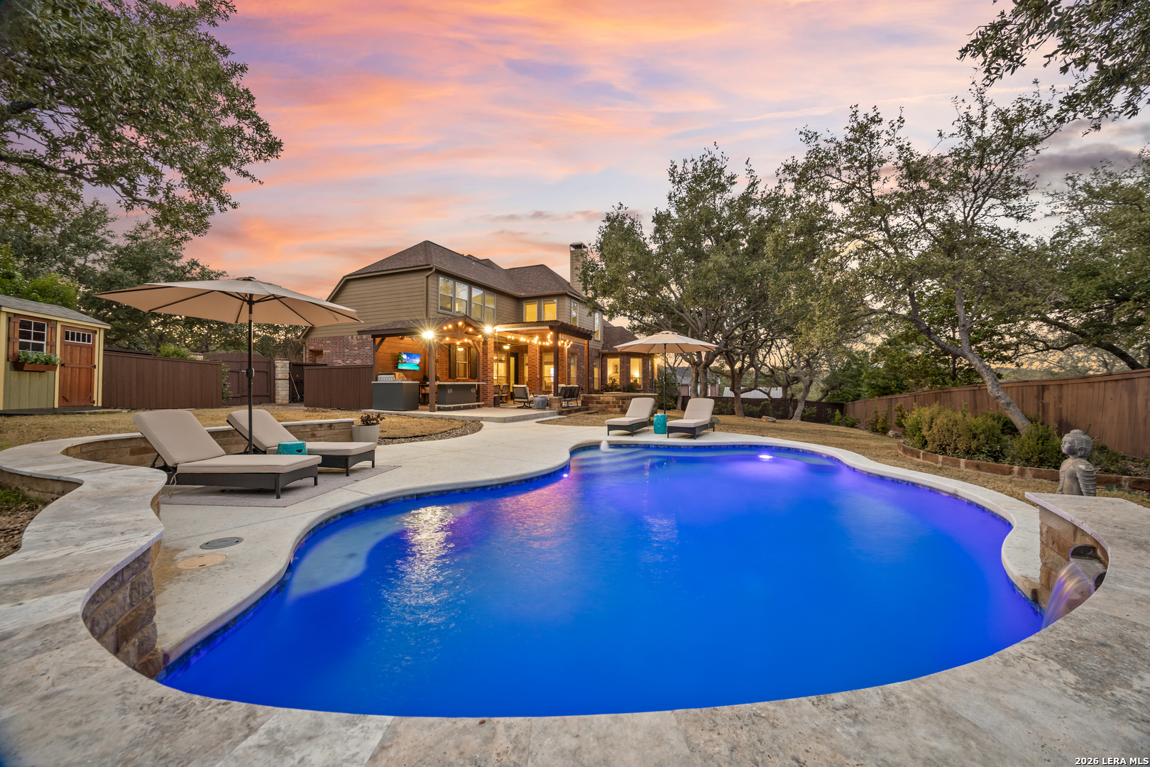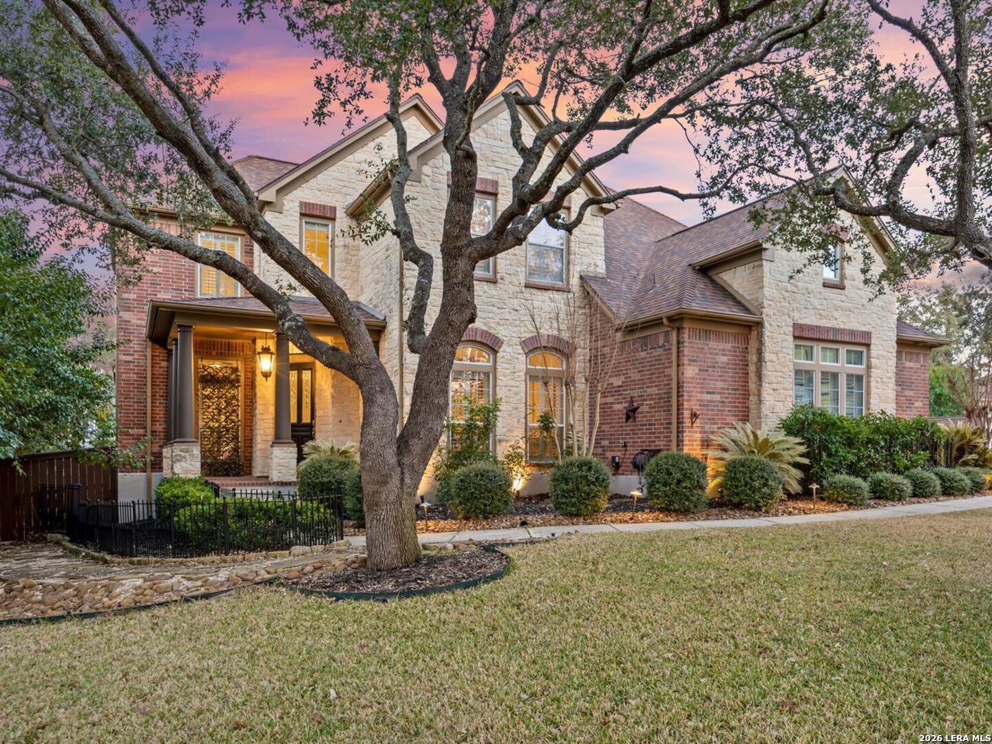 Nestled within the prestigious and tranquil community of The Woods at Fair Oaks Ranch, this impeccably maintained and thoughtfully updated residence offers a seamless blend of timeless elegance and modern luxury. Surrounded by mature trees and enhanced by classic plantation shutters, the home provides a private, welcoming retreat in one of the Hill Country's most desirable settings. At the heart of the home is a true chef's kitchen, beautifully designed for both everyday living and entertaining. Featuring ceiling-height custom cabinetry, a built-in coffee station with appliance garage, and premium Bosch appliances-including a microwave drawer, wall oven, dishwasher, refrigerator, and disposal-this space is as functional as it is stunning. A 36" six-burner Fulgor Milano range anchors the kitchen, complemented by an expansive granite island with pop-up electrical outlets and oversized storage drawers. Granite countertops and a marble backsplash extend into the butler's pantry, while a Kohler filtration system and walk-in pantry add convenience and thoughtful detail. Adjacent to the kitchen, the eat-in dining area is accented by a striking stone feature wall, creating warmth and architectural interest. Designed for effortless entertaining, the open-concept layout flows seamlessly into the main living areas. The living room showcases a dramatic stone fireplace, serving as a refined focal point. Brazilian cherry wood flooring enriches the study and formal dining area, currently styled as a sophisticated lounge. Additional enhancements include remote-controlled shades, Bali Roman shades, and a walk-in attic offering generous storage. The owner's suite is a serene sanctuary, highlighted by a spa-inspired bath with luxurious marble flooring. Upstairs, three spacious bedrooms, a built-in desk with bookshelves, a game room, and beautifully updated bathrooms provide ample space for work, relaxation, and play. Step outside to a private backyard oasis designed for year-round enjoyment. A brand-new heated pool, expansive covered patio, and newly constructed pergola create the ultimate outdoor entertaining space, complete with a built-in Paradise grill, TV, and refrigerator. Thoughtfully placed landscape lighting illuminates the mature trees and architectural elements, setting a stunning evening ambiance. Additional features include a third garage bay currently utilized as a mini gym and secondary home office (easily convertible back), a water softener, under-stair storage, and a full sprinkler system with drip irrigation for flower beds. A detailed list of recent upgrades-including new AC units, roof replacement, and more-is available in the additional documents. Ideally located in Fair Oaks Ranch, this home offers the best of Hill Country living with convenient access to upscale shopping, dining, and entertainment in Boerne and San Antonio. Residents enjoy scenic landscapes, miles of hiking trails, beautiful parks, top-rated schools, and membership opportunities at the renowned Fair Oaks Ranch Golf & Country Club. This exceptional home offers a rare combination of sophistication, comfort, and extensive modern updates-an extraordinary opportunity that must be experienced in person.