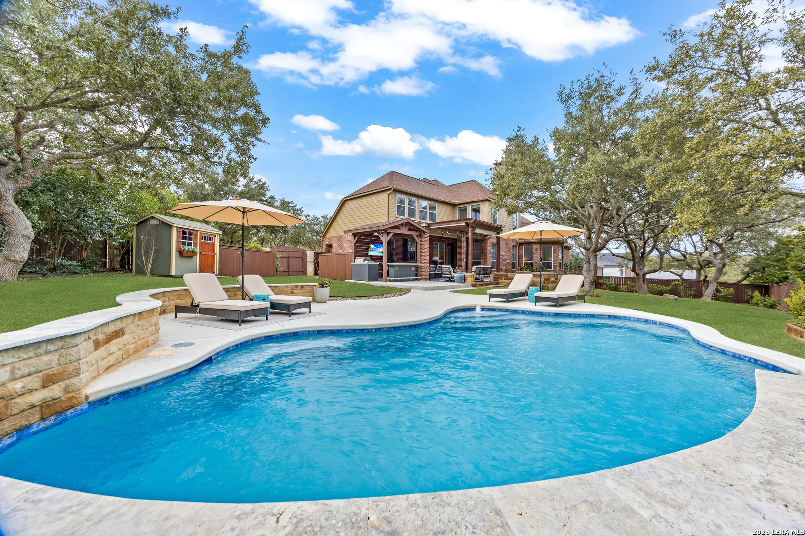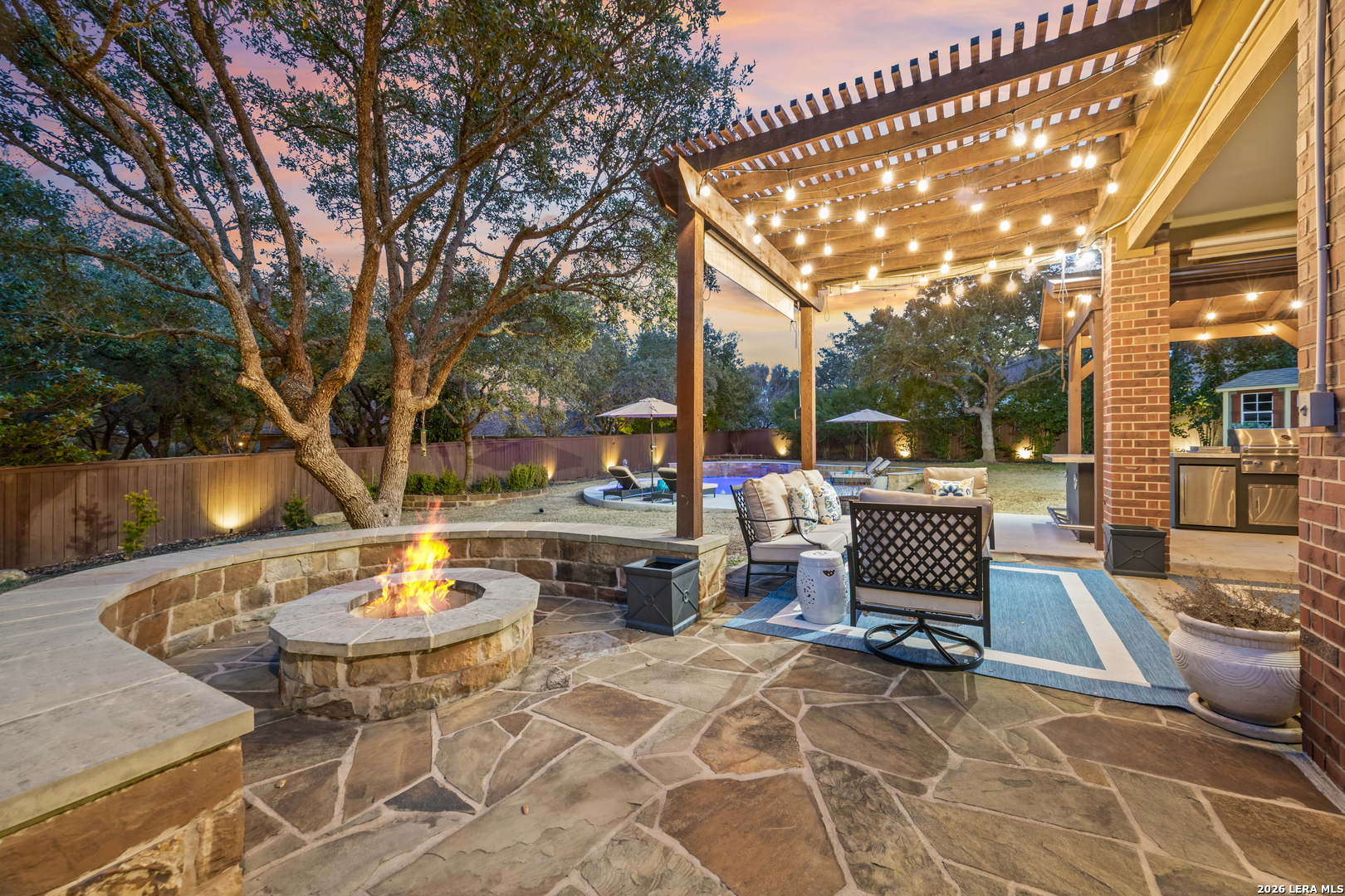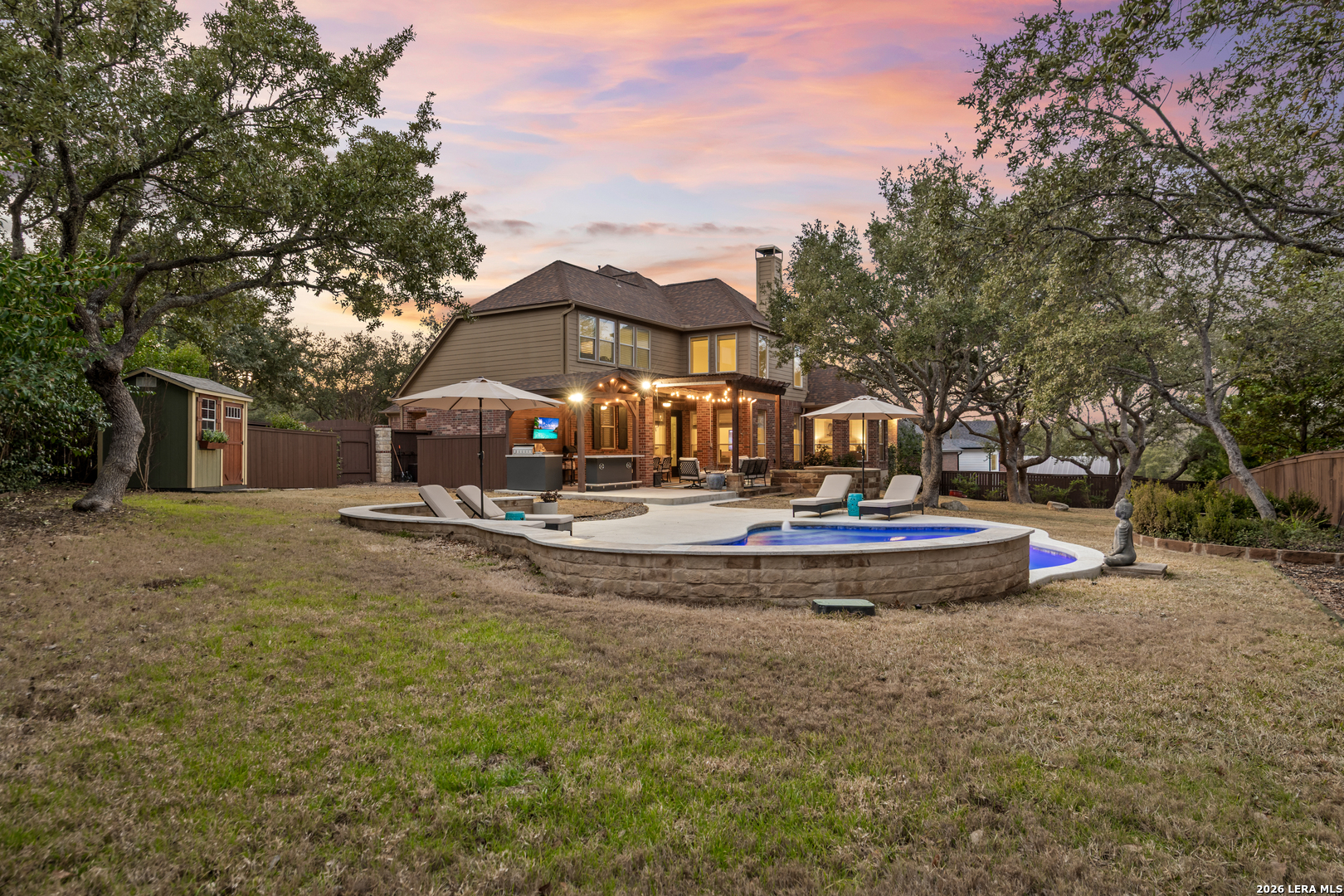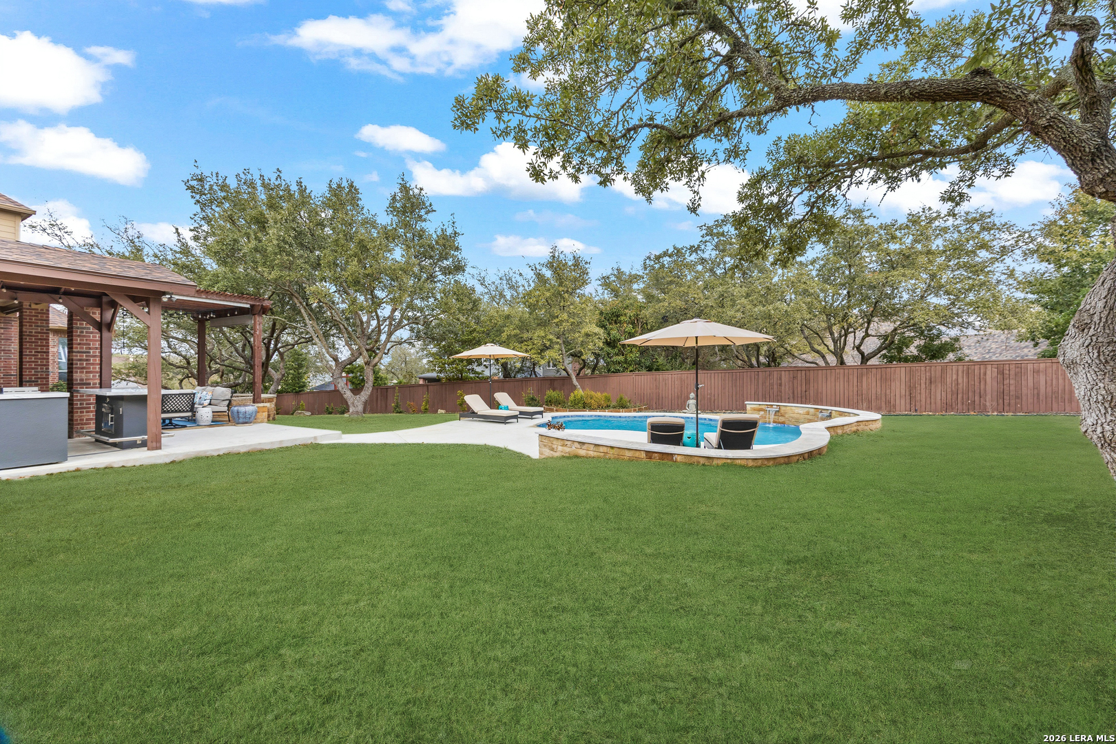 Nestled within the prestigious and tranquil community of The Woods at Fair Oaks Ranch, this impeccably maintained and thoughtfully updated residence offers a seamless blend of timeless elegance and modern luxury. Surrounded by mature trees and enhanced by classic plantation shutters, the home provides a private, welcoming retreat in one of the Hill Country's most desirable settings. At the heart of the home is a true chef's kitchen, beautifully designed for both everyday living and entertaining. Featuring ceiling-height custom cabinetry, a built-in coffee station with appliance garage, and premium Bosch appliances-including a microwave drawer, wall oven, dishwasher, refrigerator, and disposal-this space is as functional as it is stunning. A 36" six-burner Fulgor Milano range anchors the kitchen, complemented by an expansive granite island with pop-up electrical outlets and oversized storage drawers. Granite countertops and a marble backsplash extend into the butler's pantry, while a Kohler filtration system and walk-in pantry add convenience and thoughtful detail. Adjacent to the kitchen, the eat-in dining area is accented by a striking stone feature wall, creating warmth and architectural interest. Designed for effortless entertaining, the open-concept layout flows seamlessly into the main living areas. The living room showcases a dramatic stone fireplace, serving as a refined focal point. Brazilian cherry wood flooring enriches the study and formal dining area, currently styled as a sophisticated lounge. Additional enhancements include remote-controlled shades, Bali Roman shades, and a walk-in attic offering generous storage. The owner's suite is a serene sanctuary, highlighted by a spa-inspired bath with luxurious marble flooring. Upstairs, three spacious bedrooms, a built-in desk with bookshelves, a game room, and beautifully updated bathrooms provide ample space for work, relaxation, and play. Step outside to a private backyard oasis designed for year-round enjoyment. A brand-new heated pool, expansive covered patio, and newly constructed pergola create the ultimate outdoor entertaining space, complete with a built-in Paradise grill, TV, and refrigerator. Thoughtfully placed landscape lighting illuminates the mature trees and architectural elements, setting a stunning evening ambiance. Additional features include a third garage bay currently utilized as a mini gym and secondary home office (easily convertible back), a water softener, under-stair storage, and a full sprinkler system with drip irrigation for flower beds. A detailed list of recent upgrades-including new AC units, roof replacement, and more-is available in the additional documents. Ideally located in Fair Oaks Ranch, this home offers the best of Hill Country living with convenient access to upscale shopping, dining, and entertainment in Boerne and San Antonio. Residents enjoy scenic landscapes, miles of hiking trails, beautiful parks, top-rated schools, and membership opportunities at the renowned Fair Oaks Ranch Golf & Country Club. This exceptional home offers a rare combination of sophistication, comfort, and extensive modern updates-an extraordinary opportunity that must be experienced in person.