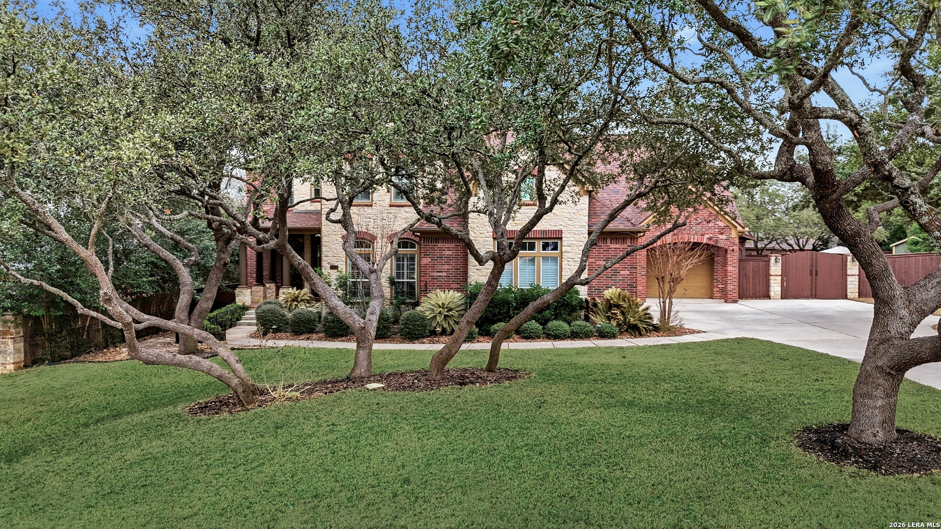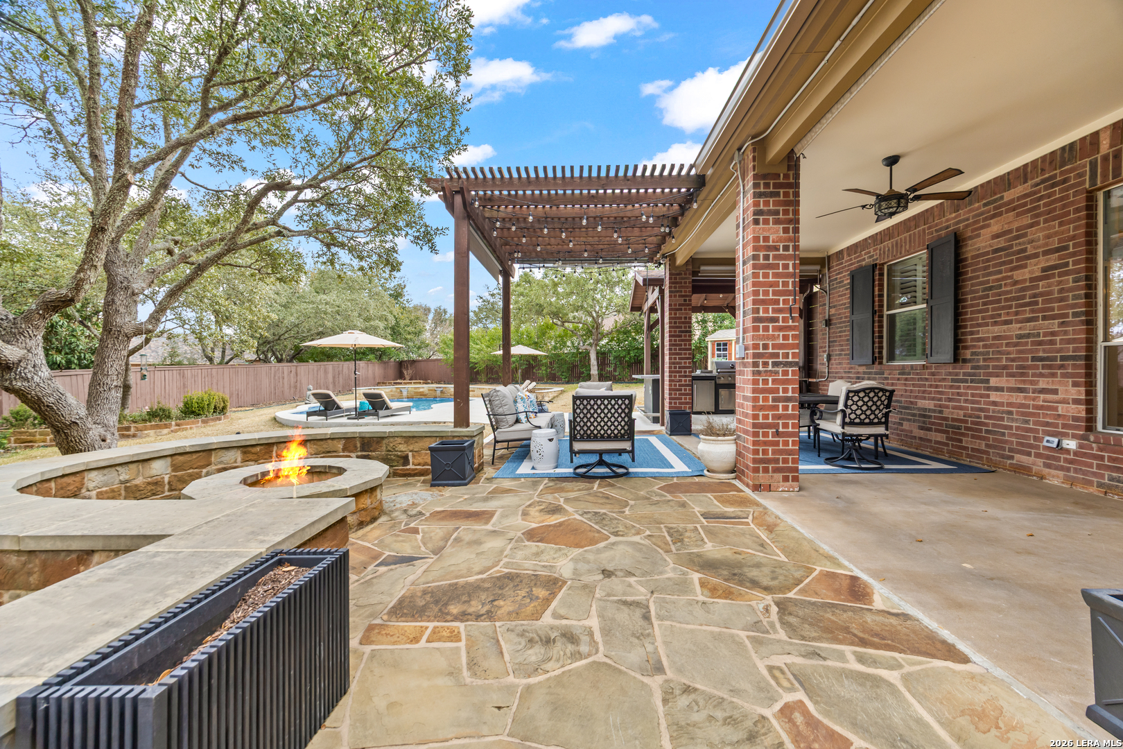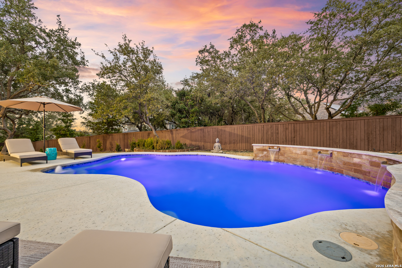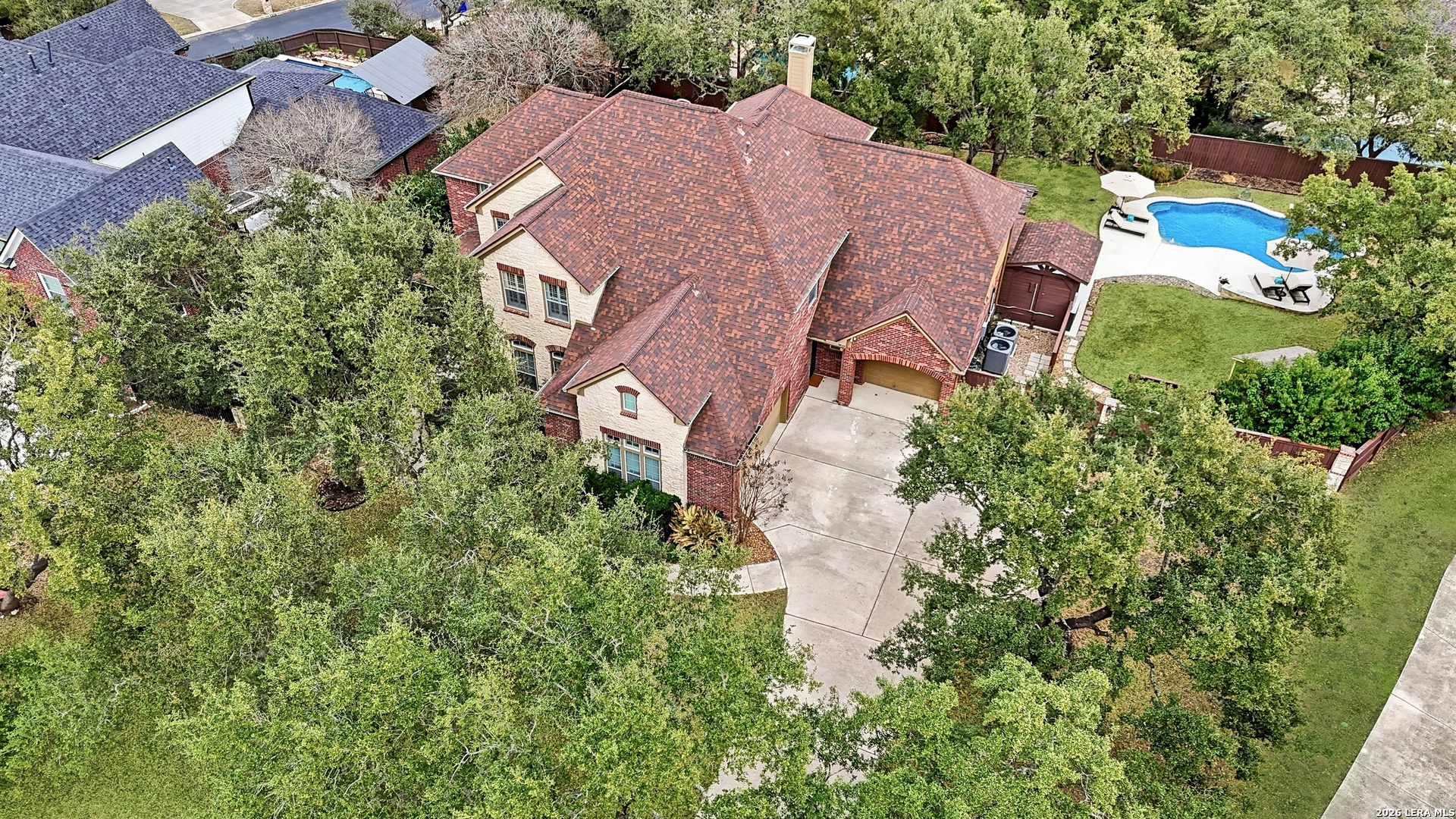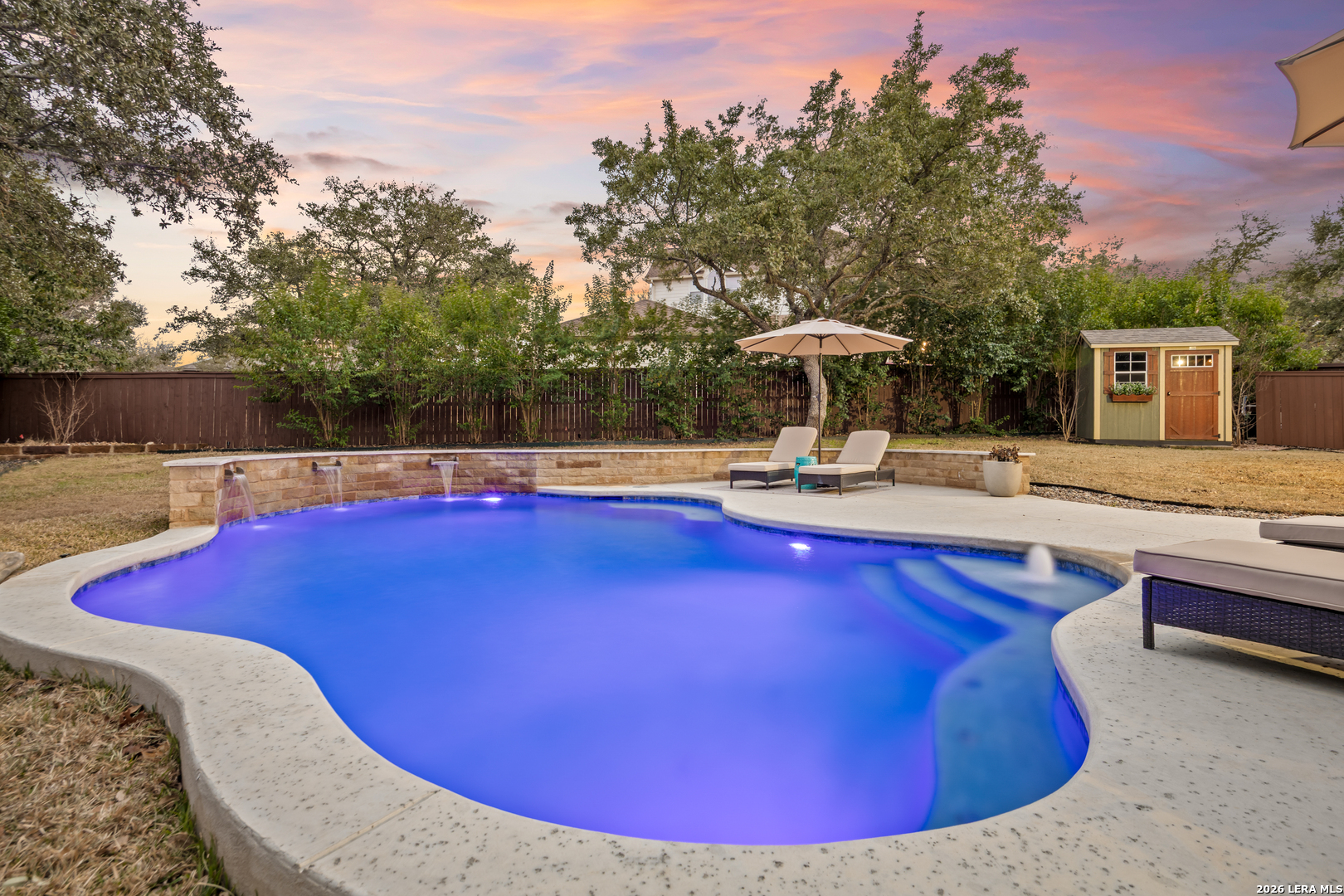 Nestled within the prestigious and tranquil community of The Woods at Fair Oaks Ranch, this impeccably maintained and thoughtfully updated residence offers a seamless blend of timeless elegance and modern luxury. Surrounded by mature trees and enhanced by classic plantation shutters, the home provides a private, welcoming retreat in one of the Hill Country's most desirable settings. At the heart of the home is a true chef's kitchen, beautifully designed for both everyday living and entertaining. Featuring ceiling-height custom cabinetry, a built-in coffee station with appliance garage, and premium Bosch appliances-including a microwave drawer, wall oven, dishwasher, refrigerator, and disposal-this space is as functional as it is stunning. A 36" six-burner Fulgor Milano range anchors the kitchen, complemented by an expansive granite island with pop-up electrical outlets and oversized storage drawers. Granite countertops and a marble backsplash extend into the butler's pantry, while a Kohler filtration system and walk-in pantry add convenience and thoughtful detail. Adjacent to the kitchen, the eat-in dining area is accented by a striking stone feature wall, creating warmth and architectural interest. Designed for effortless entertaining, the open-concept layout flows seamlessly into the main living areas. The living room showcases a dramatic stone fireplace, serving as a refined focal point. Brazilian cherry wood flooring enriches the study and formal dining area, currently styled as a sophisticated lounge. Additional enhancements include remote-controlled shades, Bali Roman shades, and a walk-in attic offering generous storage. The owner's suite is a serene sanctuary, highlighted by a spa-inspired bath with luxurious marble flooring. Upstairs, three spacious bedrooms, a built-in desk with bookshelves, a game room, and beautifully updated bathrooms provide ample space for work, relaxation, and play. Step outside to a private backyard oasis designed for year-round enjoyment. A brand-new heated pool, expansive covered patio, and newly constructed pergola create the ultimate outdoor entertaining space, complete with a built-in Paradise grill, TV, and refrigerator. Thoughtfully placed landscape lighting illuminates the mature trees and architectural elements, setting a stunning evening ambiance. Additional features include a third garage bay currently utilized as a mini gym and secondary home office (easily convertible back), a water softener, under-stair storage, and a full sprinkler system with drip irrigation for flower beds. A detailed list of recent upgrades-including new AC units, roof replacement, and more-is available in the additional documents. Ideally located in Fair Oaks Ranch, this home offers the best of Hill Country living with convenient access to upscale shopping, dining, and entertainment in Boerne and San Antonio. Residents enjoy scenic landscapes, miles of hiking trails, beautiful parks, top-rated schools, and membership opportunities at the renowned Fair Oaks Ranch Golf & Country Club. This exceptional home offers a rare combination of sophistication, comfort, and extensive modern updates-an extraordinary opportunity that must be experienced in person.
