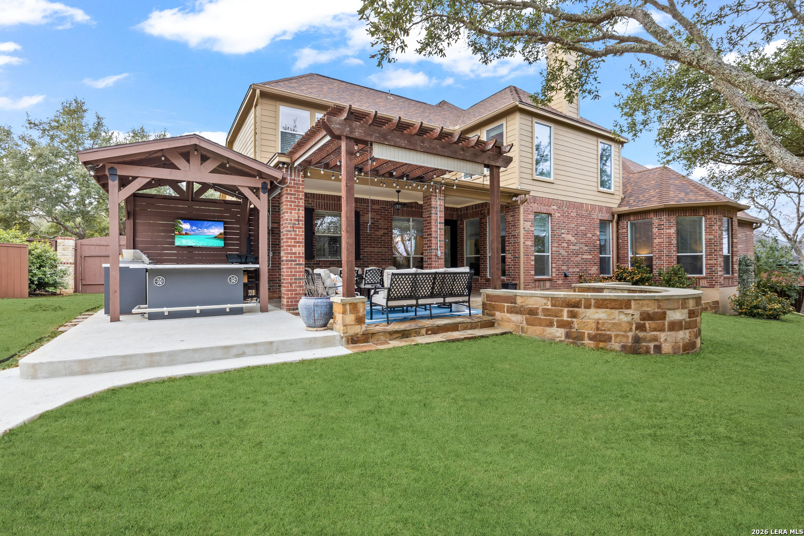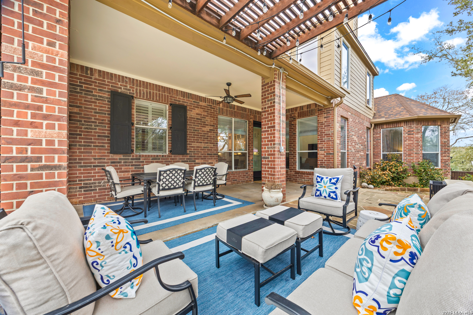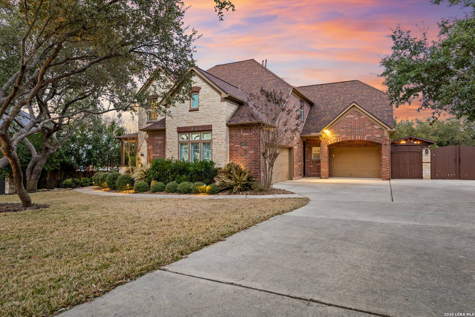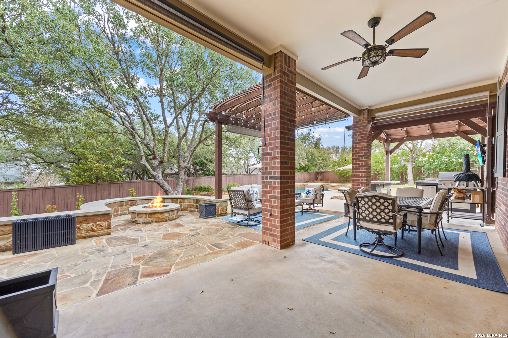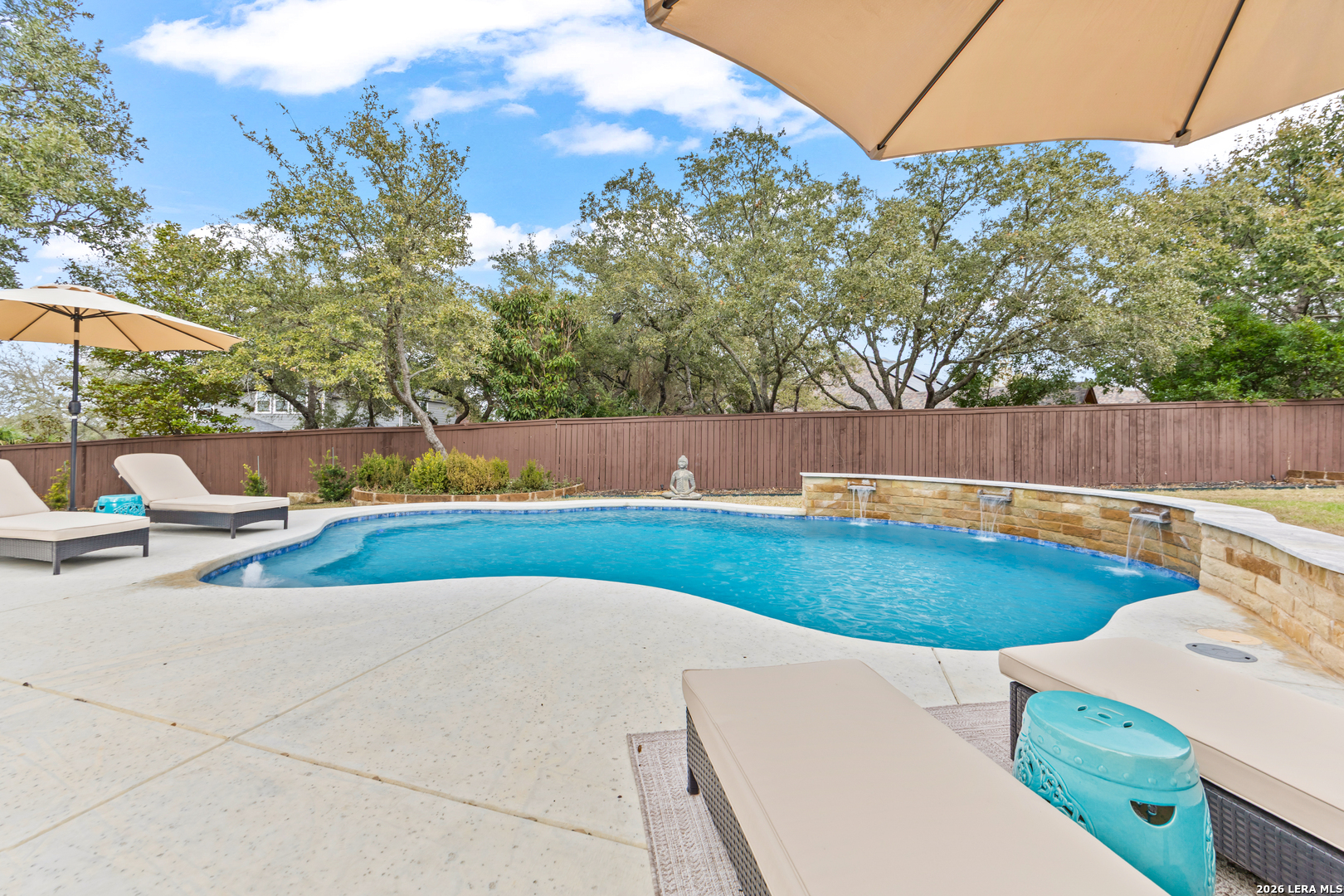 Nestled within the prestigious and tranquil community of The Woods at Fair Oaks Ranch, this impeccably maintained and thoughtfully updated residence offers a seamless blend of timeless elegance and modern luxury. Surrounded by mature trees and enhanced by classic plantation shutters, the home provides a private, welcoming retreat in one of the Hill Country's most desirable settings. At the heart of the home is a true chef's kitchen, beautifully designed for both everyday living and entertaining. Featuring ceiling-height custom cabinetry, a built-in coffee station with appliance garage, and premium Bosch appliances-including a microwave drawer, wall oven, dishwasher, refrigerator, and disposal-this space is as functional as it is stunning. A 36" six-burner Fulgor Milano range anchors the kitchen, complemented by an expansive granite island with pop-up electrical outlets and oversized storage drawers. Granite countertops and a marble backsplash extend into the butler's pantry, while a Kohler filtration system and walk-in pantry add convenience and thoughtful detail. Adjacent to the kitchen, the eat-in dining area is accented by a striking stone feature wall, creating warmth and architectural interest. Designed for effortless entertaining, the open-concept layout flows seamlessly into the main living areas. The living room showcases a dramatic stone fireplace, serving as a refined focal point. Brazilian cherry wood flooring enriches the study and formal dining area, currently styled as a sophisticated lounge. Additional enhancements include remote-controlled shades, Bali Roman shades, and a walk-in attic offering generous storage. The owner's suite is a serene sanctuary, highlighted by a spa-inspired bath with luxurious marble flooring. Upstairs, three spacious bedrooms, a built-in desk with bookshelves, a game room, and beautifully updated bathrooms provide ample space for work, relaxation, and play. Step outside to a private backyard oasis designed for year-round enjoyment. A brand-new heated pool, expansive covered patio, and newly constructed pergola create the ultimate outdoor entertaining space, complete with a built-in Paradise grill, TV, and refrigerator. Thoughtfully placed landscape lighting illuminates the mature trees and architectural elements, setting a stunning evening ambiance. Additional features include a third garage bay currently utilized as a mini gym and secondary home office (easily convertible back), a water softener, under-stair storage, and a full sprinkler system with drip irrigation for flower beds. A detailed list of recent upgrades-including new AC units, roof replacement, and more-is available in the additional documents. Ideally located in Fair Oaks Ranch, this home offers the best of Hill Country living with convenient access to upscale shopping, dining, and entertainment in Boerne and San Antonio. Residents enjoy scenic landscapes, miles of hiking trails, beautiful parks, top-rated schools, and membership opportunities at the renowned Fair Oaks Ranch Golf & Country Club. This exceptional home offers a rare combination of sophistication, comfort, and extensive modern updates-an extraordinary opportunity that must be experienced in person.