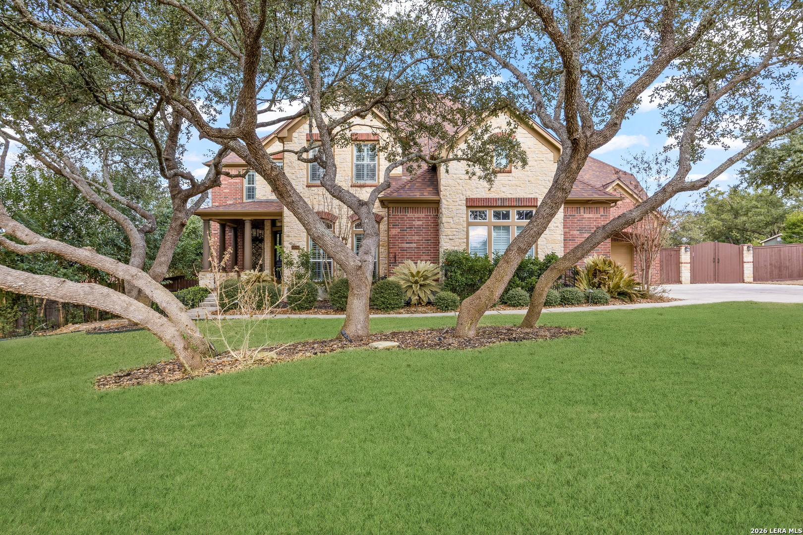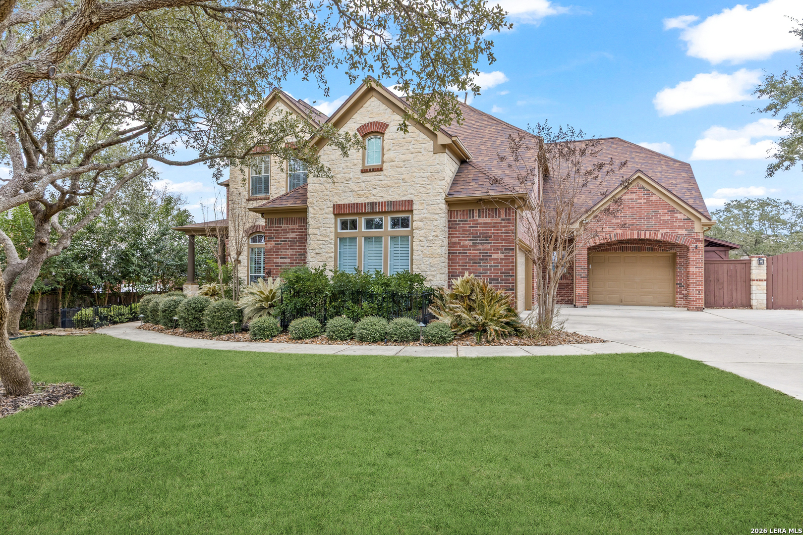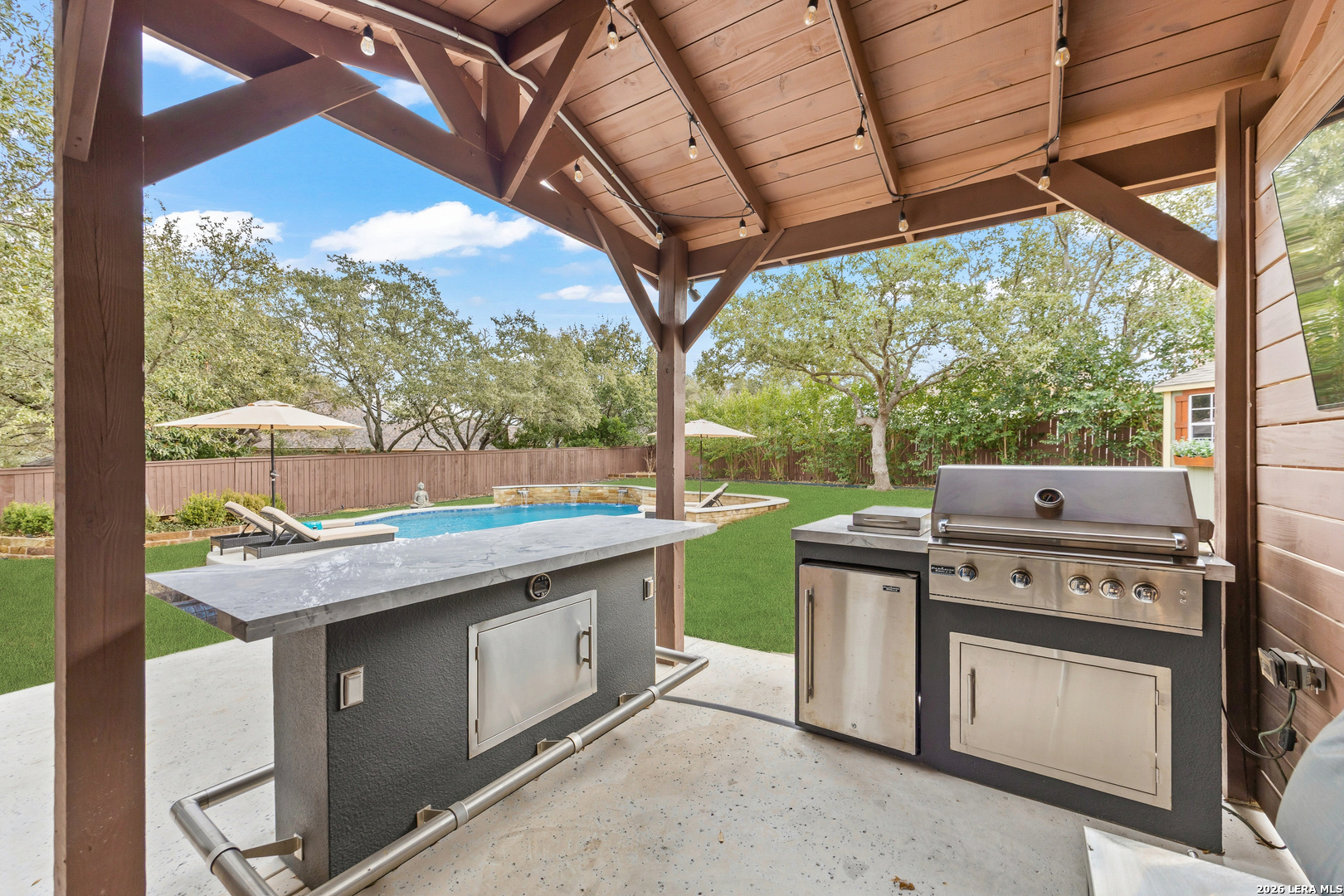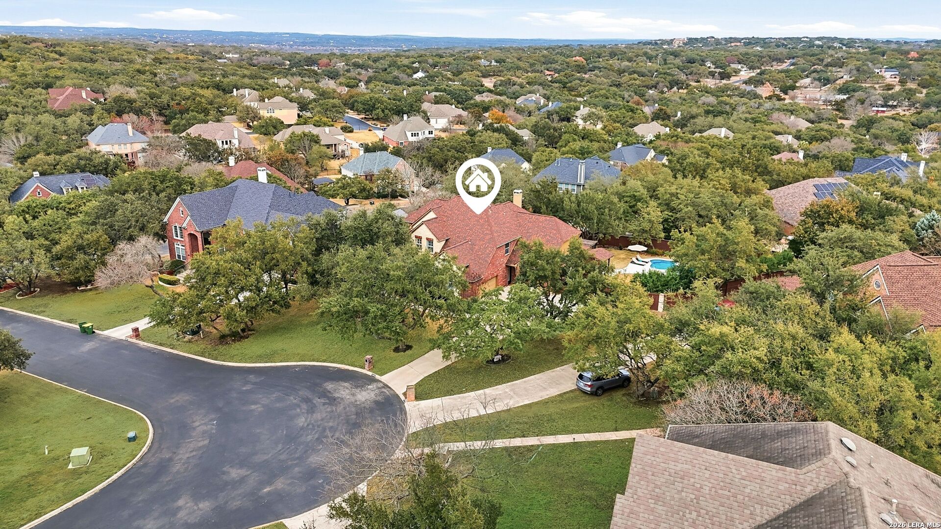 Nestled within the prestigious and tranquil community of The Woods at Fair Oaks Ranch, this impeccably maintained and thoughtfully updated residence offers a seamless blend of timeless elegance and modern luxury. Surrounded by mature trees and enhanced by classic plantation shutters, the home provides a private, welcoming retreat in one of the Hill Country's most desirable settings. At the heart of the home is a true chef's kitchen, beautifully designed for both everyday living and entertaining. Featuring ceiling-height custom cabinetry, a built-in coffee station with appliance garage, and premium Bosch appliances-including a microwave drawer, wall oven, dishwasher, refrigerator, and disposal-this space is as functional as it is stunning. A 36" six-burner Fulgor Milano range anchors the kitchen, complemented by an expansive granite island with pop-up electrical outlets and oversized storage drawers. Granite countertops and a marble backsplash extend into the butler's pantry, while a Kohler filtration system and walk-in pantry add convenience and thoughtful detail. Adjacent to the kitchen, the eat-in dining area is accented by a striking stone feature wall, creating warmth and architectural interest. Designed for effortless entertaining, the open-concept layout flows seamlessly into the main living areas. The living room showcases a dramatic stone fireplace, serving as a refined focal point. Brazilian cherry wood flooring enriches the study and formal dining area, currently styled as a sophisticated lounge. Additional enhancements include remote-controlled shades, Bali Roman shades, and a walk-in attic offering generous storage. The owner's suite is a serene sanctuary, highlighted by a spa-inspired bath with luxurious marble flooring. Upstairs, three spacious bedrooms, a built-in desk with bookshelves, a game room, and beautifully updated bathrooms provide ample space for work, relaxation, and play. Step outside to a private backyard oasis designed for year-round enjoyment. A brand-new heated pool, expansive covered patio, and newly constructed pergola create the ultimate outdoor entertaining space, complete with a built-in Paradise grill, TV, and refrigerator. Thoughtfully placed landscape lighting illuminates the mature trees and architectural elements, setting a stunning evening ambiance. Additional features include a third garage bay currently utilized as a mini gym and secondary home office (easily convertible back), a water softener, under-stair storage, and a full sprinkler system with drip irrigation for flower beds. A detailed list of recent upgrades-including new AC units, roof replacement, and more-is available in the additional documents. Ideally located in Fair Oaks Ranch, this home offers the best of Hill Country living with convenient access to upscale shopping, dining, and entertainment in Boerne and San Antonio. Residents enjoy scenic landscapes, miles of hiking trails, beautiful parks, top-rated schools, and membership opportunities at the renowned Fair Oaks Ranch Golf & Country Club. This exceptional home offers a rare combination of sophistication, comfort, and extensive modern updates-an extraordinary opportunity that must be experienced in person.