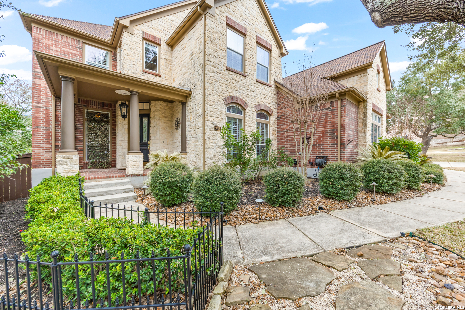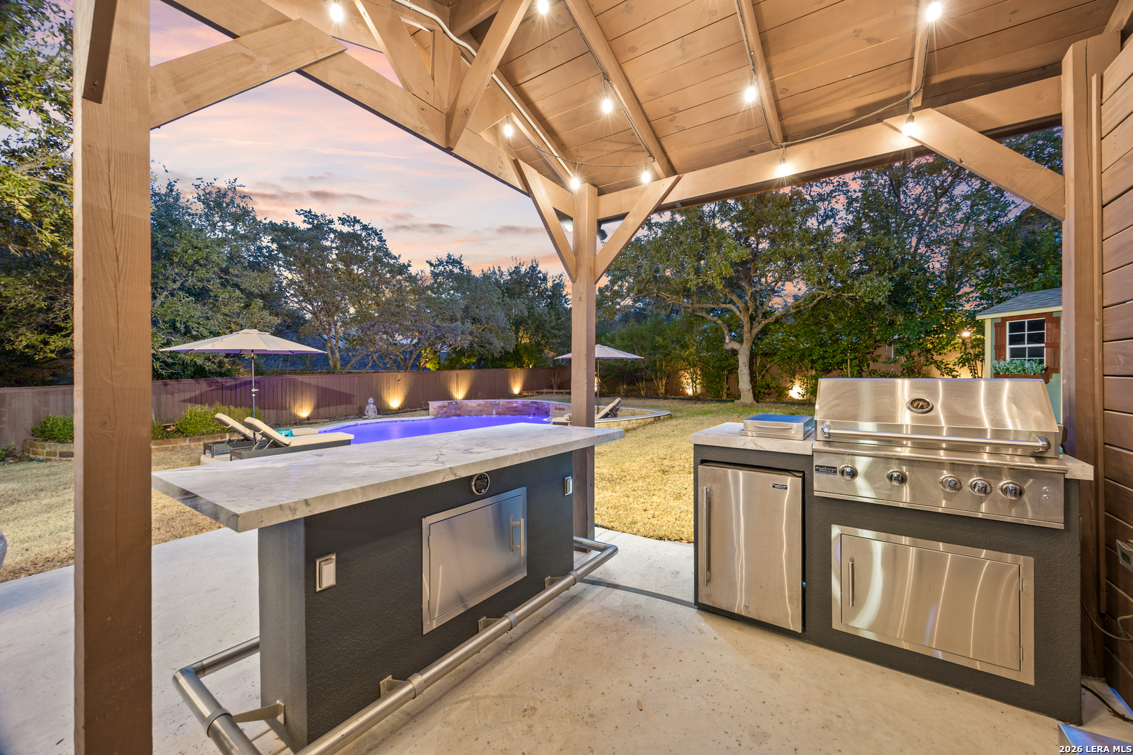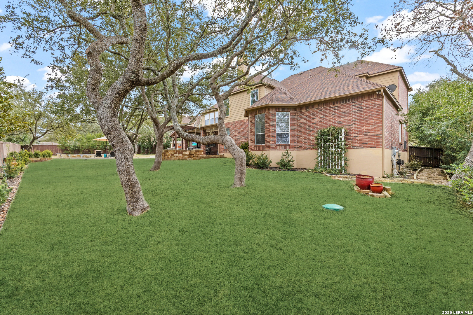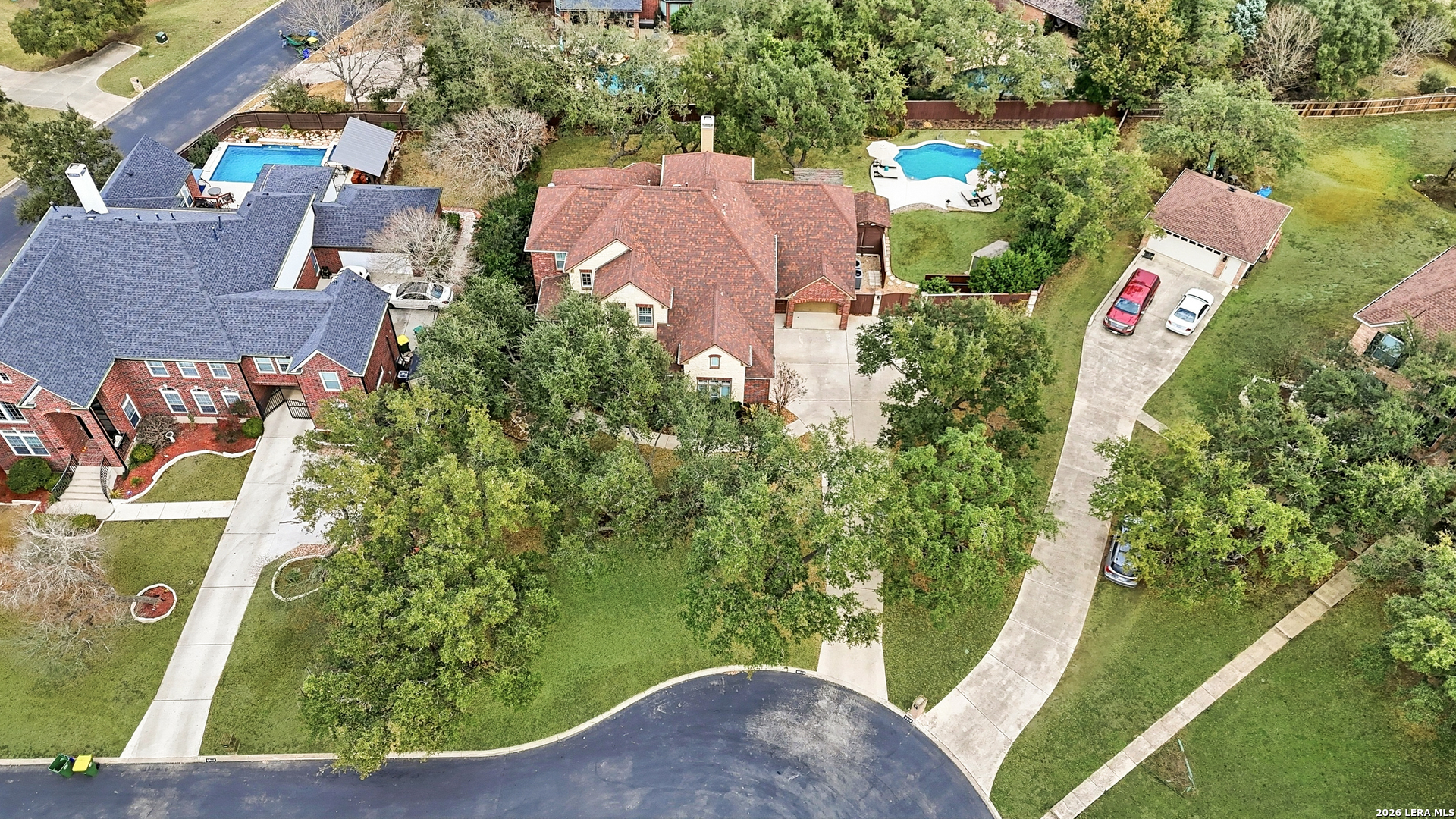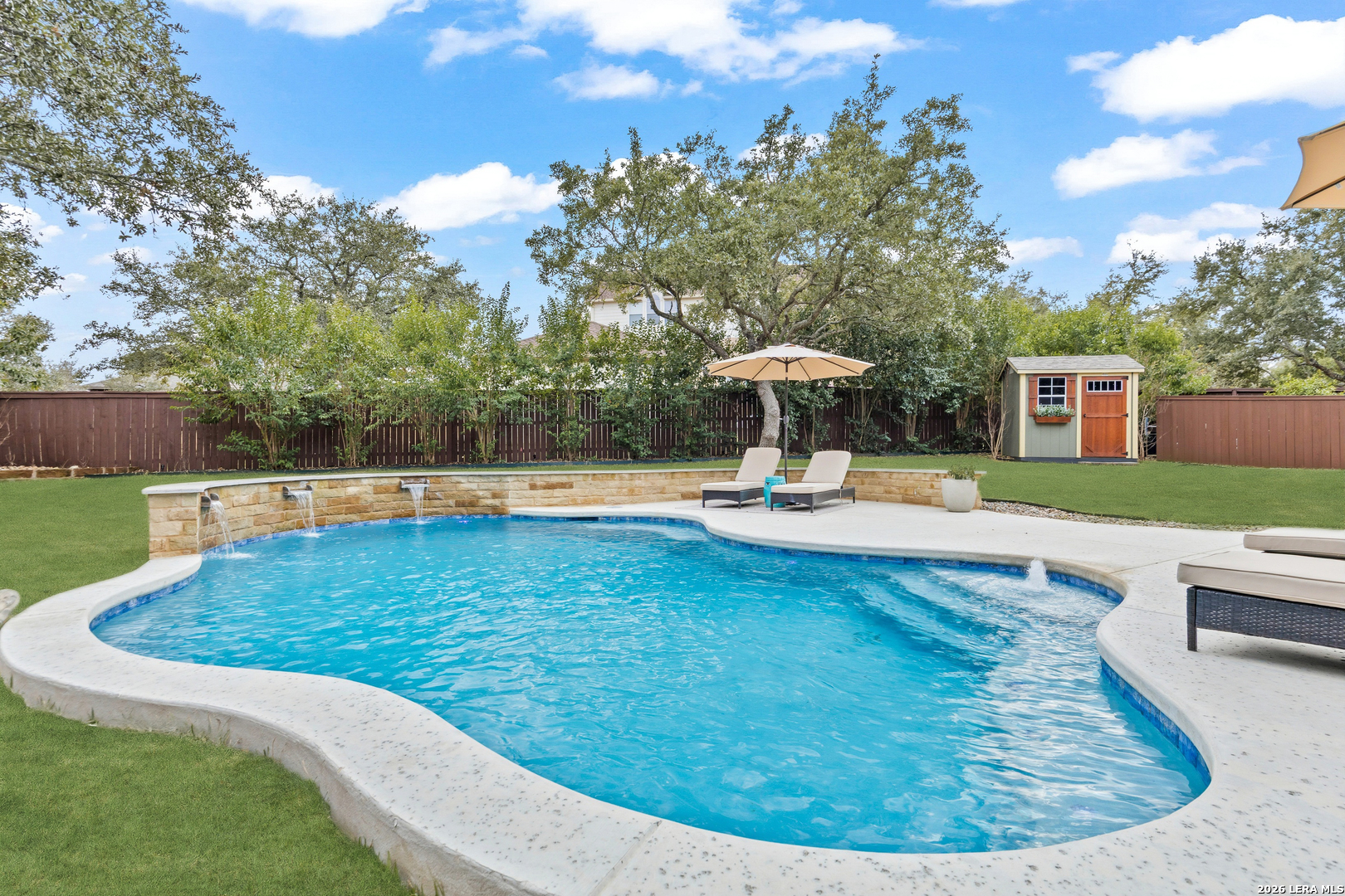 Nestled within the prestigious and tranquil community of The Woods at Fair Oaks Ranch, this impeccably maintained and thoughtfully updated residence offers a seamless blend of timeless elegance and modern luxury. Surrounded by mature trees and enhanced by classic plantation shutters, the home provides a private, welcoming retreat in one of the Hill Country's most desirable settings. At the heart of the home is a true chef's kitchen, beautifully designed for both everyday living and entertaining. Featuring ceiling-height custom cabinetry, a built-in coffee station with appliance garage, and premium Bosch appliances-including a microwave drawer, wall oven, dishwasher, refrigerator, and disposal-this space is as functional as it is stunning. A 36" six-burner Fulgor Milano range anchors the kitchen, complemented by an expansive granite island with pop-up electrical outlets and oversized storage drawers. Granite countertops and a marble backsplash extend into the butler's pantry, while a Kohler filtration system and walk-in pantry add convenience and thoughtful detail. Adjacent to the kitchen, the eat-in dining area is accented by a striking stone feature wall, creating warmth and architectural interest. Designed for effortless entertaining, the open-concept layout flows seamlessly into the main living areas. The living room showcases a dramatic stone fireplace, serving as a refined focal point. Brazilian cherry wood flooring enriches the study and formal dining area, currently styled as a sophisticated lounge. Additional enhancements include remote-controlled shades, Bali Roman shades, and a walk-in attic offering generous storage. The owner's suite is a serene sanctuary, highlighted by a spa-inspired bath with luxurious marble flooring. Upstairs, three spacious bedrooms, a built-in desk with bookshelves, a game room, and beautifully updated bathrooms provide ample space for work, relaxation, and play. Step outside to a private backyard oasis designed for year-round enjoyment. A brand-new heated pool, expansive covered patio, and newly constructed pergola create the ultimate outdoor entertaining space, complete with a built-in Paradise grill, TV, and refrigerator. Thoughtfully placed landscape lighting illuminates the mature trees and architectural elements, setting a stunning evening ambiance. Additional features include a third garage bay currently utilized as a mini gym and secondary home office (easily convertible back), a water softener, under-stair storage, and a full sprinkler system with drip irrigation for flower beds. A detailed list of recent upgrades-including new AC units, roof replacement, and more-is available in the additional documents. Ideally located in Fair Oaks Ranch, this home offers the best of Hill Country living with convenient access to upscale shopping, dining, and entertainment in Boerne and San Antonio. Residents enjoy scenic landscapes, miles of hiking trails, beautiful parks, top-rated schools, and membership opportunities at the renowned Fair Oaks Ranch Golf & Country Club. This exceptional home offers a rare combination of sophistication, comfort, and extensive modern updates-an extraordinary opportunity that must be experienced in person.