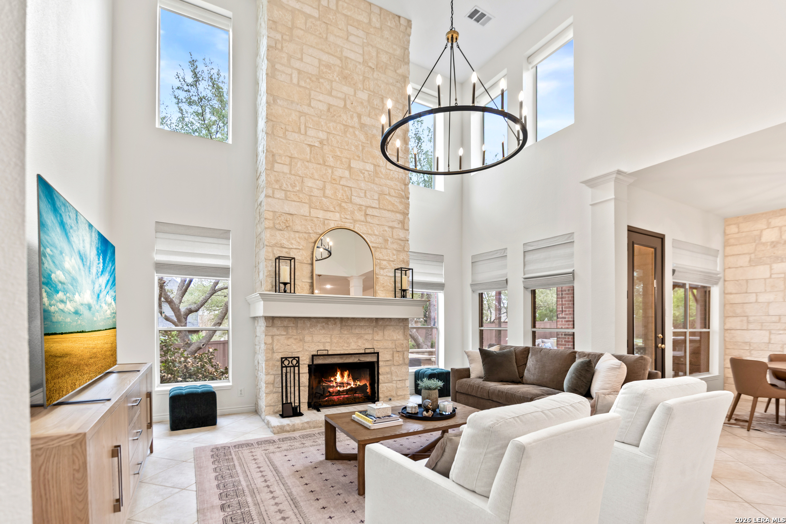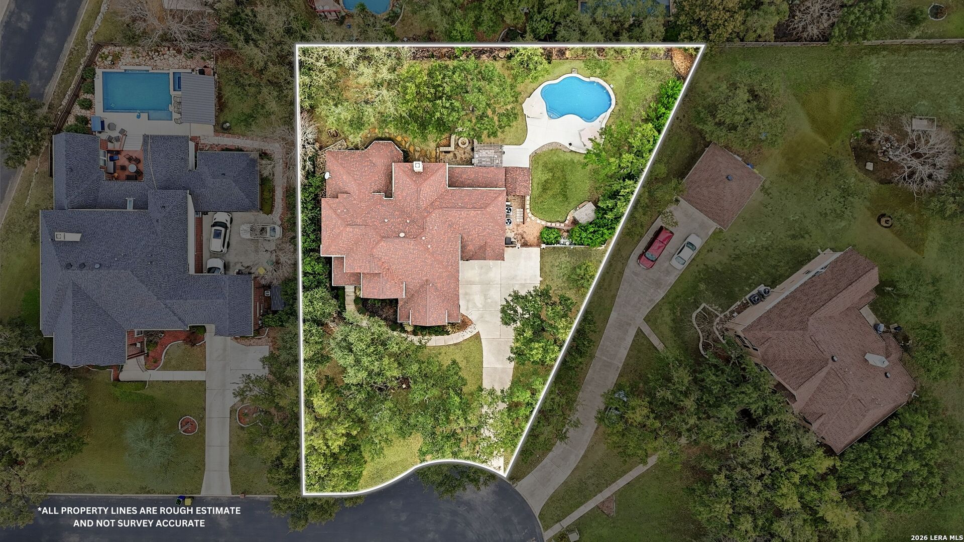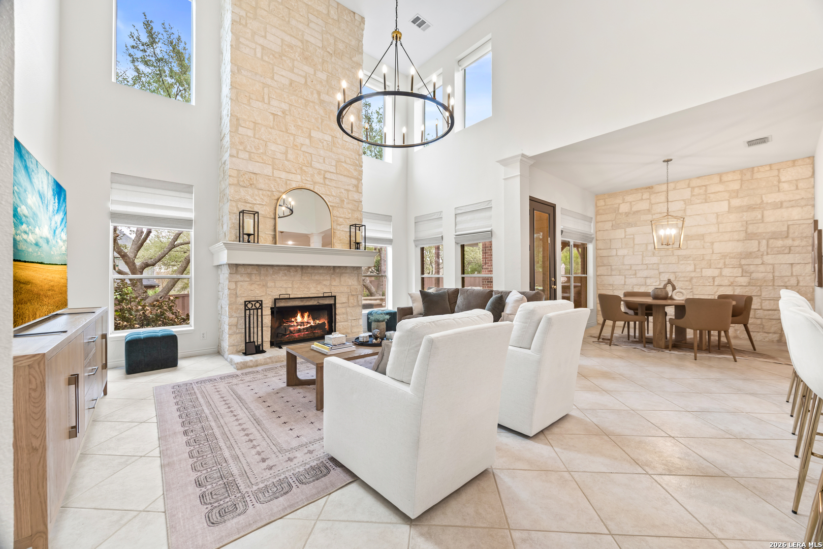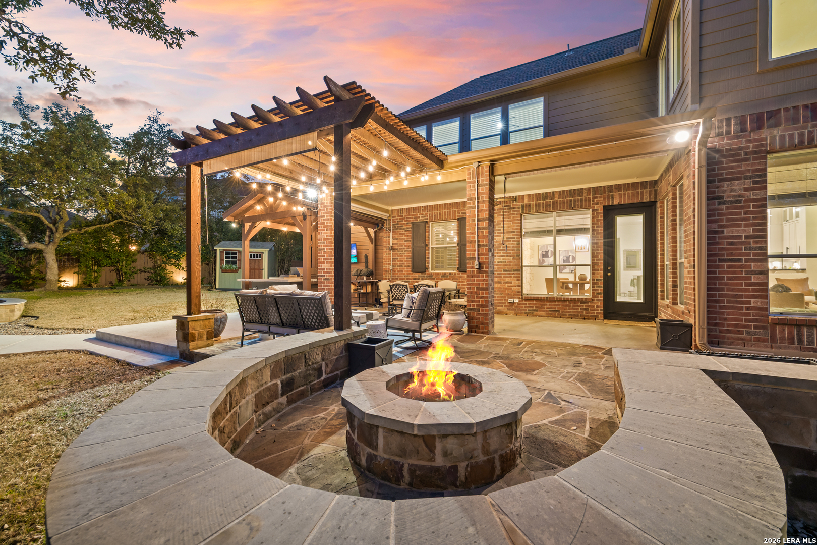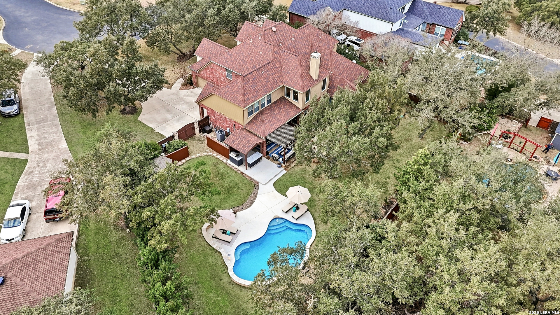 Nestled within the prestigious and tranquil community of The Woods at Fair Oaks Ranch, this impeccably maintained and thoughtfully updated residence offers a seamless blend of timeless elegance and modern luxury. Surrounded by mature trees and enhanced by classic plantation shutters, the home provides a private, welcoming retreat in one of the Hill Country's most desirable settings. At the heart of the home is a true chef's kitchen, beautifully designed for both everyday living and entertaining. Featuring ceiling-height custom cabinetry, a built-in coffee station with appliance garage, and premium Bosch appliances-including a microwave drawer, wall oven, dishwasher, refrigerator, and disposal-this space is as functional as it is stunning. A 36" six-burner Fulgor Milano range anchors the kitchen, complemented by an expansive granite island with pop-up electrical outlets and oversized storage drawers. Granite countertops and a marble backsplash extend into the butler's pantry, while a Kohler filtration system and walk-in pantry add convenience and thoughtful detail. Adjacent to the kitchen, the eat-in dining area is accented by a striking stone feature wall, creating warmth and architectural interest. Designed for effortless entertaining, the open-concept layout flows seamlessly into the main living areas. The living room showcases a dramatic stone fireplace, serving as a refined focal point. Brazilian cherry wood flooring enriches the study and formal dining area, currently styled as a sophisticated lounge. Additional enhancements include remote-controlled shades, Bali Roman shades, and a walk-in attic offering generous storage. The owner's suite is a serene sanctuary, highlighted by a spa-inspired bath with luxurious marble flooring. Upstairs, three spacious bedrooms, a built-in desk with bookshelves, a game room, and beautifully updated bathrooms provide ample space for work, relaxation, and play. Step outside to a private backyard oasis designed for year-round enjoyment. A brand-new heated pool, expansive covered patio, and newly constructed pergola create the ultimate outdoor entertaining space, complete with a built-in Paradise grill, TV, and refrigerator. Thoughtfully placed landscape lighting illuminates the mature trees and architectural elements, setting a stunning evening ambiance. Additional features include a third garage bay currently utilized as a mini gym and secondary home office (easily convertible back), a water softener, under-stair storage, and a full sprinkler system with drip irrigation for flower beds. A detailed list of recent upgrades-including new AC units, roof replacement, and more-is available in the additional documents. Ideally located in Fair Oaks Ranch, this home offers the best of Hill Country living with convenient access to upscale shopping, dining, and entertainment in Boerne and San Antonio. Residents enjoy scenic landscapes, miles of hiking trails, beautiful parks, top-rated schools, and membership opportunities at the renowned Fair Oaks Ranch Golf & Country Club. This exceptional home offers a rare combination of sophistication, comfort, and extensive modern updates-an extraordinary opportunity that must be experienced in person.
