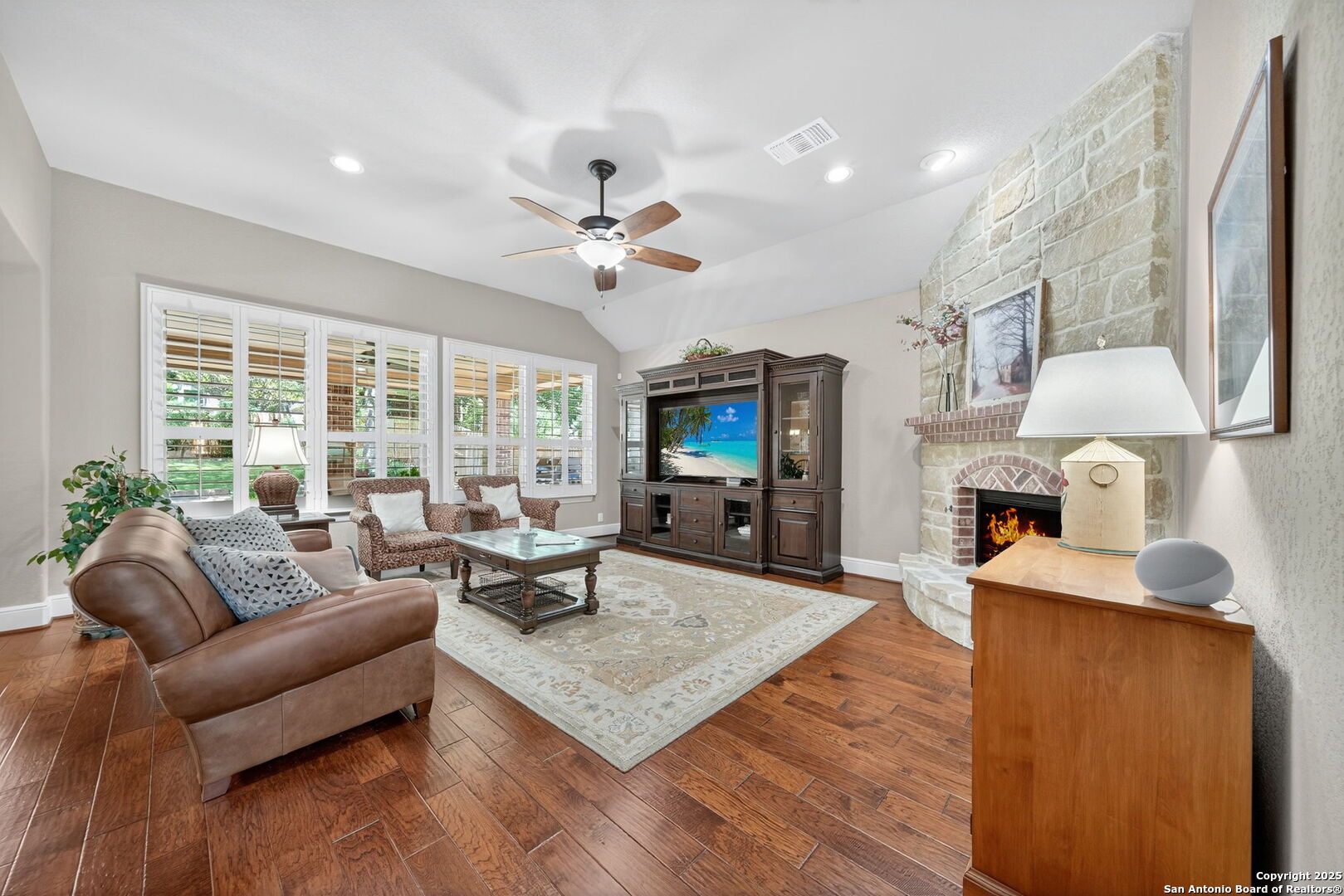 Welcome to this stunning, 4-bedroom, 3.5-bath Highland Home located in the highly sought-after River Rock Ranch subdivision. From the moment you step inside, you'll appreciate the gleaming hardwood floors that span the entire first level and the thoughtful layout designed for both comfort and functionality. Just off the entry, a private downstairs office offers the perfect space for remote work, studying, or quiet reading. The heart of the home is the spacious family room featuring a stone fireplace with gas logs, seamlessly connected to the open-concept kitchen-recently upgraded with a brand-new 5-burner cooktop (2025) and double wall oven (2025). Refrigerator, washer, dryer, and water softener are all included for added convenience. Upstairs, enjoy the flexibility of a large game room and separate media room, perfect for movie nights or gatherings. Three secondary bedrooms are thoughtfully placed for privacy, while the primary suite on the main level offers a tranquil retreat. Step outside to beautifully landscaped grounds with mature trees, north-south orientation, and a new fence installed in Nov 2024, offering both curb appeal and peace of mind. A new HVAC system (July 2025) ensures year-round comfort. Enjoy all the perks of River Rock Ranch's resort-style amenities, including a neighborhood pool, lazy river, clubhouse, shaded park, and fitness center-all with no city taxes! This meticulously maintained home is truly move-in ready. Schedule your private showing today and experience everything this exceptional property and community have to offer!