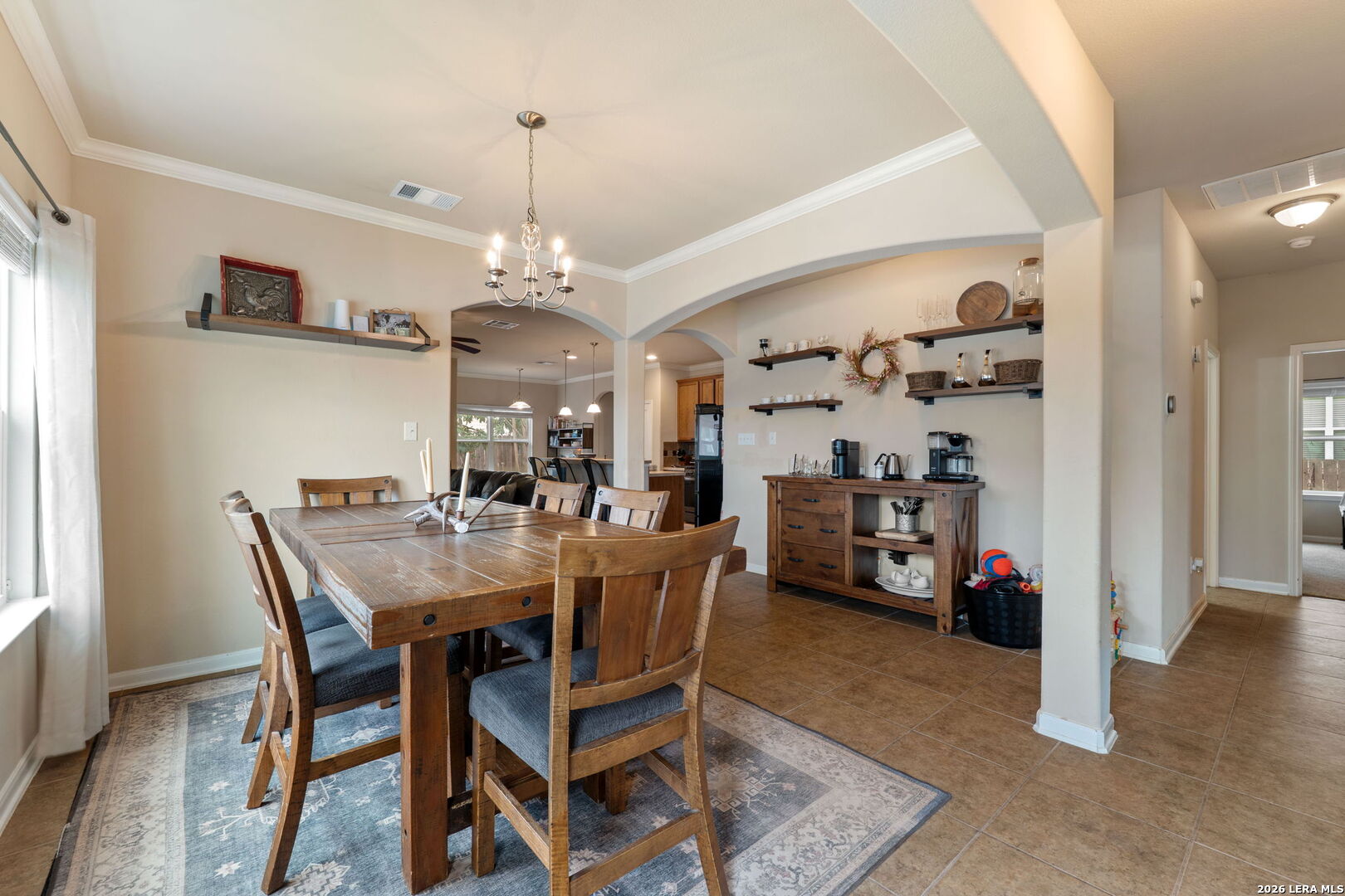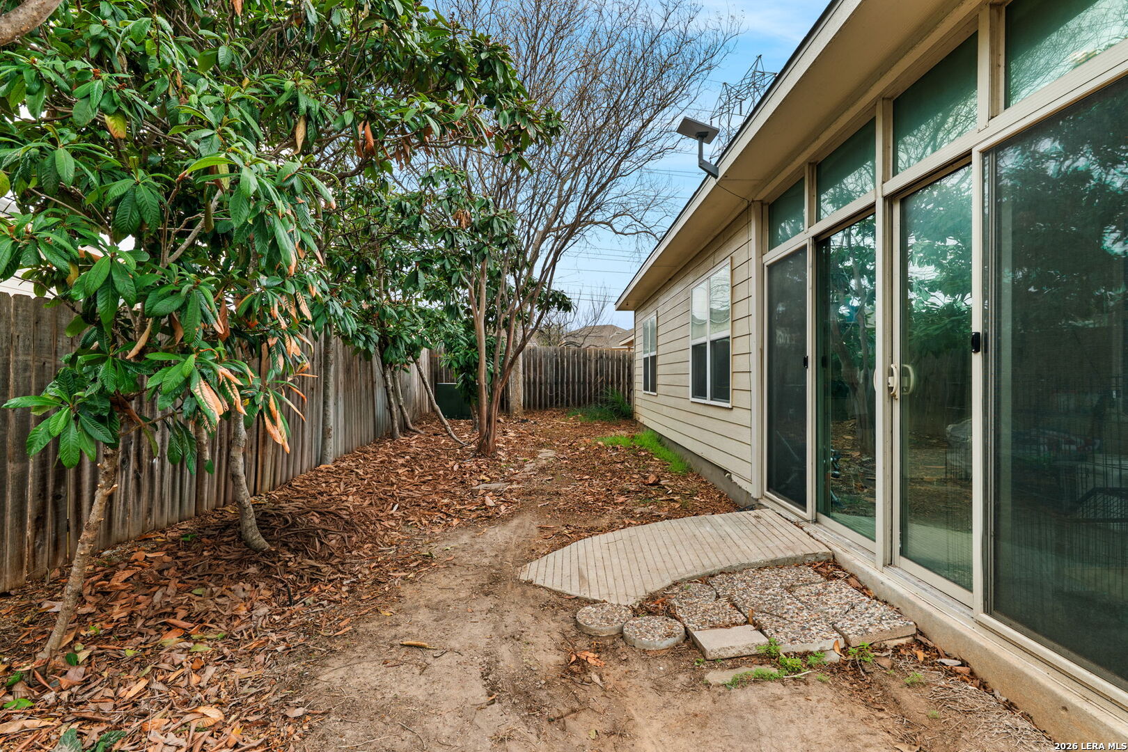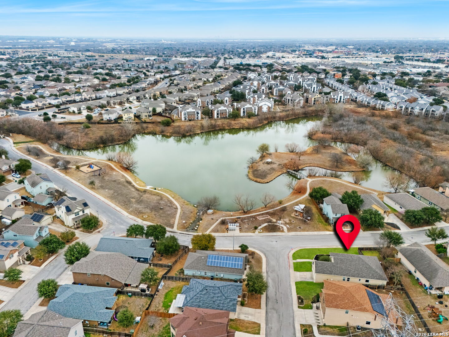 Beautifully maintained single story home situated on a spacious corner lot with lake views right across the street in San Antonio TX. This well designed 3 bedroom 2 bath home with flex room offers both comfort and versatility in a highly desirable setting. Inside, the entry creates a grand first impression and can easily serve as a formal dining space if desired. To the right, a private study enclosed with French doors provides an ideal work from home setup and enjoys peaceful views of the lake. The main living area feels open and inviting, offering plenty of room to relax or entertain. The open layout kitchen connects seamlessly to the living and breakfast areas and features abundant cabinetry, generous prep space, and modern appliances. The kitchen sink includes convenient accessories that convey, including a built in straining drying rack. Positioned toward the back of the home for added privacy, the primary suite offers a spacious retreat with a dual vanity, walk in closet, separate shower, and soaking tub designed for relaxation. Outdoors, the oversized backyard includes a sun room perfect for enjoying your morning coffee or evening wind down. The expansive green space provides room for gardening, entertaining, or simply enjoying the outdoors. Residents enjoy access to the neighborhood lake and a community garden that is part of the San Antonio Garden Network. With quick access to Loop 410 and Highway 151, commuting is convenient, and the home is just a short drive to Lackland Air Force Base and Chapman Training Annex, along with nearby shopping and dining options.
