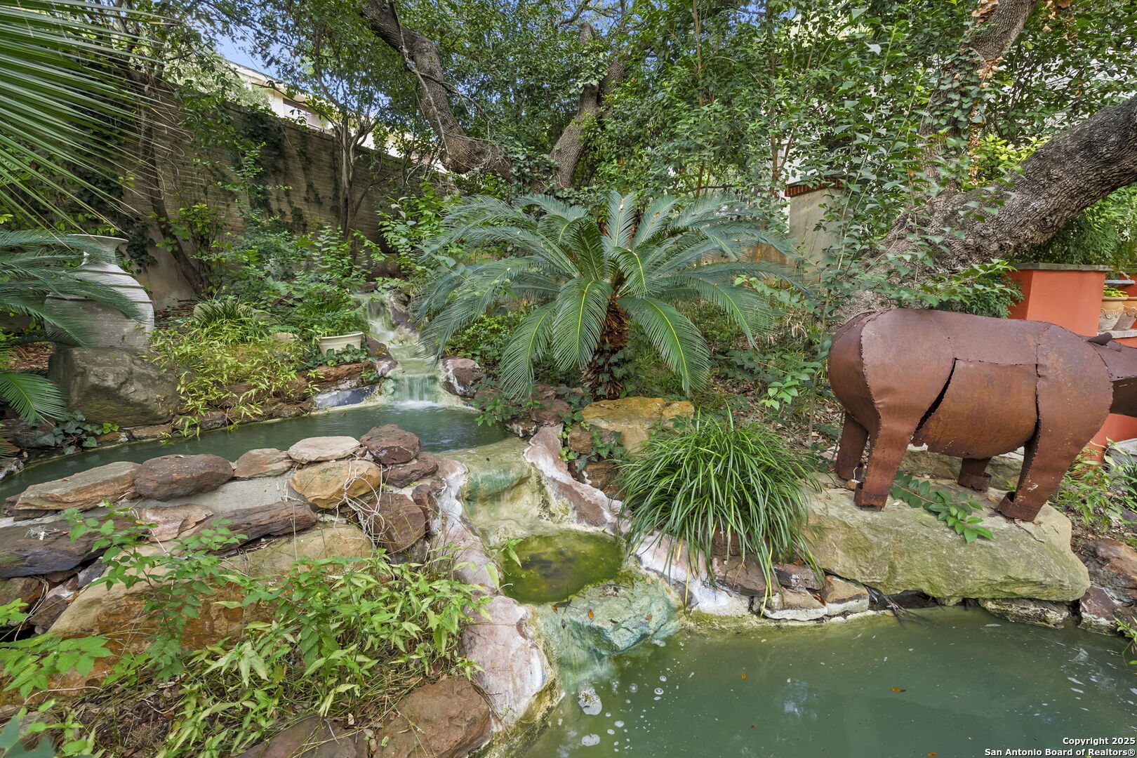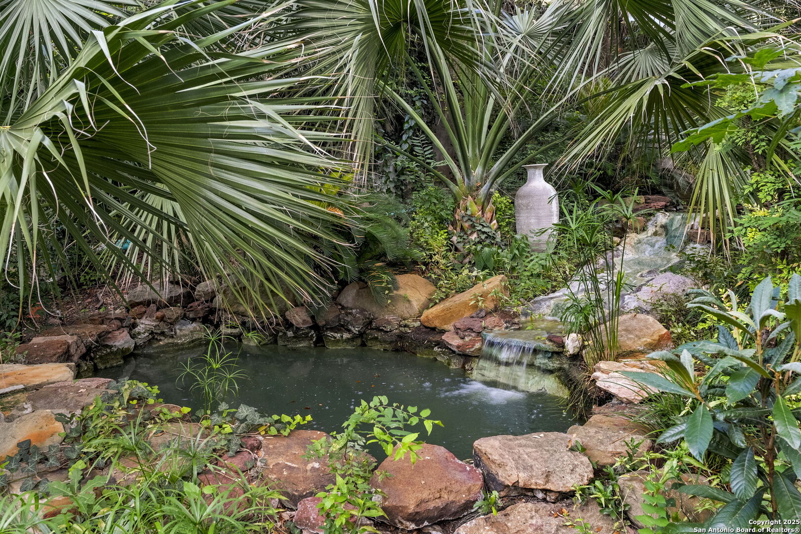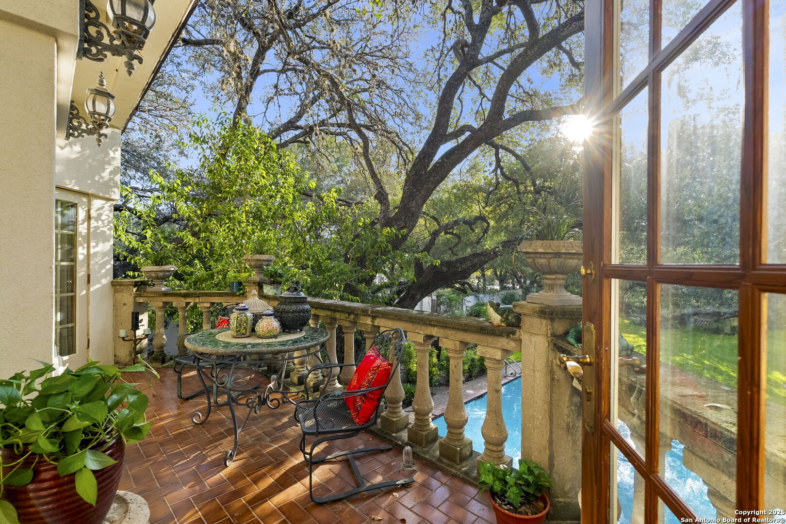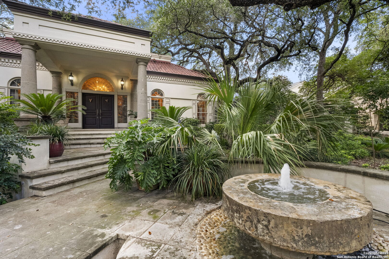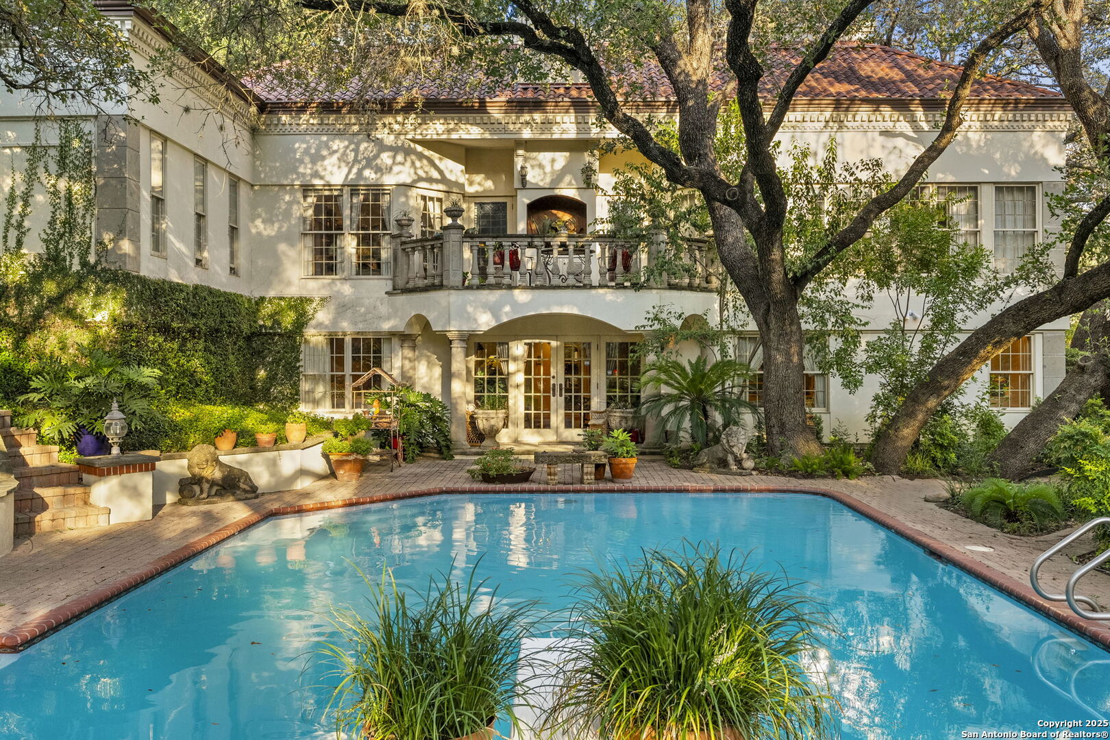 Welcome to a rare architectural gem nestled in the heart of the prestigious Marymont Subdivision. This distinguished estate blends timeless elegance with natural beauty, creating a tranquil retreat unlike any other. Set on an expansive 0.67-acre lot, this property offers unmatched privacy and a serene outdoor escape featuring lush landscaping, a sparkling pool, and a breathtaking four-tiered waterfall-your very own secluded oasis. Inside, the home is a showcase of sophisticated craftsmanship and old-world charm. From rich Italian marble flooring to handcrafted woodwork and vibrant Talavera tile throughout, every detail has been meticulously curated and maintained. Elegant Cantera columns frame the interiors, adding a touch of grandeur and warmth that elevates the living experience. The seamless indoor-outdoor connection is a standout feature. Whether you're enjoying a morning coffee from the kitchen, hosting from the den, or relaxing in the spacious Primary Suite, multiple access points to the balcony invite you to soak in the serene views and soft sounds of your private paradise. This fluid transition between interior and exterior living spaces enhances the home's charm and livability. Don't miss the opportunity to own this irreplaceable sanctuary that effortlessly blends refined luxury with natural beauty-where architecture and nature coexist in perfect harmony.