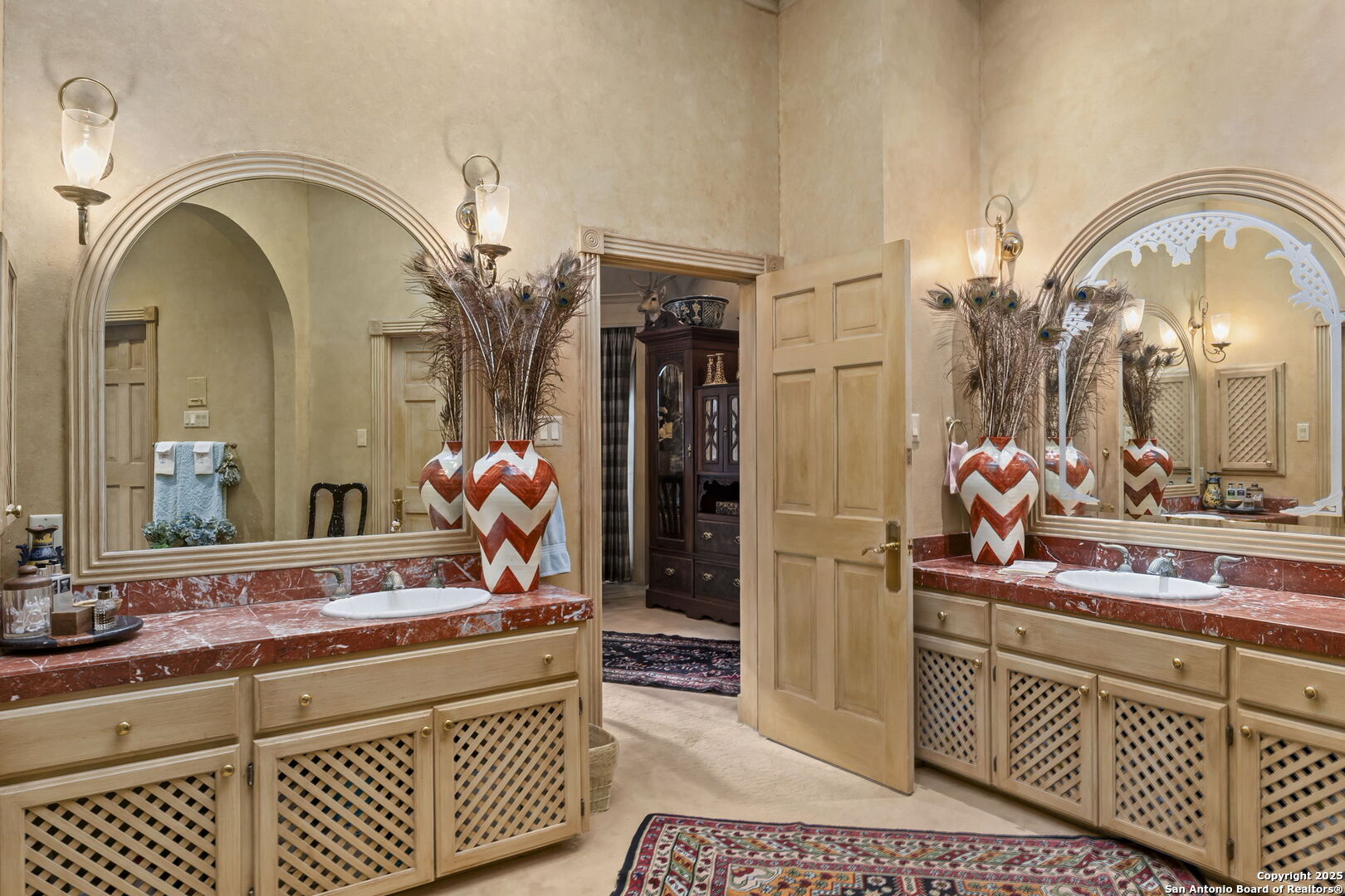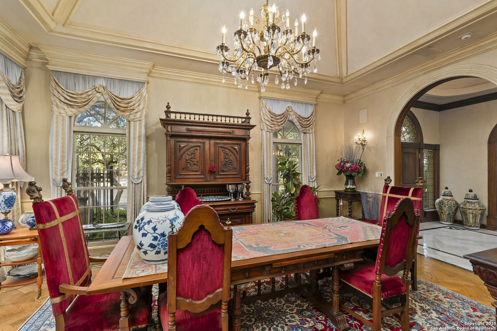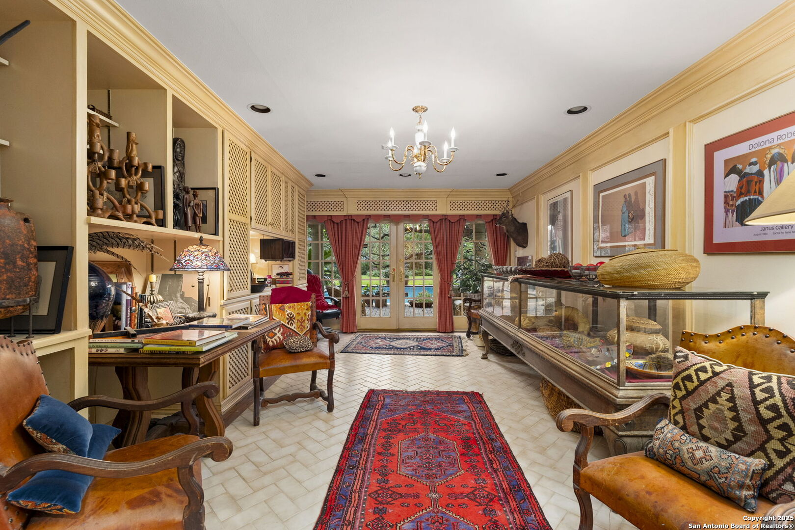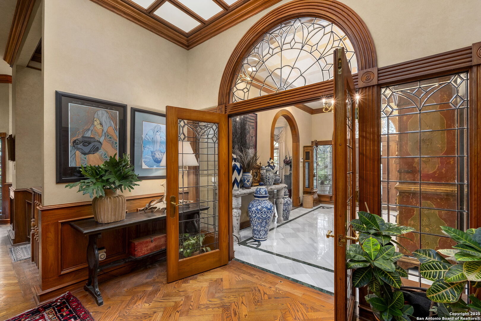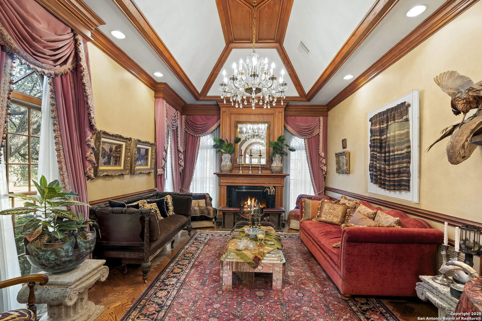 Welcome to a rare architectural gem nestled in the heart of the prestigious Marymont Subdivision. This distinguished estate blends timeless elegance with natural beauty, creating a tranquil retreat unlike any other. Set on an expansive 0.67-acre lot, this property offers unmatched privacy and a serene outdoor escape featuring lush landscaping, a sparkling pool, and a breathtaking four-tiered waterfall-your very own secluded oasis. Inside, the home is a showcase of sophisticated craftsmanship and old-world charm. From rich Italian marble flooring to handcrafted woodwork and vibrant Talavera tile throughout, every detail has been meticulously curated and maintained. Elegant Cantera columns frame the interiors, adding a touch of grandeur and warmth that elevates the living experience. The seamless indoor-outdoor connection is a standout feature. Whether you're enjoying a morning coffee from the kitchen, hosting from the den, or relaxing in the spacious Primary Suite, multiple access points to the balcony invite you to soak in the serene views and soft sounds of your private paradise. This fluid transition between interior and exterior living spaces enhances the home's charm and livability. Don't miss the opportunity to own this irreplaceable sanctuary that effortlessly blends refined luxury with natural beauty-where architecture and nature coexist in perfect harmony.