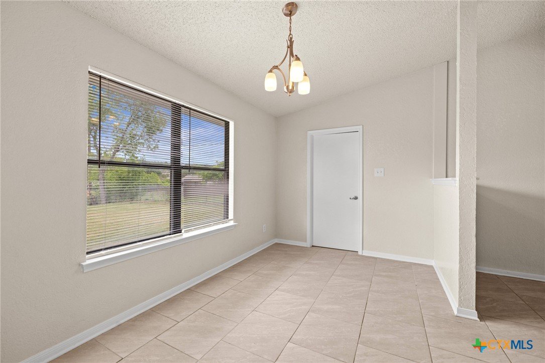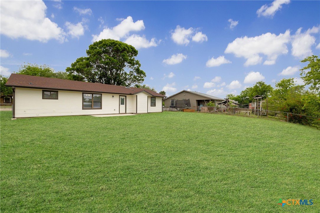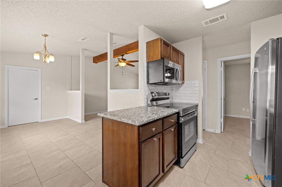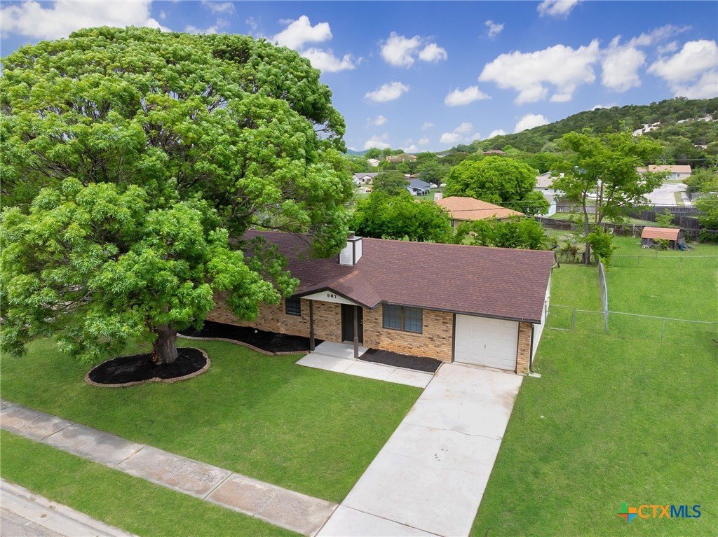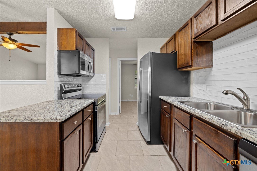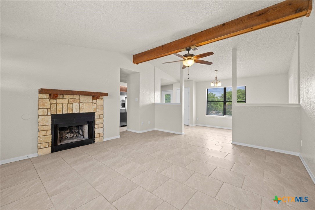 Beautifully refreshed 3-bedroom, 2-bath home offering comfort, style, and functionality throughout. Step into a spacious living room full of character, featuring a striking faux beam ceiling and a cozy wood-burning fireplace—perfect for relaxing or entertaining. The updated kitchen boasts brand new granite countertops, stainless steel appliances, ample cabinet space, and a seamless flow into the dedicated dining room, ideal for everyday living or hosting gatherings. Enjoy ceramic tile flooring throughout for durability and easy maintenance, along with fresh interior and exterior paint and updated light fixtures that create a bright, modern feel. The primary suite provides a comfortable retreat, while both bathrooms include shower/tub combos with single vanities. Additional features include an indoor laundry room with washer and dryer connections, a 1-car garage, and a one-sided brick exterior for added curb appeal. Step outside to a huge backyard with endless possibilities—perfect for entertaining, pets, or enjoying peaceful Texas evenings.