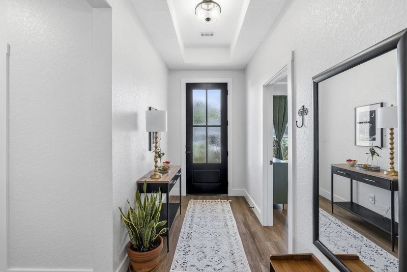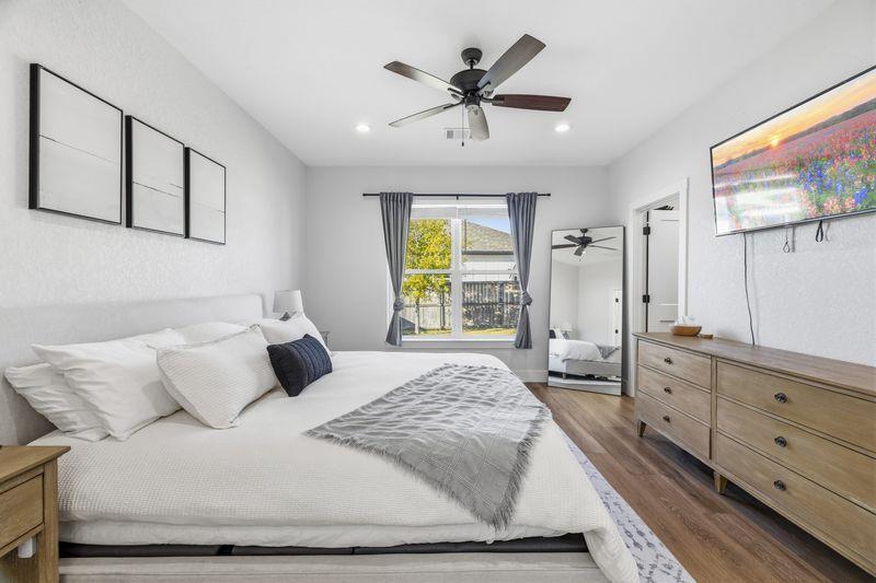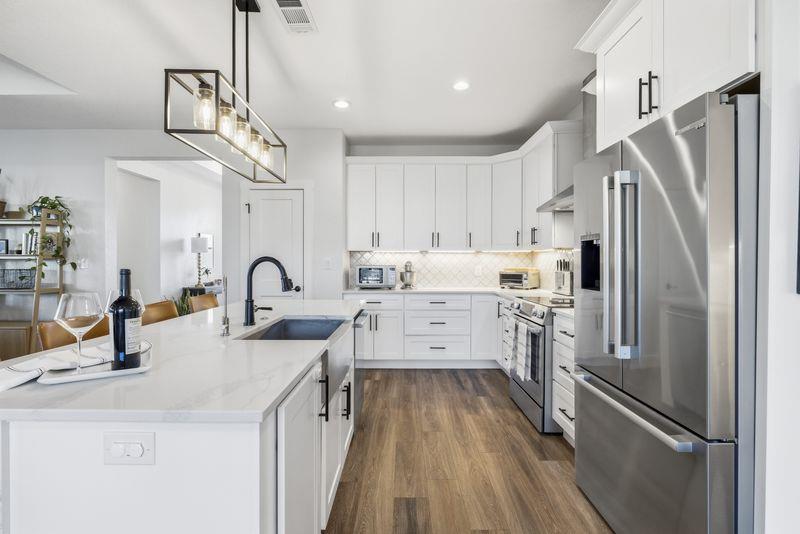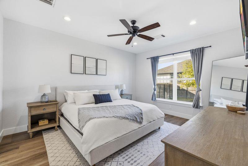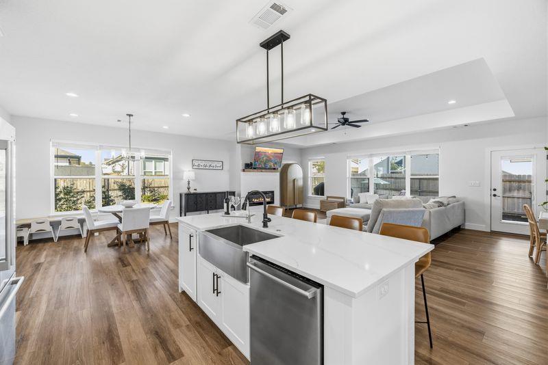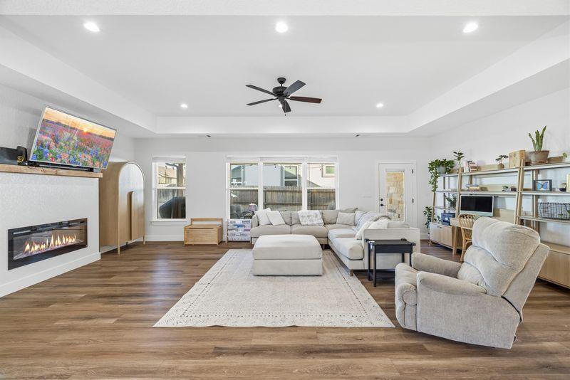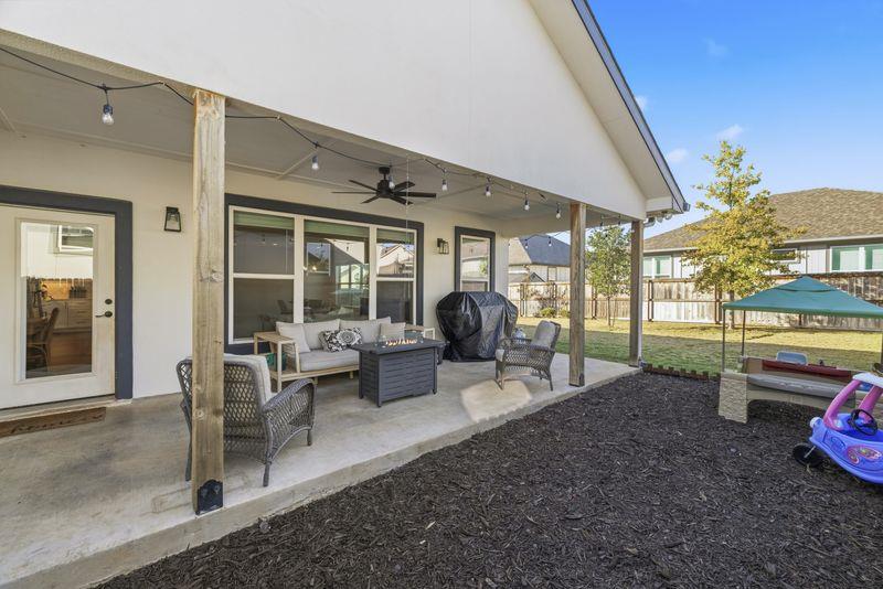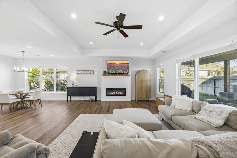 Beautiful home freshly painted with updated landscaping! Built in 2022, this stunning 3-bedroom, 2-bath home offers a spacious open floor plan designed for comfort and entertaining. The large kitchen island, quartz countertops, tile backsplash, and convenient butler's pantry make the kitchen a true showpiece. Relax in the open living area featuring an electric fireplace with heatilator and windows adding natural light. The primary suite provides a private retreat with a luxurious bathroom that includes a soaking tub, walk-in shower, double vanity, walk-in closet, and abundant storage. Stylish, low-maintenance flooring with the look of wood flows throughout—perfect for families and pets alike. Enjoy peaceful mornings or unwind after a long day on the charming covered porches in the front or back yard overlooking the beautifully landscaped yard. This home blends beauty, functionality, and comfort—ready for you to move right in and make it your own!
