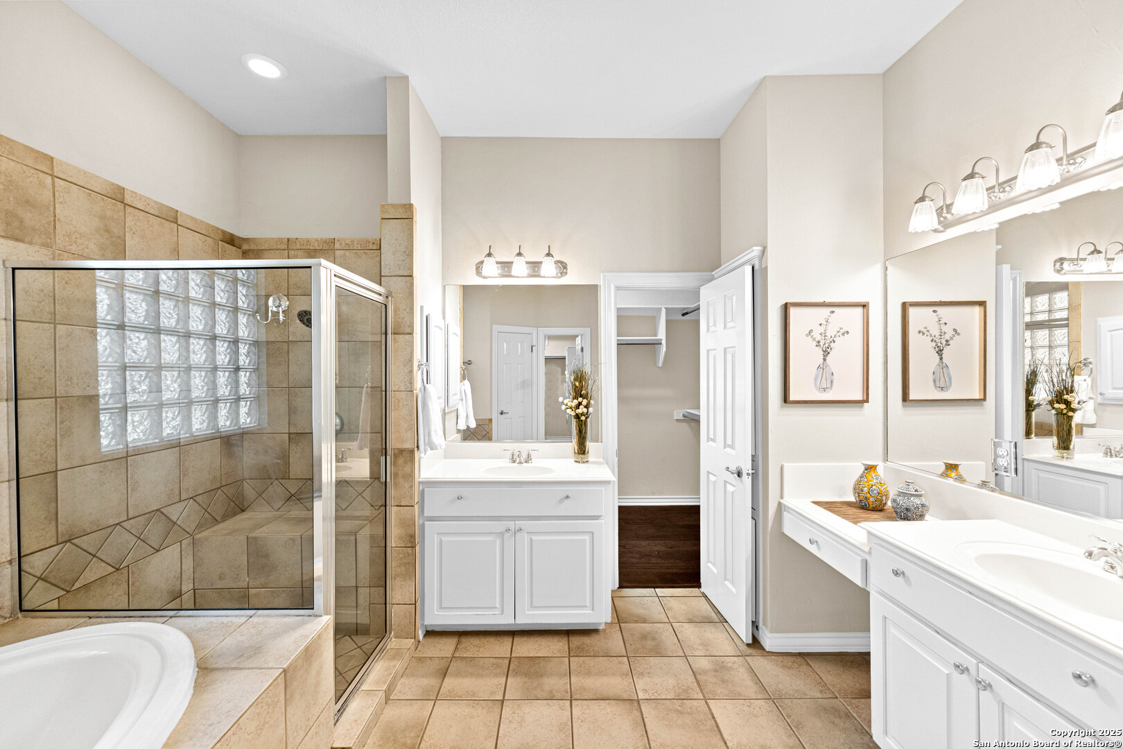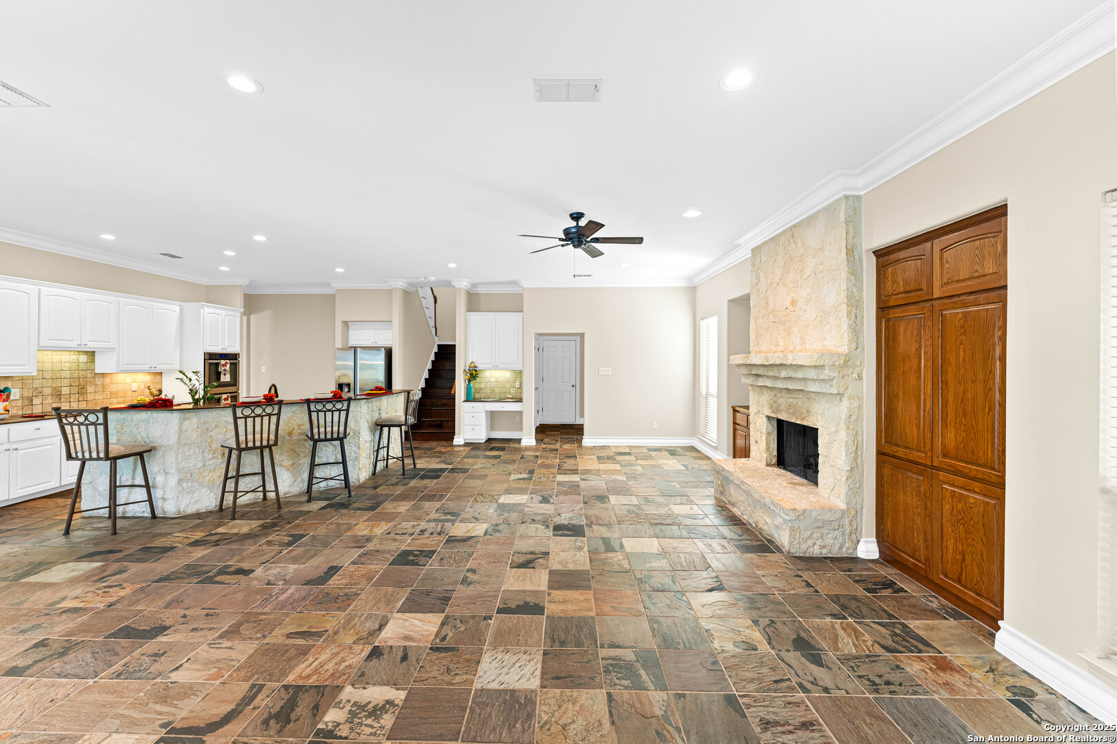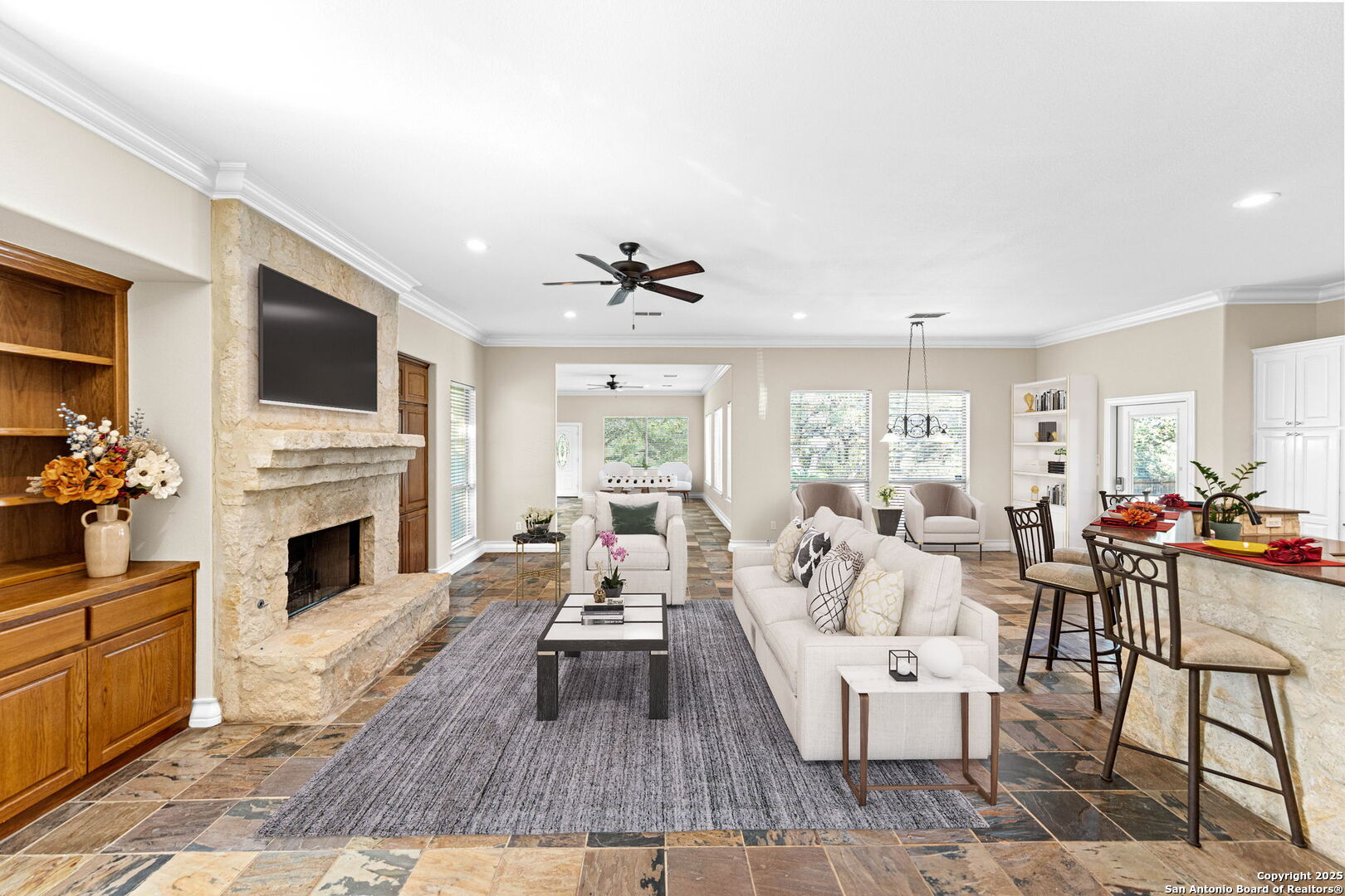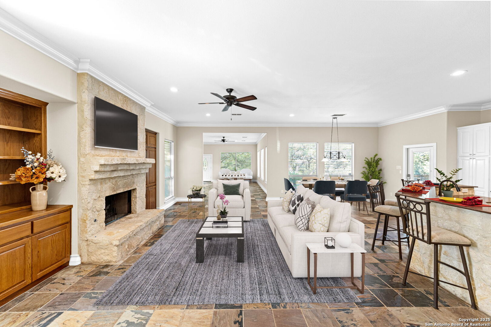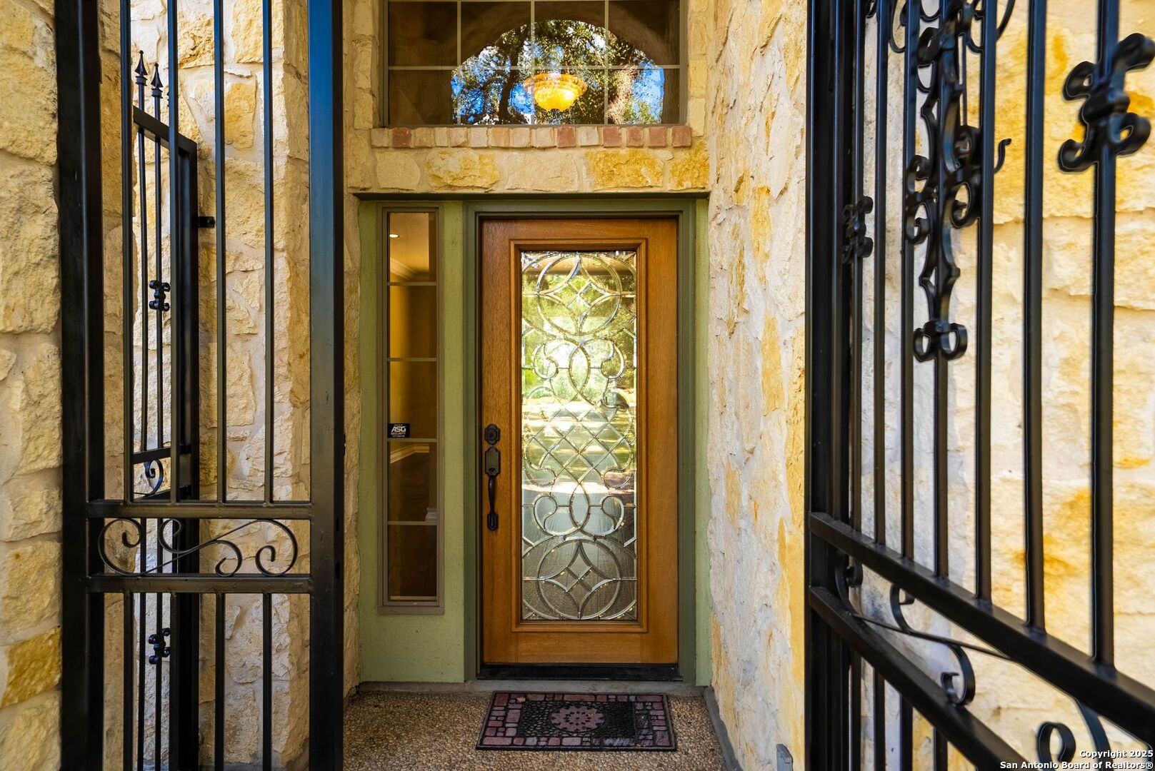 Custom home by Mann Custom Homes. Located in The Forest of Stone Oak sitting on .86 acres which backs up to a dense wooded area. The outdoor area is a true paradise with a pool and spa surrounded by mature trees. The interior, features an open concept where the kitchen opens to a reading area with a fireplace, breakfast area, and family room all of which features slate tile flooring. The flooring in the remainder of the home is Hand-scraped & Distressed Hickory-hardwood. As you enter the home you are located in second living room looking through oversized windows which overlook a parklike, outdoor paradise. The home is roughly 4272 s.f., and features 4 bedrooms, 3.5 bath, a Study, 2 Living rooms, 2 Game rooms-1 upstairs, along with 3 bedrooms. The kitchen offers custom cabinets, granite countertops, double ovens and SS appliances. This amazing space can accommodate a family of all sizes, is perfect for entertaining, and Work-from-Home space for a number of people. Enjoy the privacy of this home yet minutes from school, shopping, and outdoors adventures and entertainment. In addition, you are only 30 minutes from downtown where you find yourself strolling the Historic areas of San Antonio and the Riverwalk.