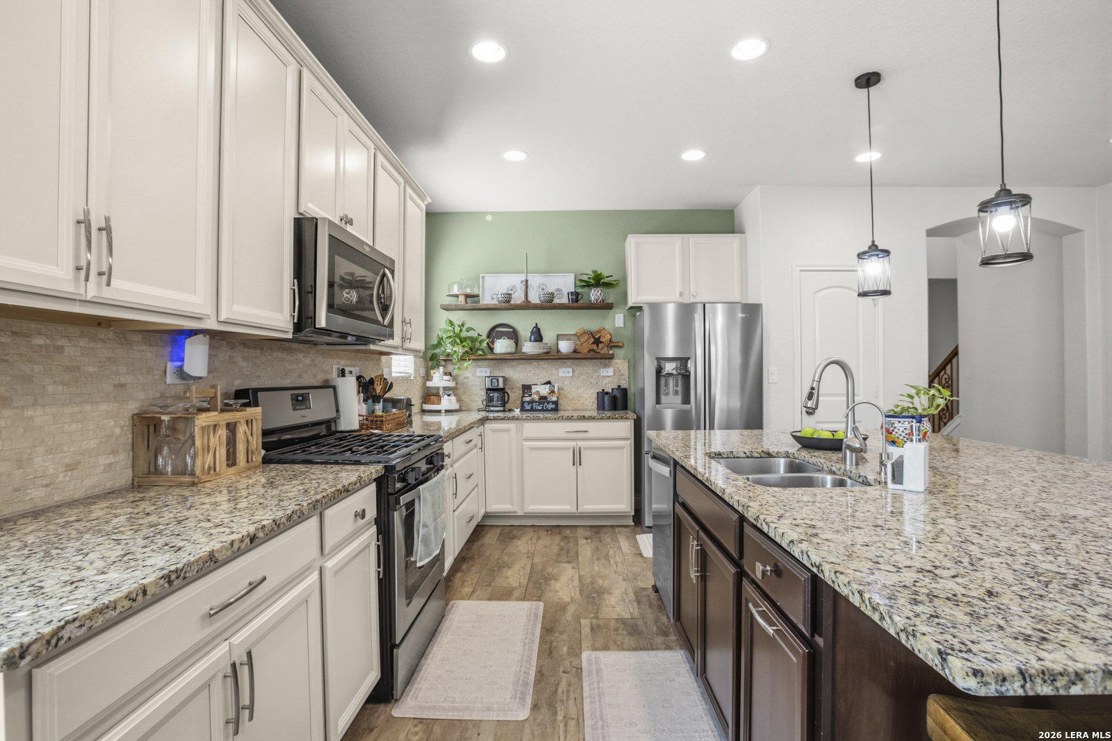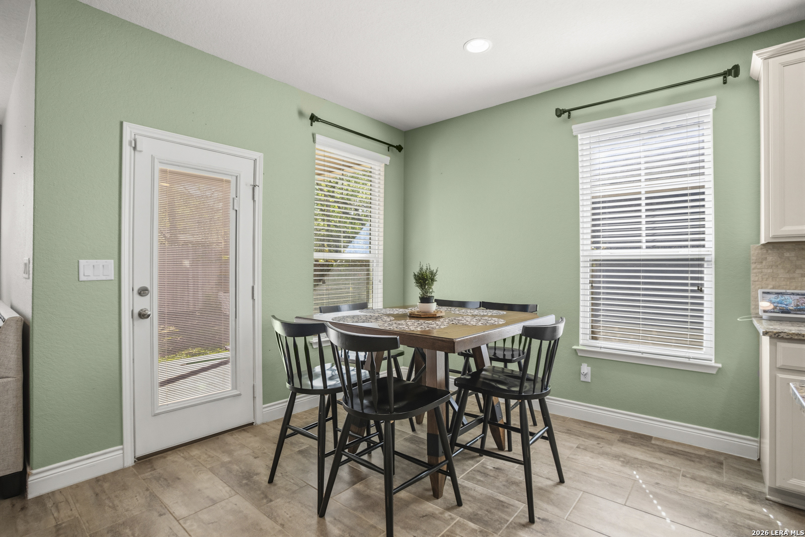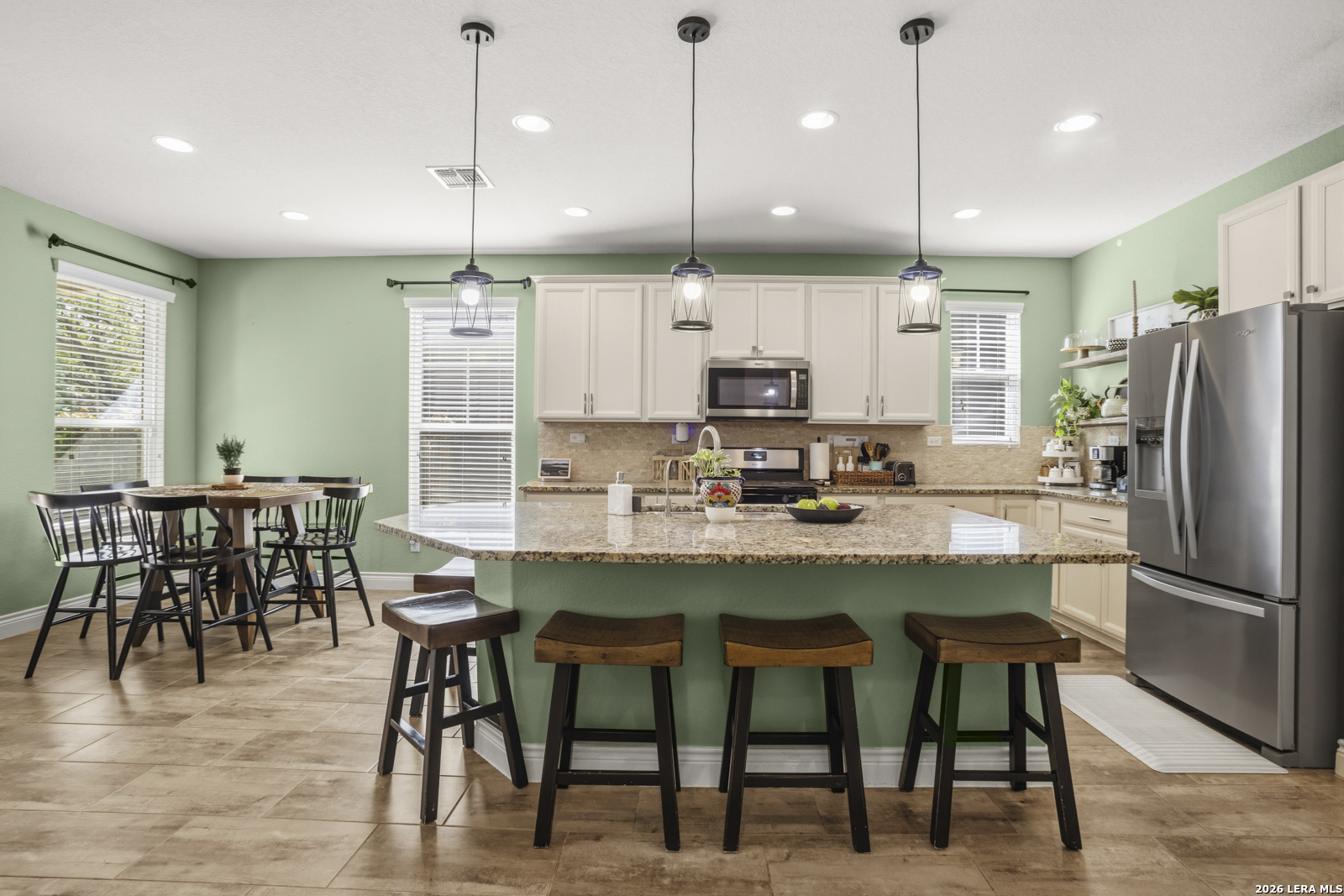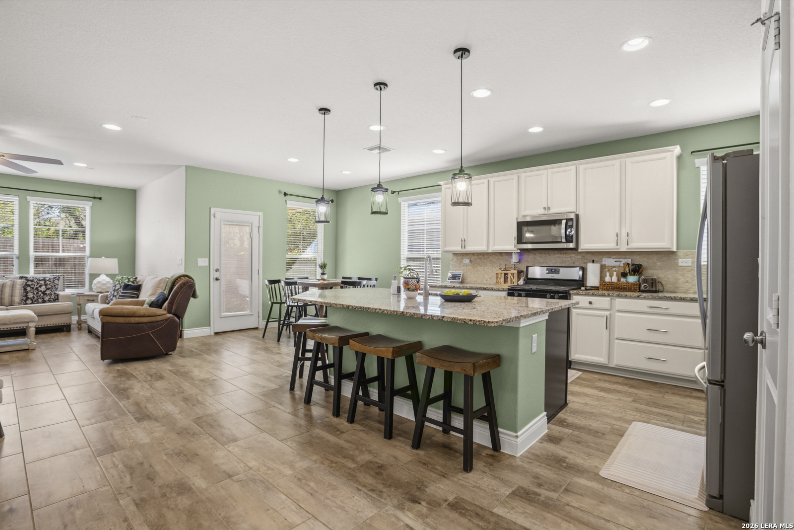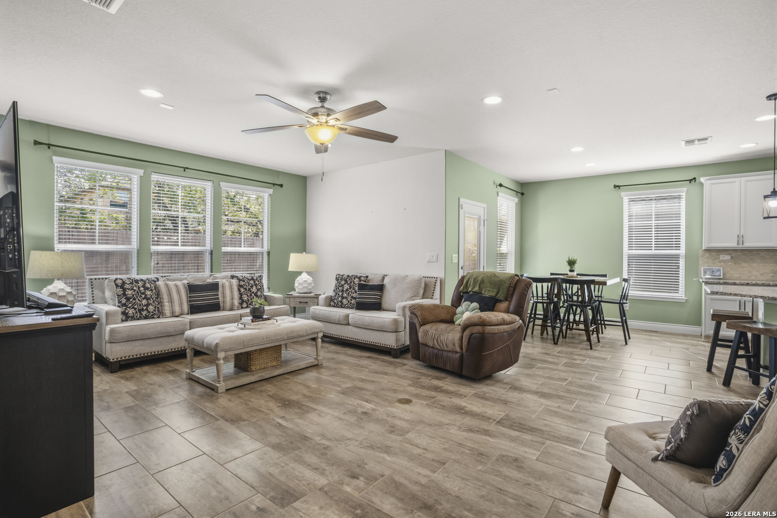 This spacious 4 bedroom, 3 full bathroom home in Schertz offers a well designed layout with modern features and plenty of room to live and entertain. A separate dining room greets you near the entrance, perfect for hosting gatherings or enjoying family meals. The heart of the home features an open concept living room and kitchen, creating a bright and inviting space filled with natural light. The kitchen is equipped with granite countertops, a large island with a breakfast bar, and ample cabinet and counter space, ideal for both everyday living and entertaining. The primary suite is generously sized and includes a full ensuite bathroom with a double vanity and a large walk in shower, providing a comfortable retreat at the end of the day. An office nook just off the living room offers a convenient space for working from home or studying. Upstairs, you will find a versatile loft area along with a dedicated theatre room, perfect for movie nights or additional entertainment space. Step outside to enjoy the covered back patio, ideal for relaxing or hosting guests year round. Located in Schertz with easy access to nearby shopping, dining, and major highways, this home combines space, comfort, and convenience.