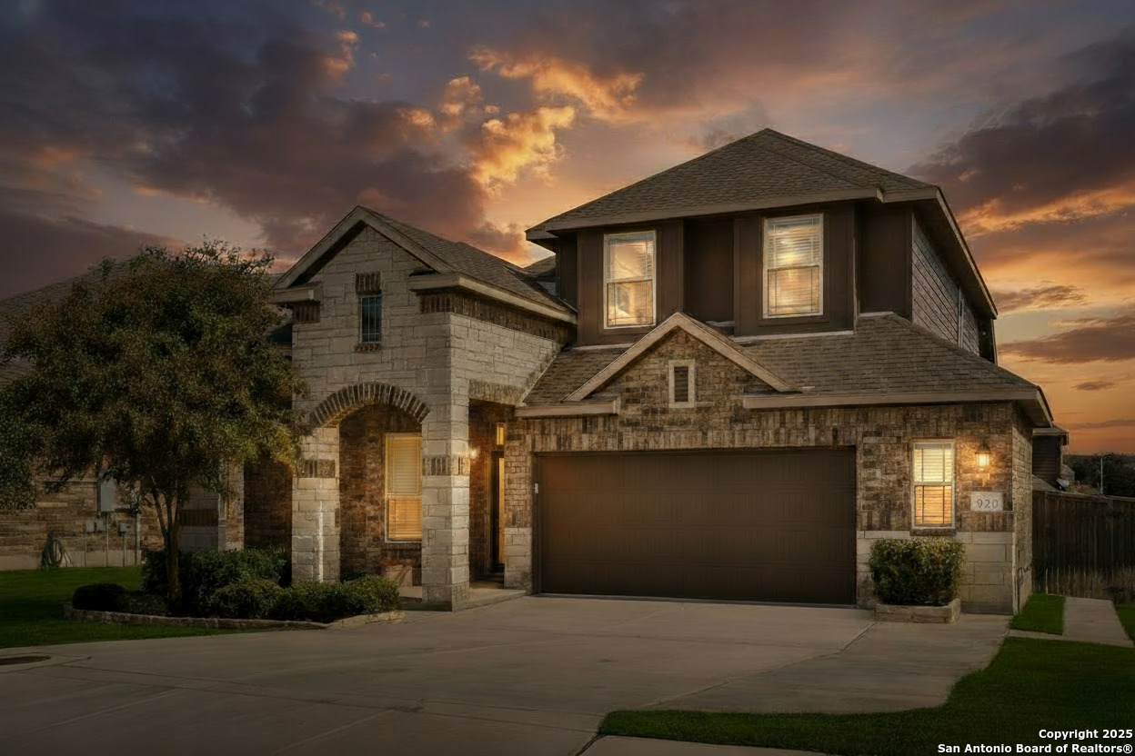 TURNING STONE - MESA | Cibolo's only gated community | Pool & Amenities | SCUCISD + Steele HS Immaculate stone-and-brick two-story with soaring ceilings, a wall of windows, and an open concept designed for effortless living and entertaining. The great room flows into a chef's kitchen featuring an expansive granite island/breakfast bar, subway tile backsplash, stainless steel appliances (double ovens), abundant cabinetry, and a walk-in pantry. A handy built-in desk keeps schedules organized, while luxury vinyl plank flooring carries a fresh, modern look throughout the main level. Thoughtful layout: the primary suite is tucked on the first floor for privacy, with a sleek bath offering a large walk-in shower and a generous closet. A secondary bedroom and full bath down are perfect for guests or a nursery. Upstairs, you'll find additional bedrooms, baths, and a spacious game room overlooking the living area-ideal for movie nights, homework, or a play space. Outside, relax on the covered back patio with an iron railing and ceiling fan, then step down to a wide, level backyard with room to run, garden, or add a future playscape. Curb appeal shines with manicured landscaping and a two-car garage on a quiet interior street. Living in Turning Stone - Mesa means peace-of-mind access control plus community perks: sparkling pool, sports courts, playgrounds, and events. Zoned to Schertz-Cibolo-Universal City ISD, including sought-after Steele High School (buyer to verify schools). Minutes to Randolph AFB, I-35/1604, H-E-B, The Forum, and dining. Move-in ready style, a flexible floor plan, and resort-style amenities-everything you've been waiting for in the only gated neighborhood in Cibolo.