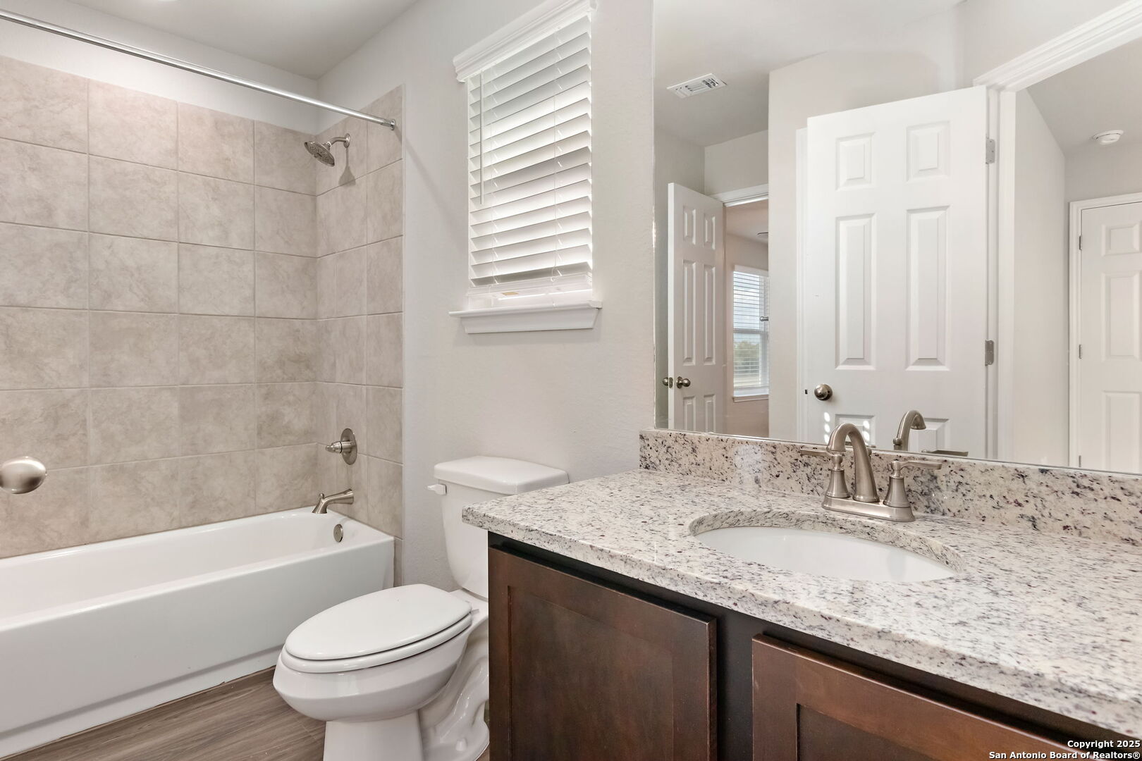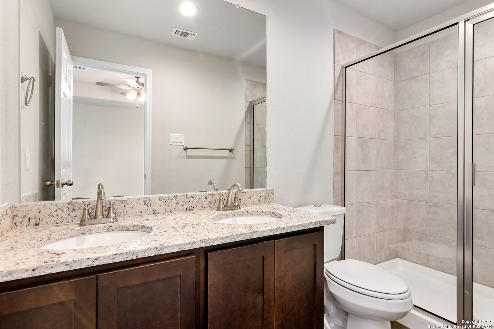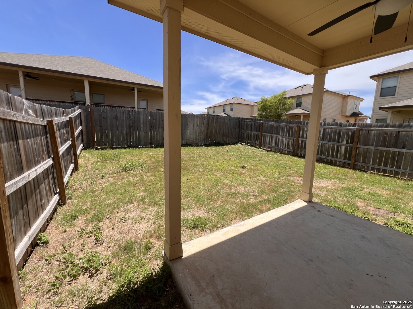 $1,345 for an 18-month lease term and $1,395 for 12 months. Located in a cul de sac, this luxury duplex offers the perfect blend of comfort, convenience, and modern style. With an open floor plan, recessed lighting, elegant backsplash, and durable vinyl flooring (carpet upstairs), it's both stylish and low-maintenance. The kitchen shines with granite countertops, sleek appliances, and a layout perfect for gatherings. Extras like a separate laundry room, sprinkler system, and xeriscaped front yard make everyday living easy. Step into the oversized backyard with a covered patio, privacy fence, and peaceful greenbelt views ideal for relaxing or entertaining. Upstairs, a Jack & Jill bathroom gives each bedroom private access, while the inviting owner's suite features a trey ceiling, walk-in closet, and a serene private bath. Thoughtfully designed and move-in ready-this home is waiting to welcome you. Located just minutes from IH-35, 1604, IH-10, and Randolph Air Force Base.