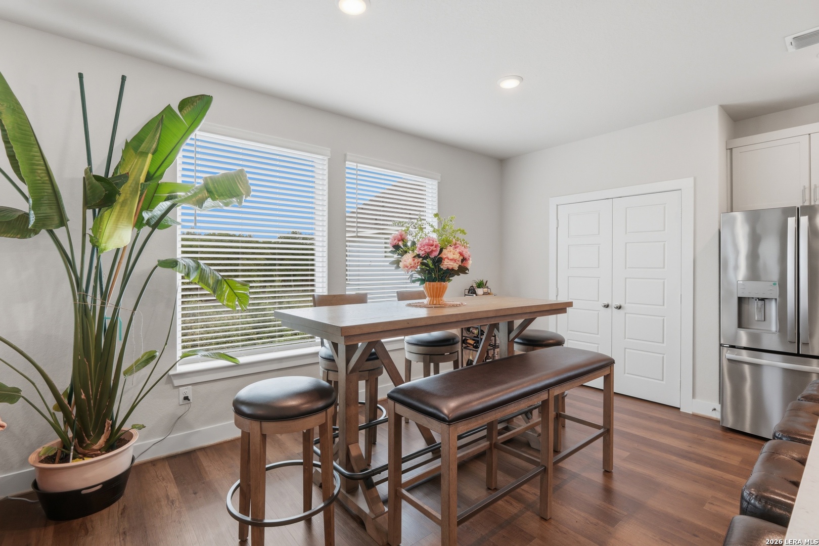 This modern two-story home brings all the vibes with 3 bedrooms, 2.5 baths, and a 2-car garage. The heart of the home is upstairs, where an open-concept kitchen with a large island flows seamlessly into the living and dining areas, perfect for hosting or everyday living, and offers direct access to a private balcony. The primary suite is a true retreat, featuring a spacious walk-in closet, dual vanities, and a sleek walk-in shower. Downstairs, there are two secondary bedrooms with walk-in closets, plus a dedicated tech space ideal for working or studying from home. With both a covered patio and an upper-level balcony, you'll have the perfect spot to relax and unwind, day or night.