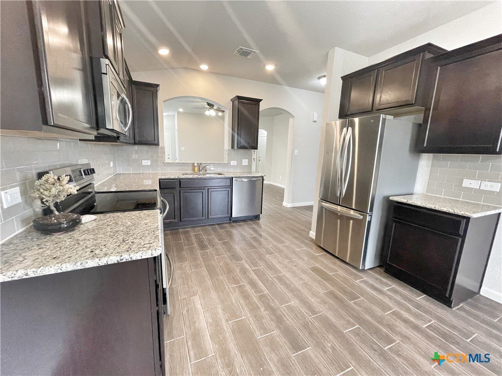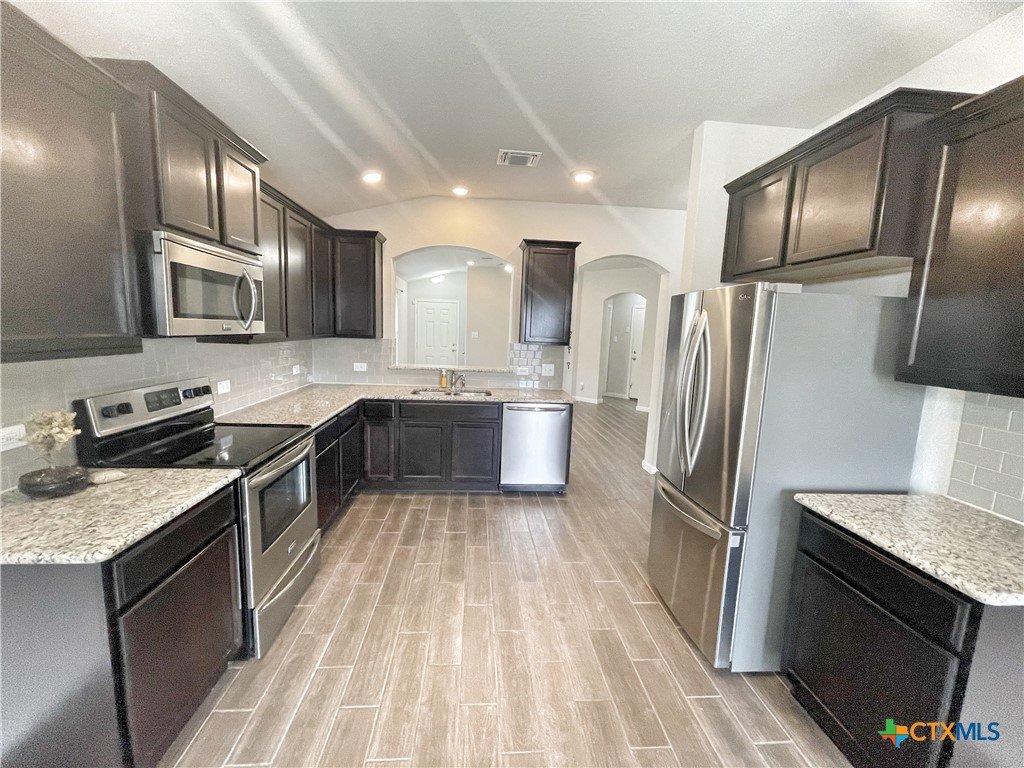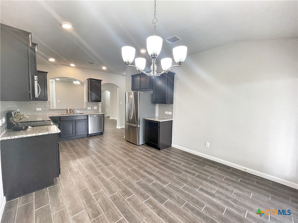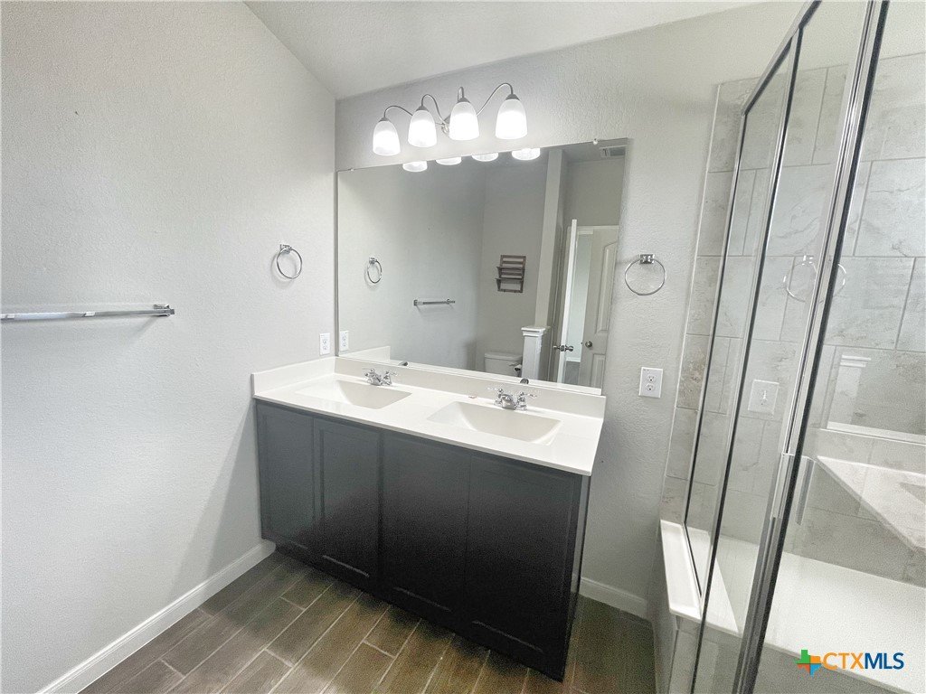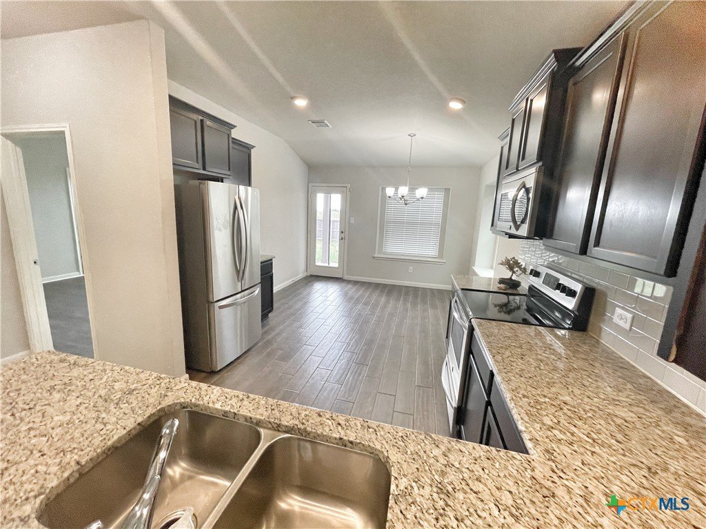 This charming single-story home is located in the highly desirable Avery Park neighborhood in New Braunfels. It features a welcoming front porch and an open floorplan filled with natural light. The beautiful kitchen boasts granite countertops and gray subway tile, seamlessly opening to the living room, making entertaining fun and easy. The home has no carpet-only tile and vinyl flooring throughout. The secondary bedrooms and bathroom are situated down a separate hallway from the living area, while the master bedroom is positioned towards the back for added privacy, complete with a large master closet, dual vanity, and a spacious walk-in shower with bench seating. Enjoy a covered patio with tranquil views of farmland instead of other houses. Community amenities include a neighborhood pool, playground, and jogging trails. Enjoy pop-up coffee and ice cream vendors at the pool and fun neighborhood events throughout the year. The home is just minutes away from shopping and dining at Town Center at Creekside, Buc-ee's, HEB Plus!, and much more. Animal Policy: No cats, Dogs OK- with Landlord approval.