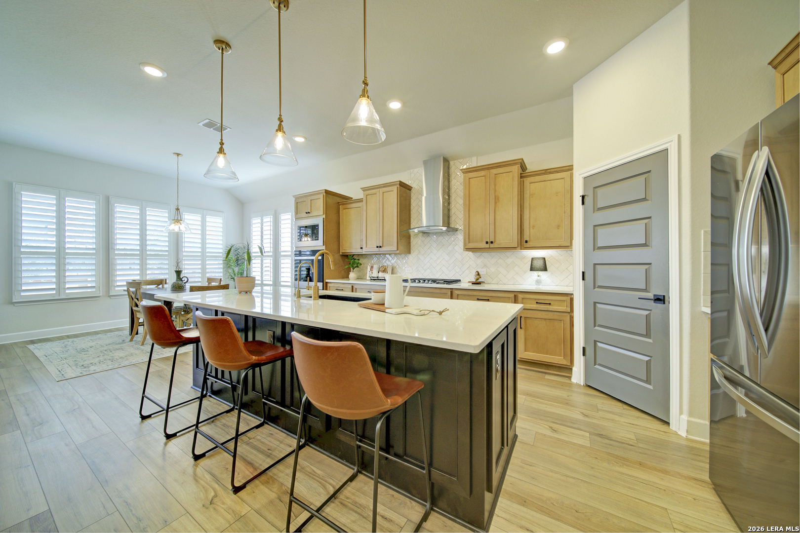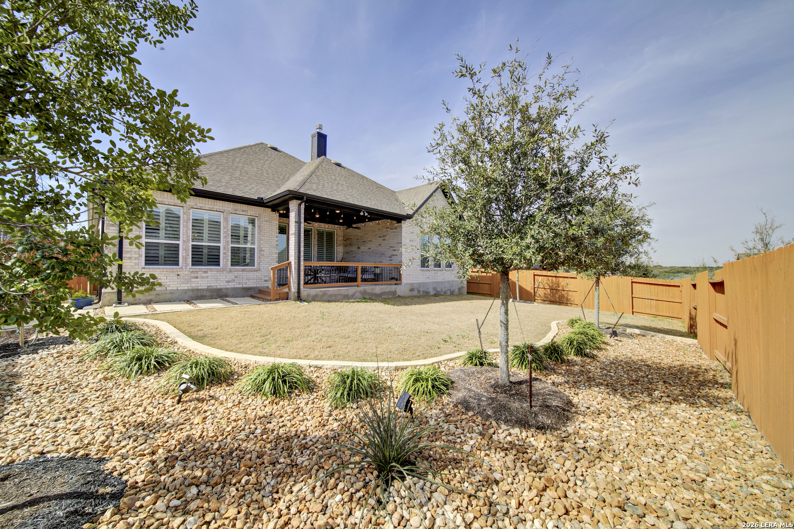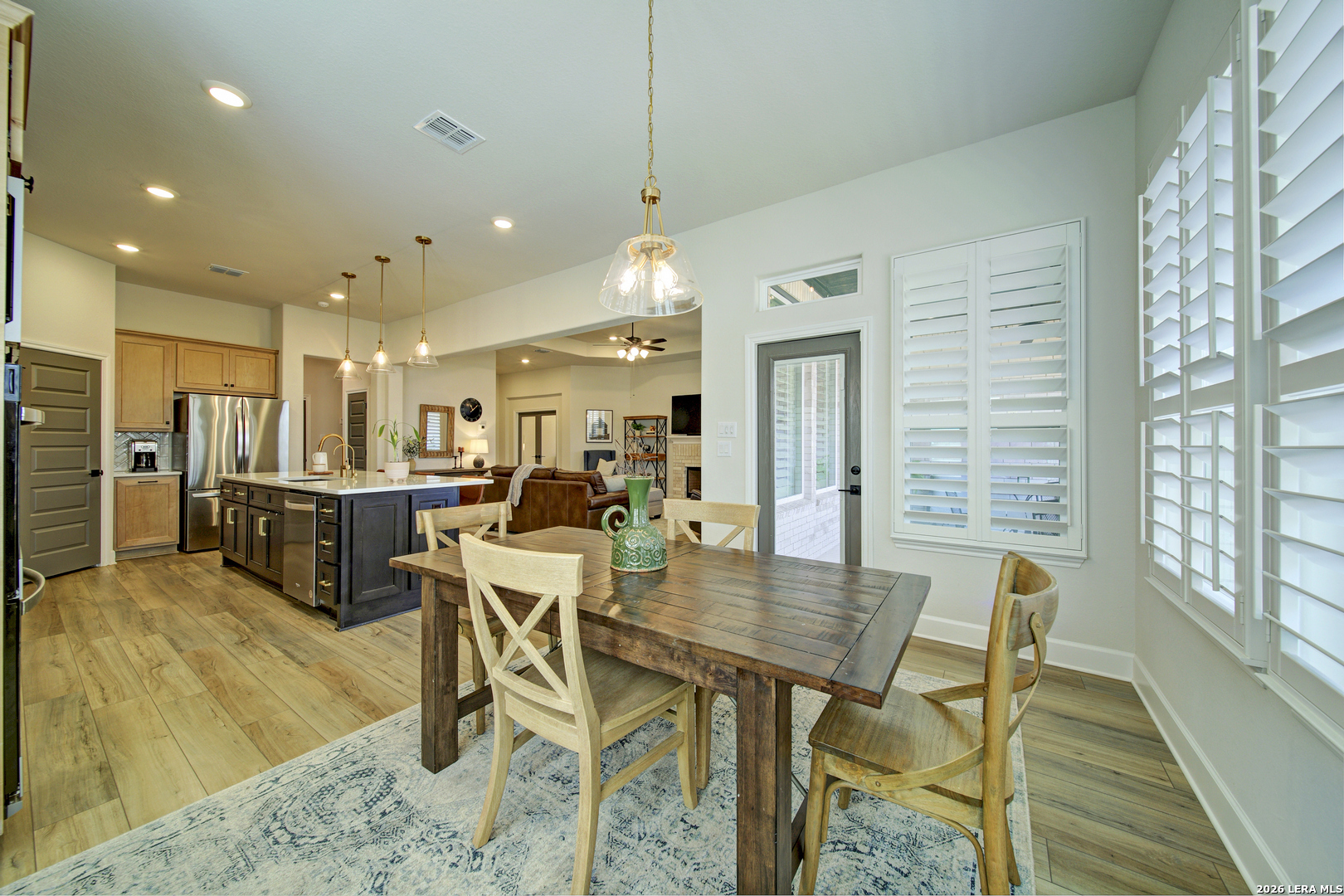 Prime North Central San Antonio location in the highly sought-after Sunday Creek at Kinder Ranch! Built by Ashton Woods Homes, this stunning one-story residence showcases exceptional design, modern finishes, and a presentation that feels virtually brand new. Thoughtfully designed with 3 bedrooms, 2.5 baths, and an expansive private study that can easily function as a formal dining room or versatile flex space, this home offers both sophistication and everyday comfort. Beautiful luxury vinyl flooring flows throughout the main living areas, complemented by designer tile in the wet spaces and elegant plantation shutters adorning the windows. The open-concept layout is ideal for both entertaining and relaxed living. A light-filled family room features a tray ceiling and a striking stone fireplace that creates a warm and inviting focal point. The gourmet island kitchen is equally impressive, offering quartz countertops, coordinating 42" designer cabinetry, stylish pendant lighting, stainless appliances, gas cooking, and a welcoming breakfast area. A thoughtfully designed laundry room and built-in mudroom area provide both charm and practicality-perfect for organizing everyday essentials. The spacious primary suite serves as a private retreat with a vaulted ceiling and serene ambiance. The luxurious bath features separate vanities, charming designer flooring, a relaxing garden tub, an oversized walk-in shower with built-in bench, and a generous walk-in closet. Secondary bedrooms are well-appointed and connected by a convenient Jack-and-Jill bath. Step outside to enjoy the covered patio with recessed lighting and dual ceiling fans-an ideal setting for relaxing or entertaining while overlooking the beautifully professionally landscaped backyard. LED accent lighting across the front of the home adds to the home's striking curb appeal. Located within the highly regarded Comal Independent School District, with elementary, middle, and high schools conveniently located nearby Kinder Ranch, this exceptional home offers the perfect blend of style, comfort, and location. A truly remarkable opportunity in one of the area's most desirable communities.