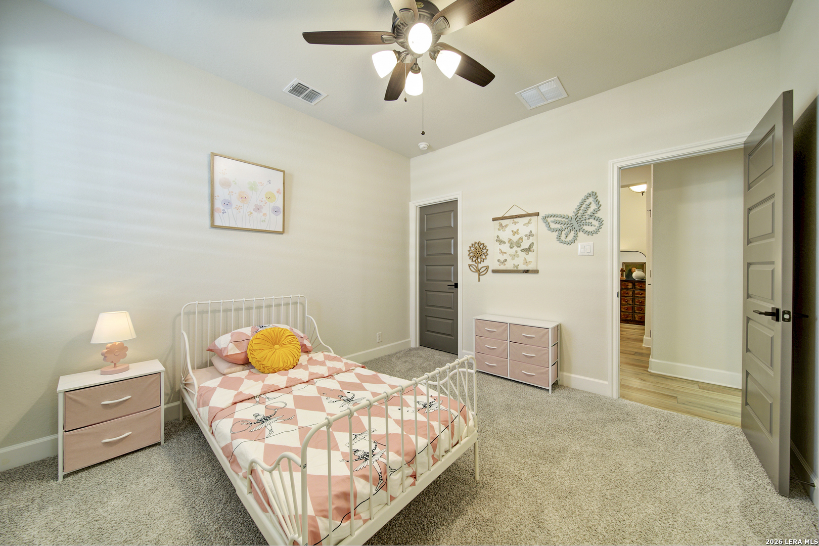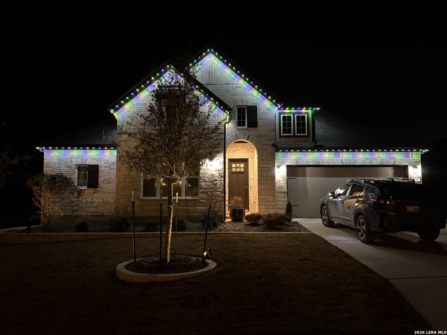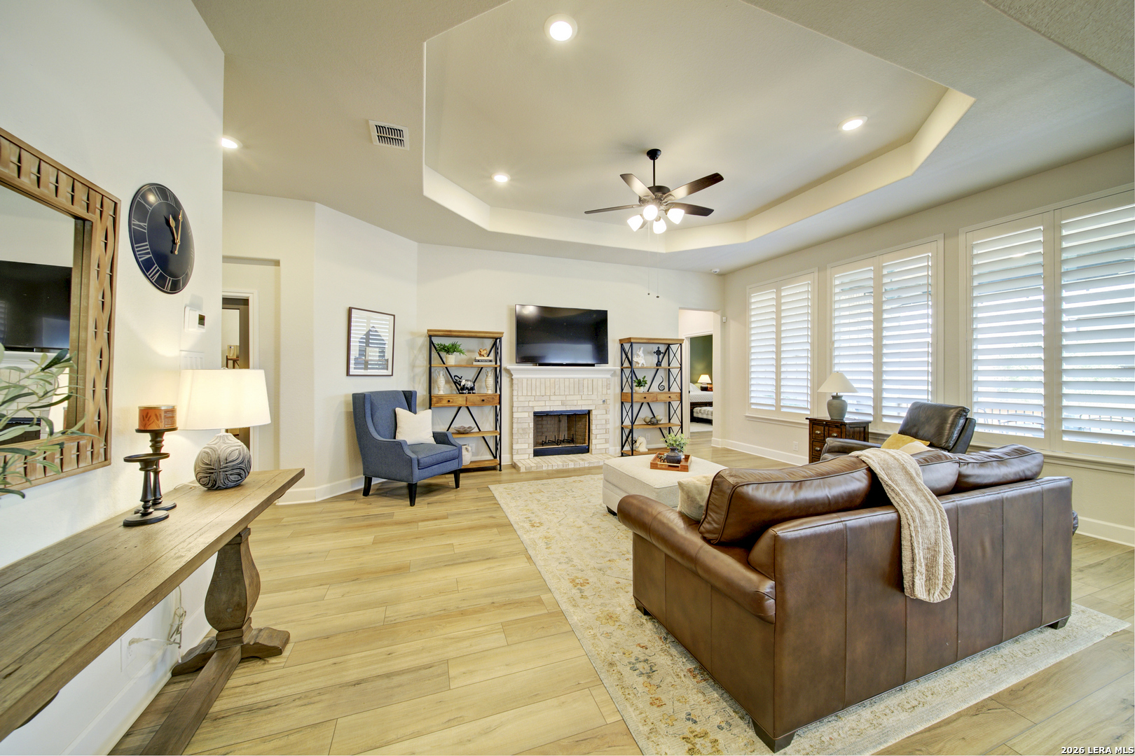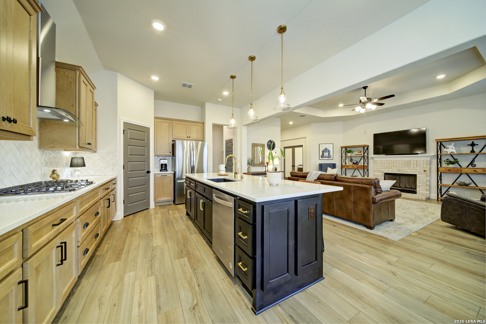 Prime North Central San Antonio location in the highly sought-after Sunday Creek at Kinder Ranch! Built by Ashton Woods Homes, this stunning one-story residence showcases exceptional design, modern finishes, and a presentation that feels virtually brand new. Thoughtfully designed with 3 bedrooms, 2.5 baths, and an expansive private study that can easily function as a formal dining room or versatile flex space, this home offers both sophistication and everyday comfort. Beautiful luxury vinyl flooring flows throughout the main living areas, complemented by designer tile in the wet spaces and elegant plantation shutters adorning the windows. The open-concept layout is ideal for both entertaining and relaxed living. A light-filled family room features a tray ceiling and a striking stone fireplace that creates a warm and inviting focal point. The gourmet island kitchen is equally impressive, offering quartz countertops, coordinating 42" designer cabinetry, stylish pendant lighting, stainless appliances, gas cooking, and a welcoming breakfast area. A thoughtfully designed laundry room and built-in mudroom area provide both charm and practicality-perfect for organizing everyday essentials. The spacious primary suite serves as a private retreat with a vaulted ceiling and serene ambiance. The luxurious bath features separate vanities, charming designer flooring, a relaxing garden tub, an oversized walk-in shower with built-in bench, and a generous walk-in closet. Secondary bedrooms are well-appointed and connected by a convenient Jack-and-Jill bath. Step outside to enjoy the covered patio with recessed lighting and dual ceiling fans-an ideal setting for relaxing or entertaining while overlooking the beautifully professionally landscaped backyard. LED accent lighting across the front of the home adds to the home's striking curb appeal. Located within the highly regarded Comal Independent School District, with elementary, middle, and high schools conveniently located nearby Kinder Ranch, this exceptional home offers the perfect blend of style, comfort, and location. A truly remarkable opportunity in one of the area's most desirable communities.